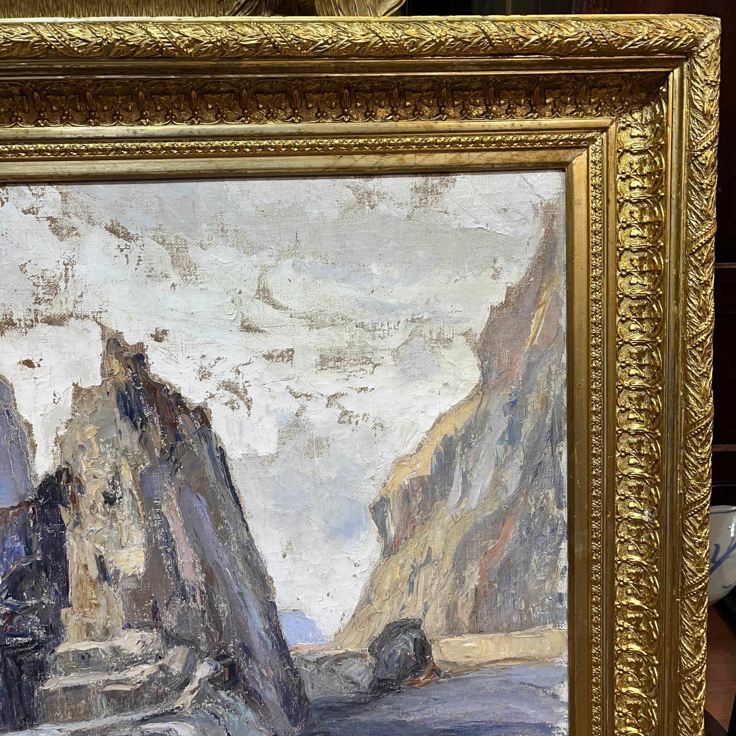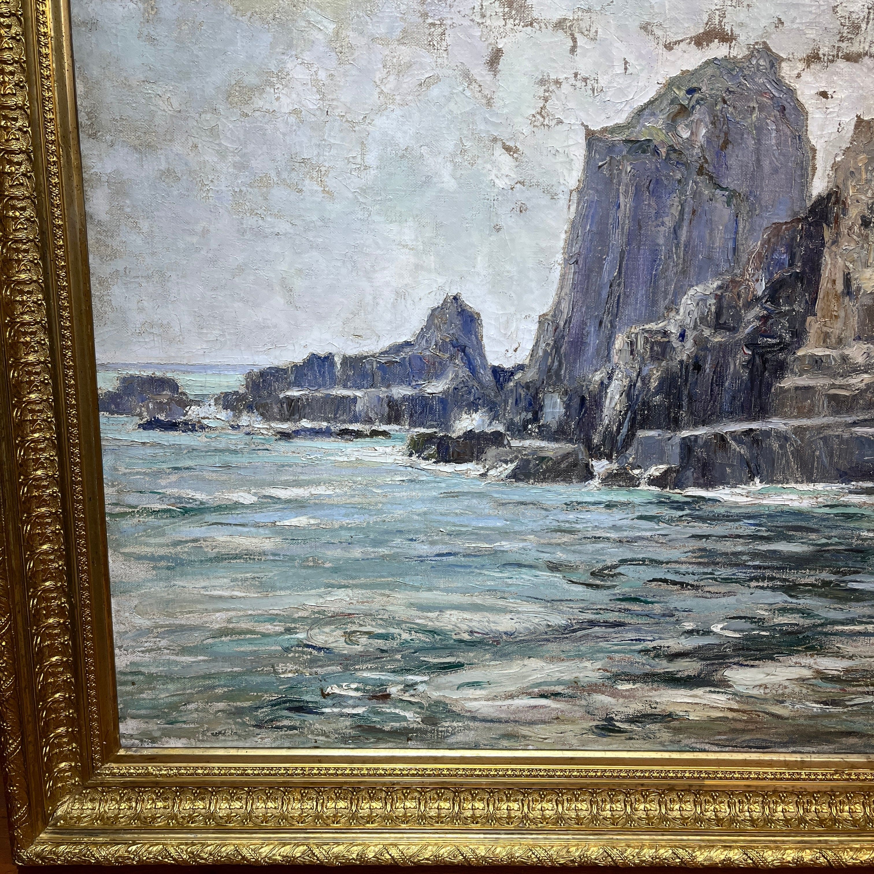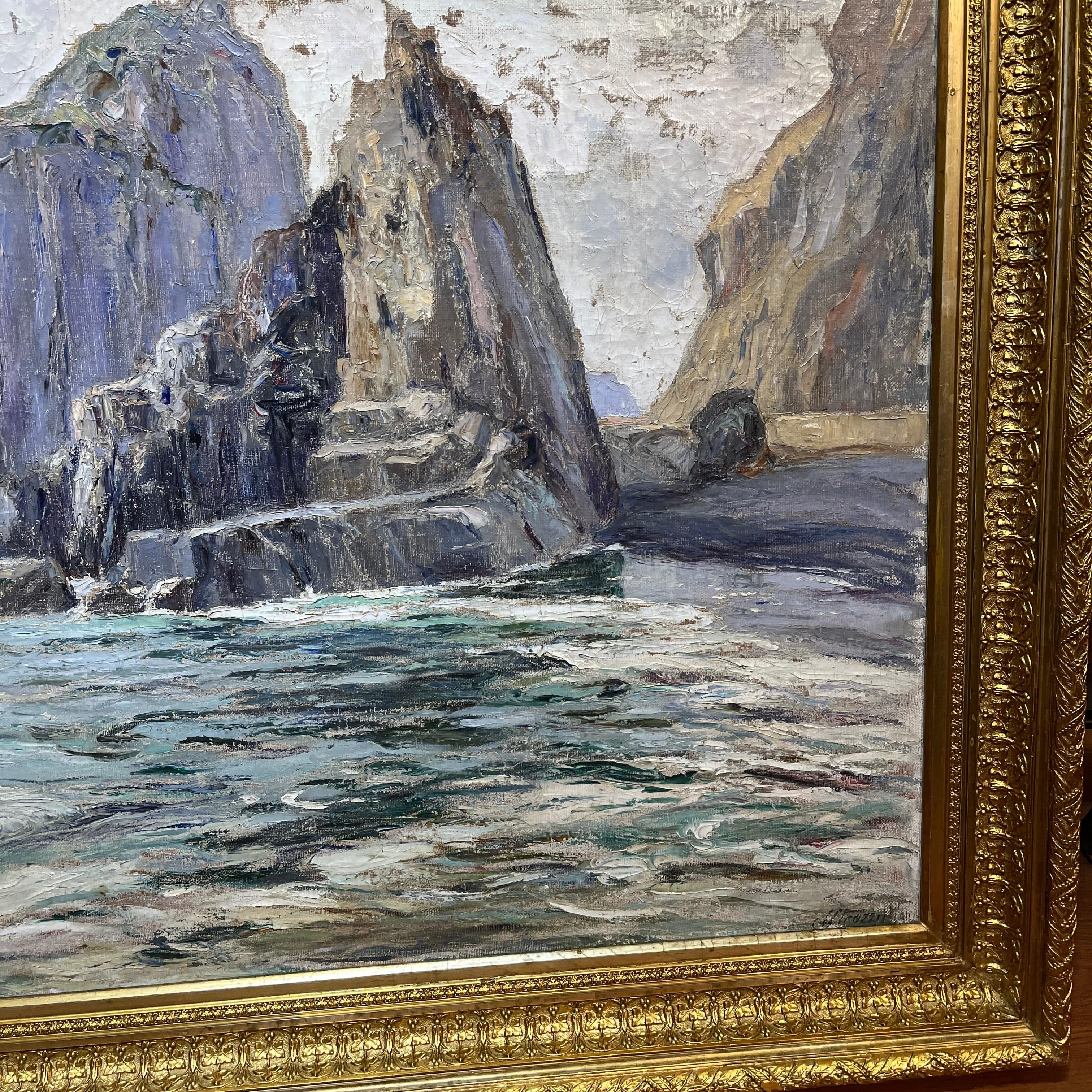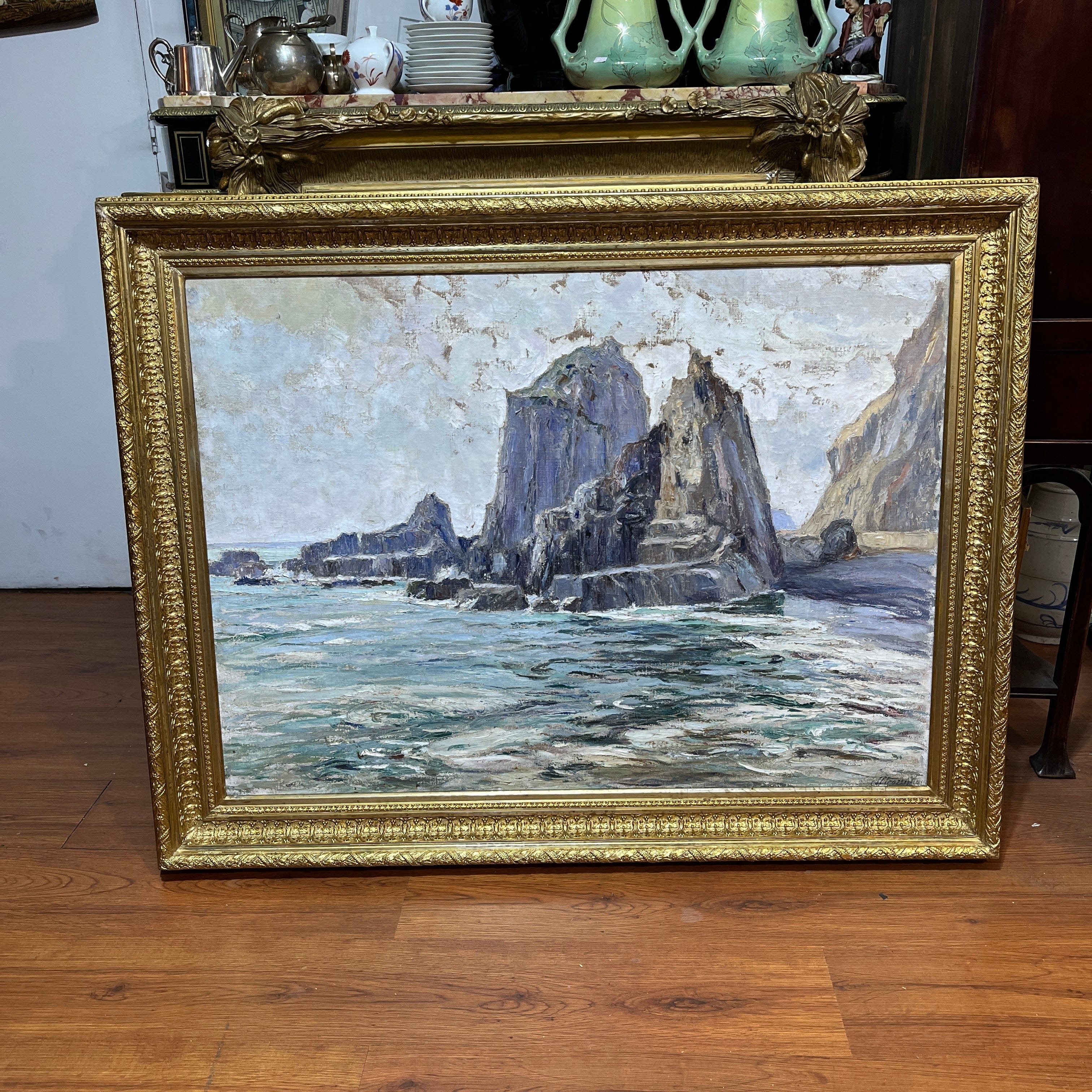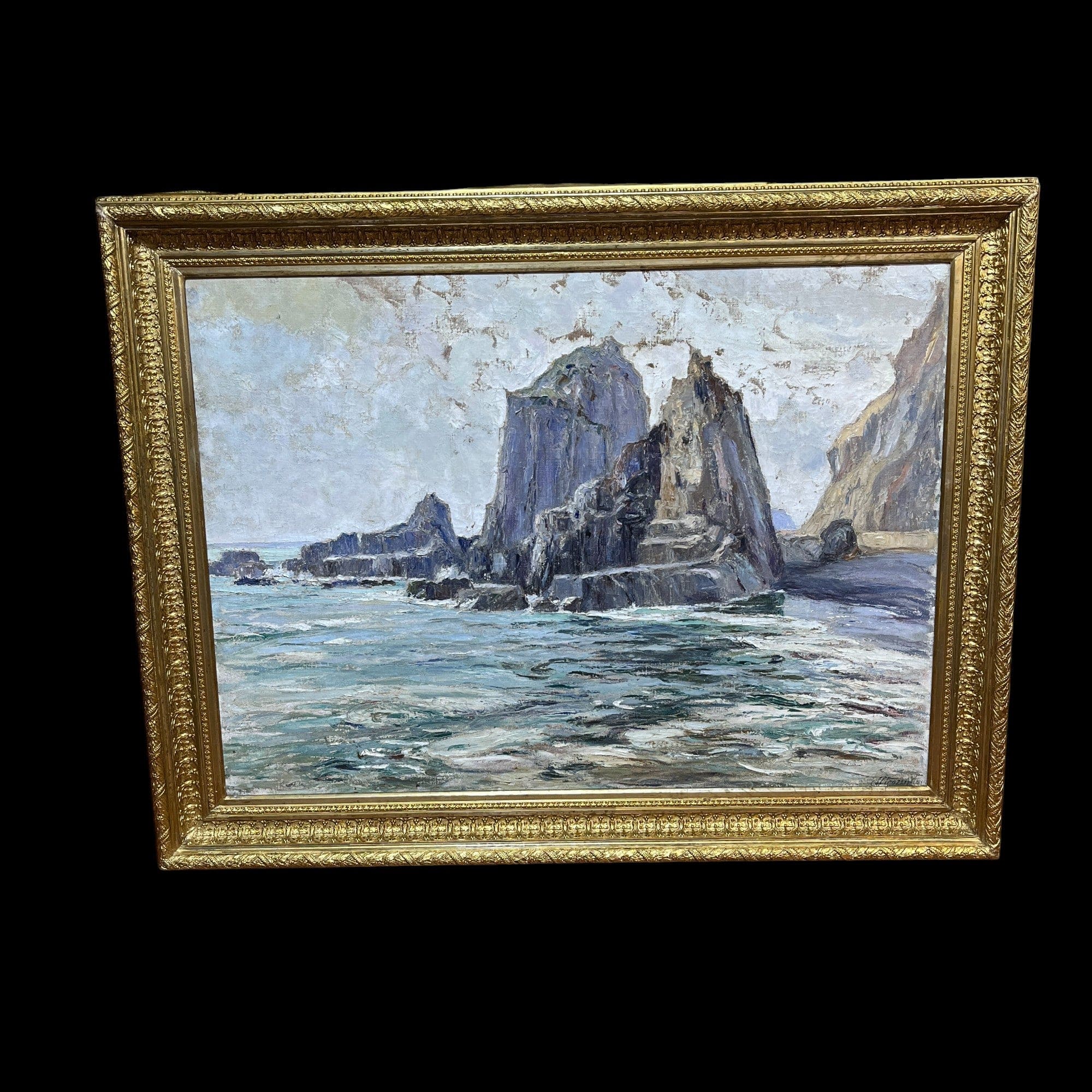Magnifique huile sur toile de l'artiste chilien Luis Strozzi représentant un paysage côtier situé à Cobquecura, avec d'impressionnantes formations rocheuses. Les textures des rochers, de l'eau et de ses courants, réalisées par l'artiste, sont saisissantes. L'œuvre est encadrée dans un cadre en bois moulé orné de reliefs et peint en doré.