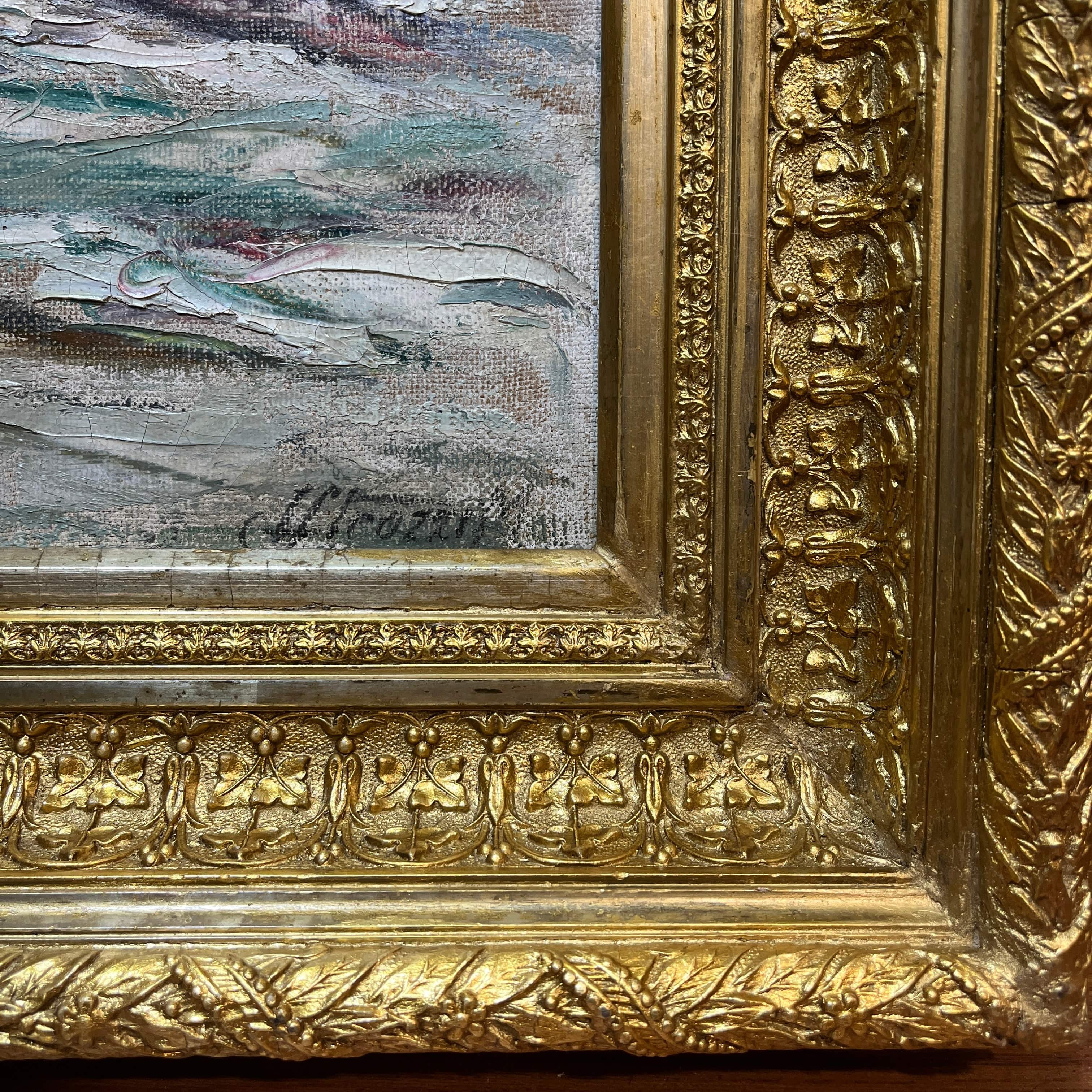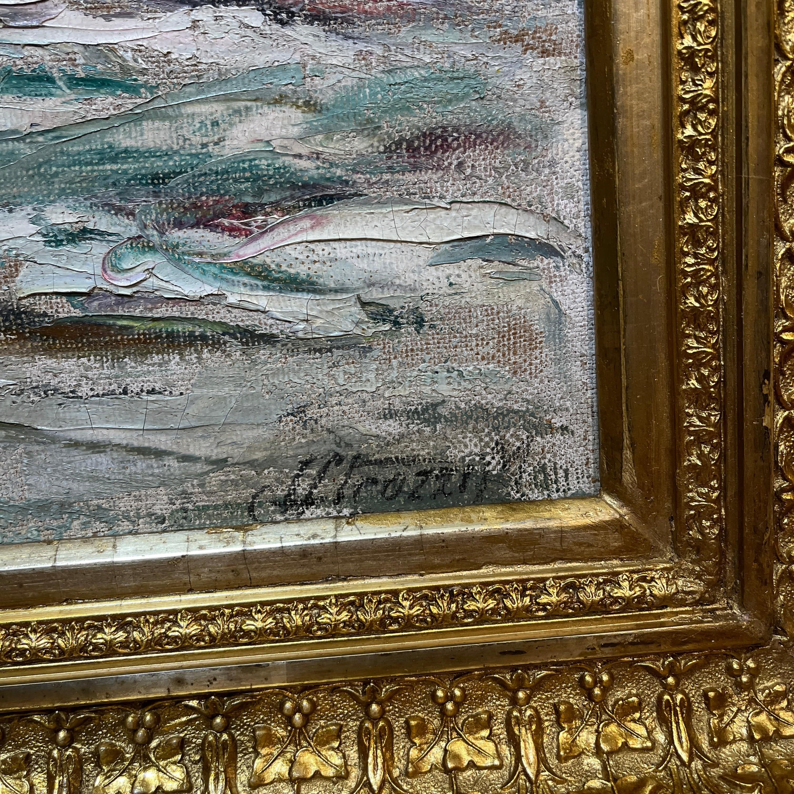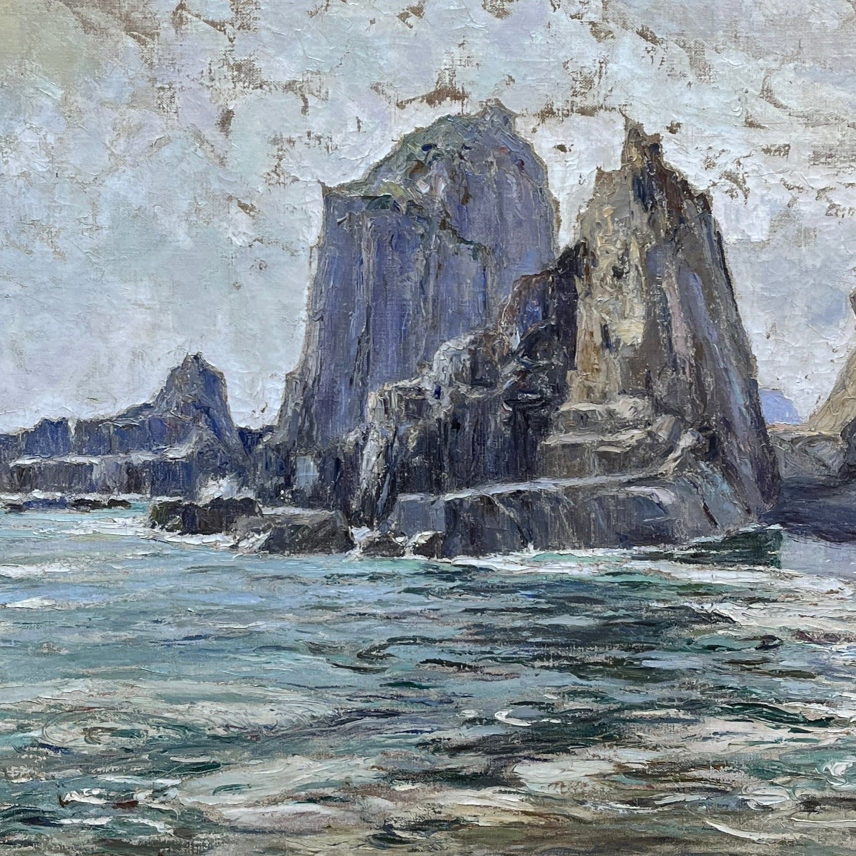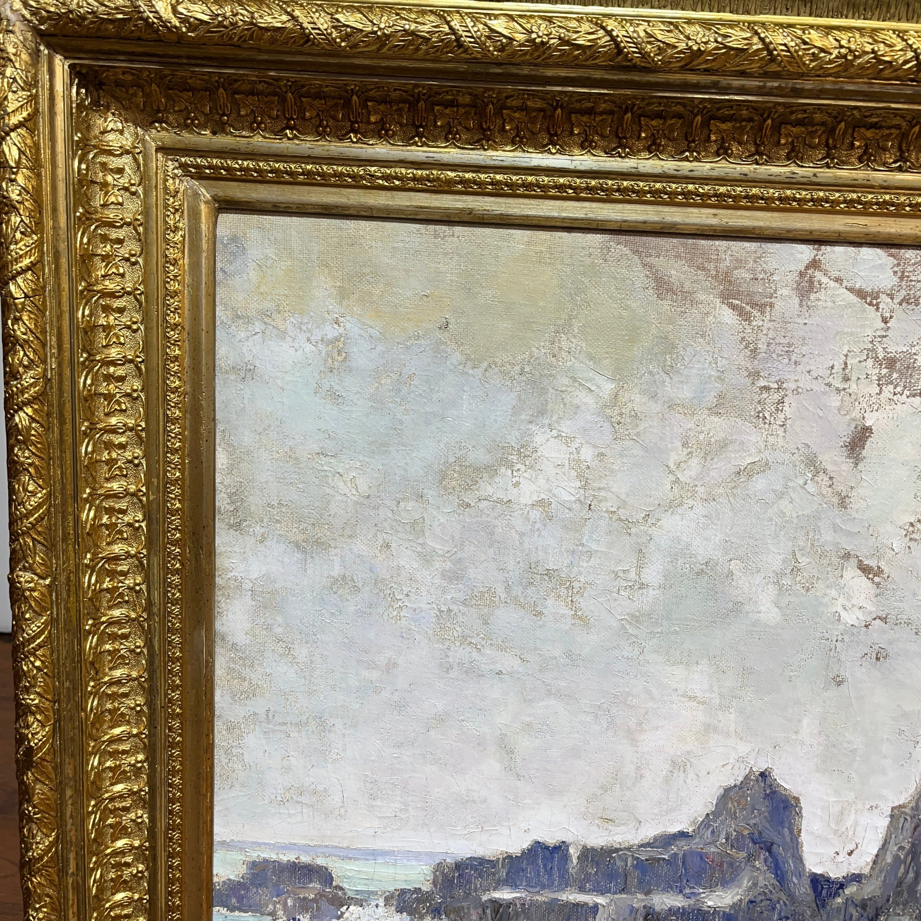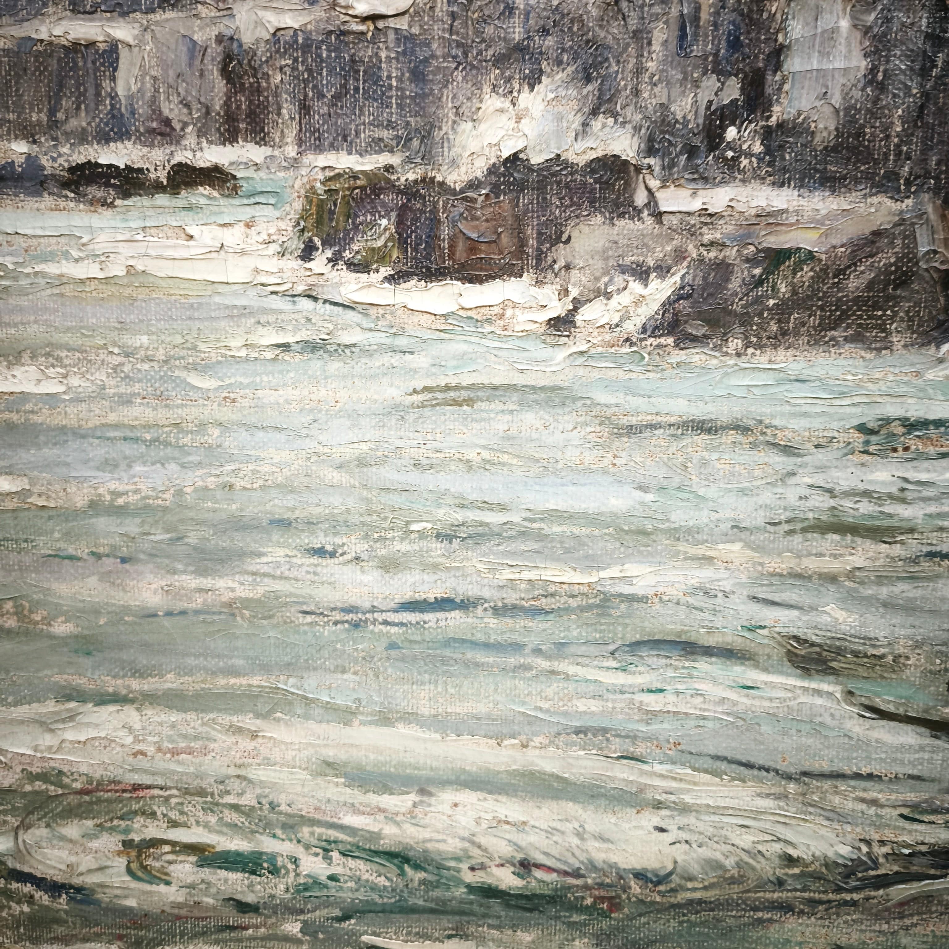 Magnifique huile sur toile de l'artiste chilien Luis Strozzi représentant un paysage côtier situé à Cobquecura, avec d'impressionnantes formations rocheuses. Les textures des rochers, de l'eau et de ses courants, réalisées par l'artiste, sont saisissantes. L'œuvre est encadrée dans un cadre en bois moulé orné de reliefs et peint en doré.