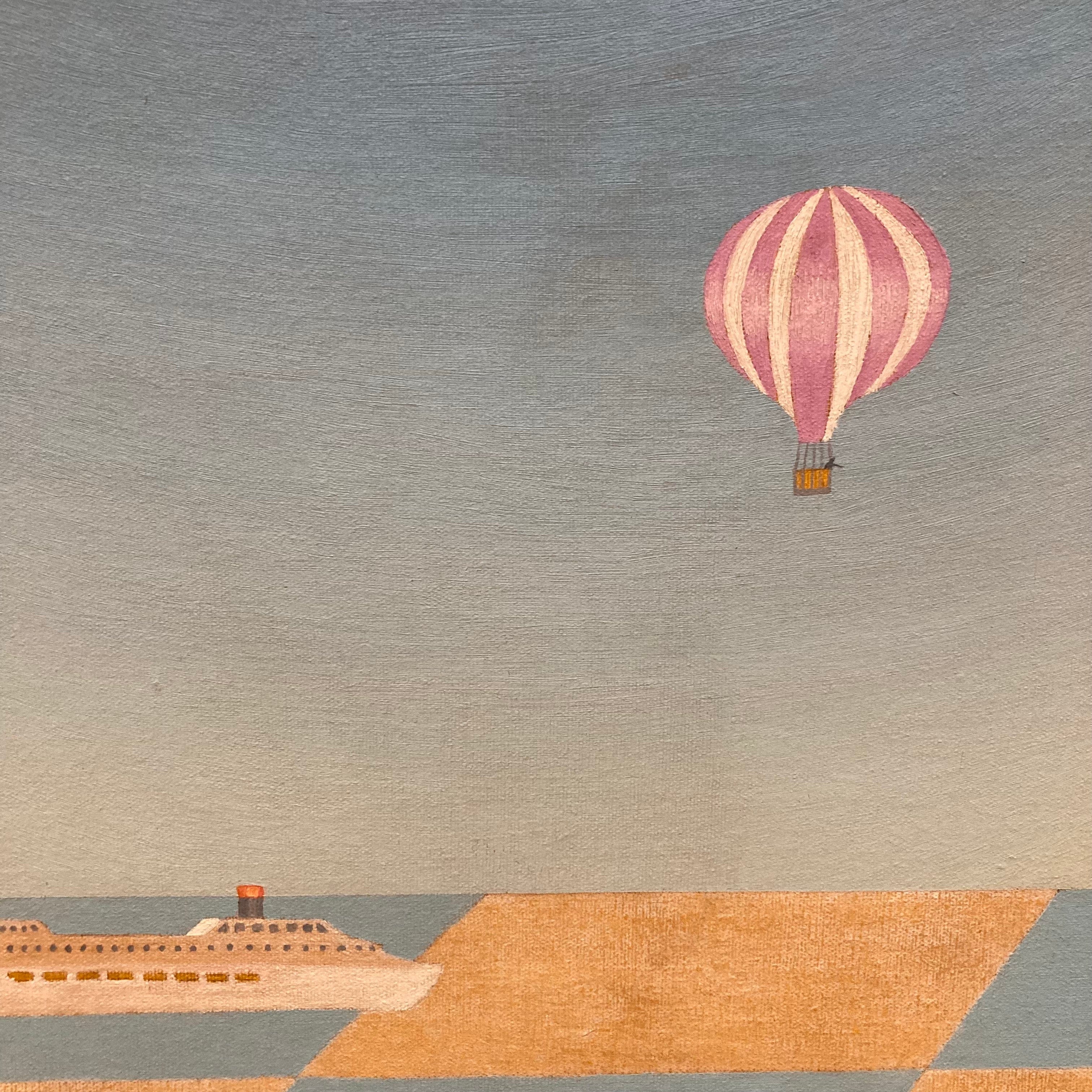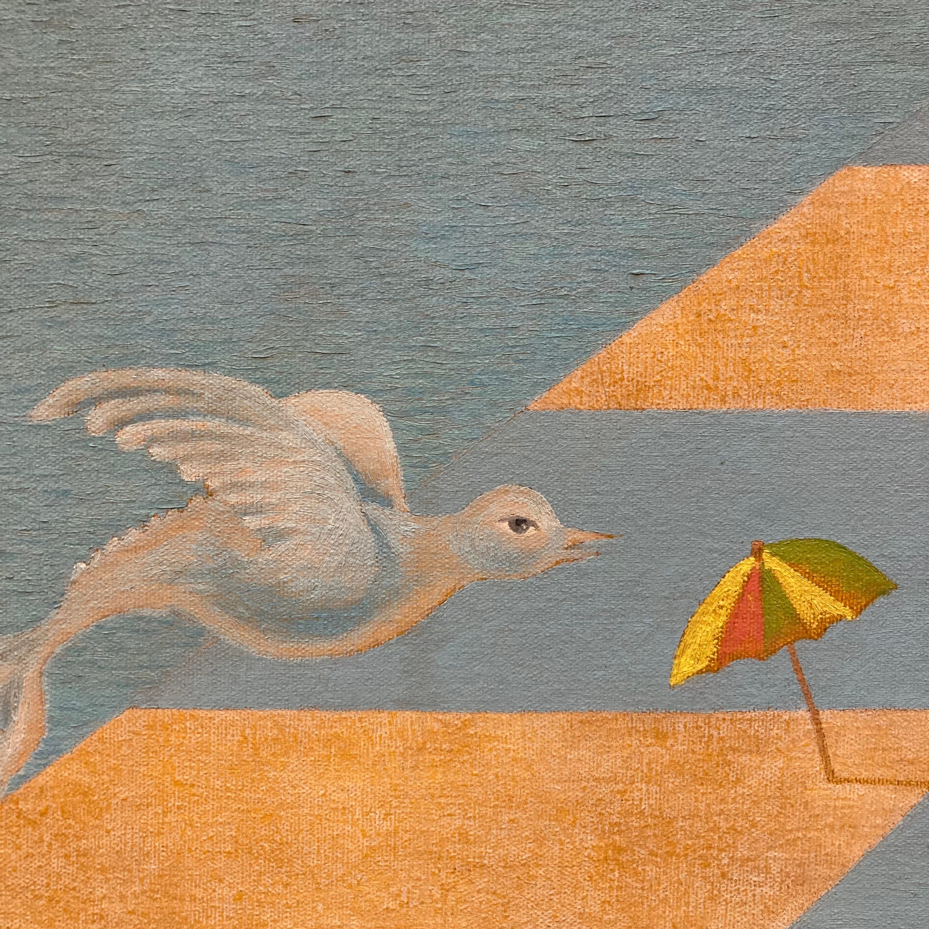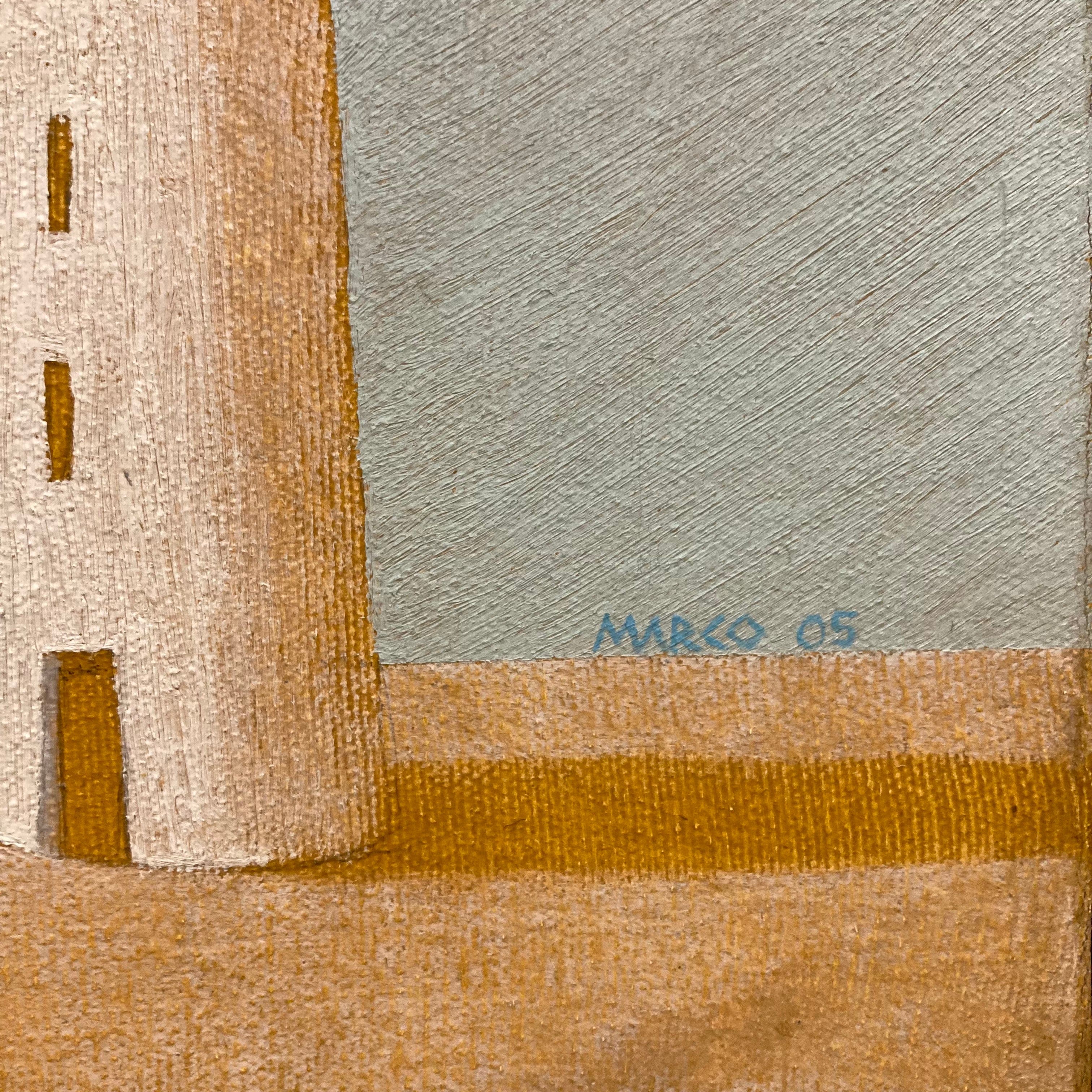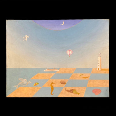 Huile sur toile du peintre chilien Marcos Farias, 2005. Le tableau représente une scène onirique aux tons pastel. L'œuvre est non encadrée.