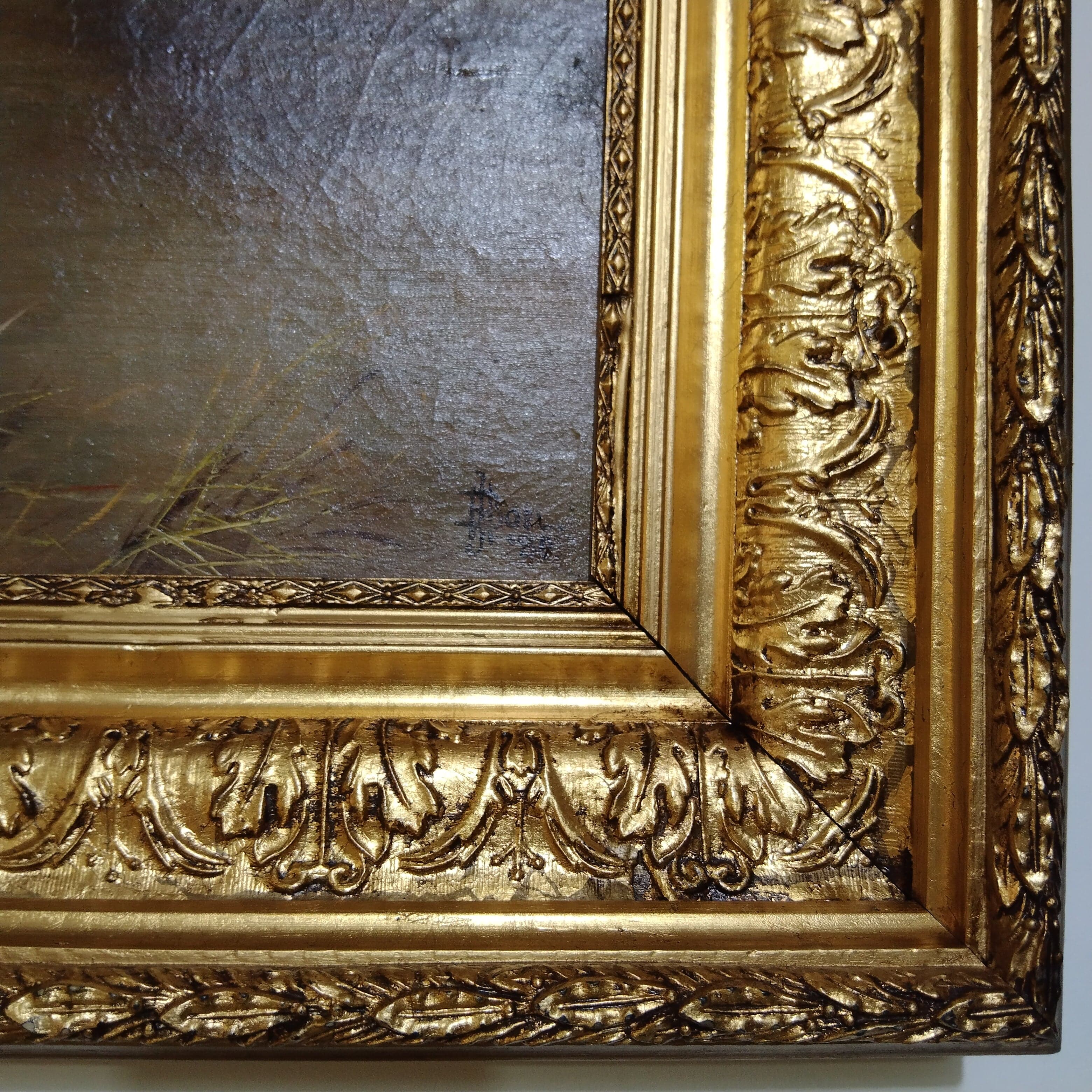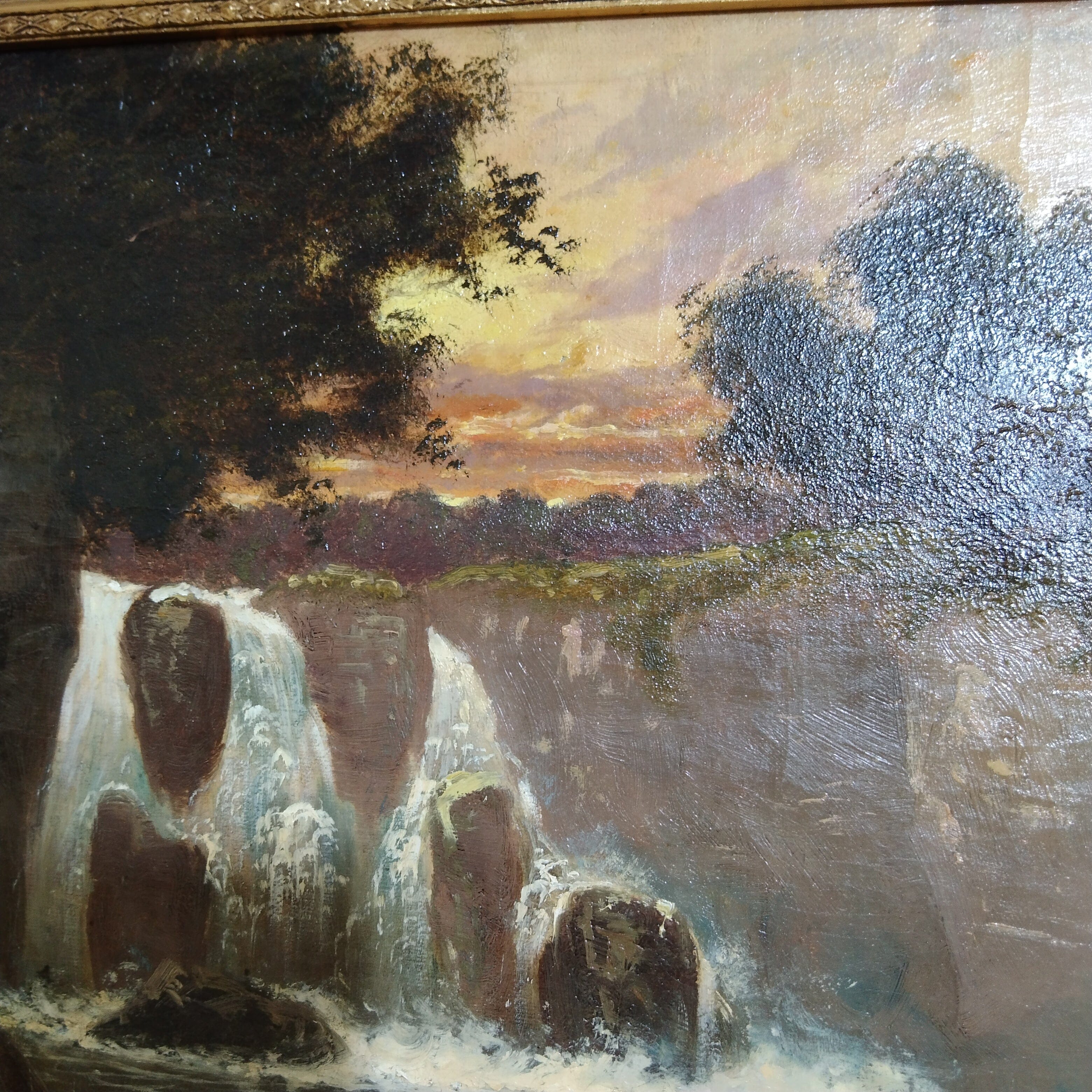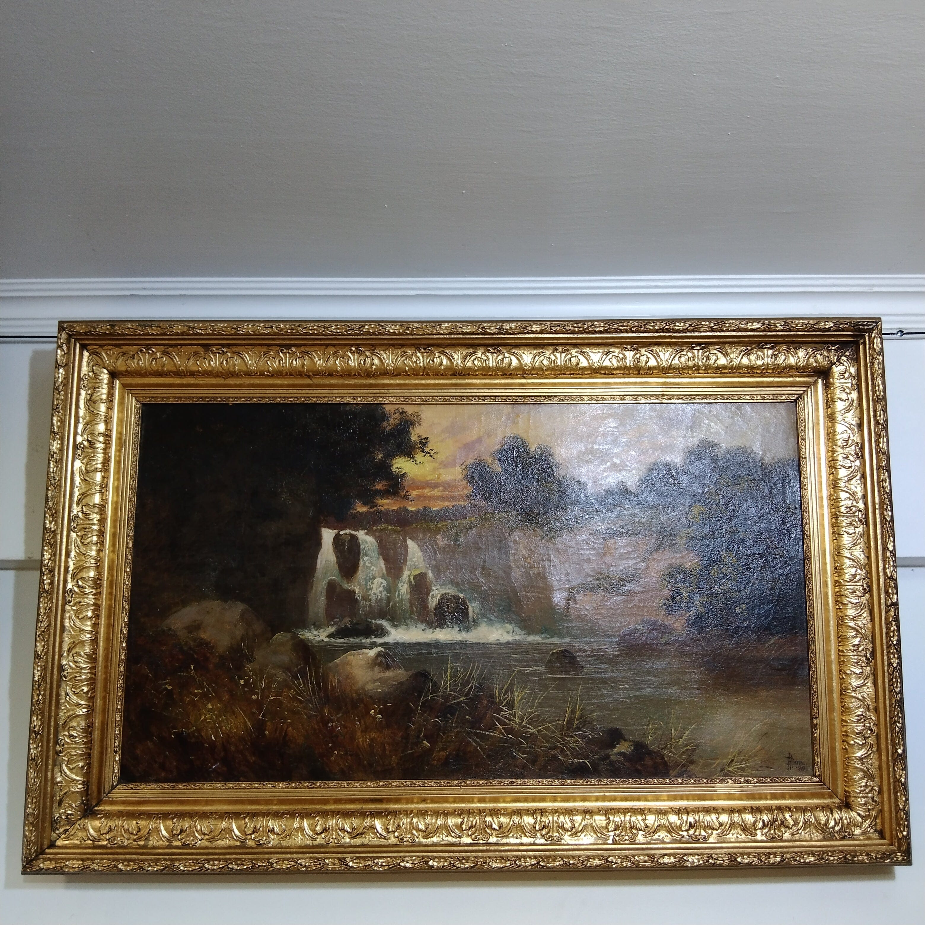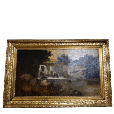 Huile sur toile anglaise, signée B. Joel 1989, représentant un paysage avec rivière et cascade, finement peint, sous un magnifique éclairage couchant, typique de l'école anglaise « De Rio ». L'œuvre est encadrée de bois sculpté, orné de magnifiques décorations en relief et peint en doré.