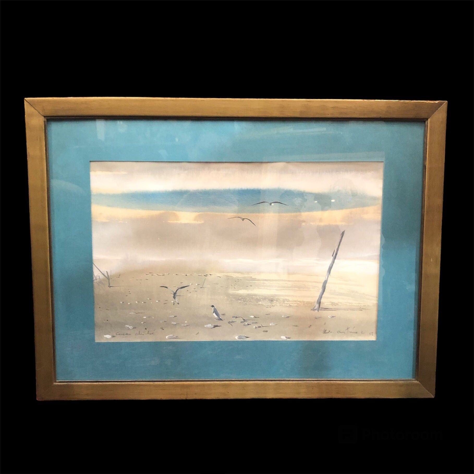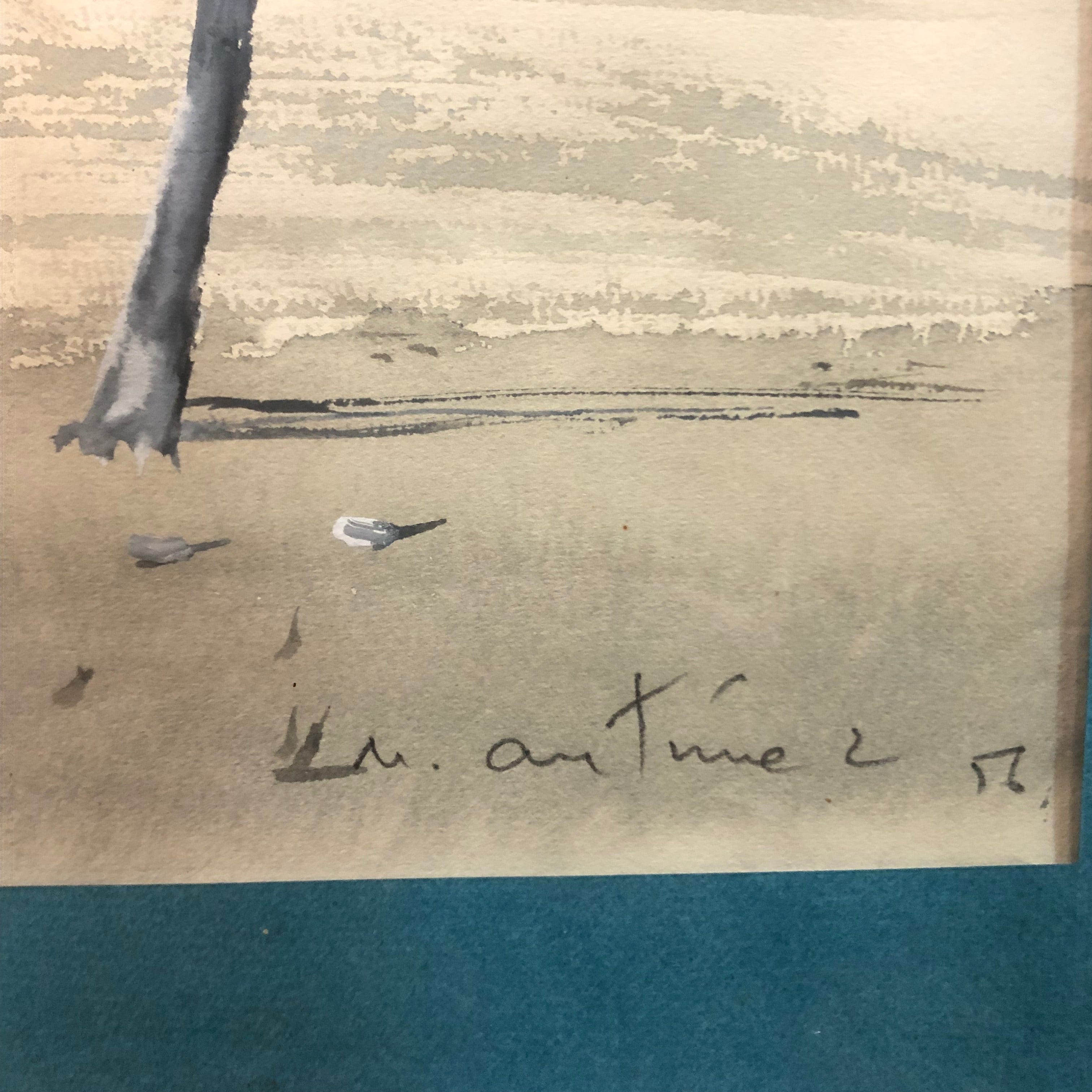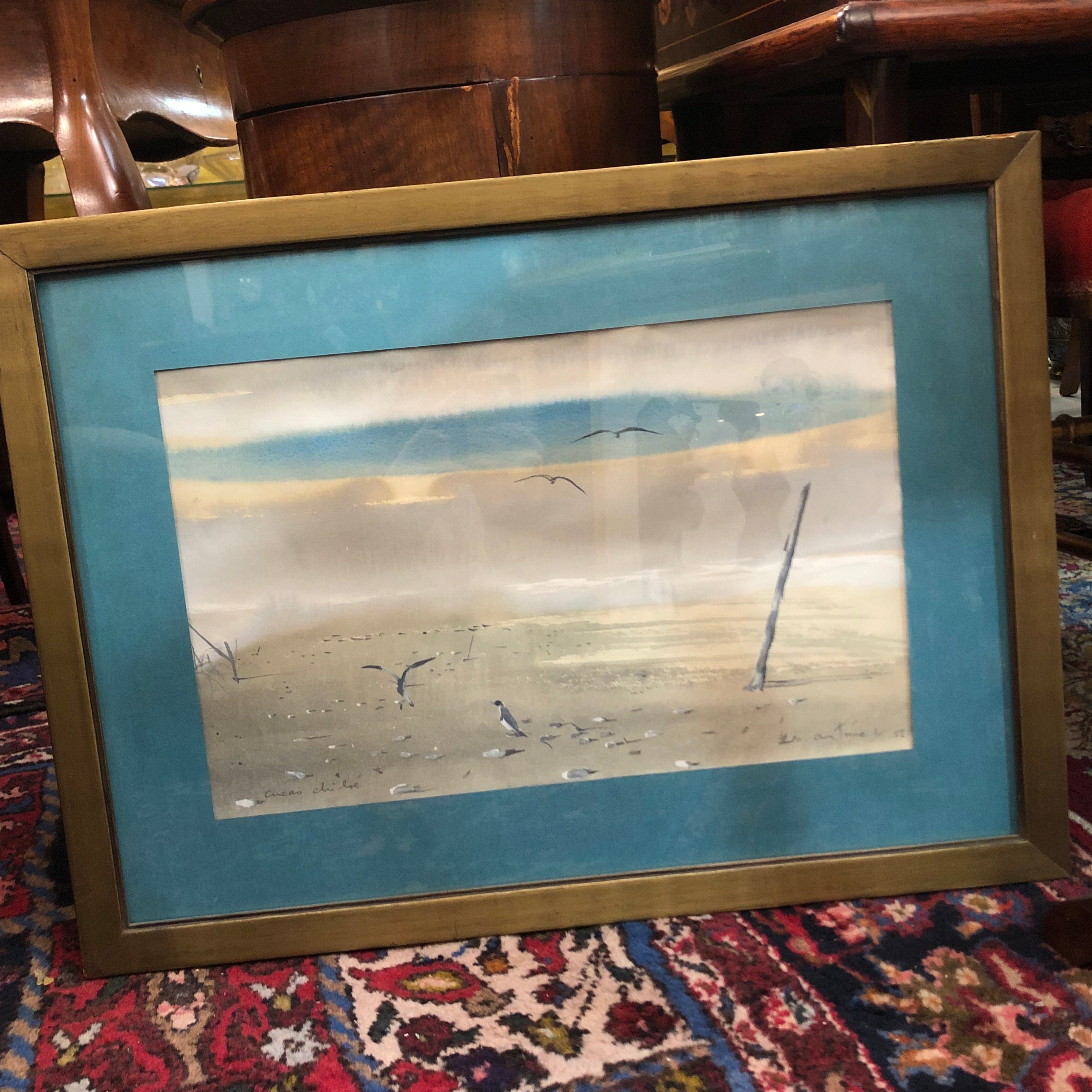 Aquarelle (1952) de la plage de Chucao, du célèbre artiste chilien et lauréat du Prix national d'art, Nemesio Antúnez (1918-1993), était un peintre et graveur chilien de renom. Né à Santiago du Chili, il a étudié l'architecture avant de se consacrer à l'art. Sa carrière artistique a débuté à New York, où il a été influencé par l'expressionnisme abstrait et l'art moderne. Antúnez a été un innovateur en gravure, fondant l'atelier 99 au Chili, un espace clé pour le développement de cette technique dans le pays. Son œuvre aborde des thèmes tels que la nature, le cosmos et la figure humaine, et se caractérise par son utilisation de la couleur et ses expérimentations avec les textures. Il a également été un important promoteur culturel au Chili.