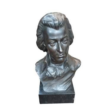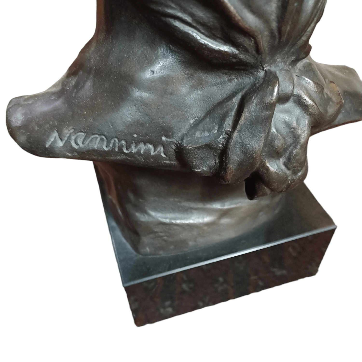 Élégant buste en bronze représentant le musicien Wolfgang Amadeus Mozart. Il repose sur une petite base carrée en bronze et est signé Nannini.