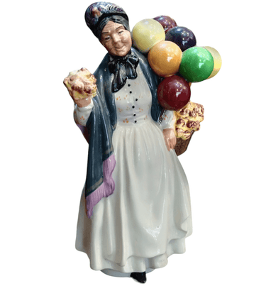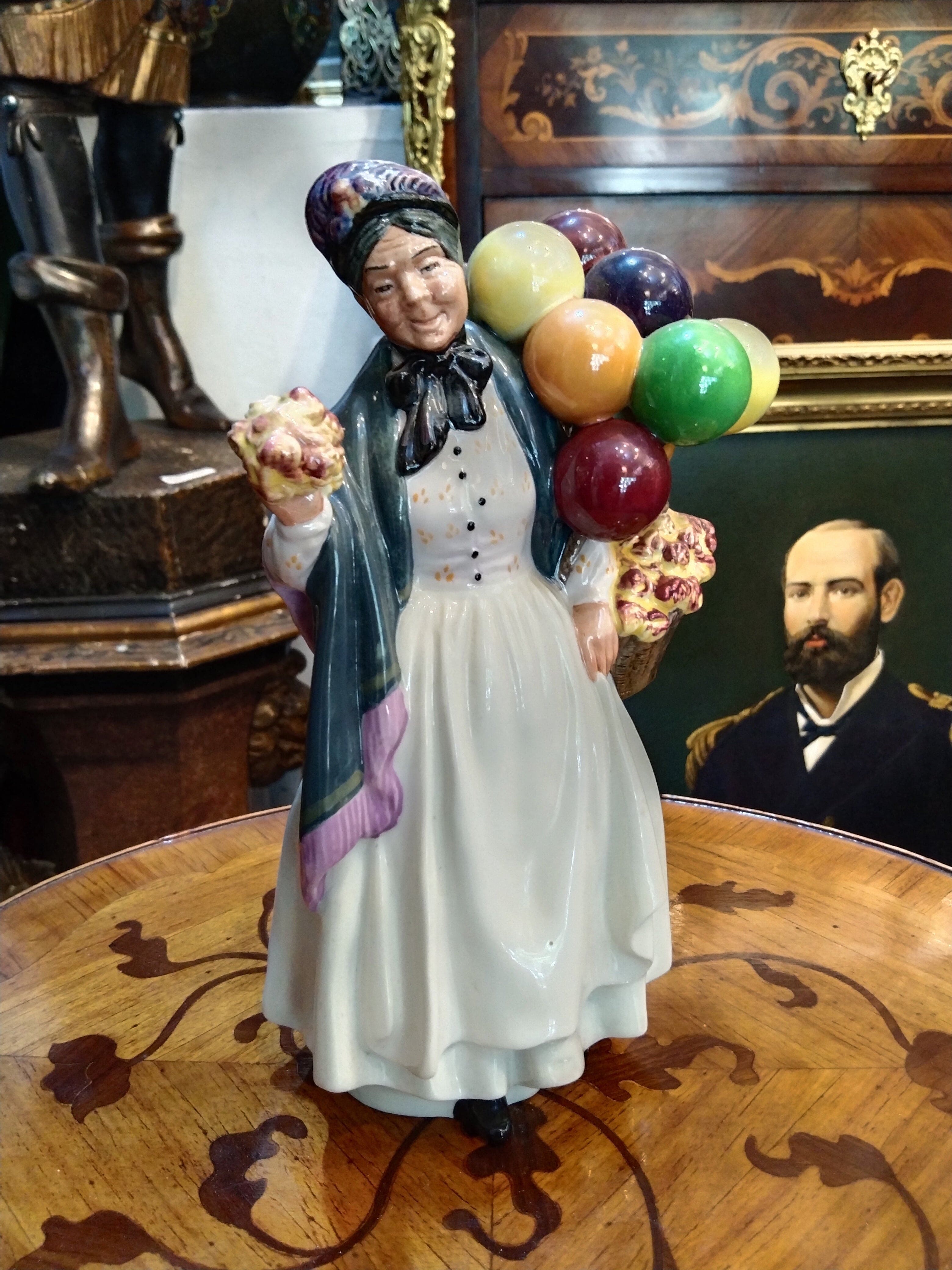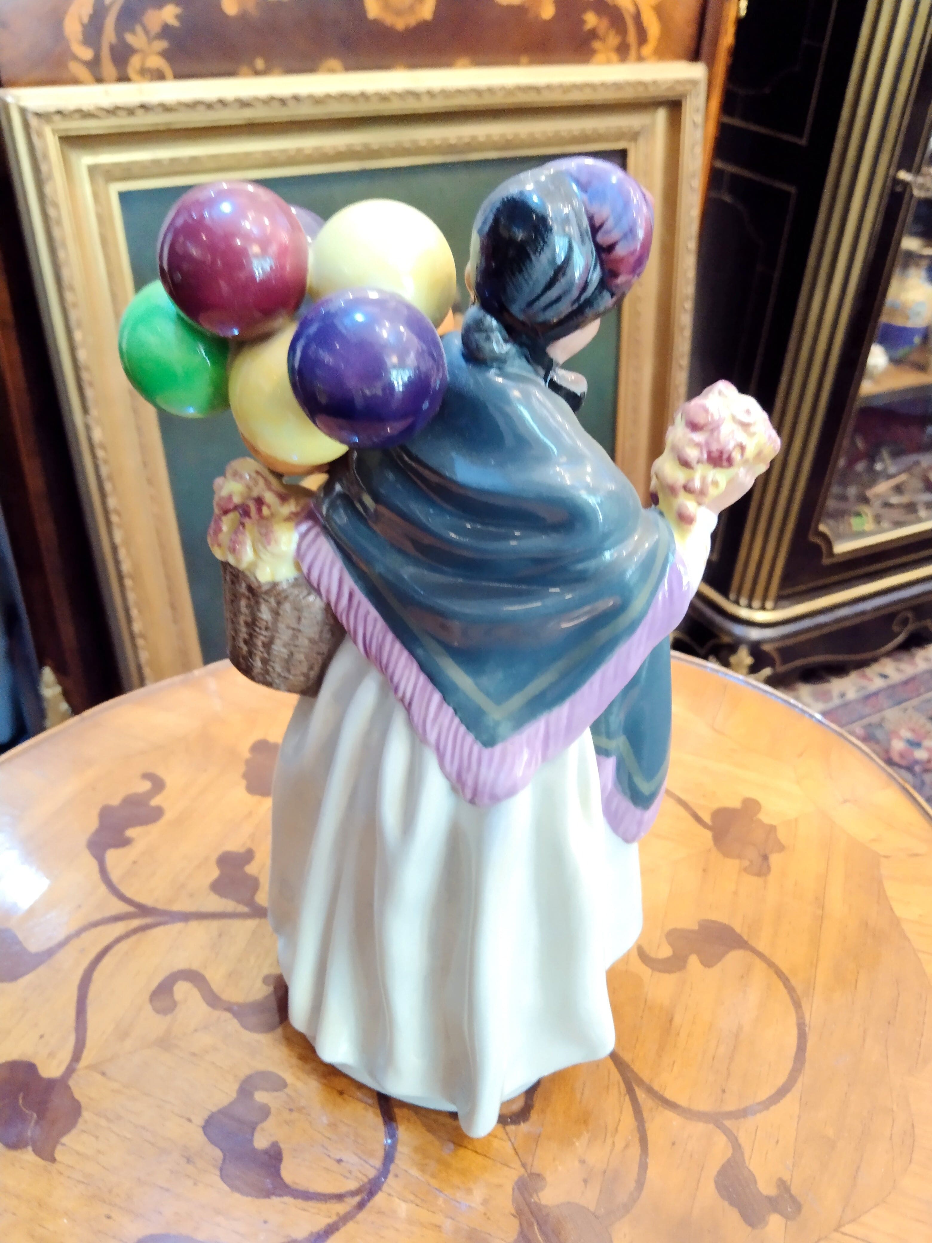 Figurine en porcelaine Royal Doulton représentant une femme debout tenant des fleurs et des ballons. La porcelaine est peinte à la main.