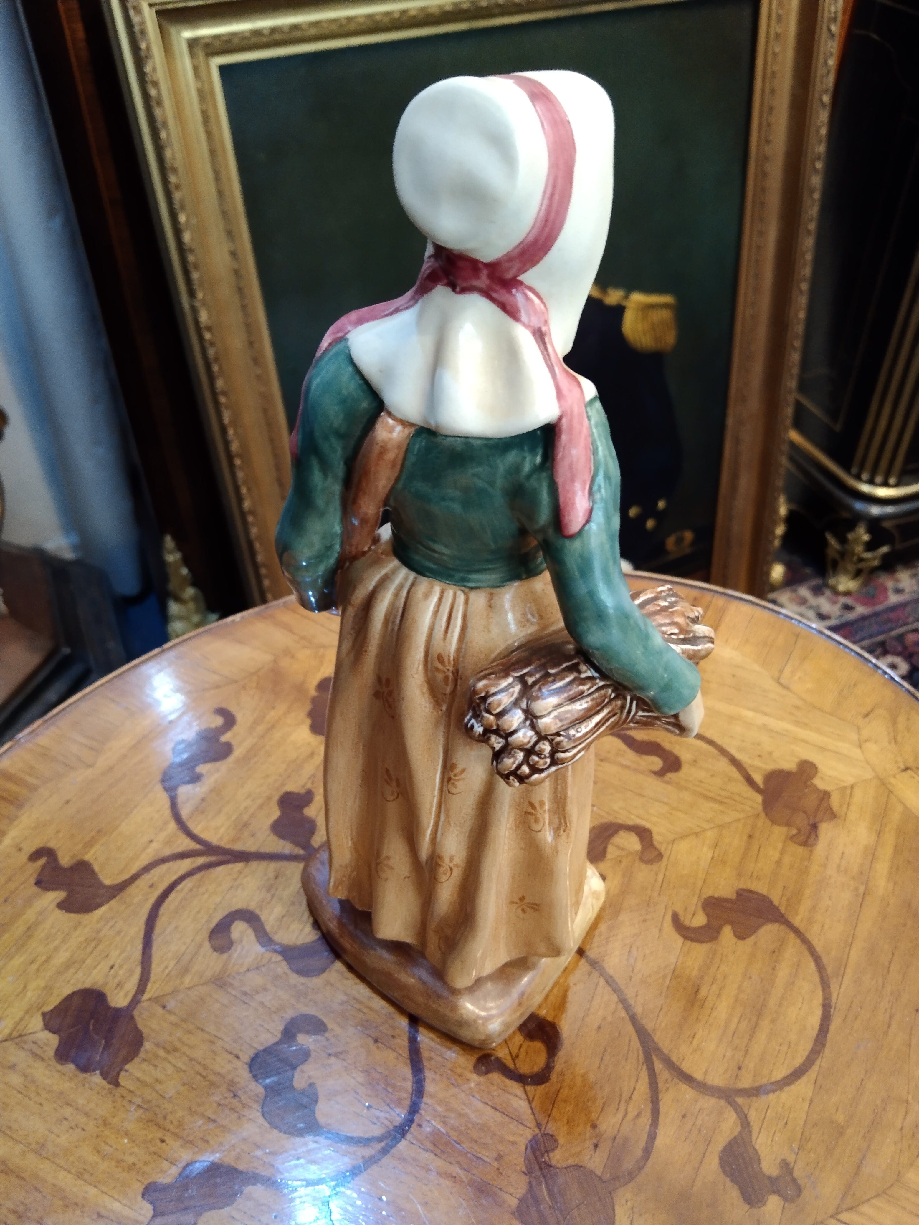 Figurine en porcelaine Royal Doulton représentant une paysanne française tenant une botte de blé. La porcelaine est peinte à la main.