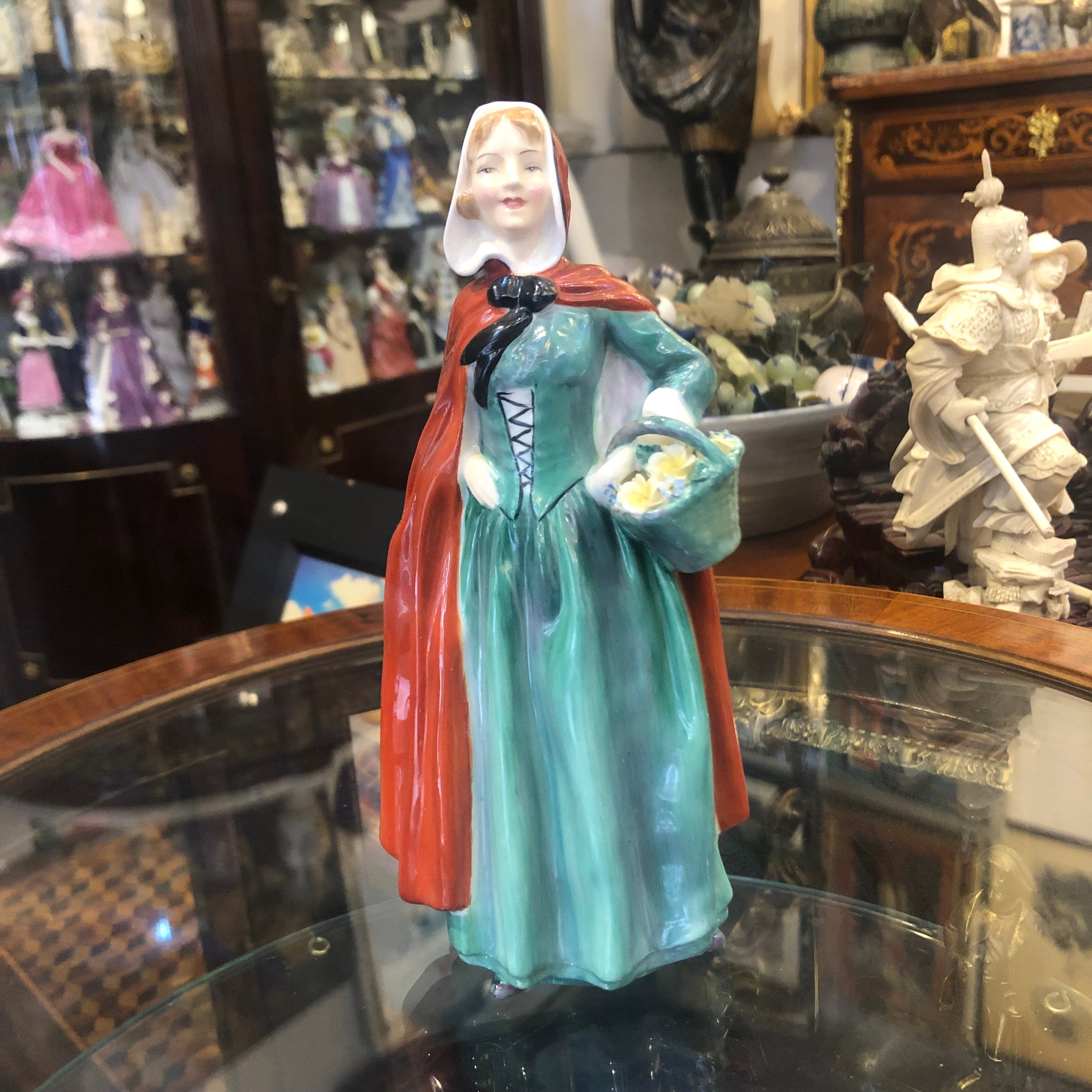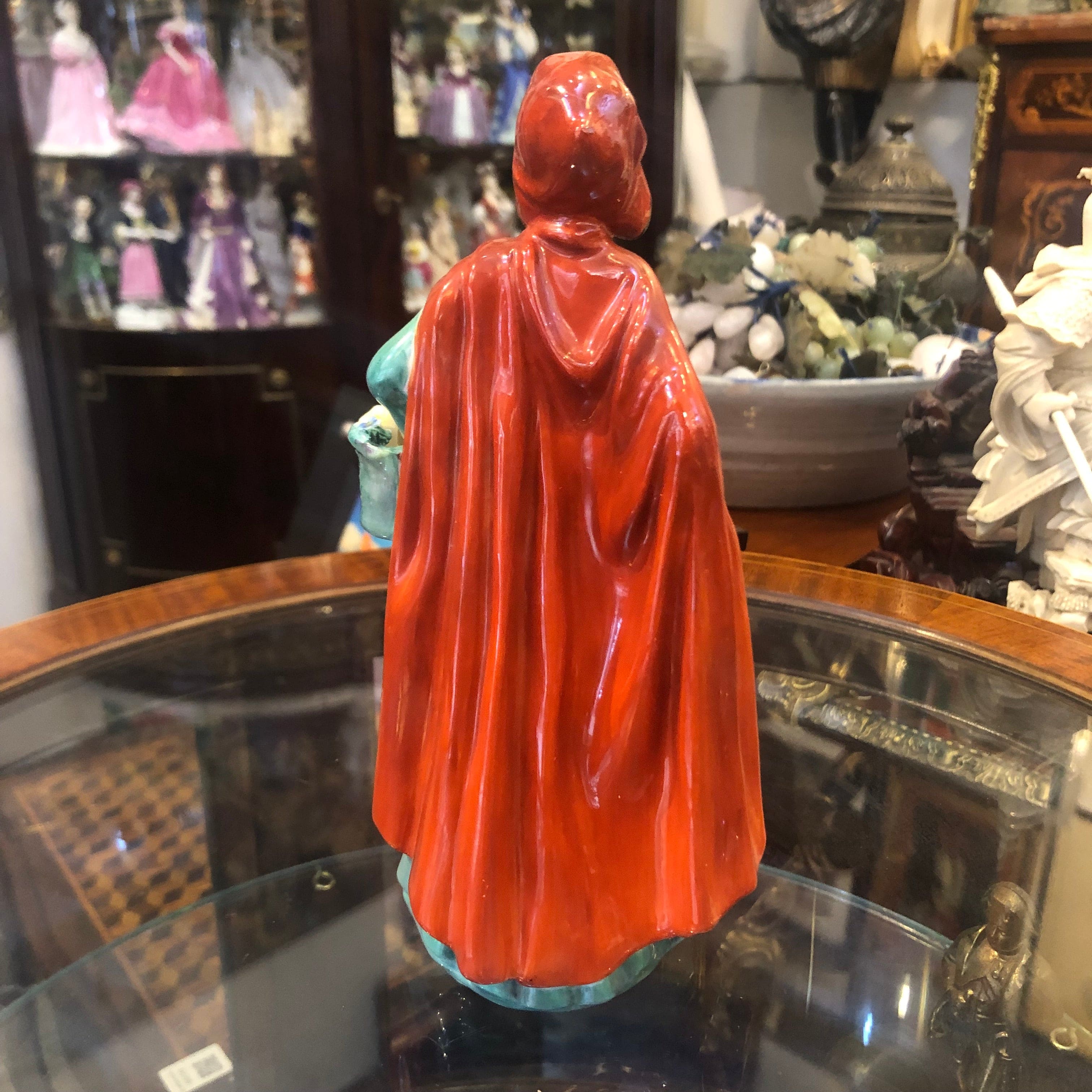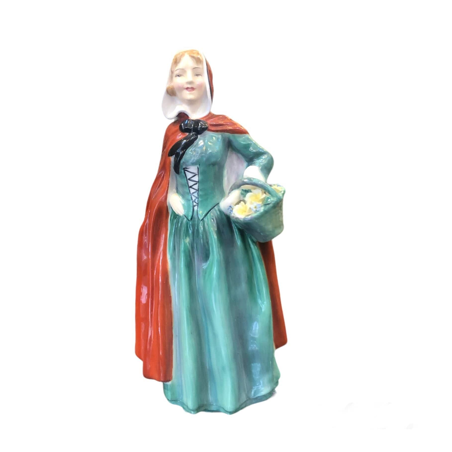 Figurine en porcelaine Royal Doulton, produite en série et peinte à la main, représentant une femme avec une cape rouge et un panier de fleurs.