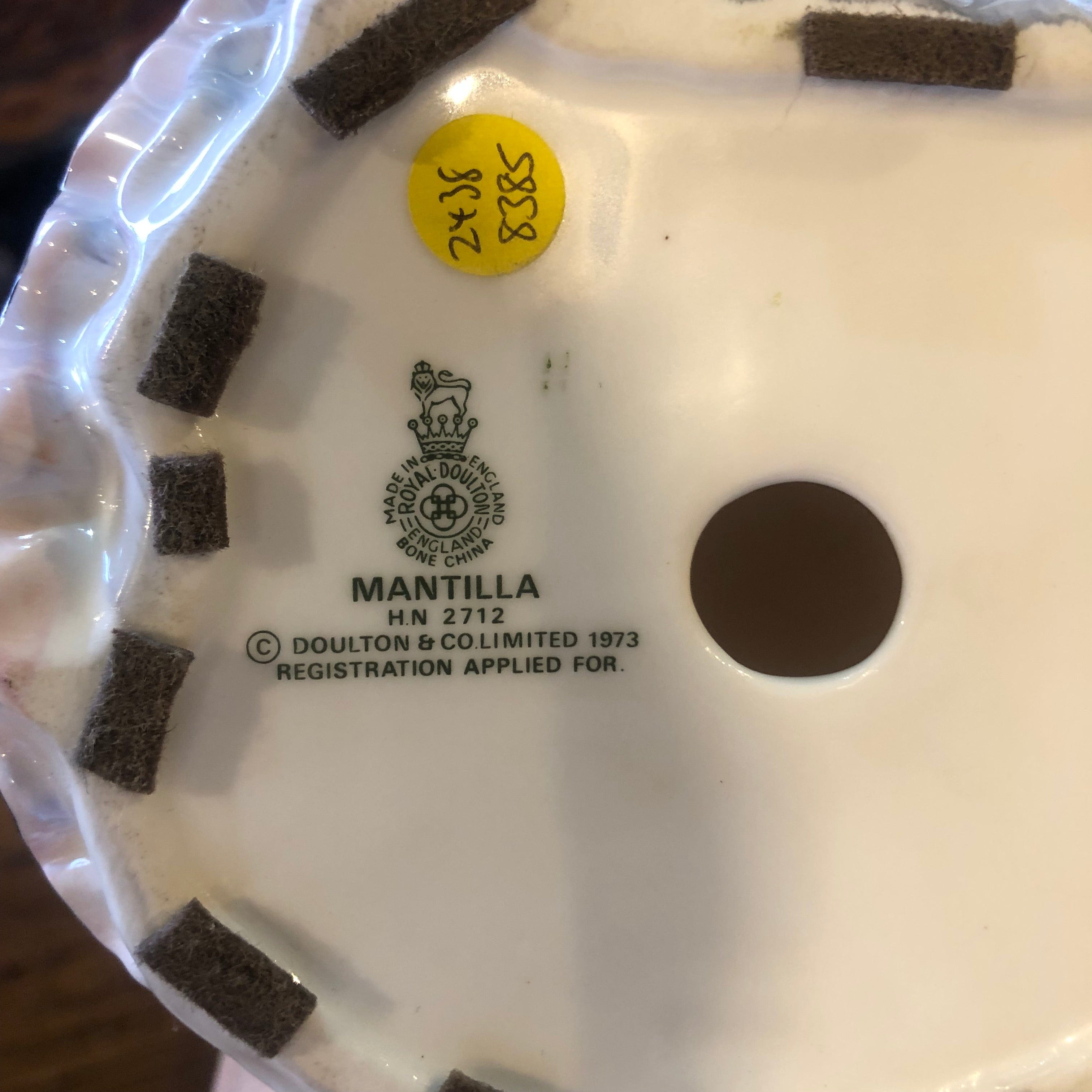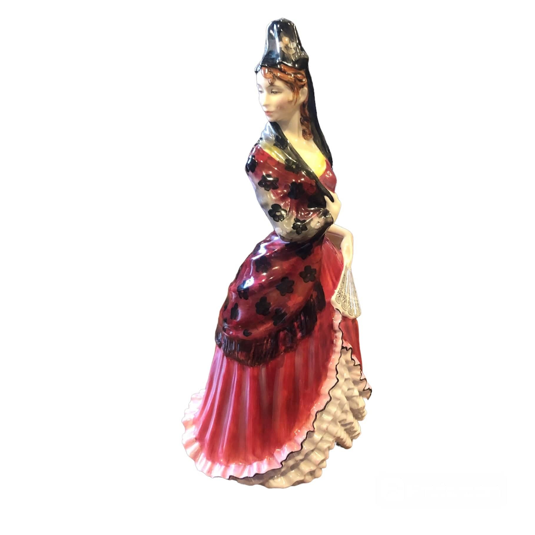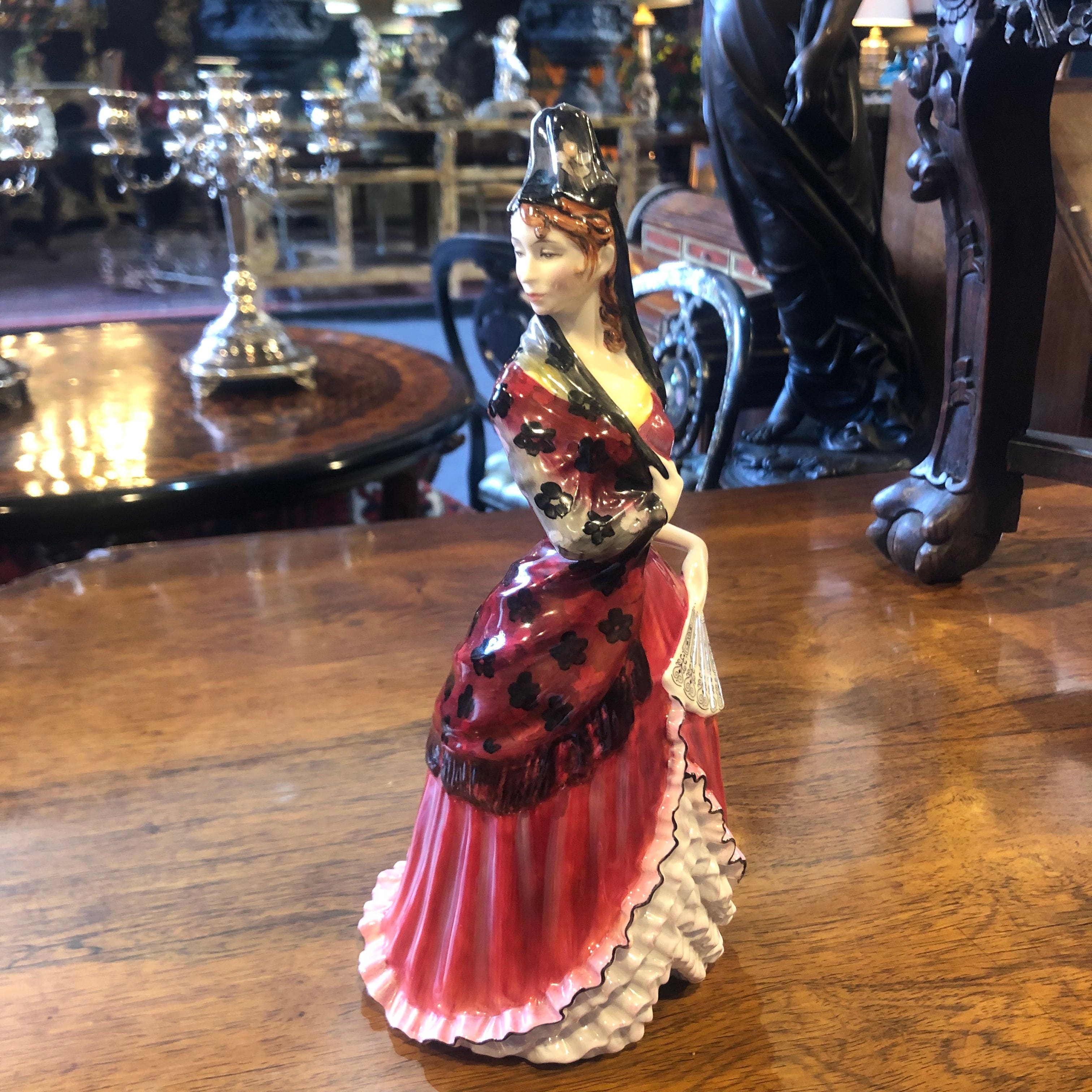 Figurine en porcelaine Royal Doulton, produite en série et peinte à la main, représentant une femme portant une robe couverture de style voile qui recouvre une partie de son grand chapeau.