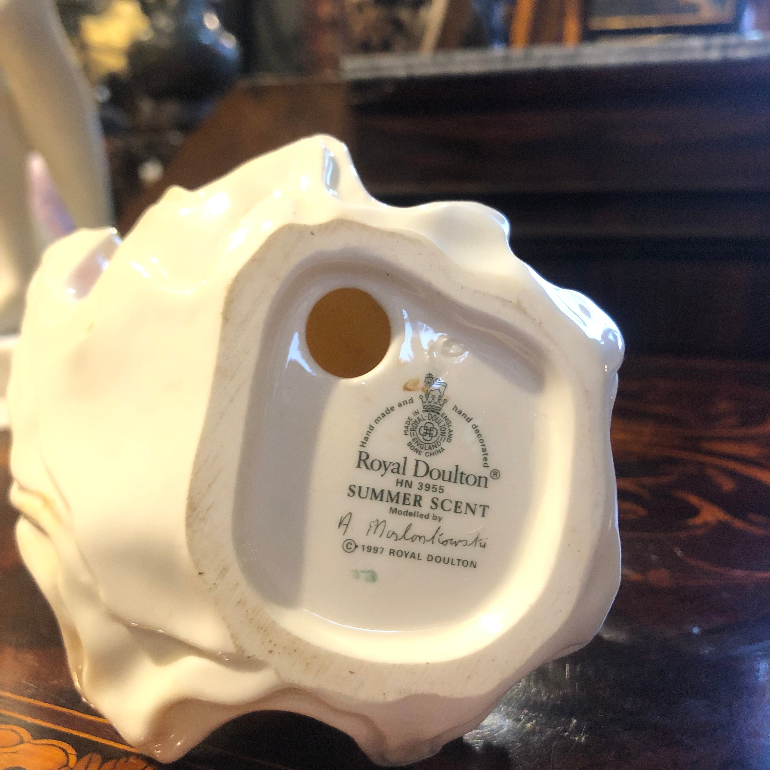 Figurita de porcelana de origen inglés de la reconocida marca Royal Doulton, fabricada en 1997. La pieza representa a una mujer con un vestido de color rosado y amarillo, con un pañuelo celeste alrededor de sus hombros. El nombre de la figura es Summer Scent o “Esencia veraniega”, aludiendo a la canasta con flores que lleva la mujer.
