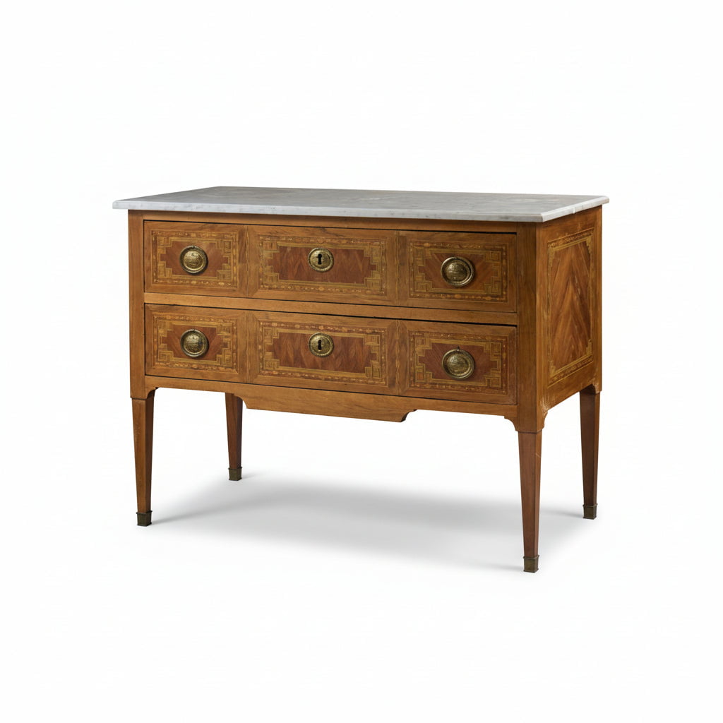 Cómoda en madera con marquetería, abriendo por tres cajones; decoración en bronce. Estilo Luis XVI o principios del siglo XIX. Mármol gris Sainte Anne