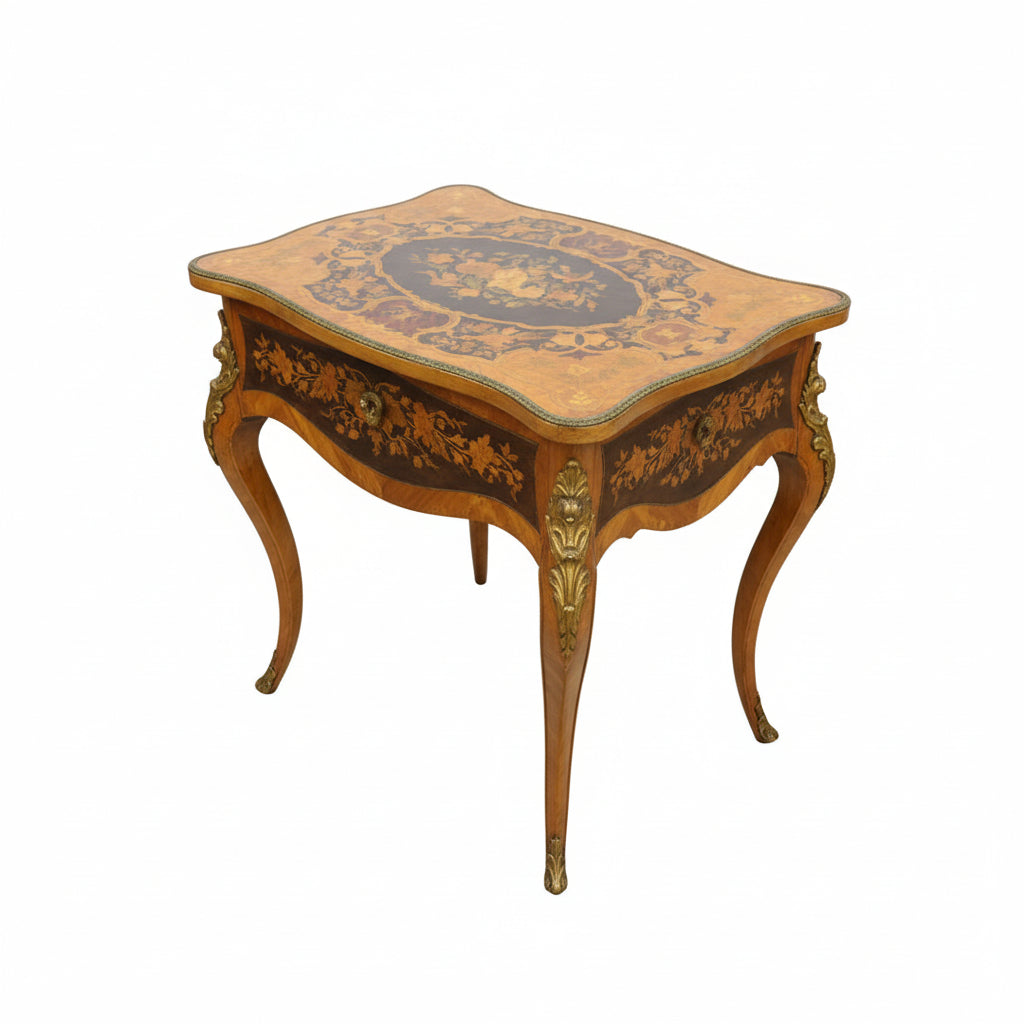Travailleuse estilo Luis XV, época Napoleón III, marquetería floral, aves y atributos de jardinería.