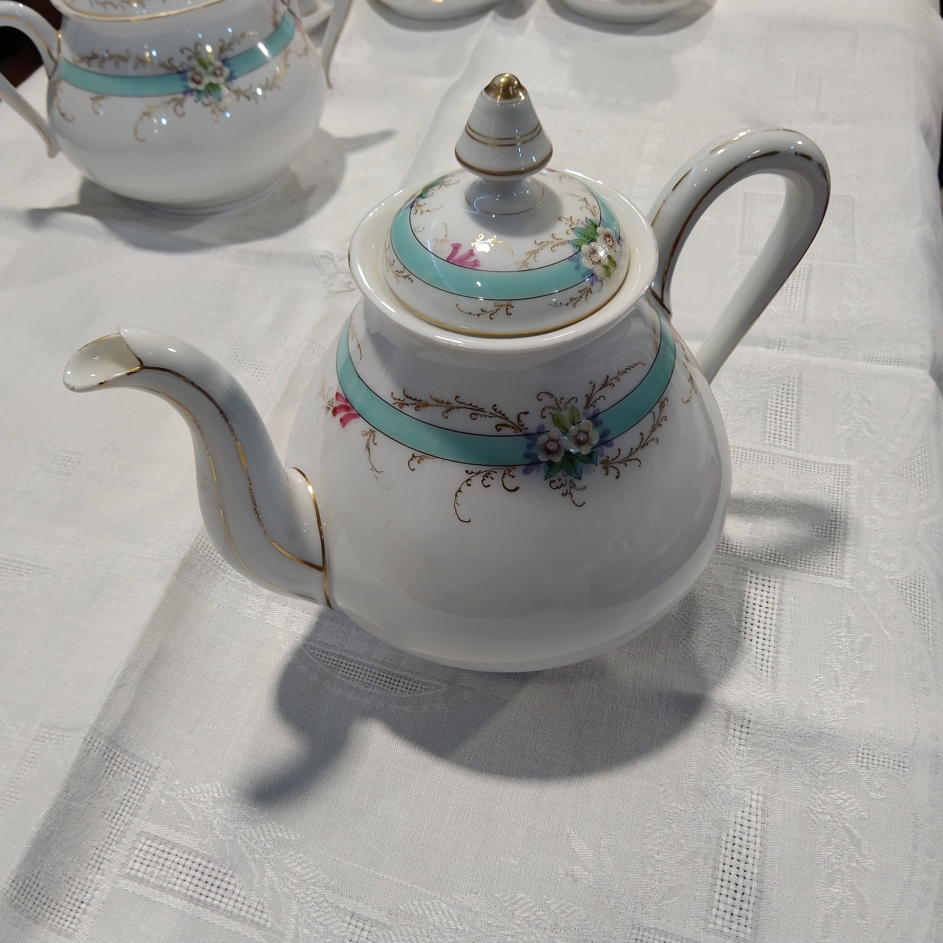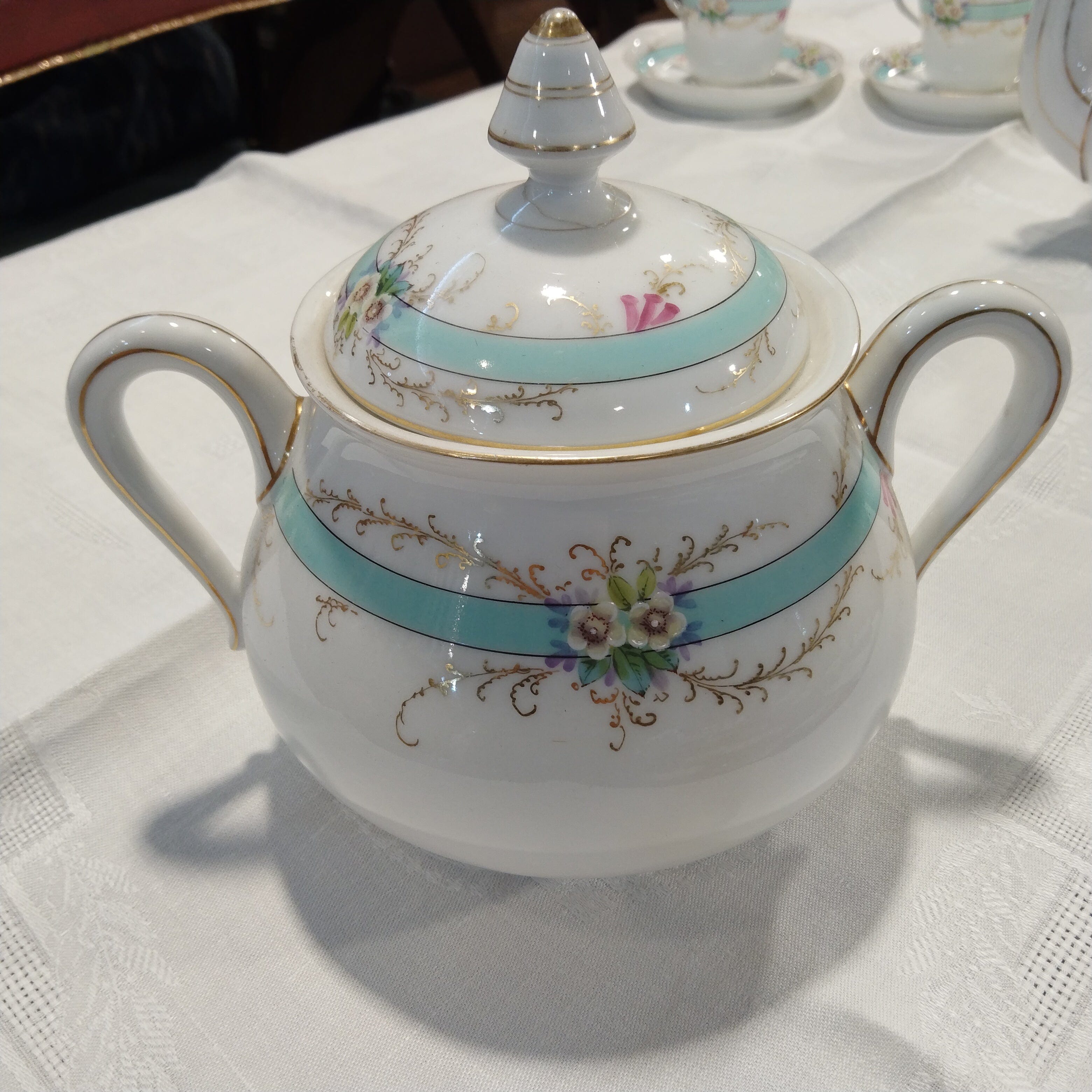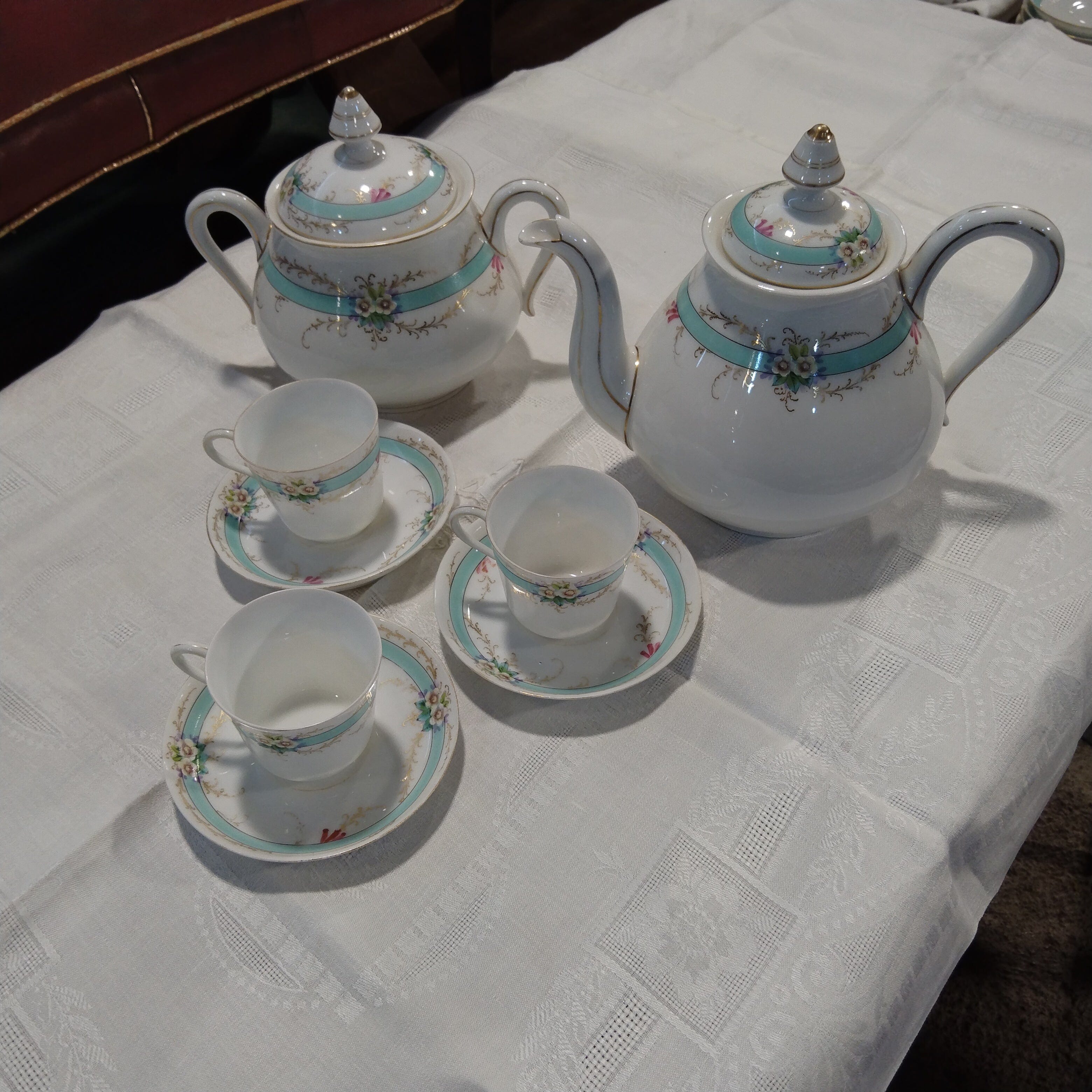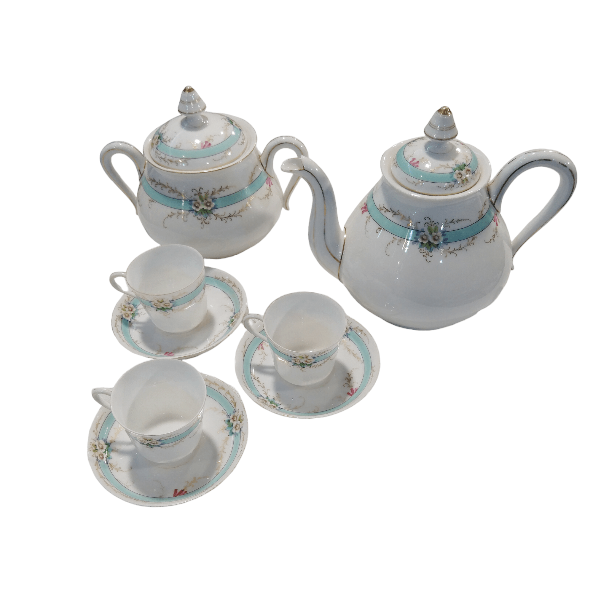 Service à thé en porcelaine française pour trois personnes avec une ceinture bleu clair et des fleurs