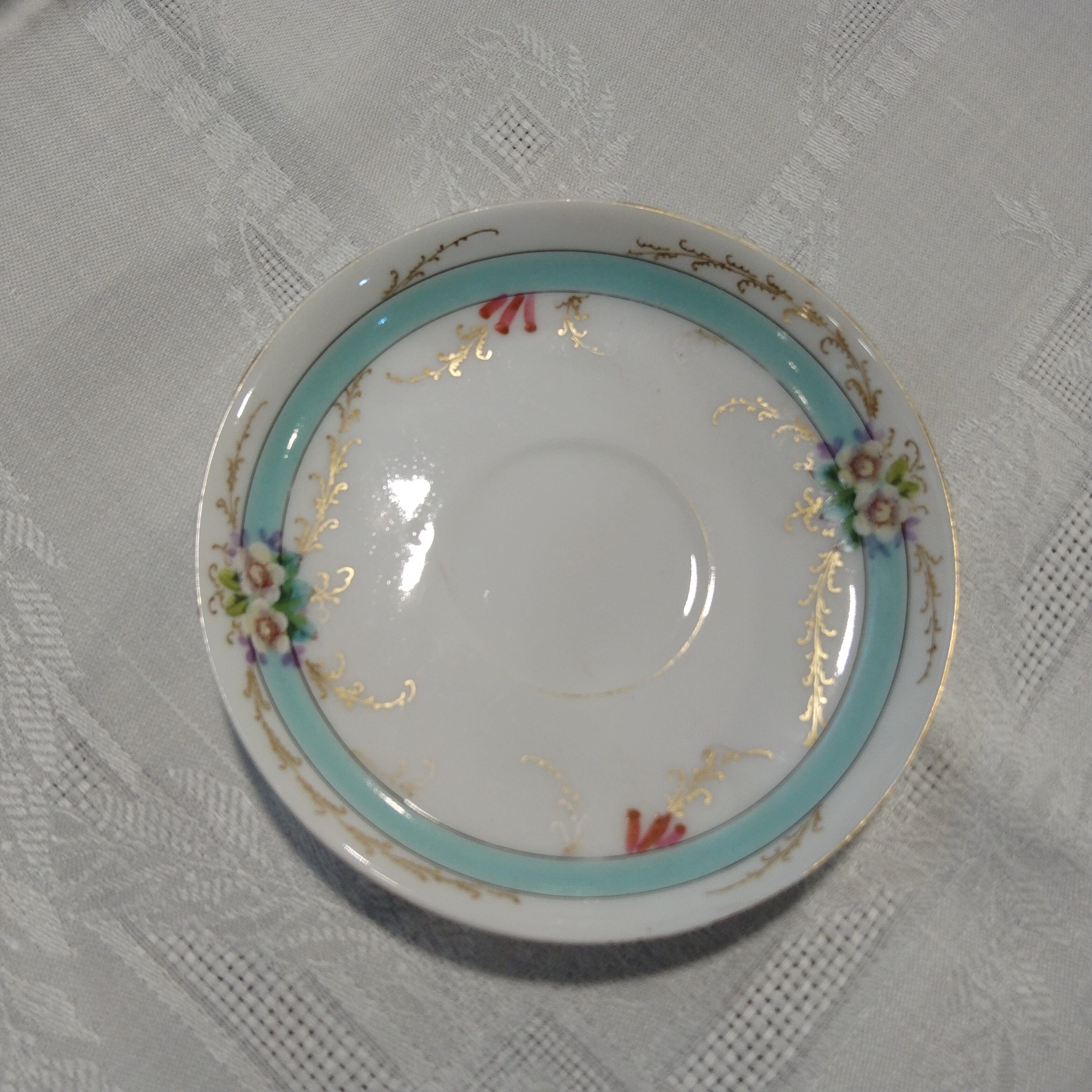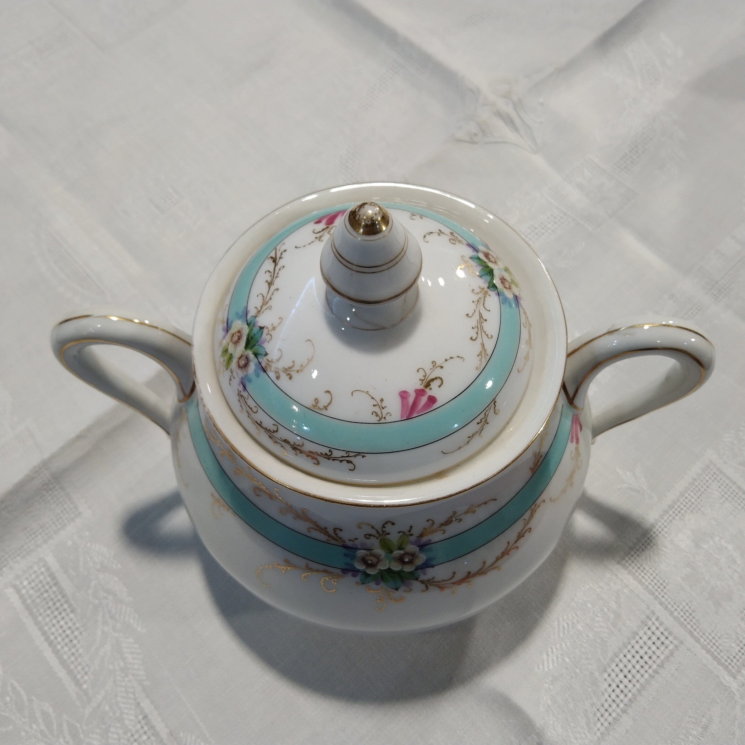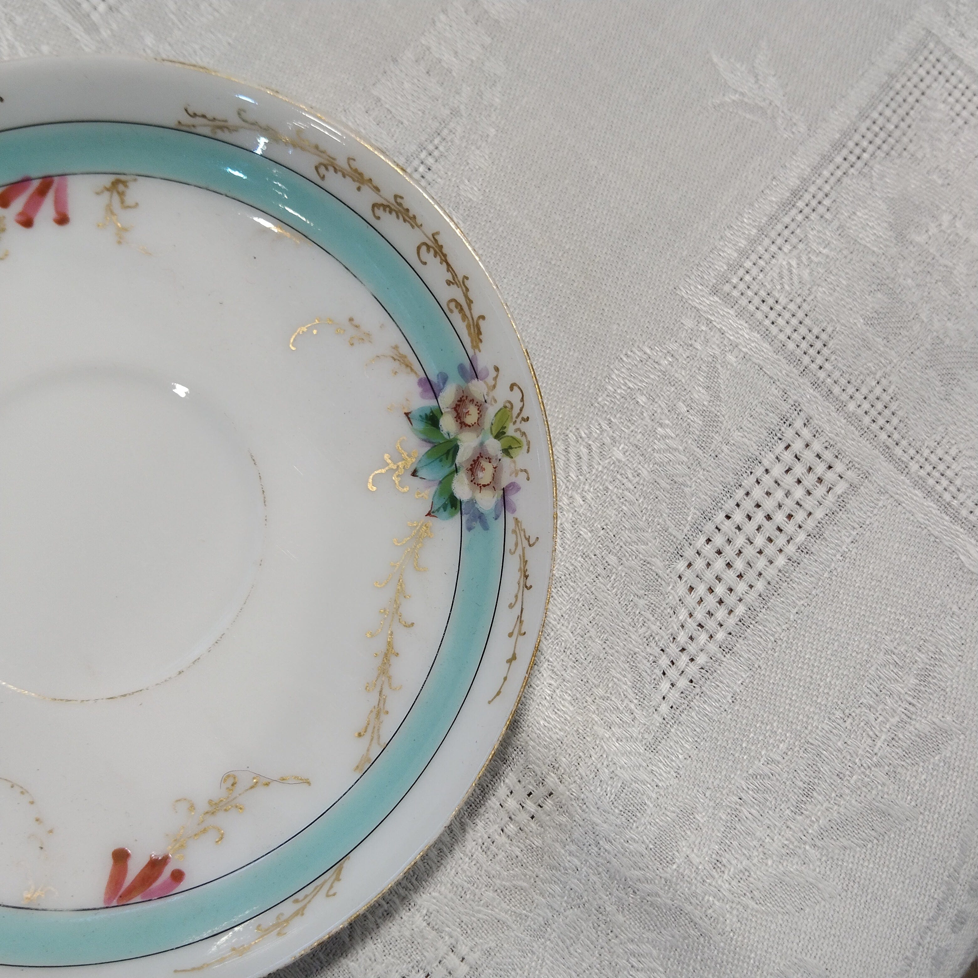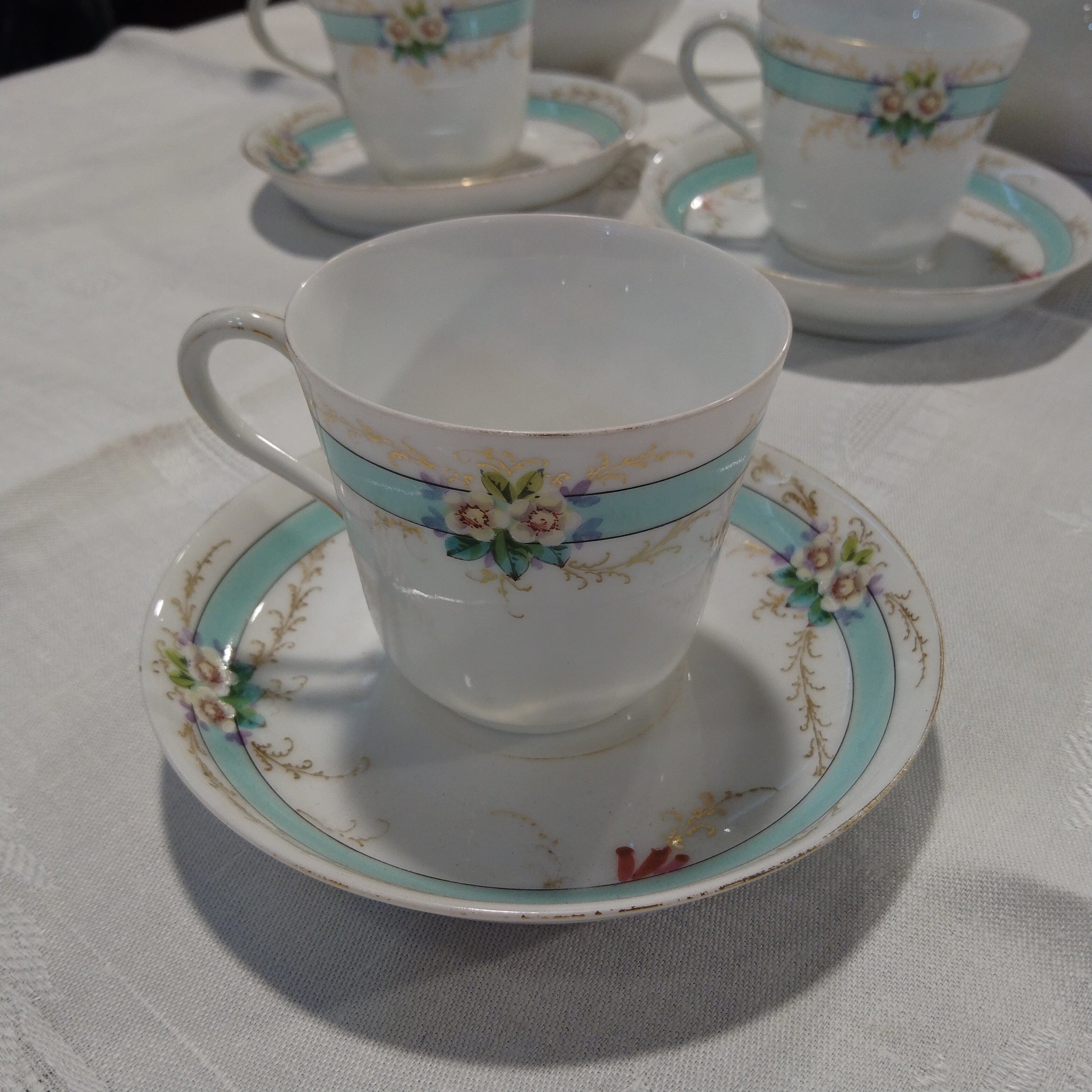 Service à thé en porcelaine française pour trois personnes avec une ceinture bleu clair et des fleurs