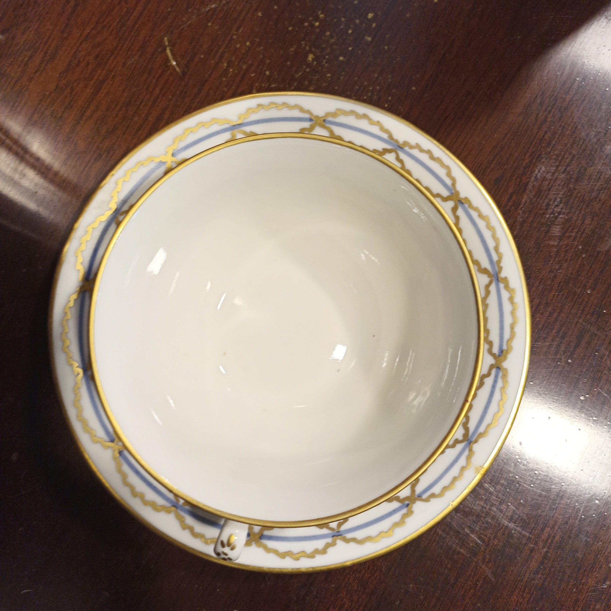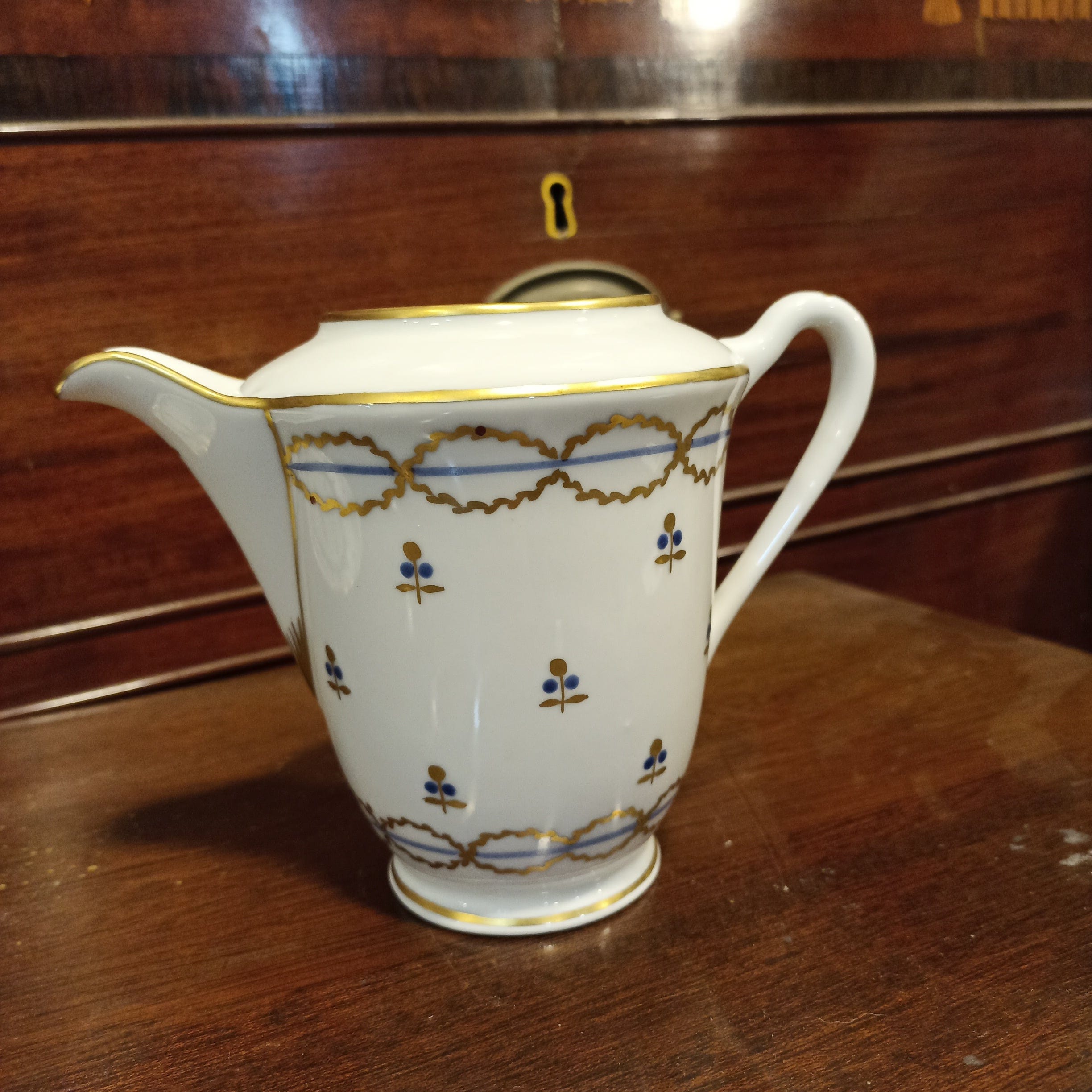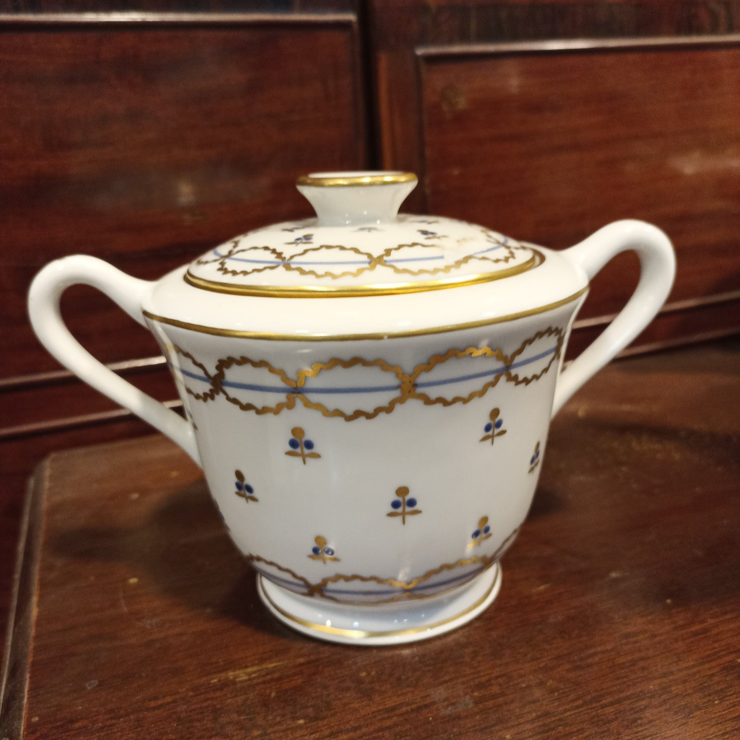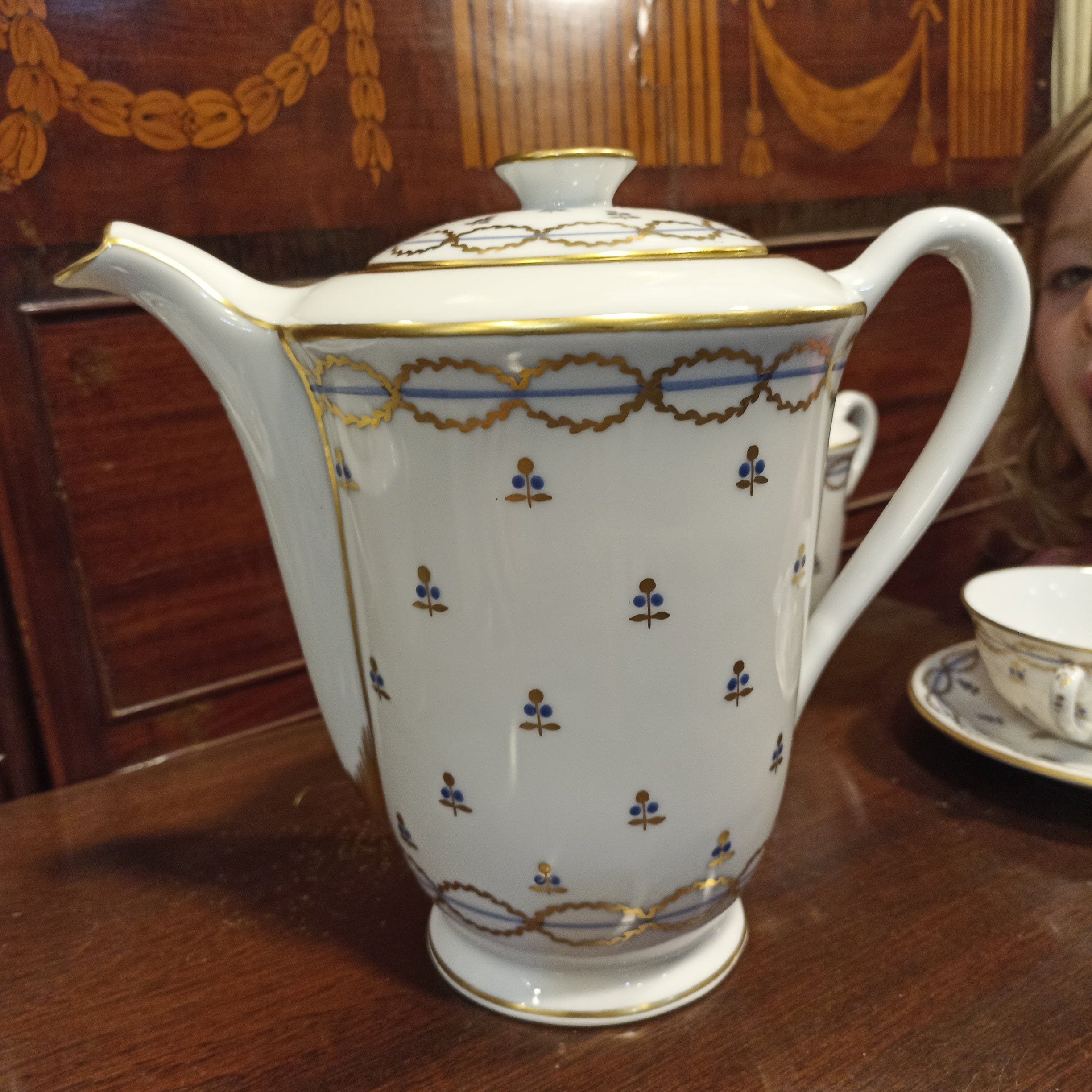 Magnifique service à thé Limoges LN pour huit personnes. Trois pièces de service : théière, crémier et sucrier, ainsi que six tasses et soucoupes.