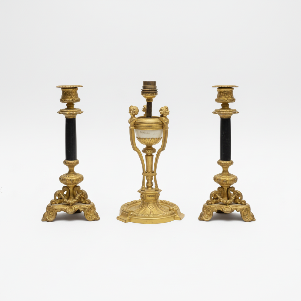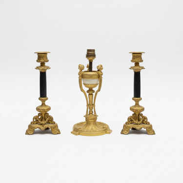 Pie de lámpara en bronce dorado y par de candelabros en mármol negro fines s.XIX
