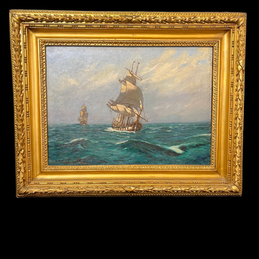 Marina del destacado pintor chileno Álvaro Casanova Zenteno. Una de sus clásicas pinturas con motivos navales. La escena nos muestra dos embarcaciones navegando en alta mar con un mar un poco encrespado y un cielo nuboso. Casanova nos envuelve con su pintura realista.