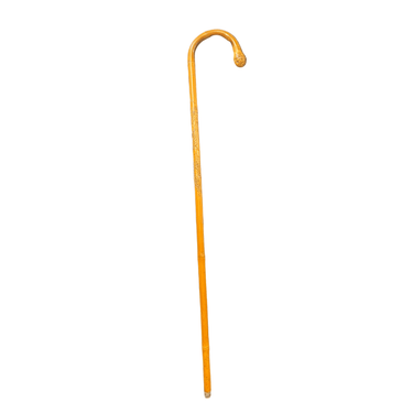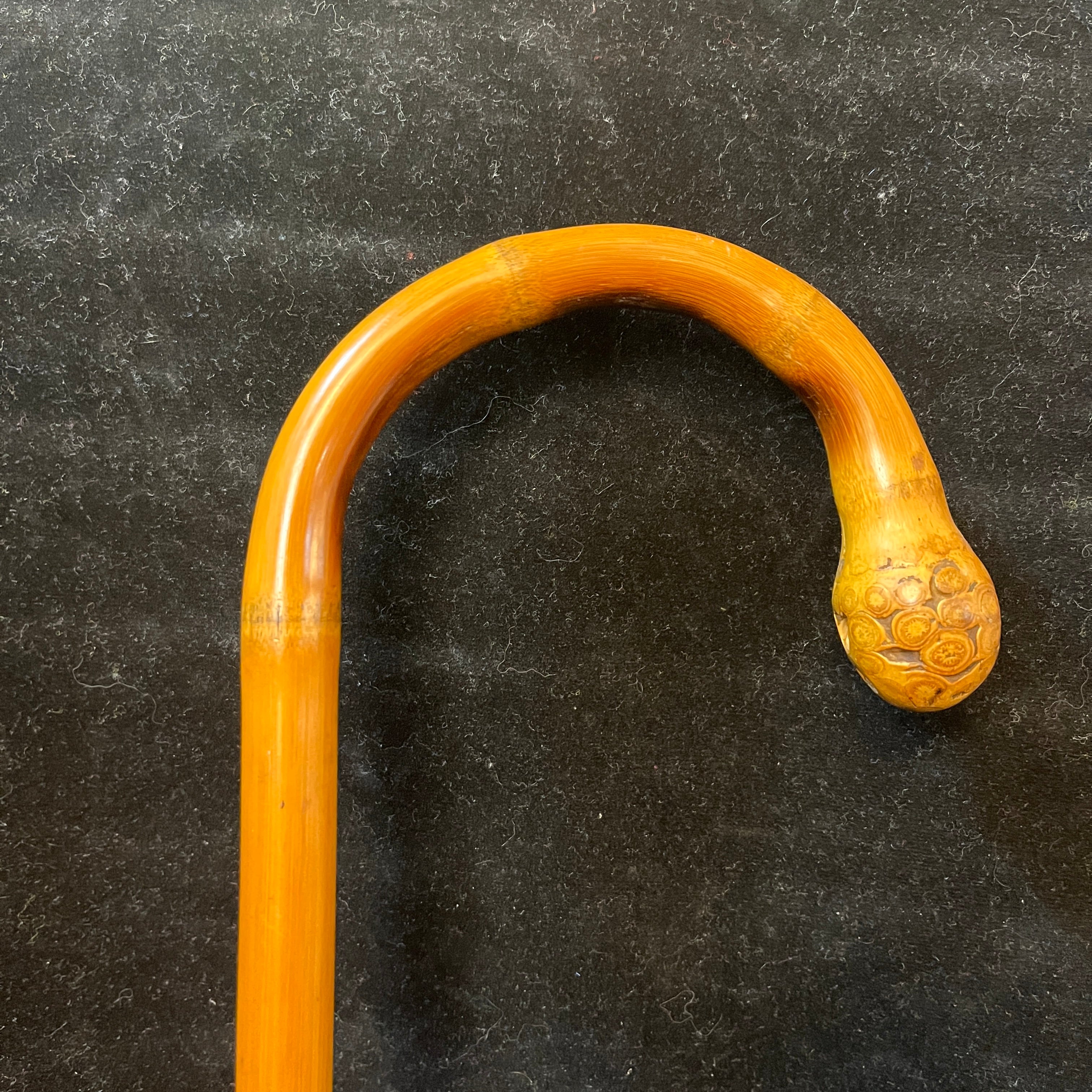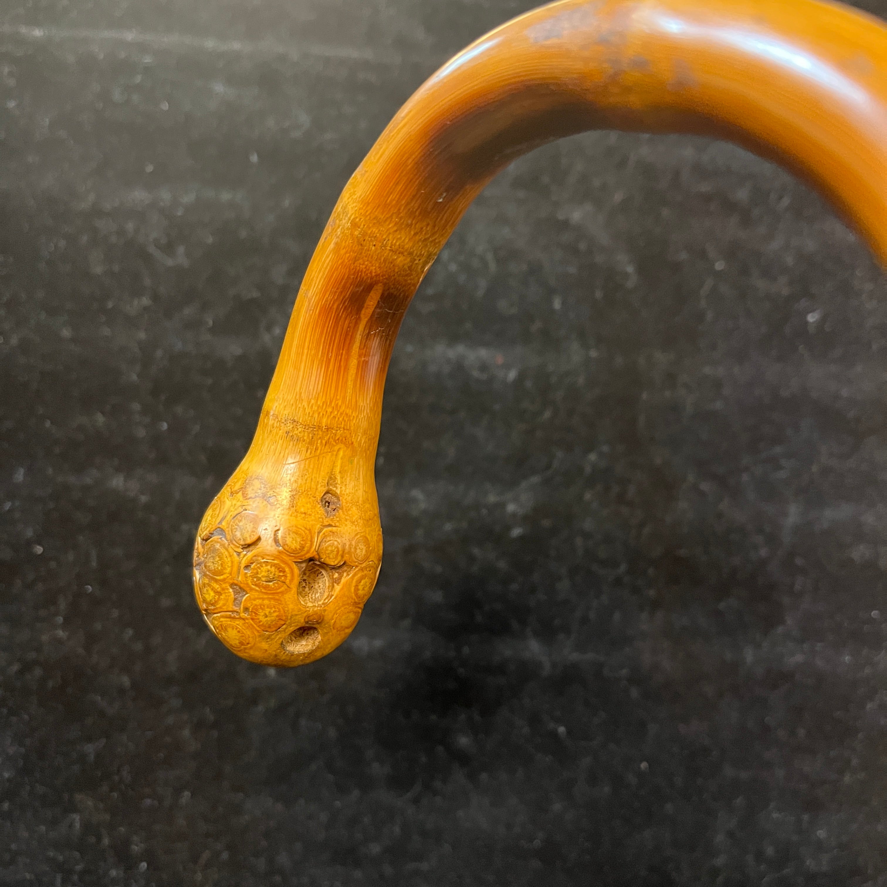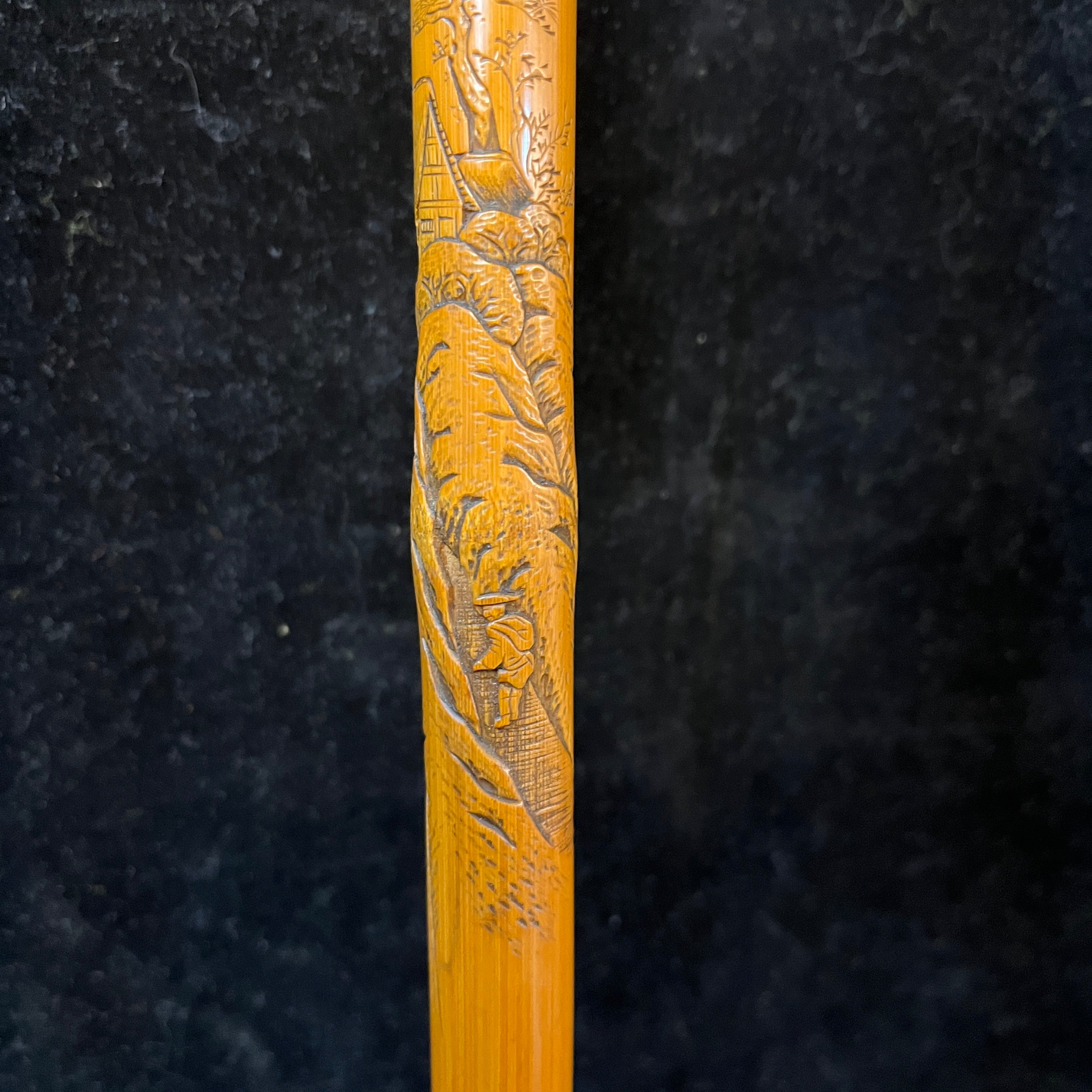 Bello bastón chino antiguo hecho de madera tallada con increíbles y detallados paisajes de montañas, con casitas, árboles y personajes escalando entre ellas. Su mango curvo termina en una esfera tallada con pequeños circulitos que siguen la veta de la madera.