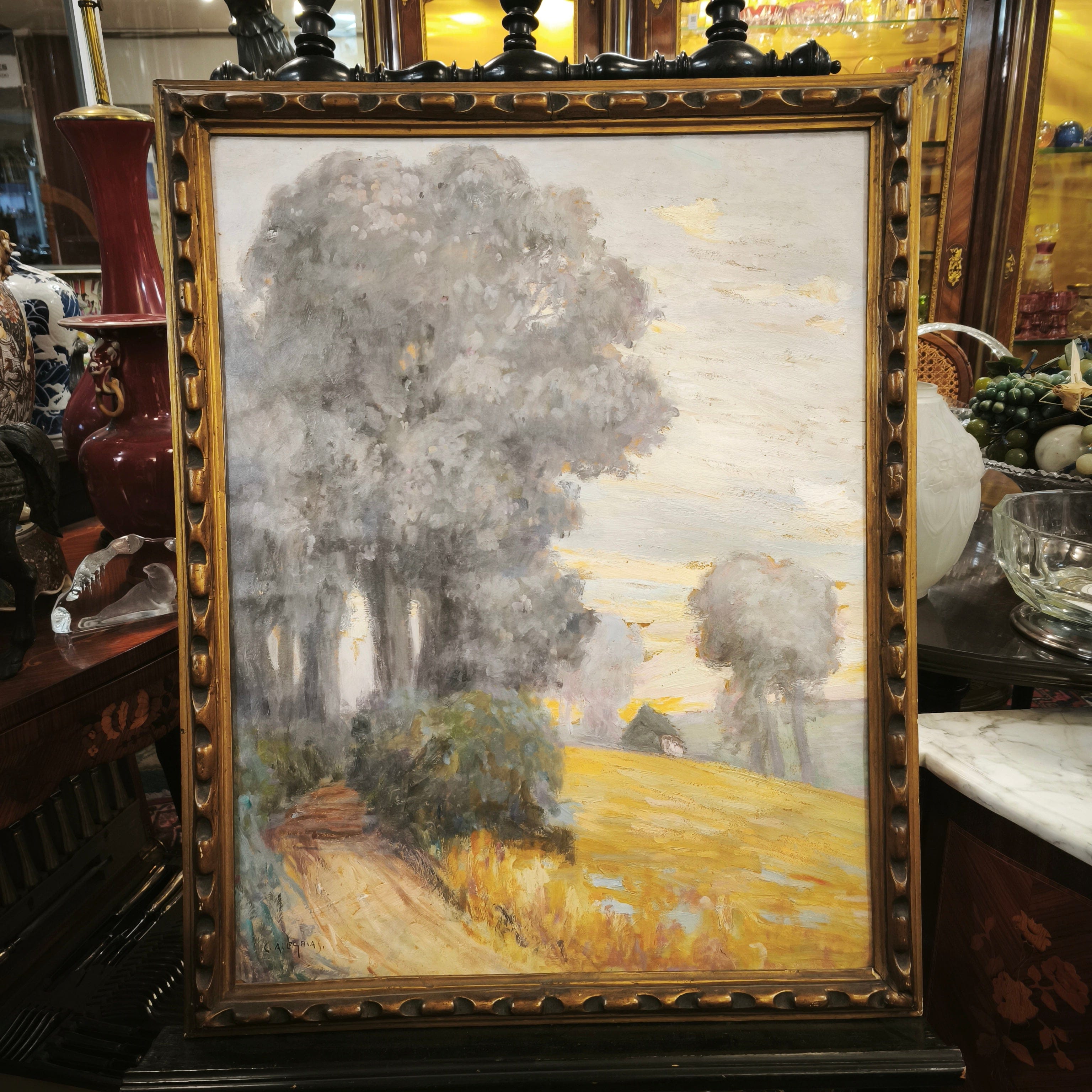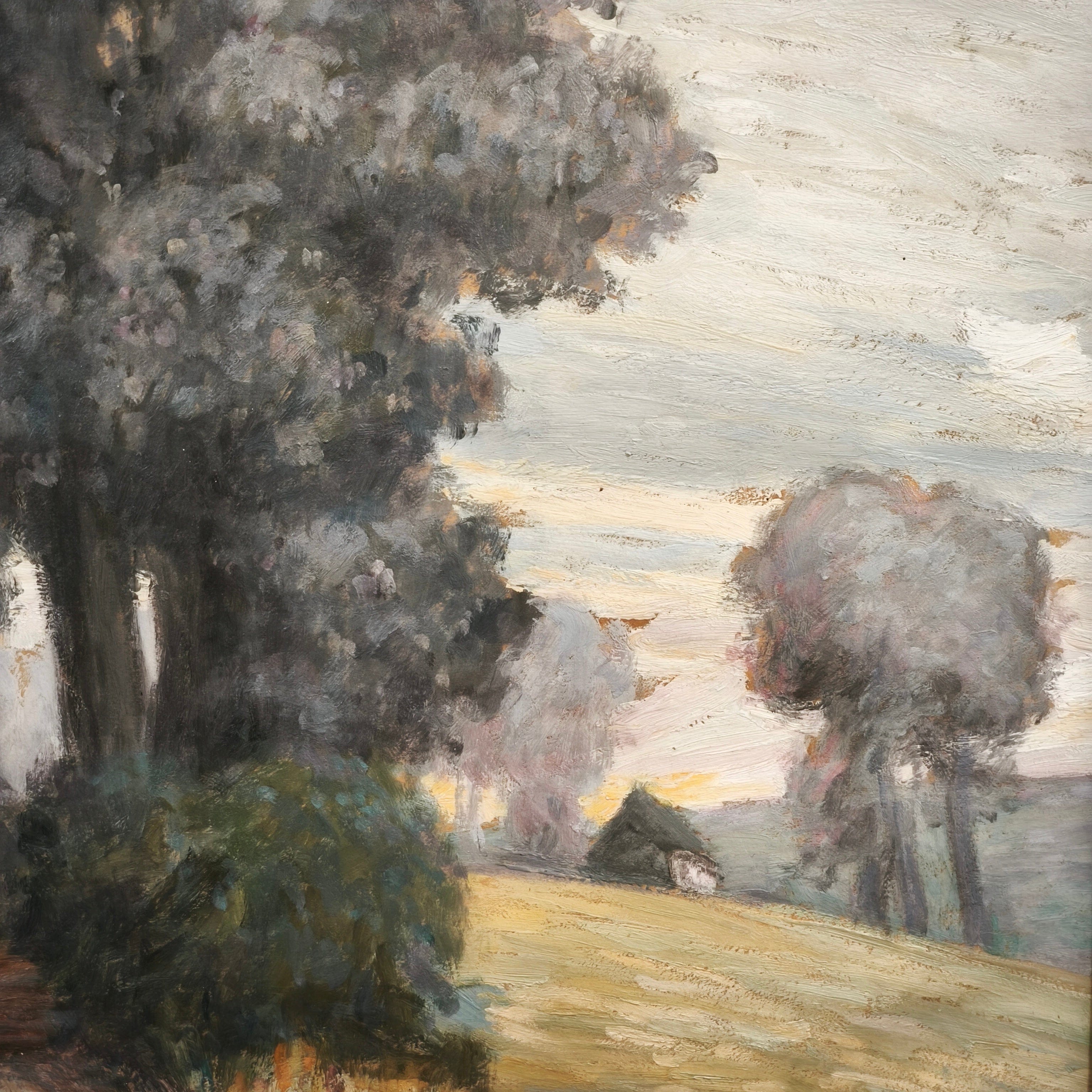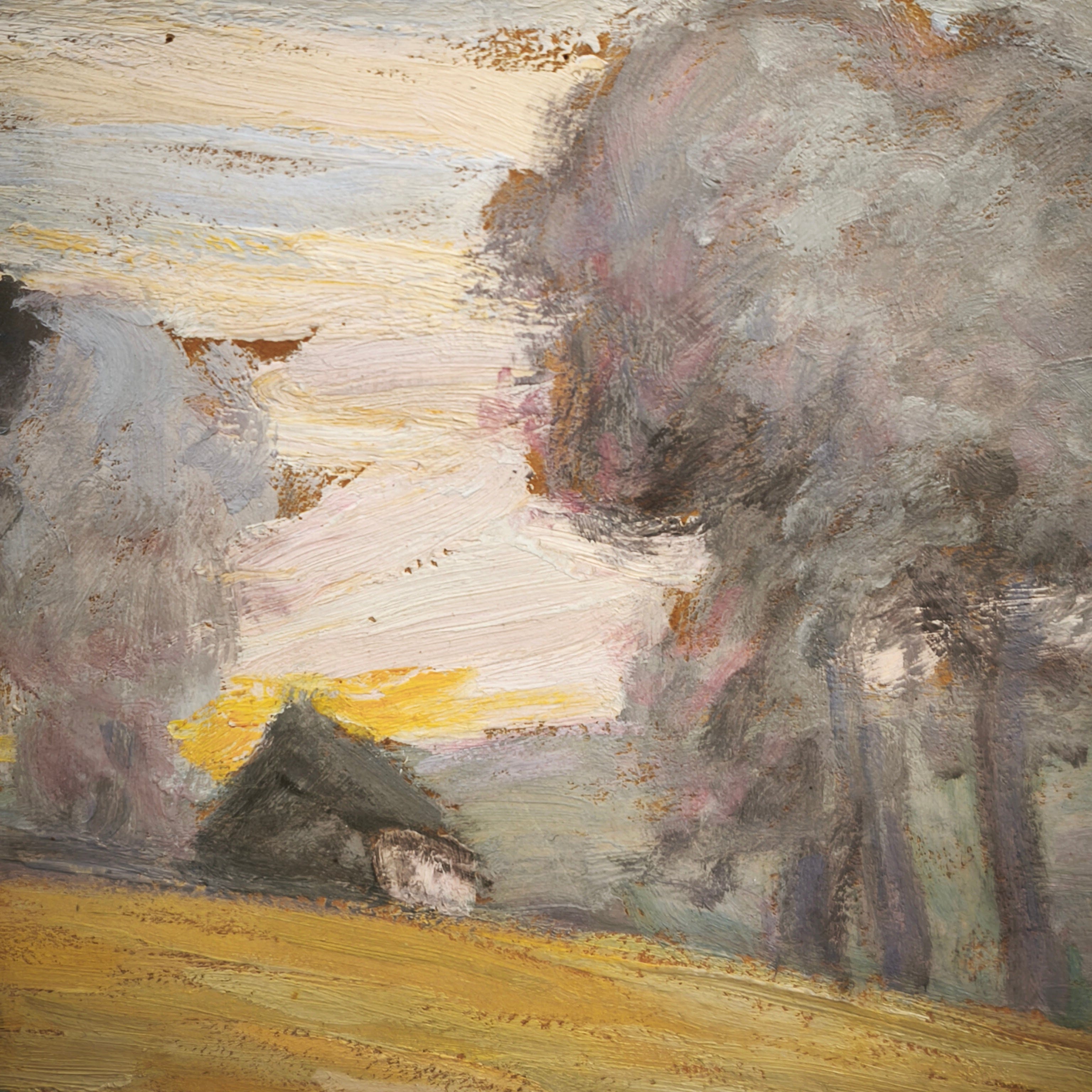 Dans cette œuvre, nous voyons un paysage rural avec une maison en arrière-plan illuminée par un ciel dont les teintes jaunes et orange semblent représenter un coucher de soleil.