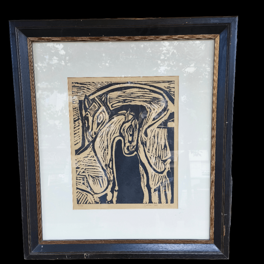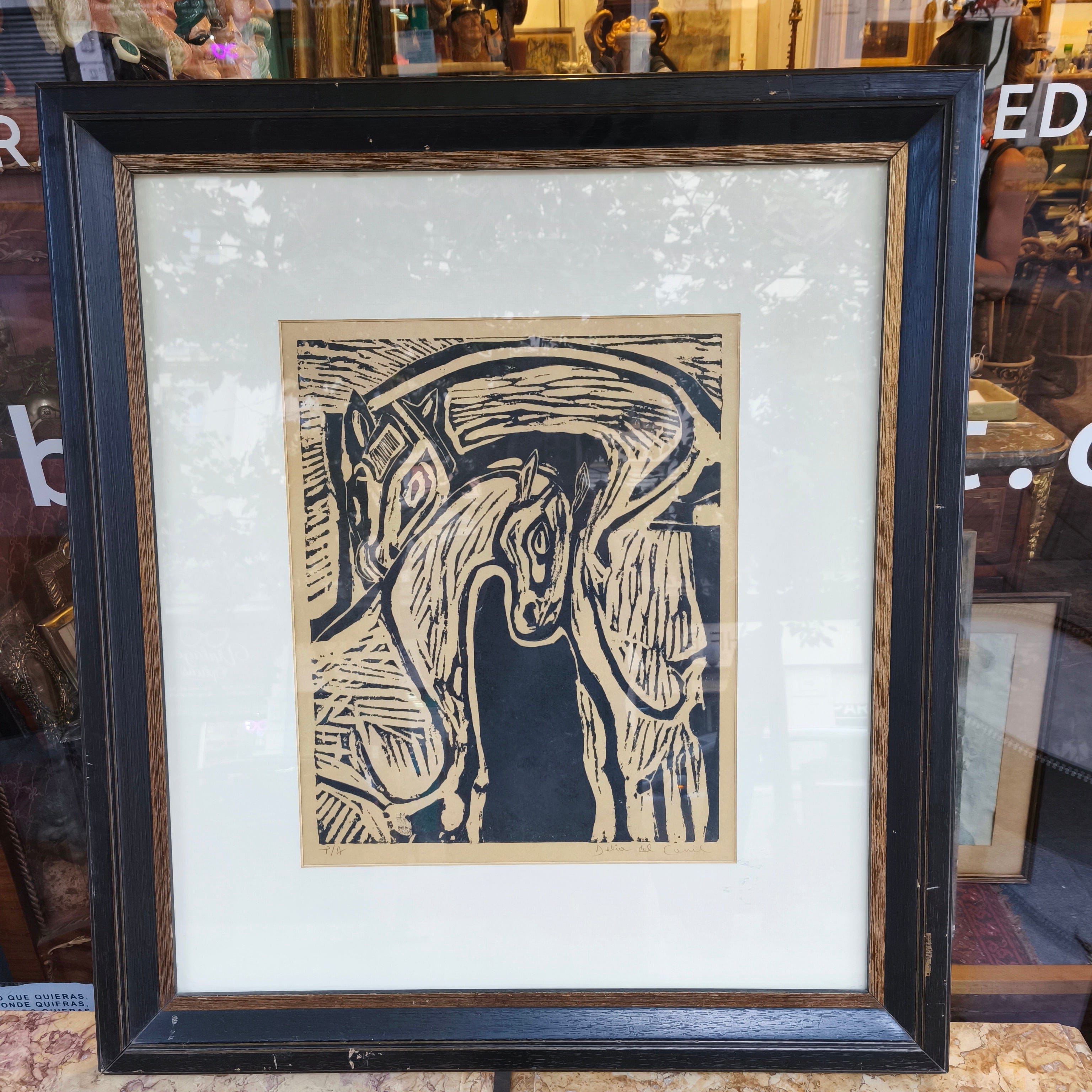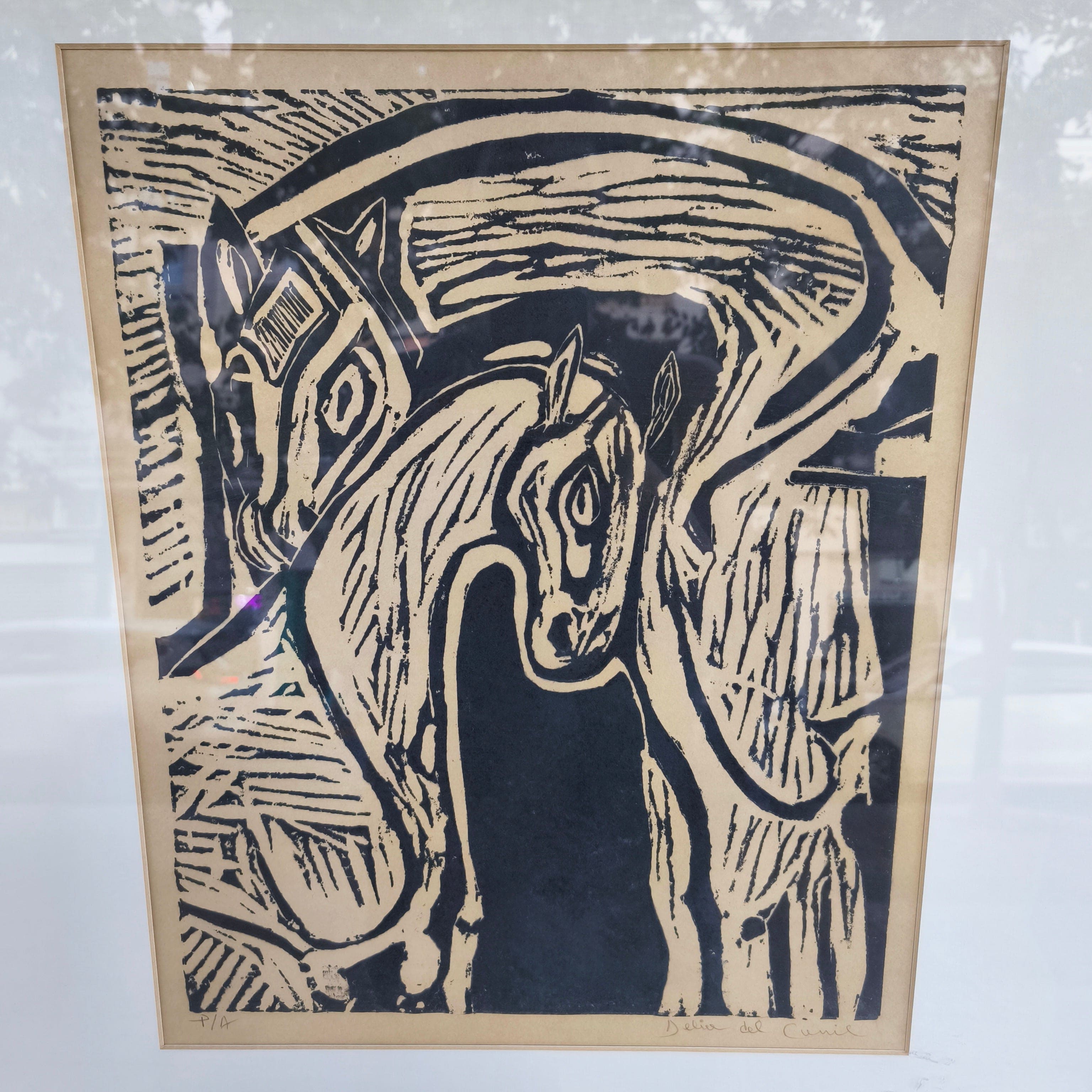 Gravure sur bois signée et numérotée de l'artiste chilienne Delia del Carril représentant deux chevaux se caressant. L'œuvre est encadrée dans un cadre simple en bois peint en noir avec une bordure intérieure dorée.