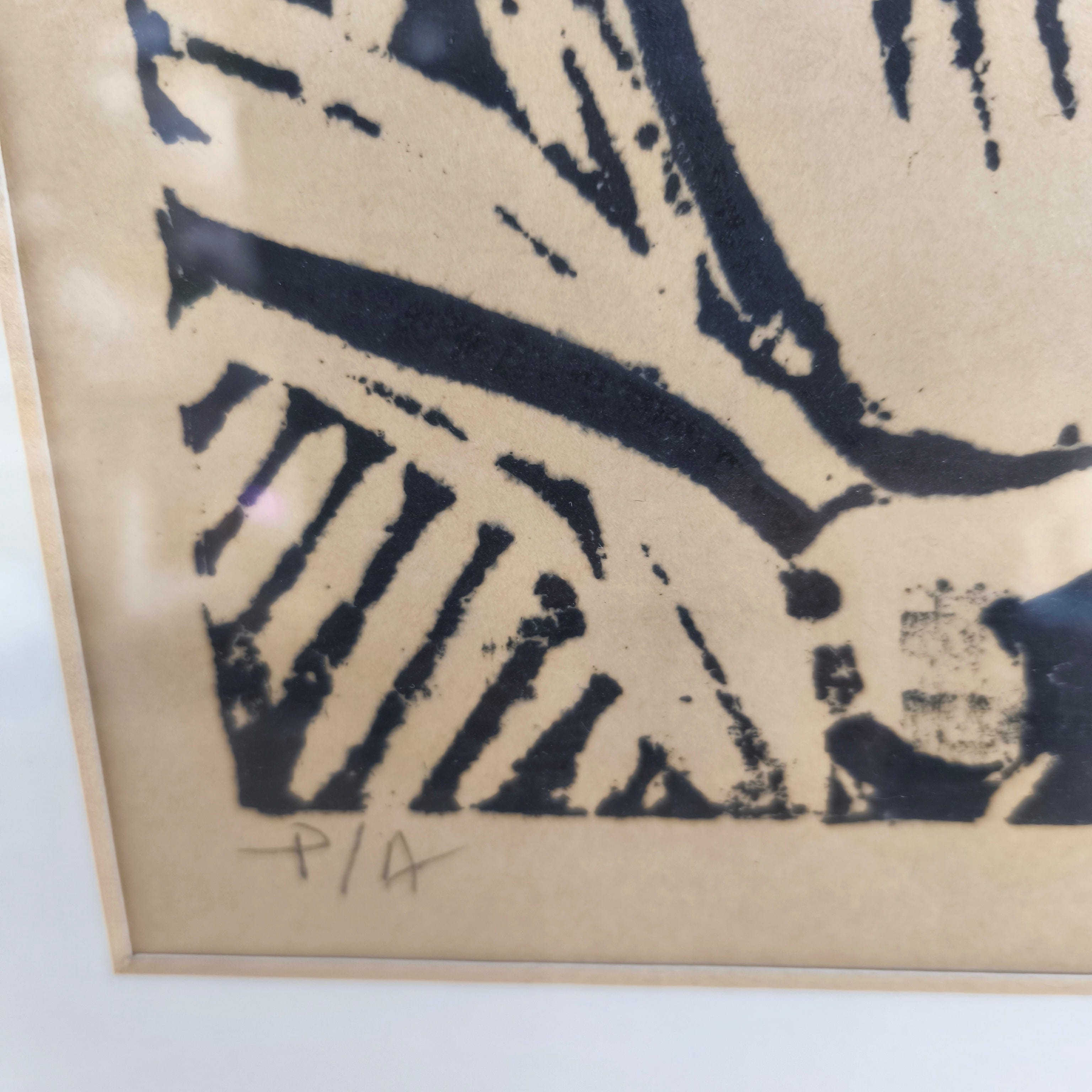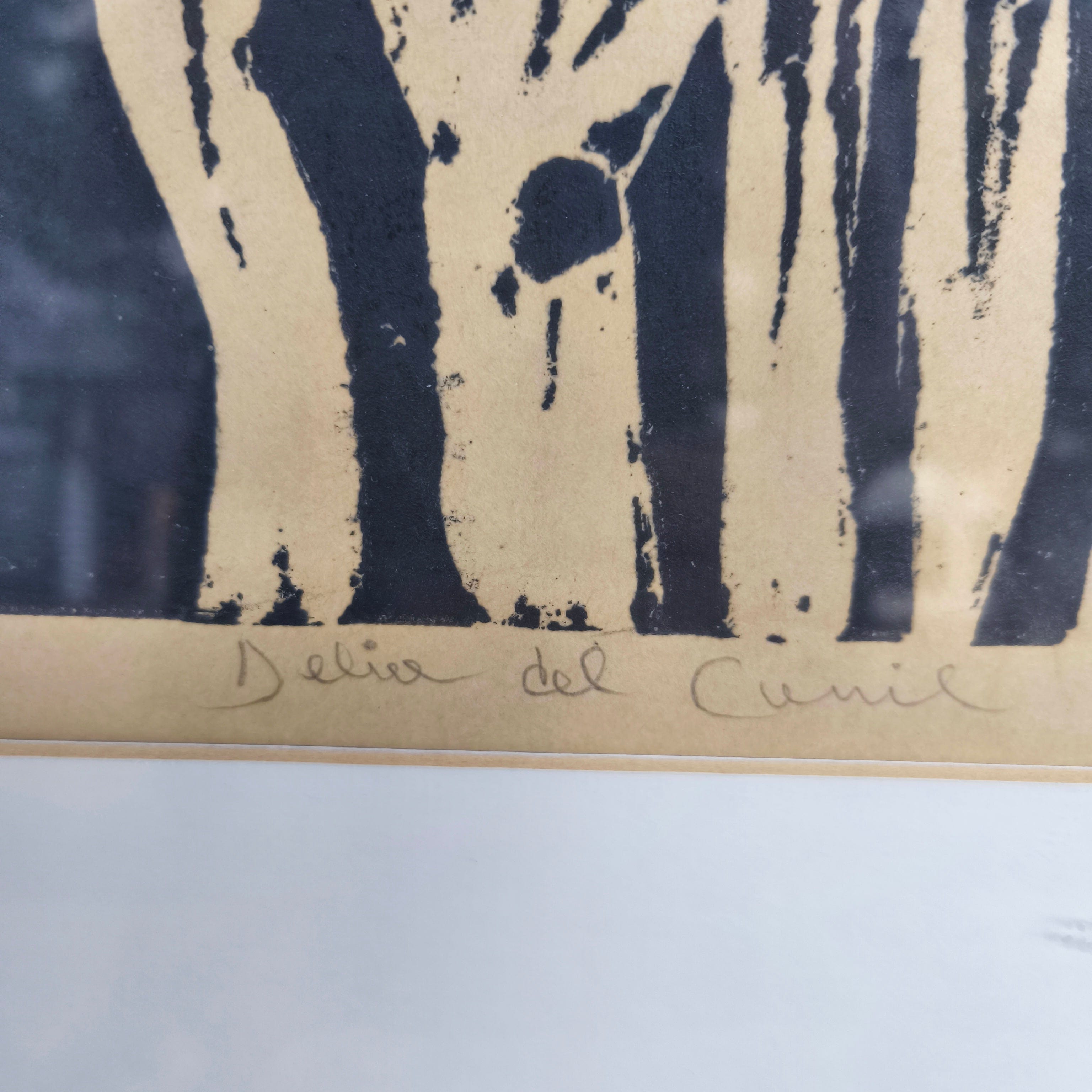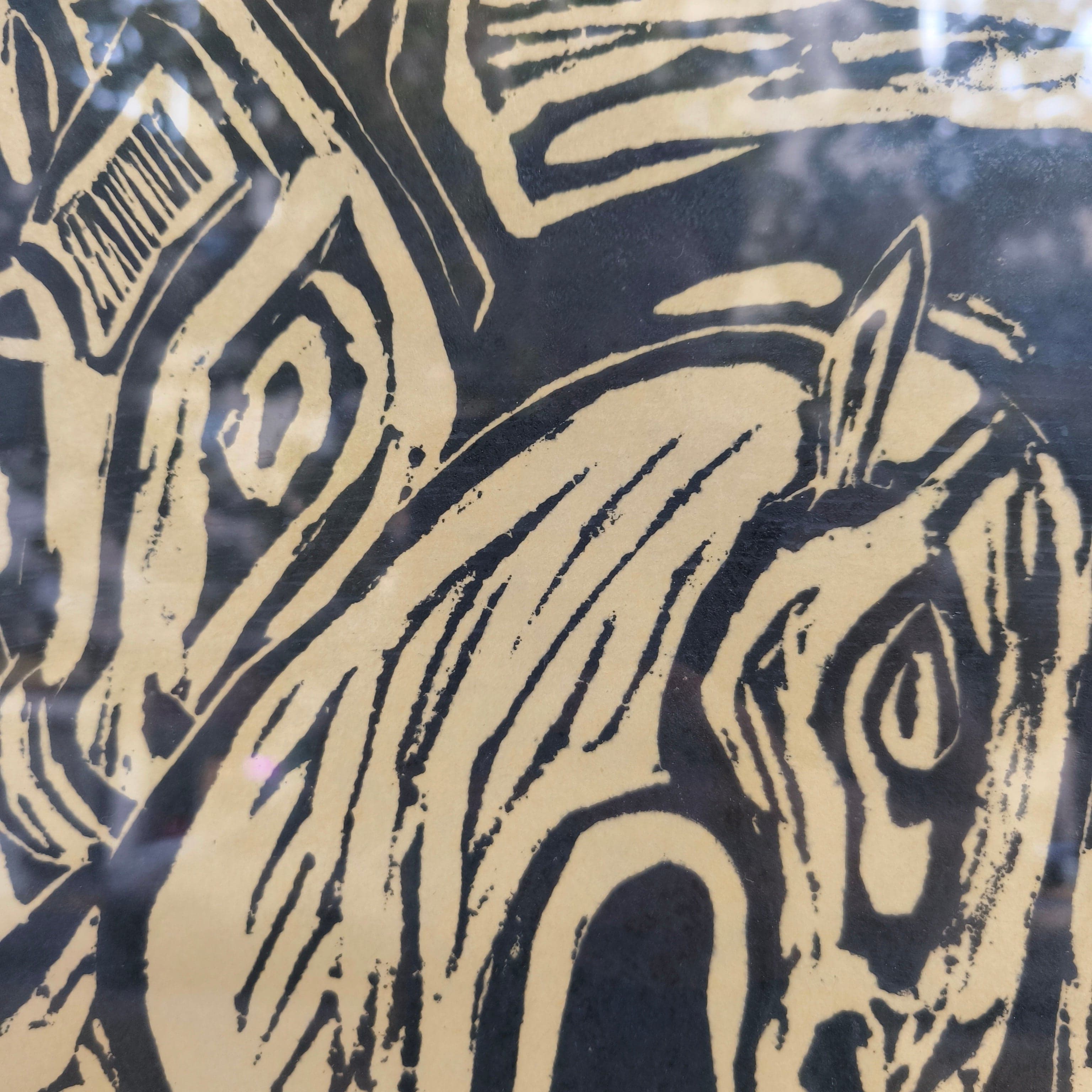 Gravure sur bois signée et numérotée de l'artiste chilienne Delia del Carril représentant deux chevaux se caressant. L'œuvre est encadrée dans un cadre simple en bois peint en noir avec une bordure intérieure dorée.