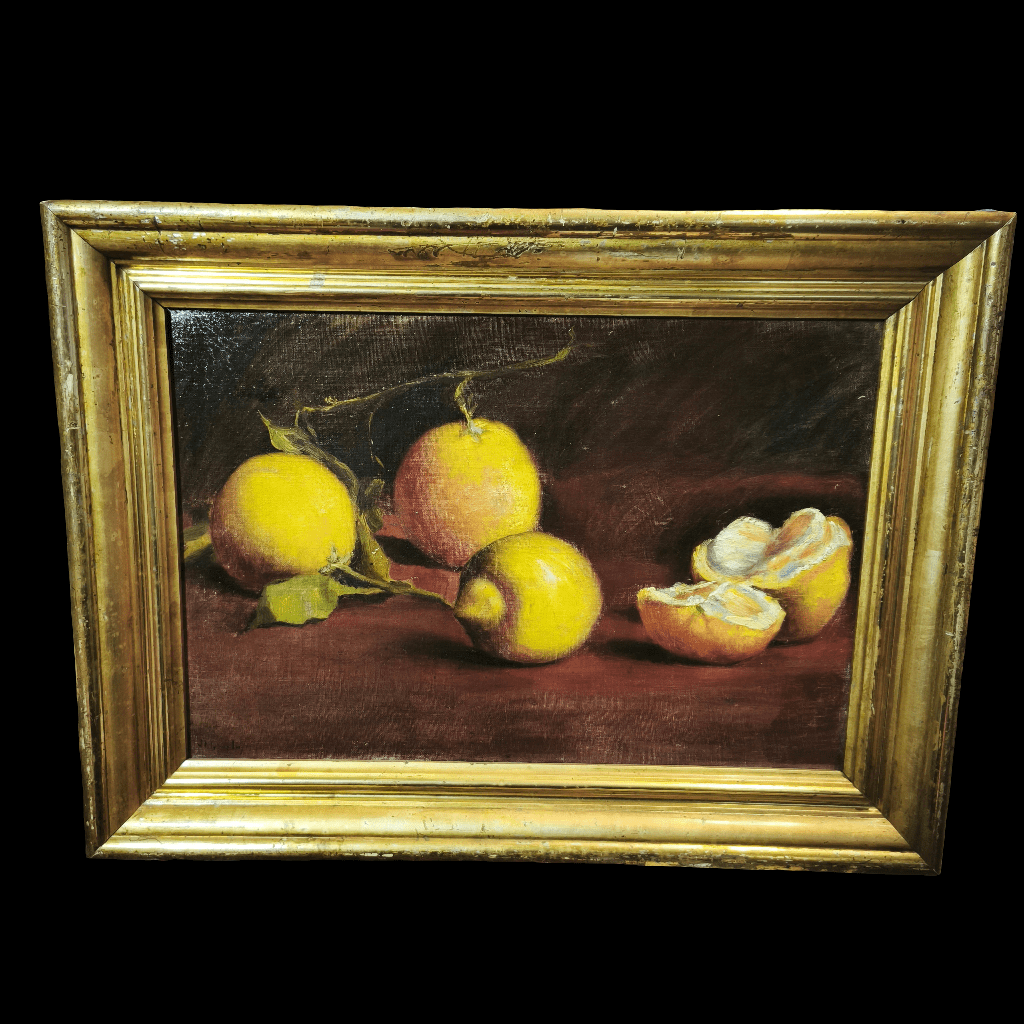 Huile sur toile du célèbre artiste chilien Juan Francisco González, représentant une nature morte d'oranges magnifiquement peintes sur un fond sombre. L'une des oranges est entrouverte, révélant un intérieur dont la texture se distingue par le trait de l'artiste. L'œuvre est encadrée dans un bois peint à l'or.