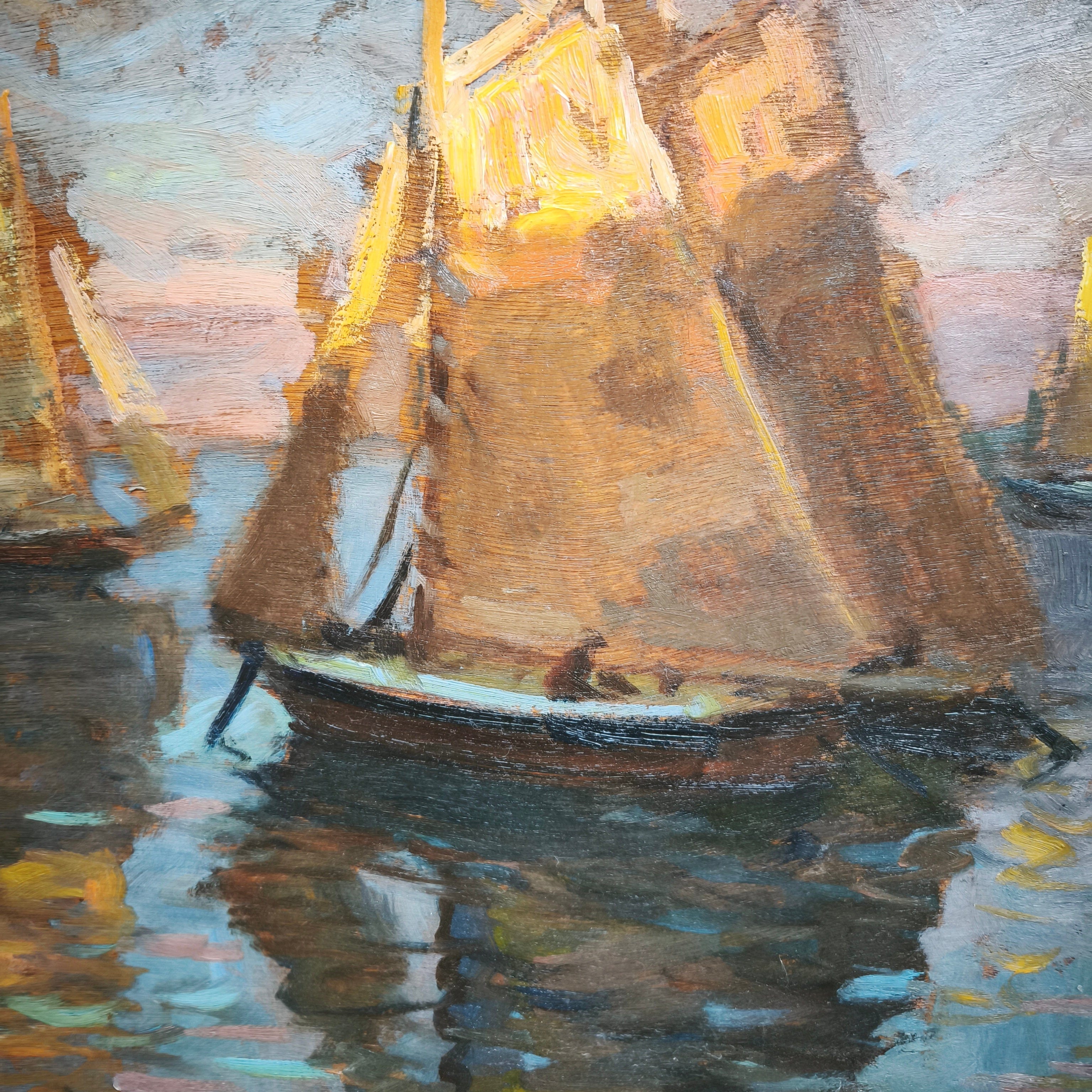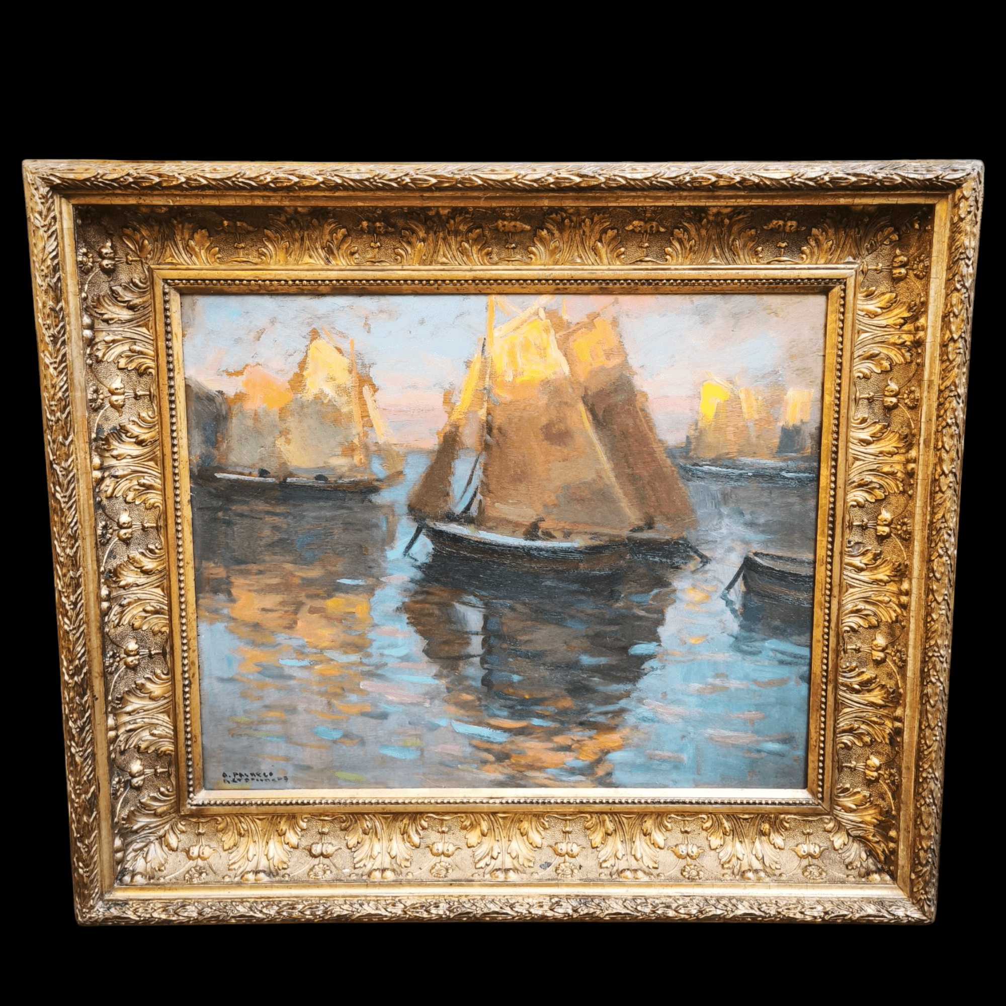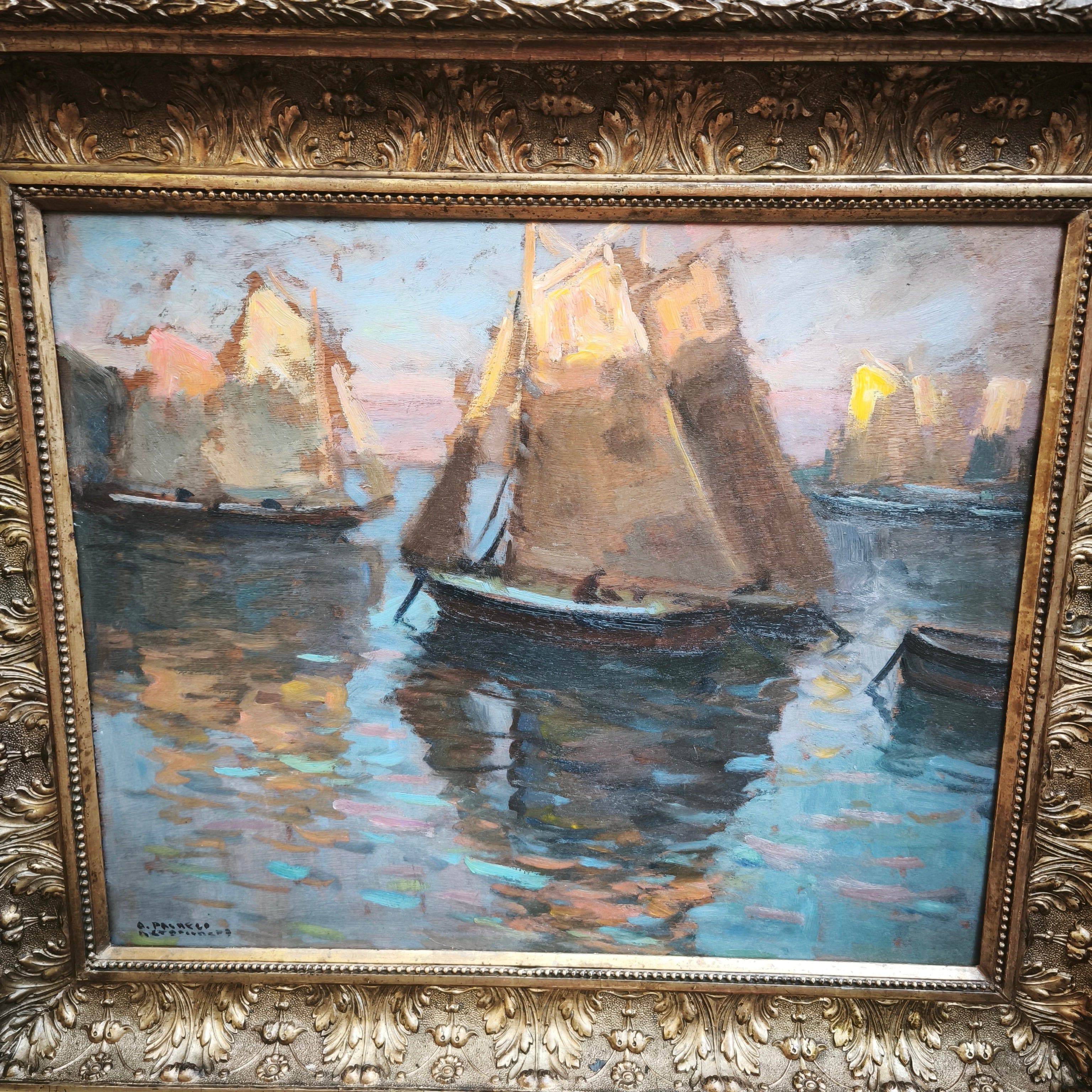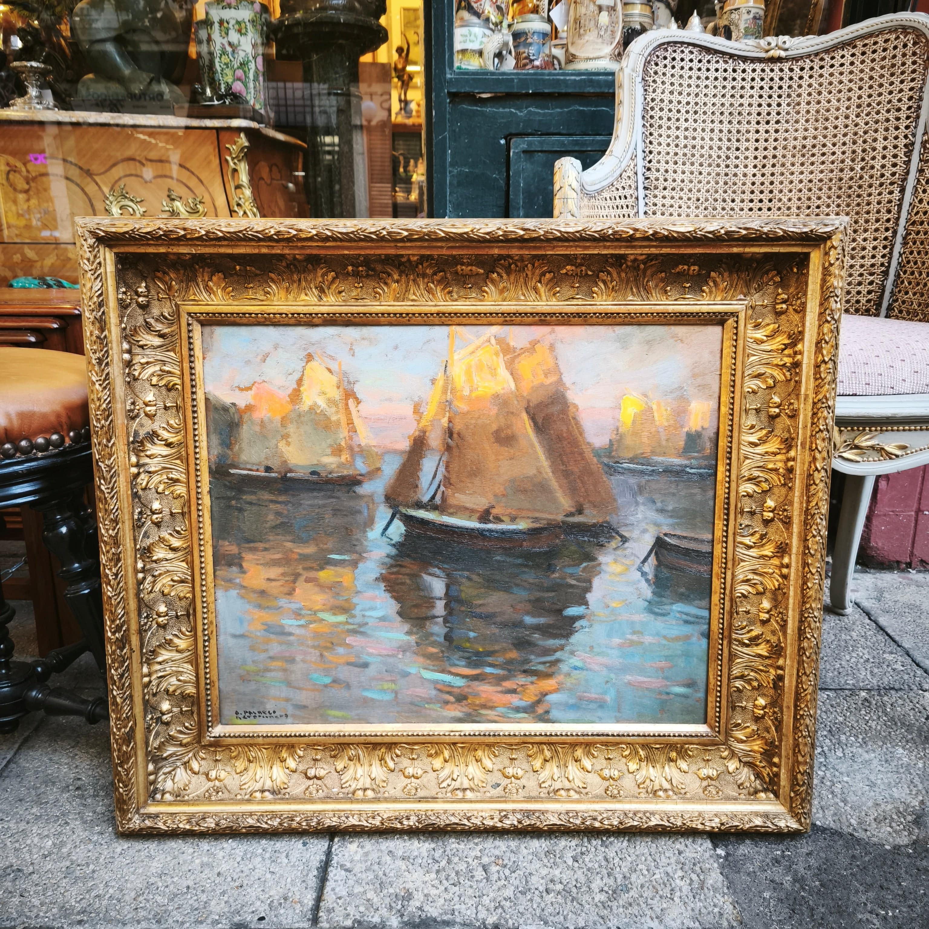 Huile sur bois du célèbre artiste chilien Arturo Pacheco Altamirano représentant une scène marine avec trois voiliers naviguant sur l'eau aux reflets colorés. L'œuvre possède un caractère impressionniste, mettant en valeur les couleurs de l'eau et la texture des voiliers. Encadrée dans un cadre en bois mouluré, elle est peinte d'une élégante couleur dorée.