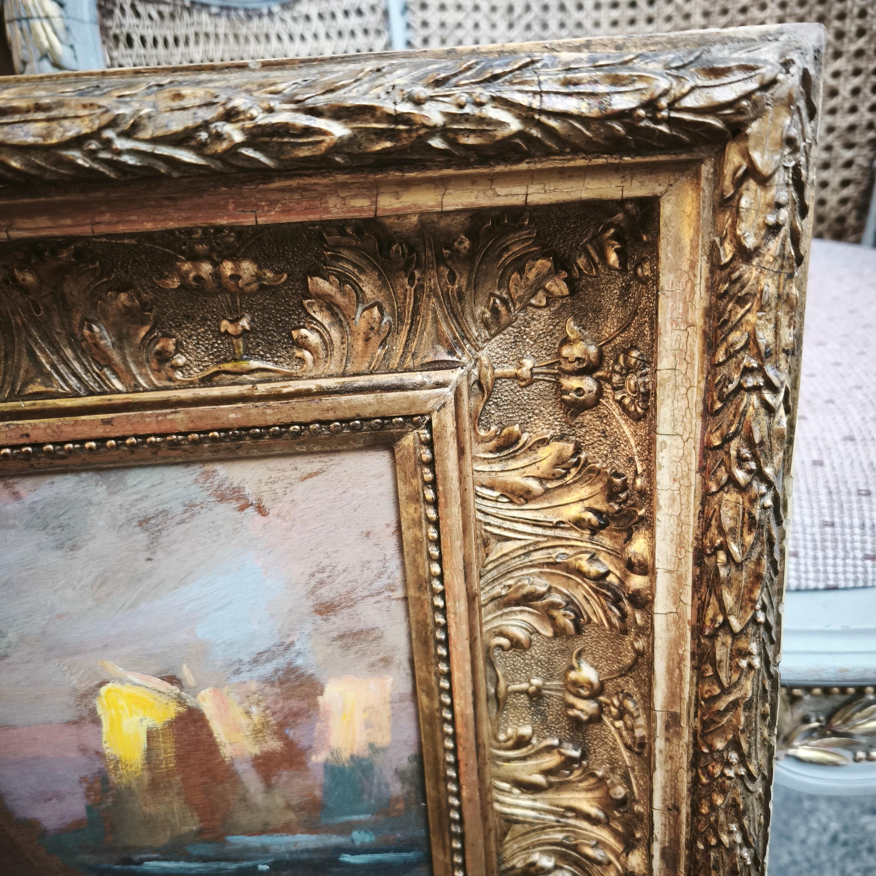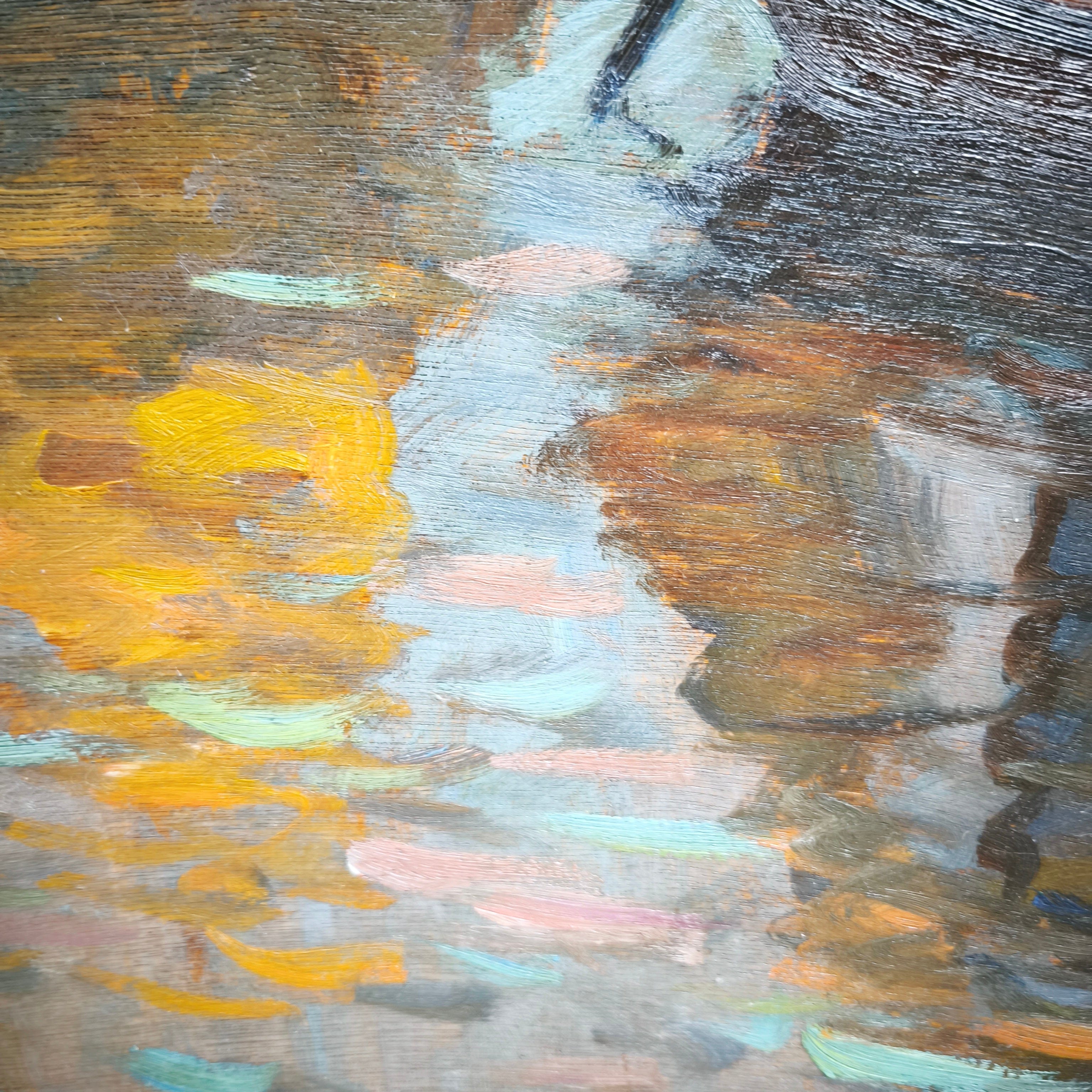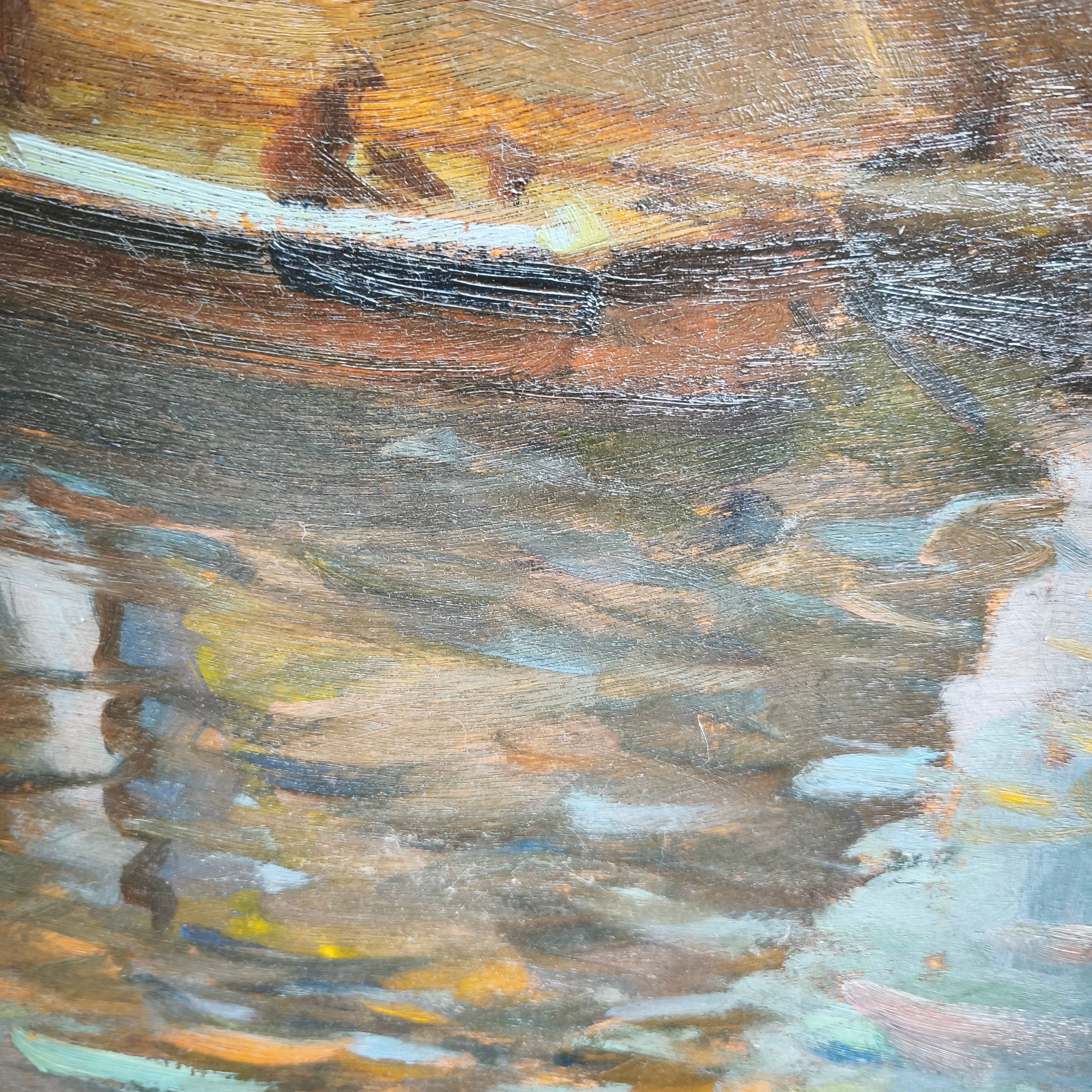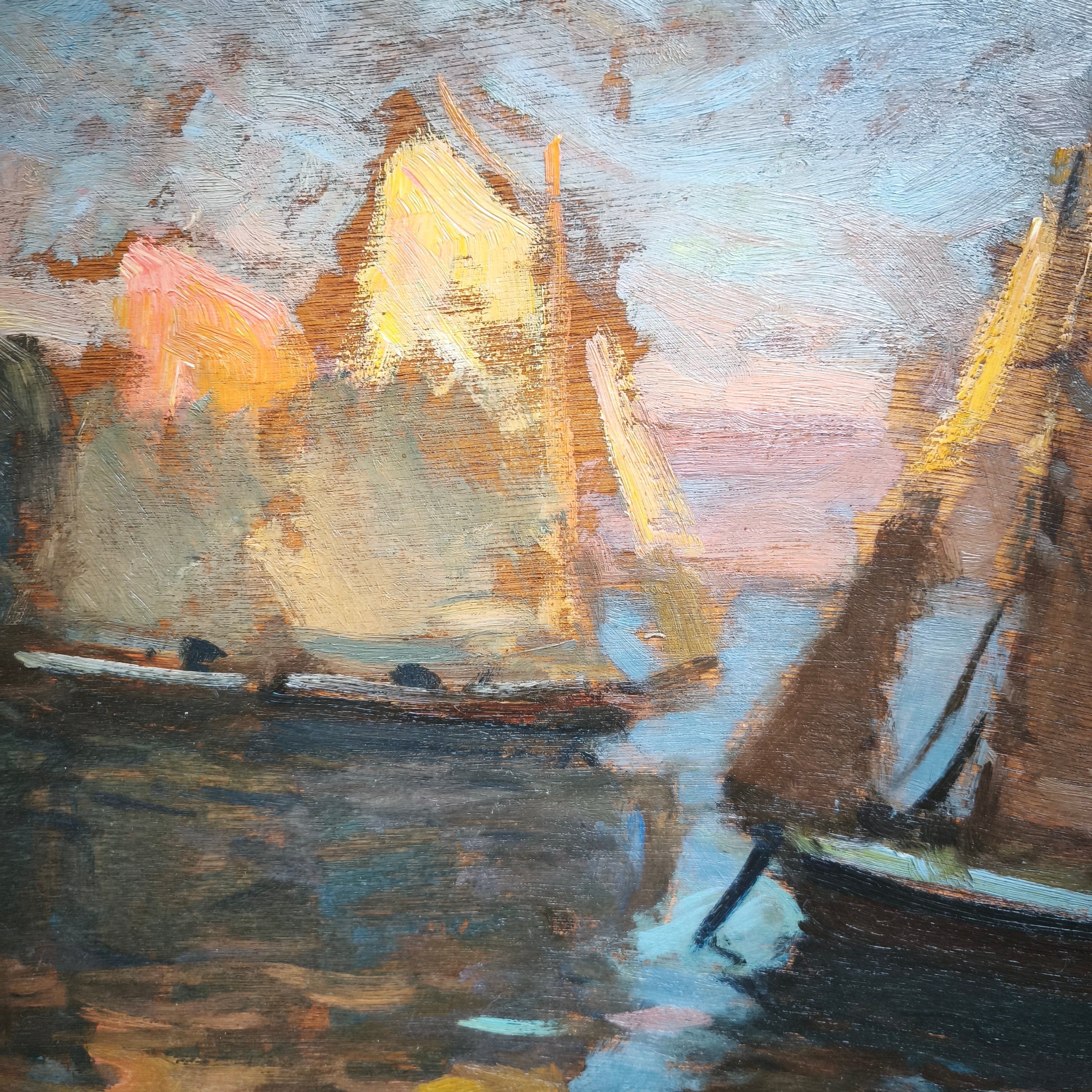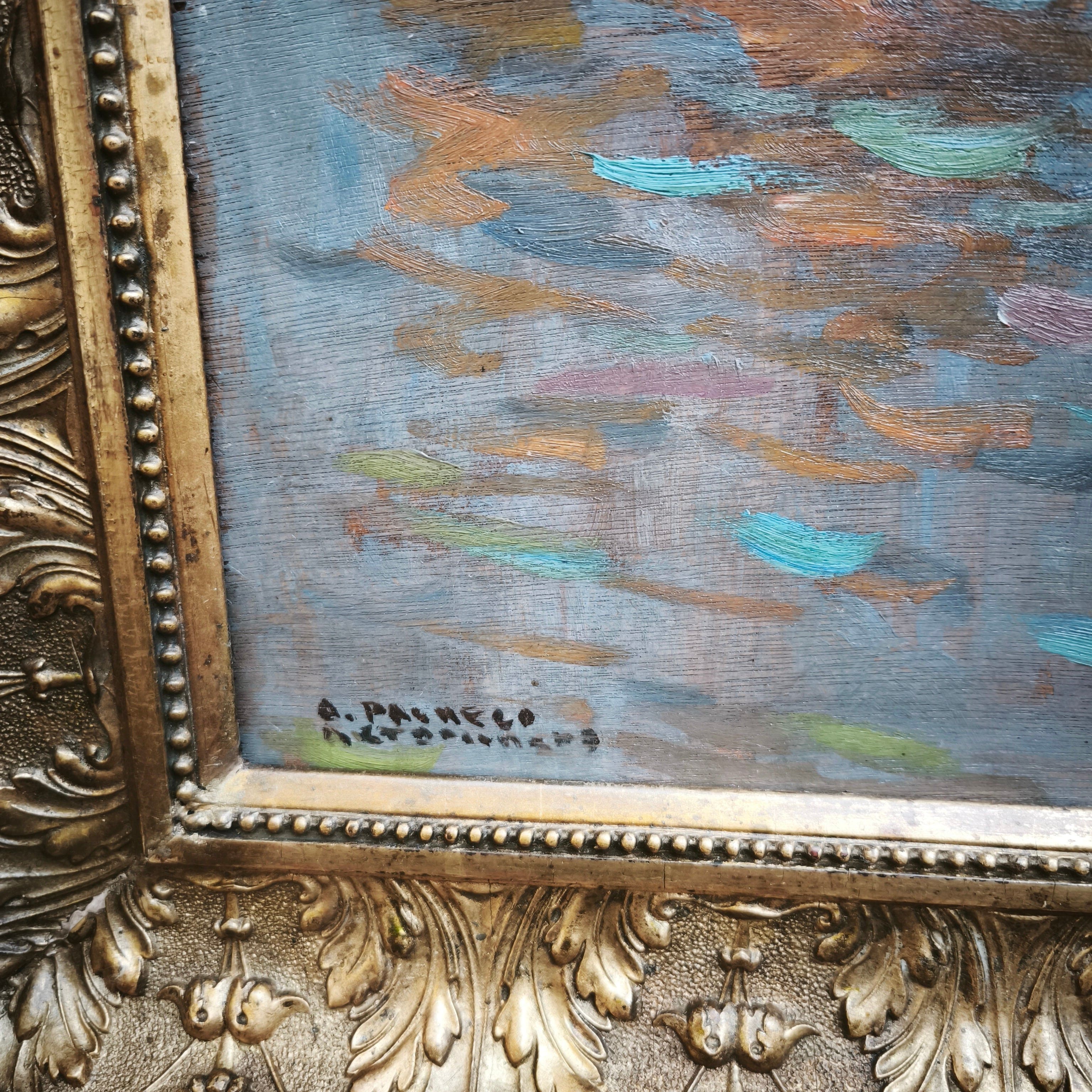 Huile sur bois du célèbre artiste chilien Arturo Pacheco Altamirano représentant une scène marine avec trois voiliers naviguant sur l'eau aux reflets colorés. L'œuvre possède un caractère impressionniste, mettant en valeur les couleurs de l'eau et la texture des voiliers. Encadrée dans un cadre en bois mouluré, elle est peinte d'une élégante couleur dorée.