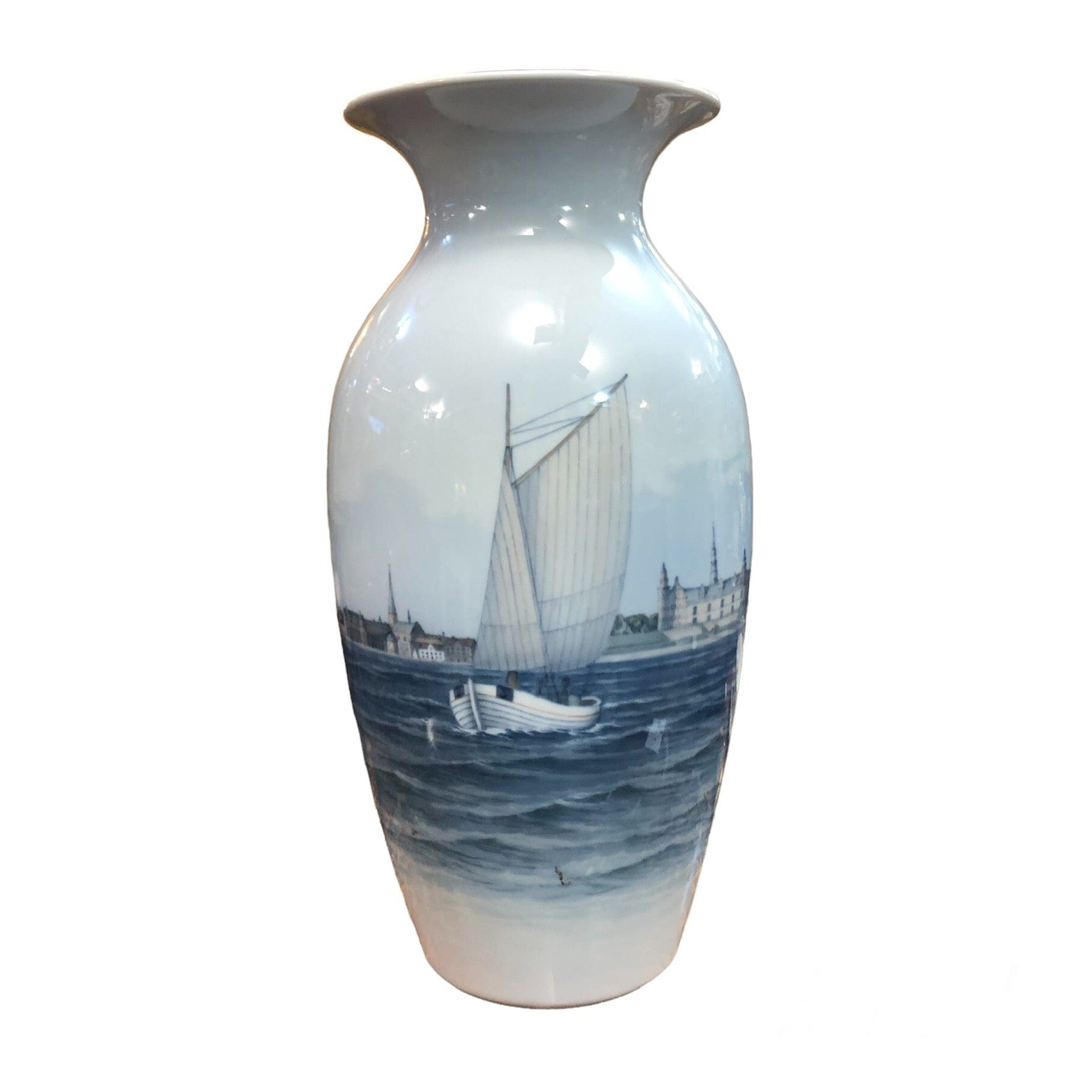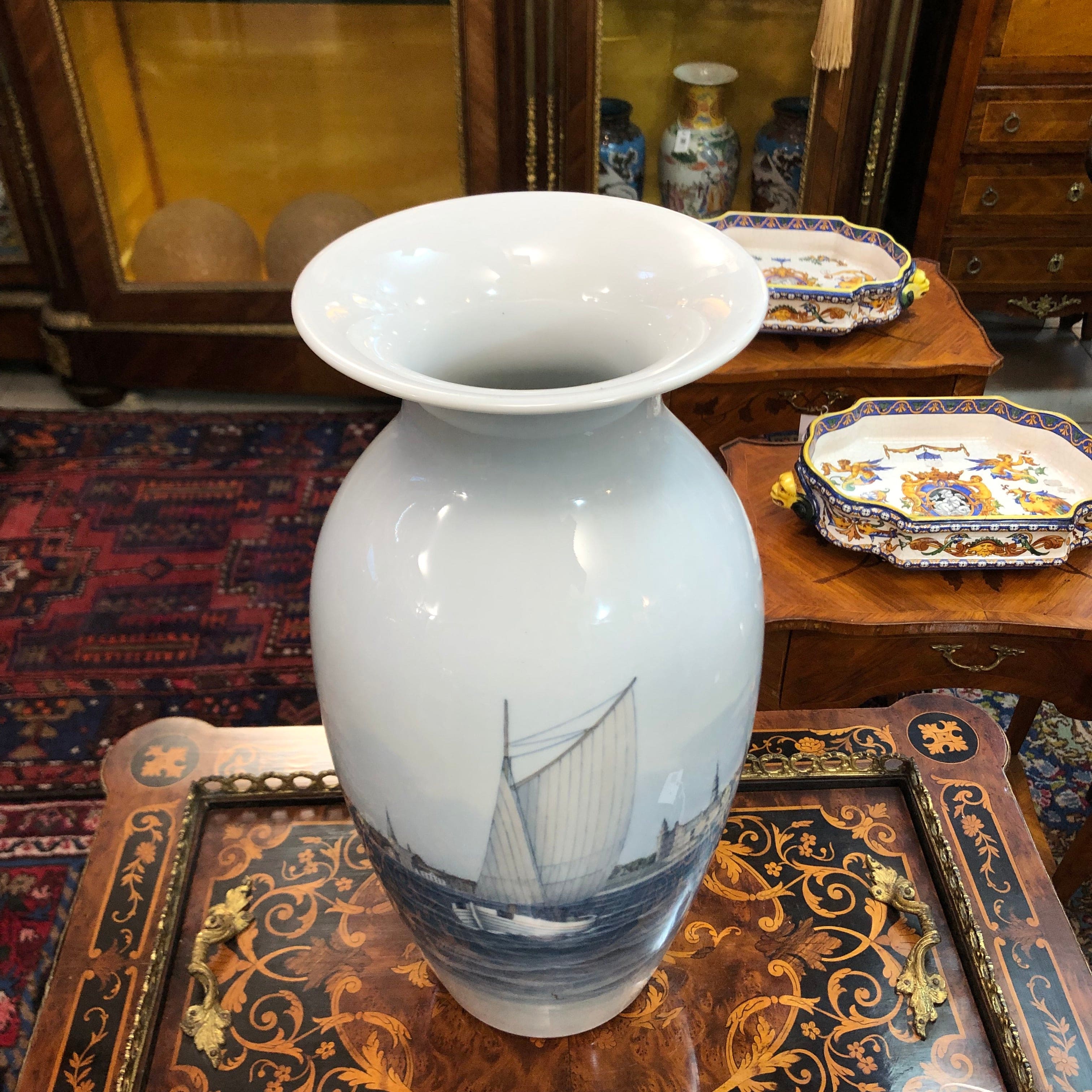 Magnifique vase en porcelaine de la marque danoise Royal Copenhagen. Il représente un magnifique bateau sur la mer et un paysage.