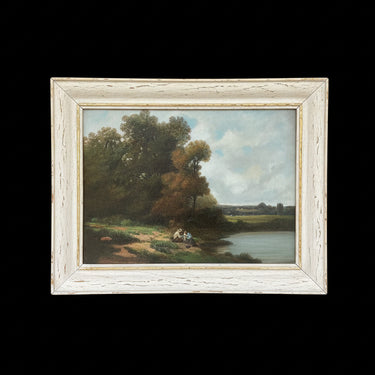 Huile sur toile d'AJ Downey représentant un paysage rural détaillé où deux personnes profitent d'un après-midi au bord du lac, entourées d'arbres, capturant la lumière du coucher de soleil. L'œuvre est présentée dans un cadre simple en bois peint en or.