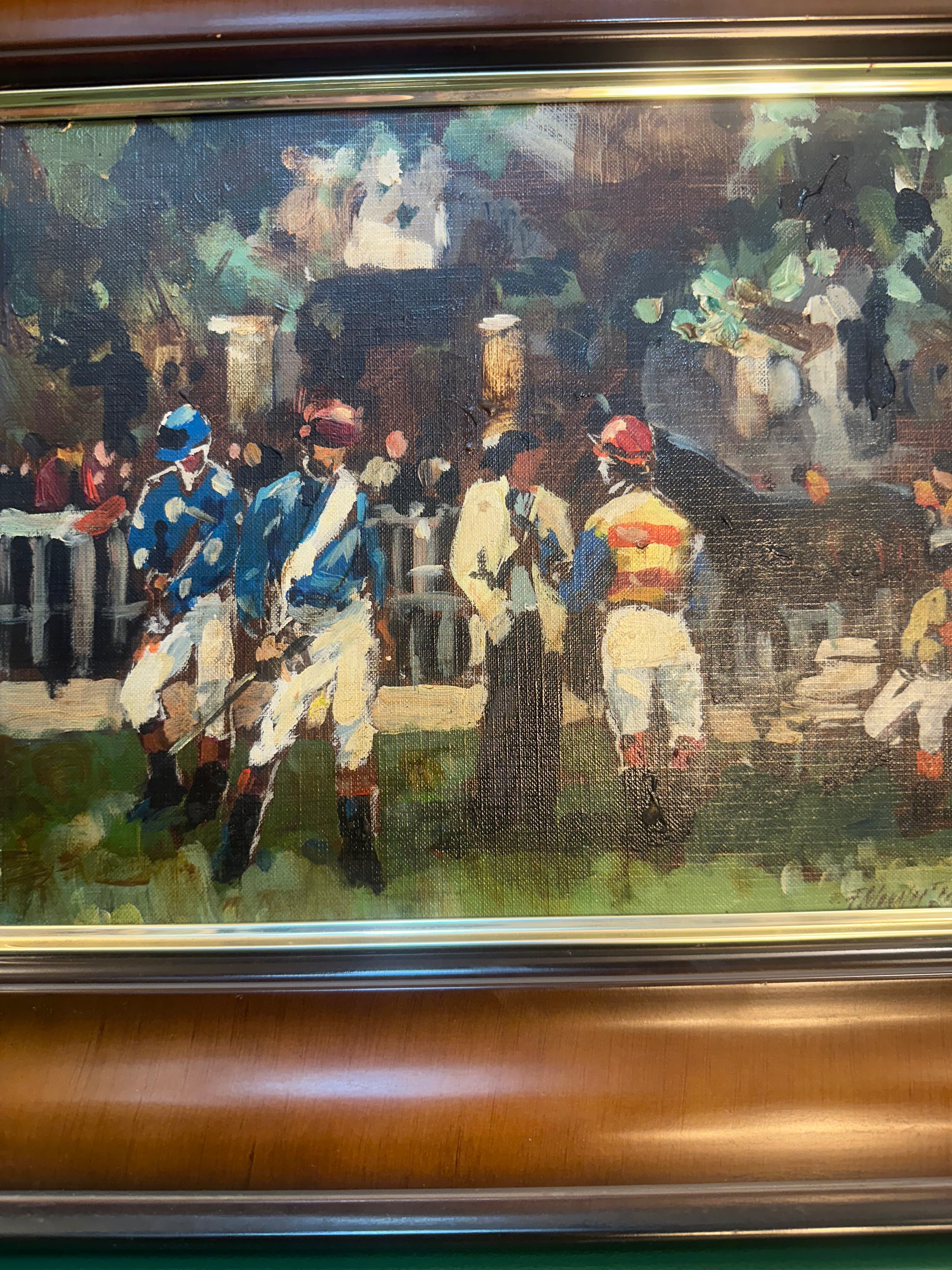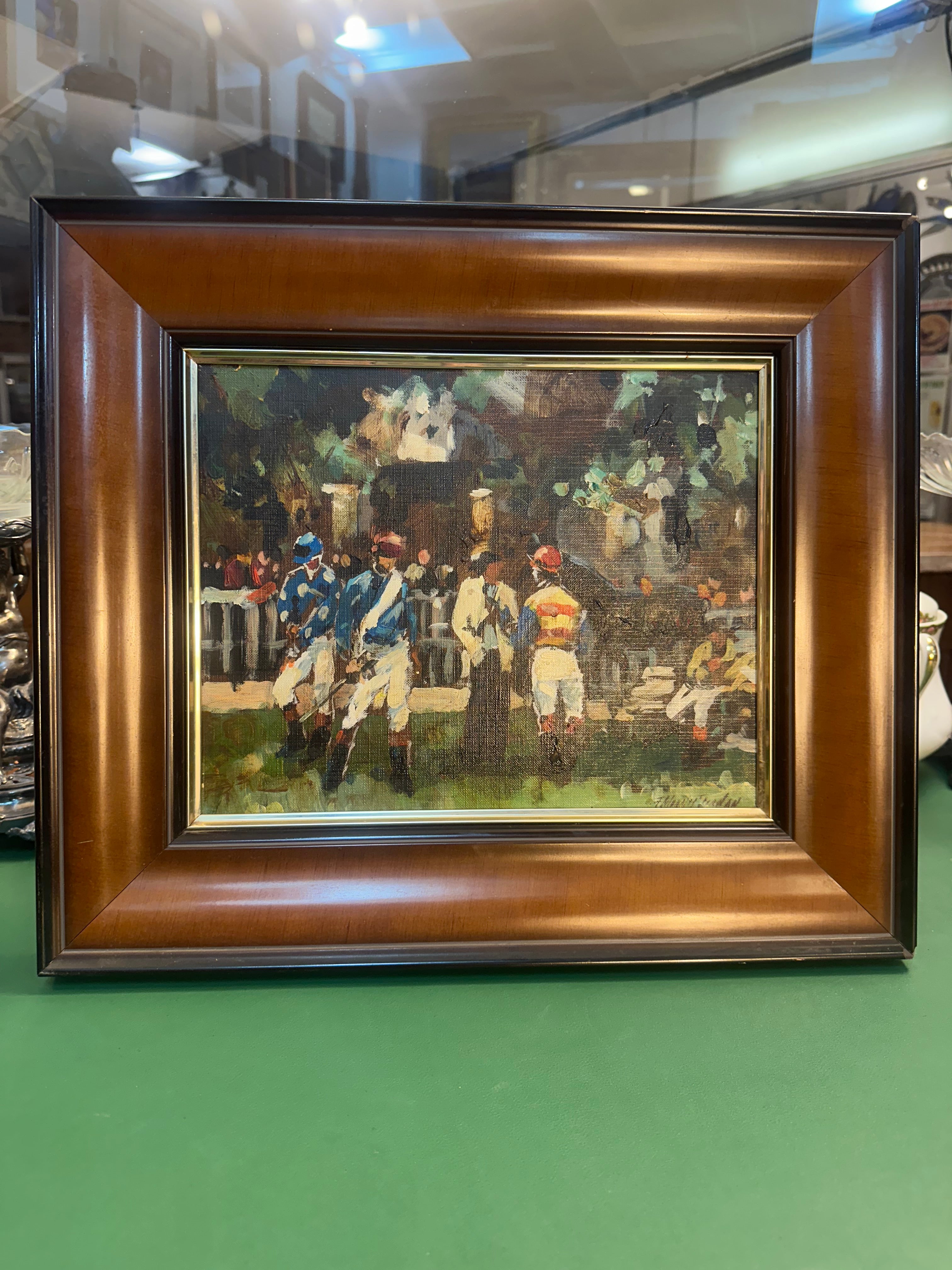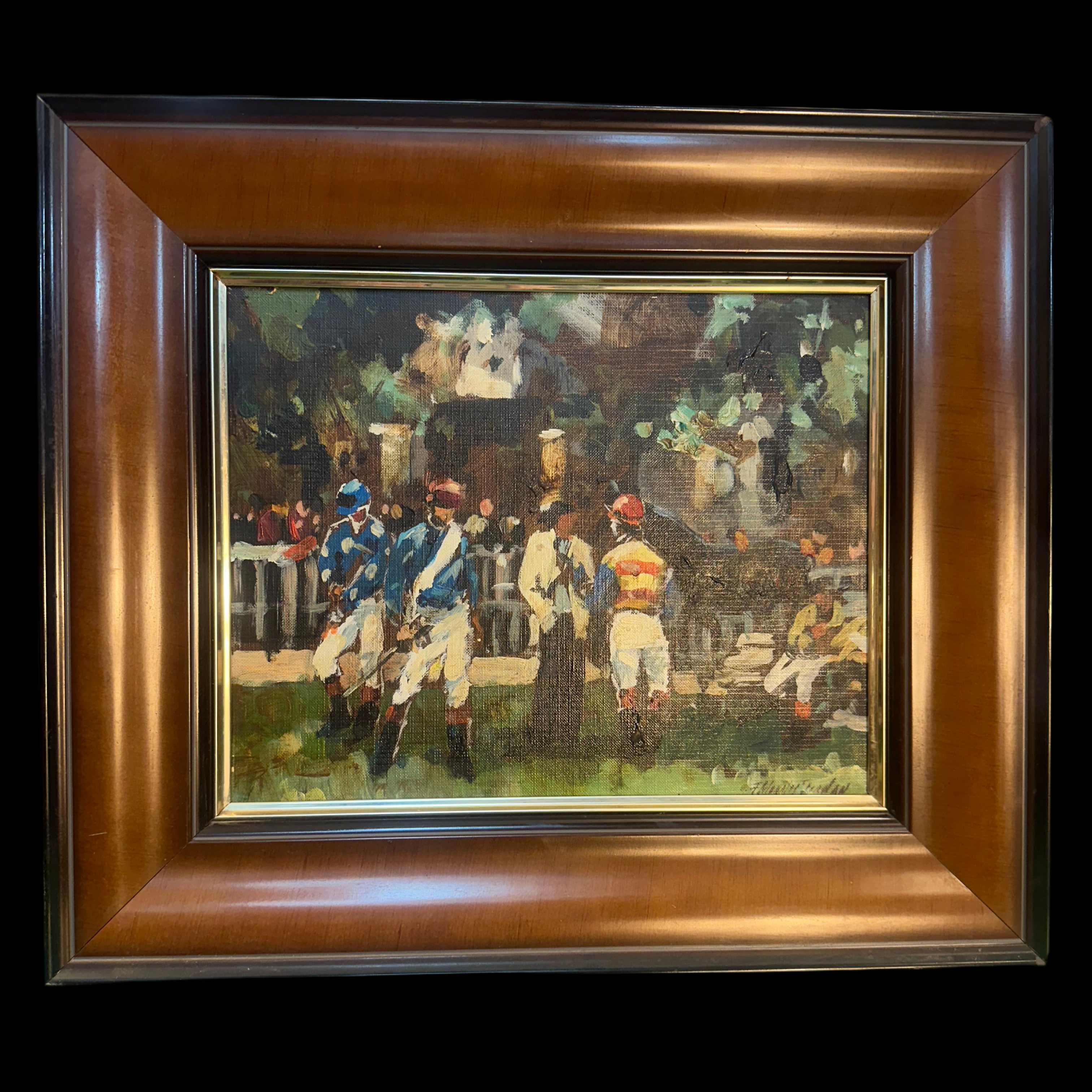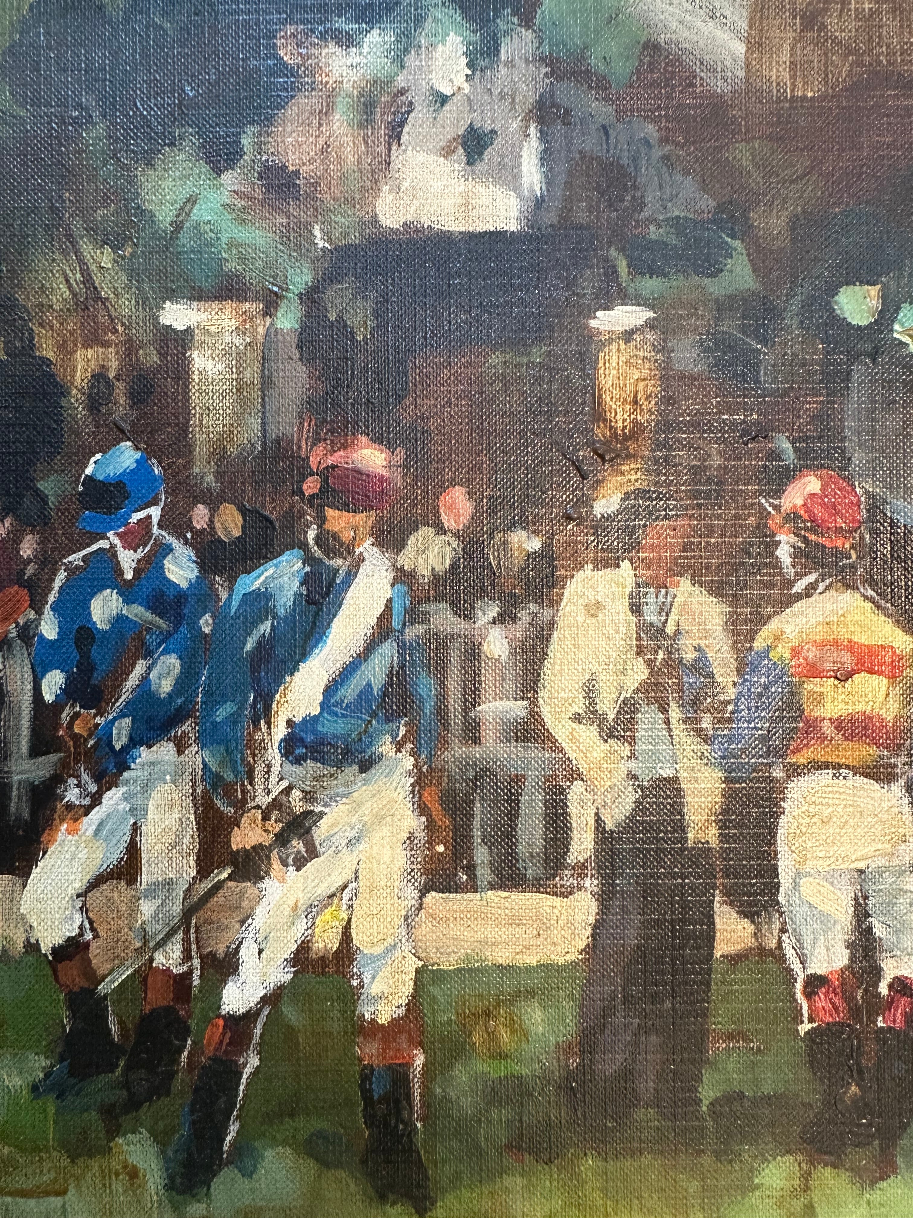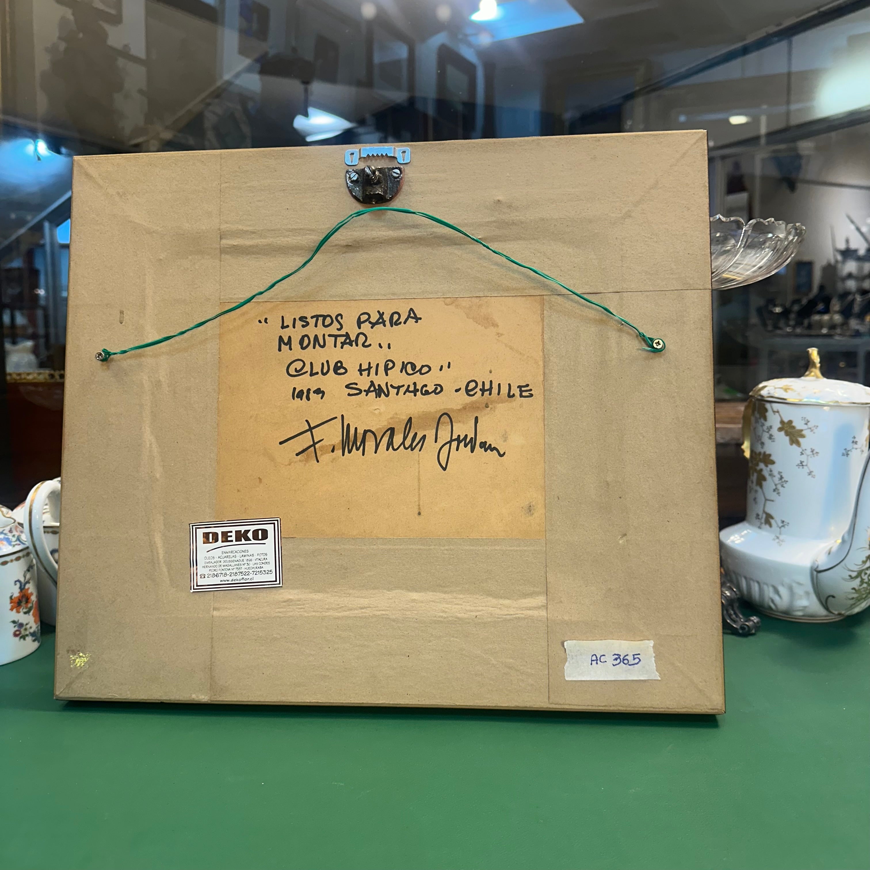Huile sur toile du peintre chilien Fernando Morales Jordán de 1989, représentant une scène qui dépeint l'interaction spontanée entre les joueurs de polo au Club Équestre.