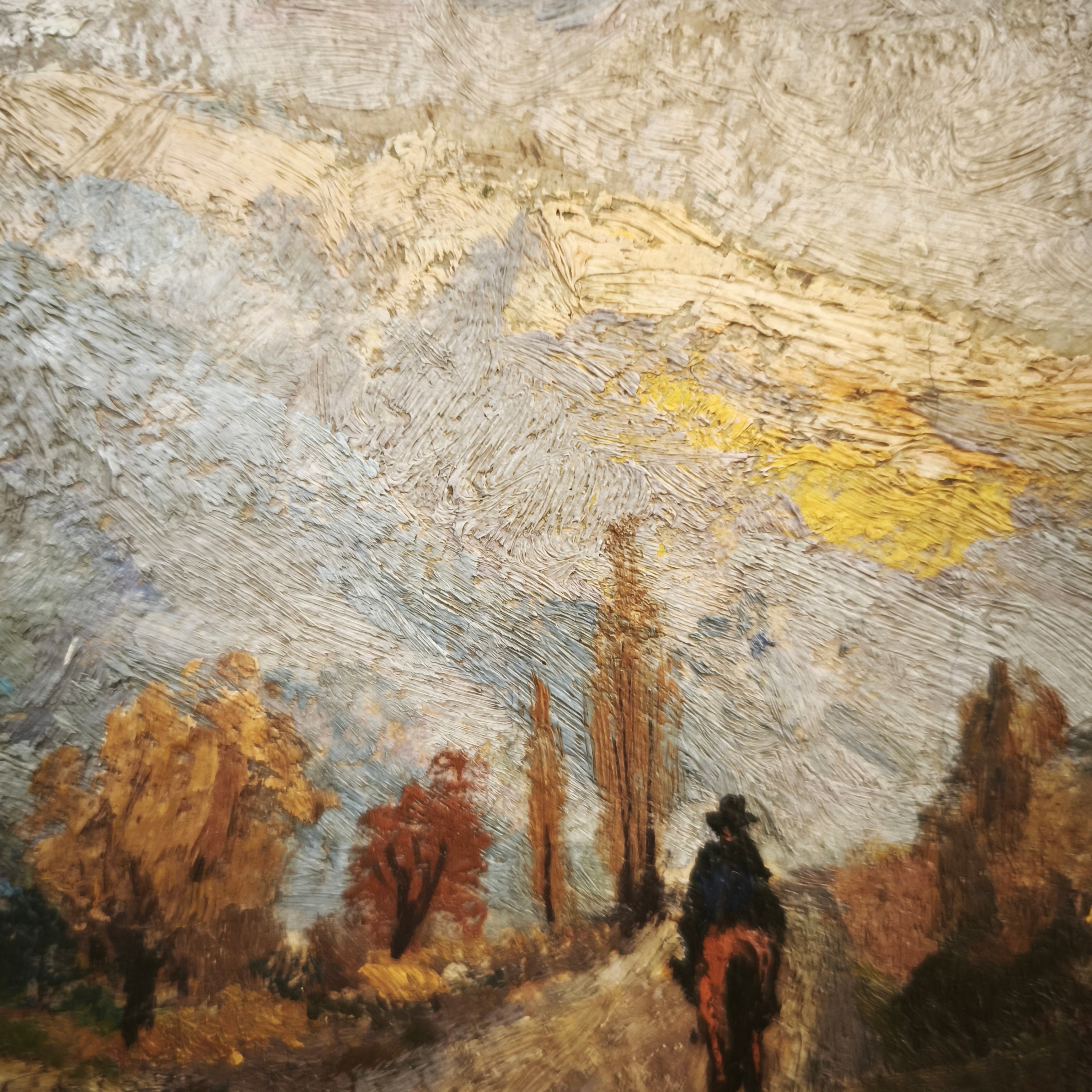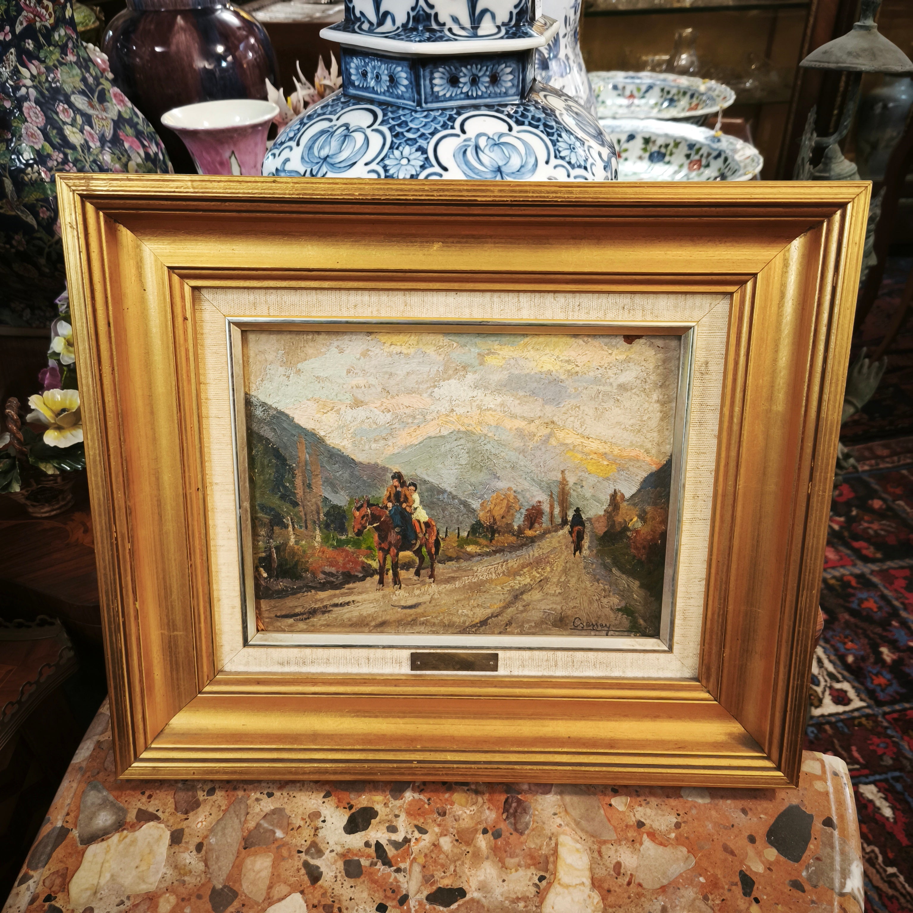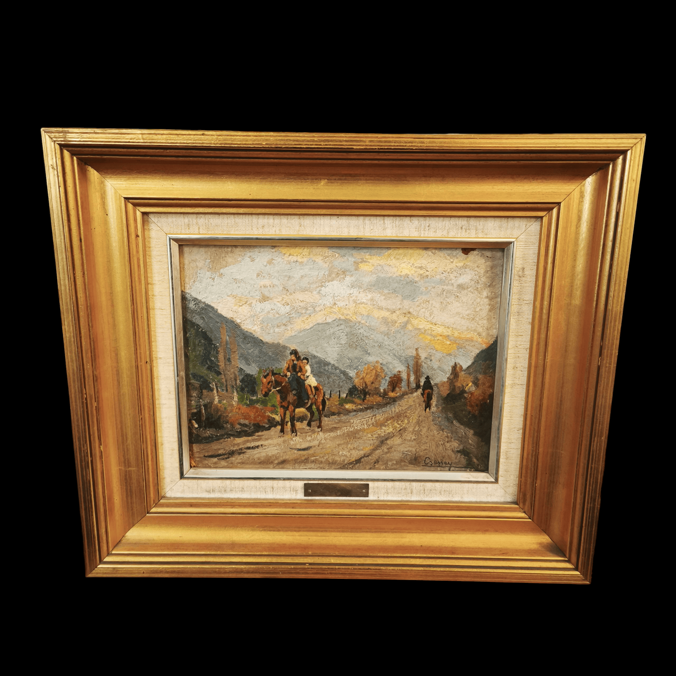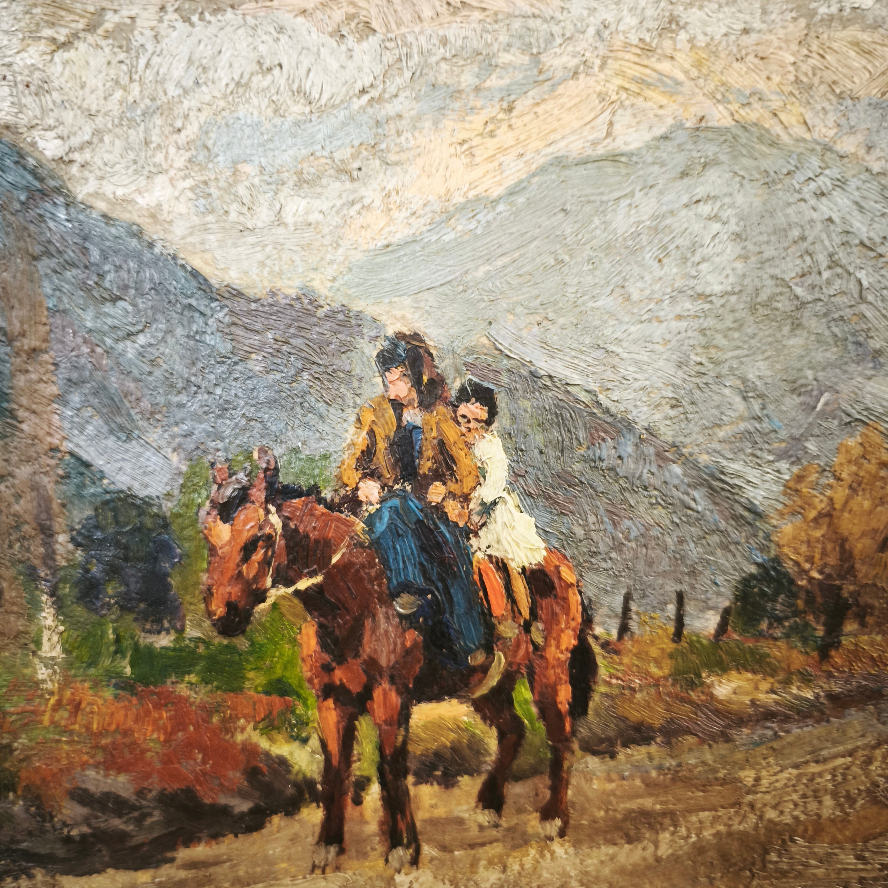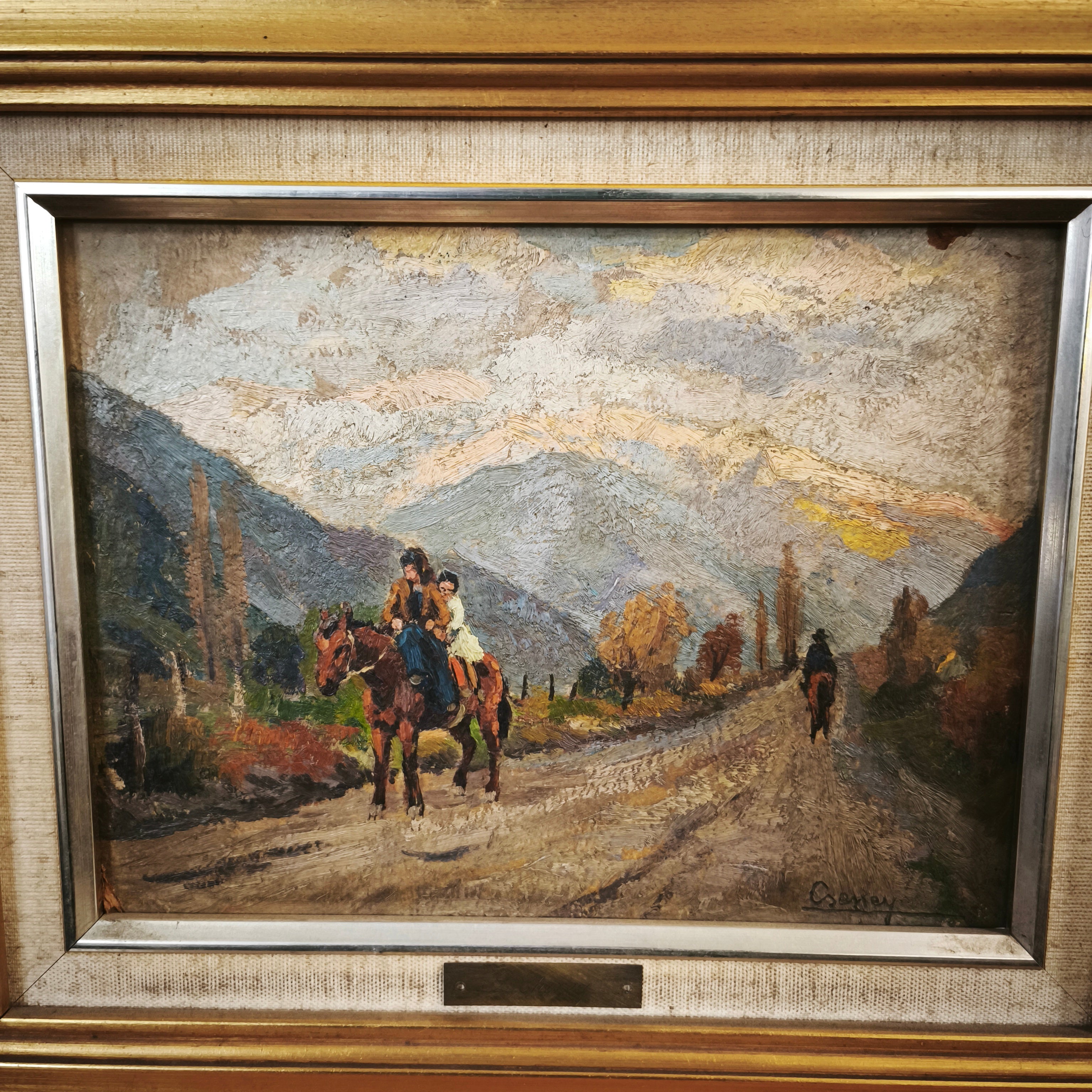 Huile sur bois de l'artiste chilien Ladislao Cheney, représentant une scène rurale de la Vallée Centrale du Chili. Deux cavaliers circulent en sens inverse sur un chemin de terre, entourés de végétation et avec l'imposante chaîne de montagnes en arrière-plan.