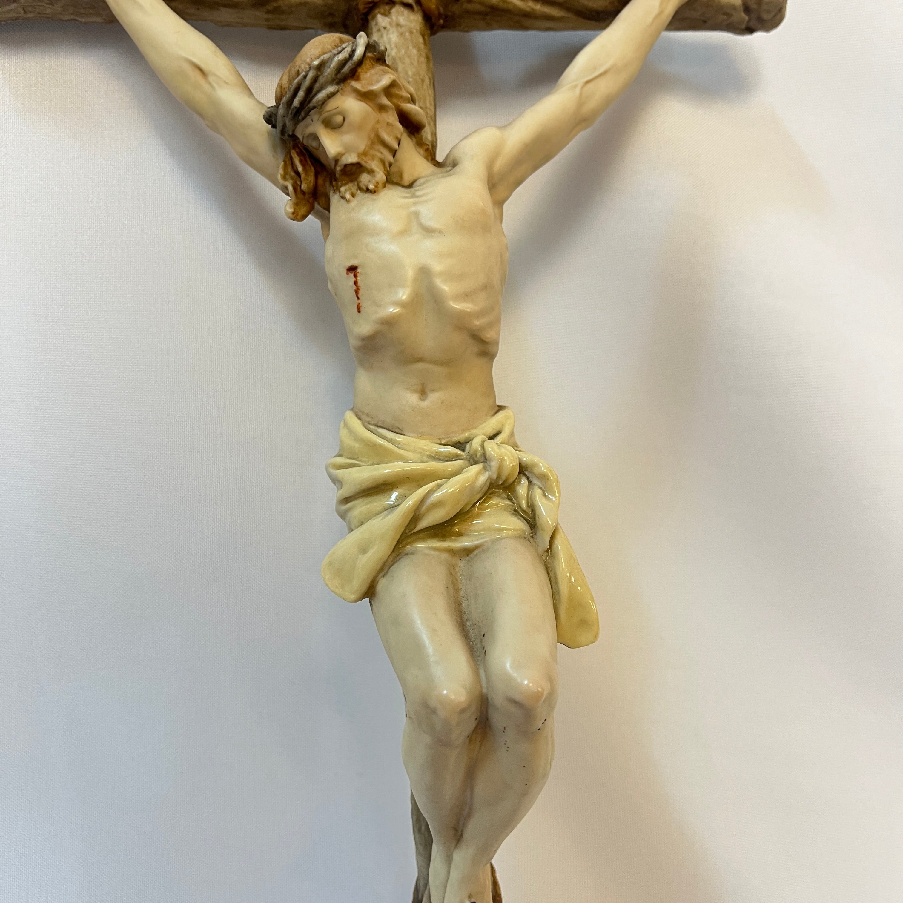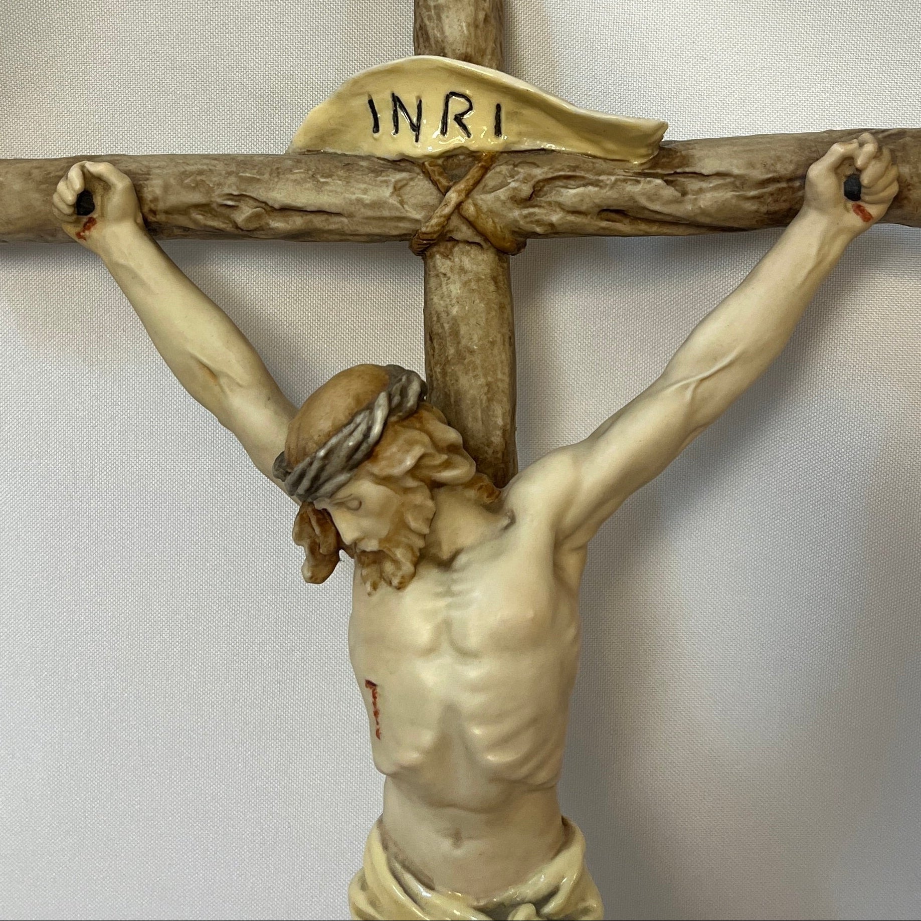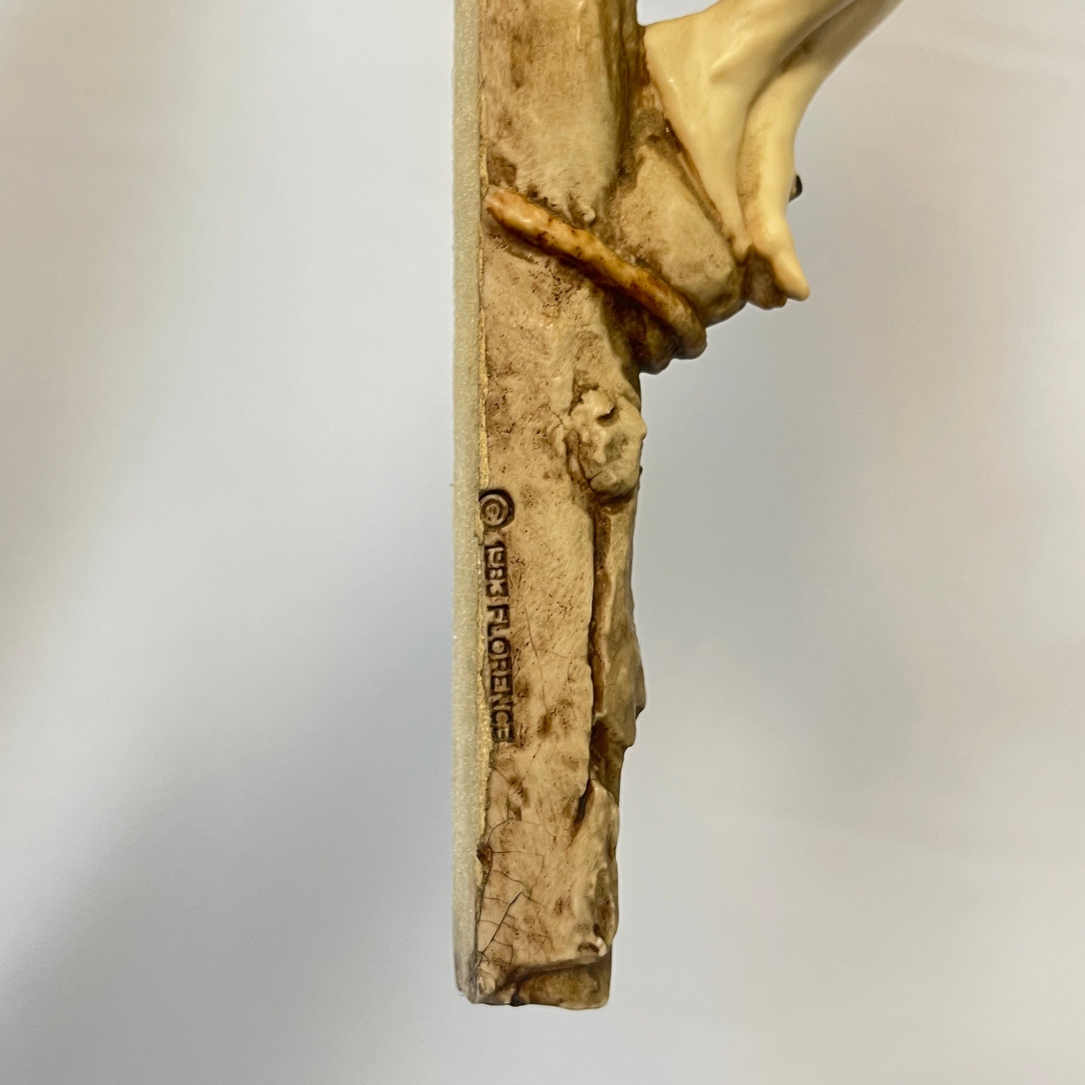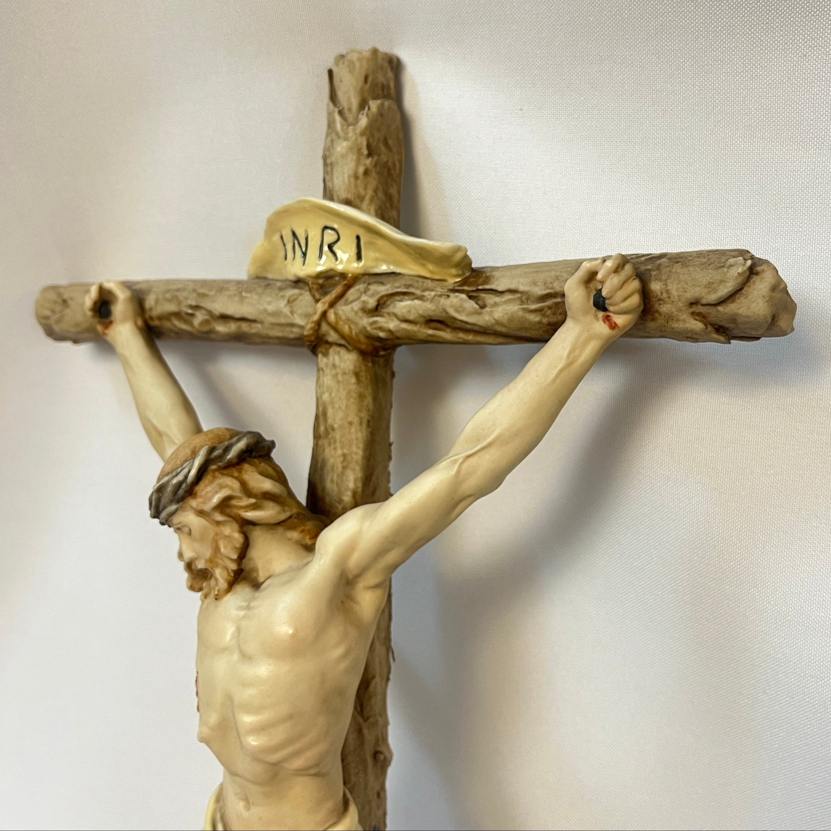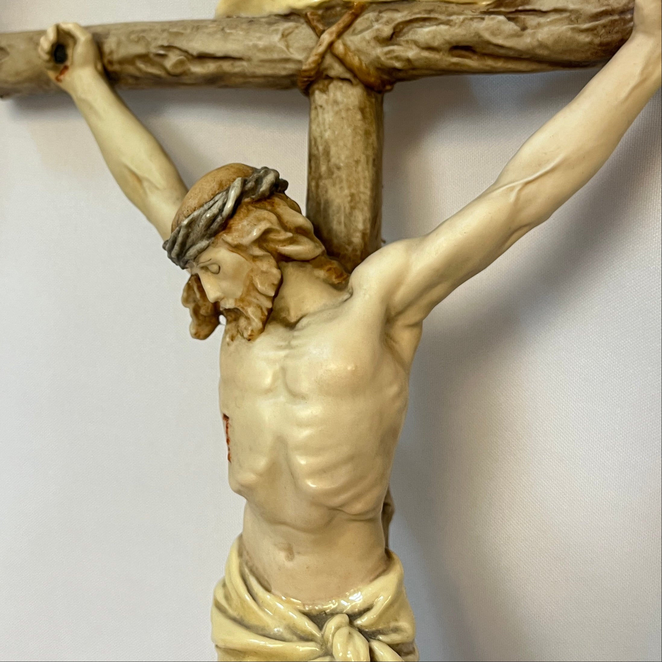 Delicado crucifijo de pared de la reconocida marca Capodimonte. La pieza representa a Jesús en la cruz, sobre una estructura finamente trabajada. Destaca por el cuidado nivel de detalle tanto en la cruz como en la figura, reflejando la calidad característica de esta prestigiosa firma.