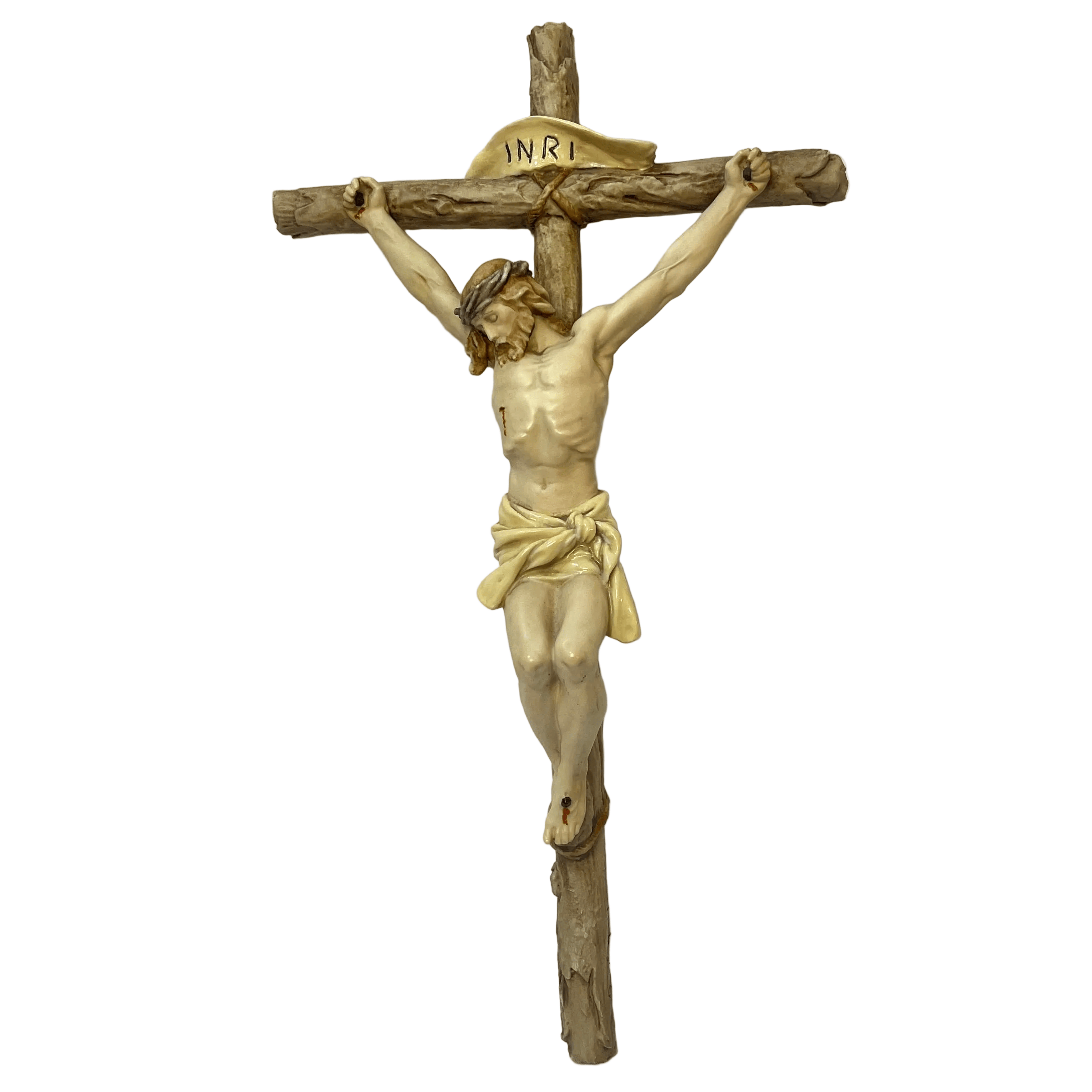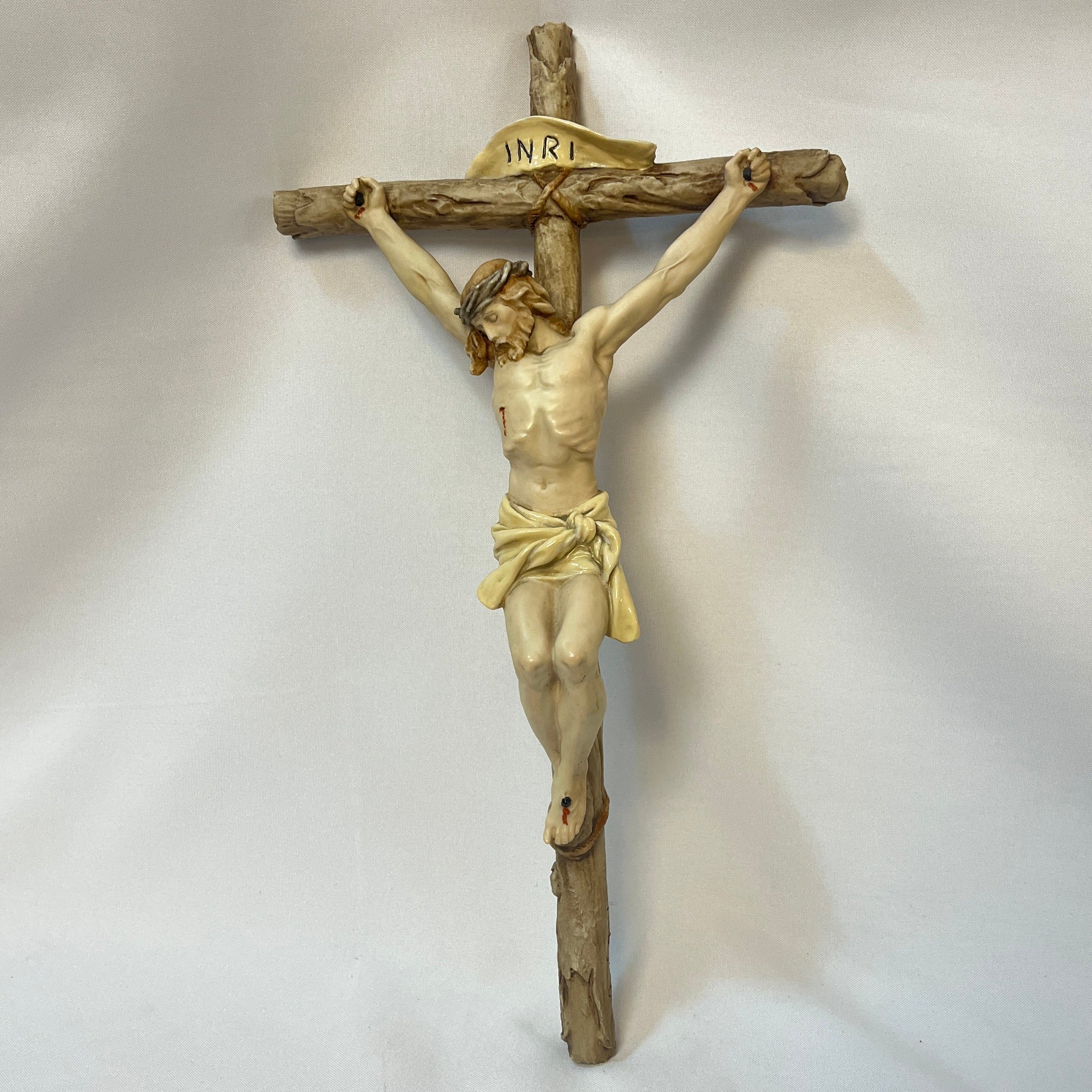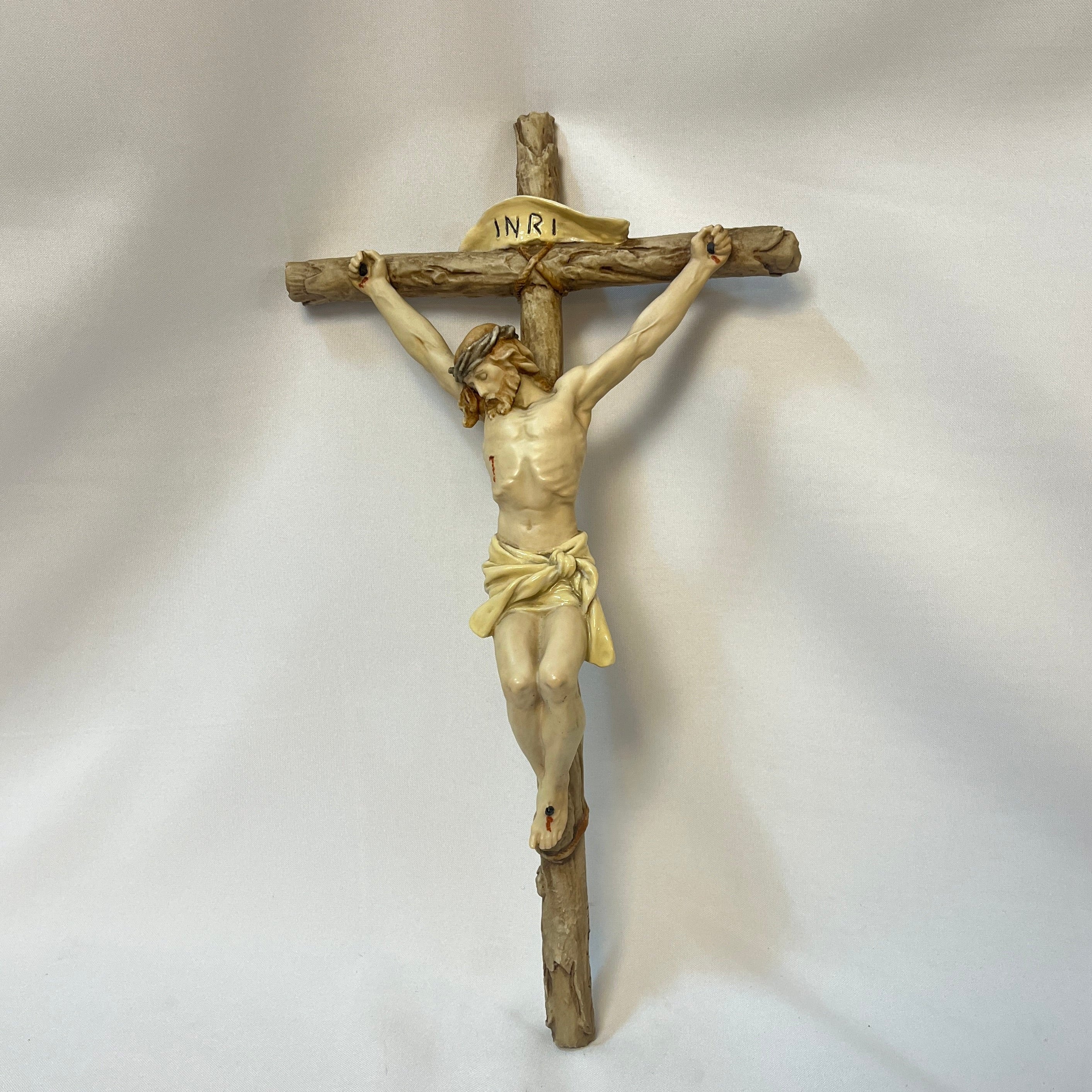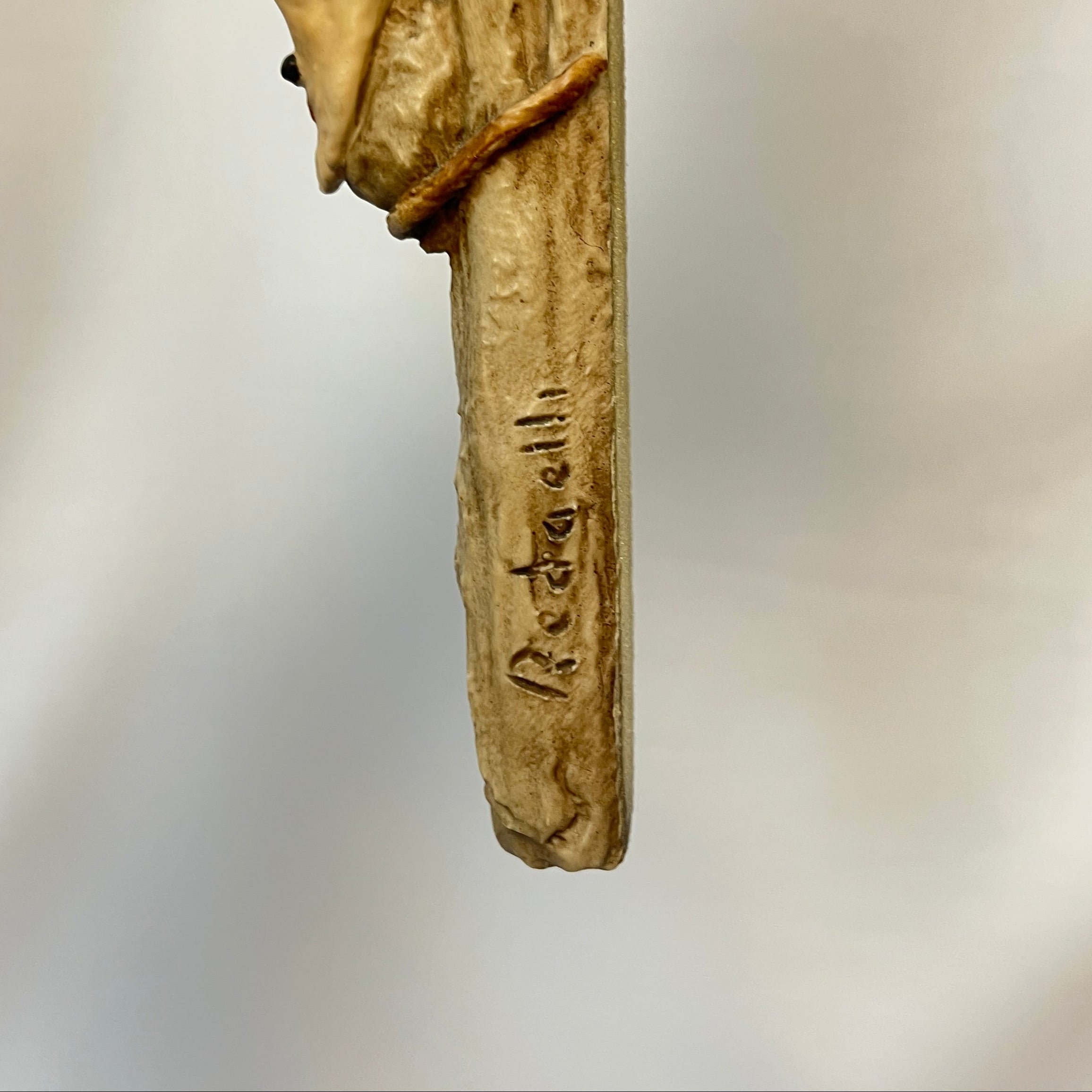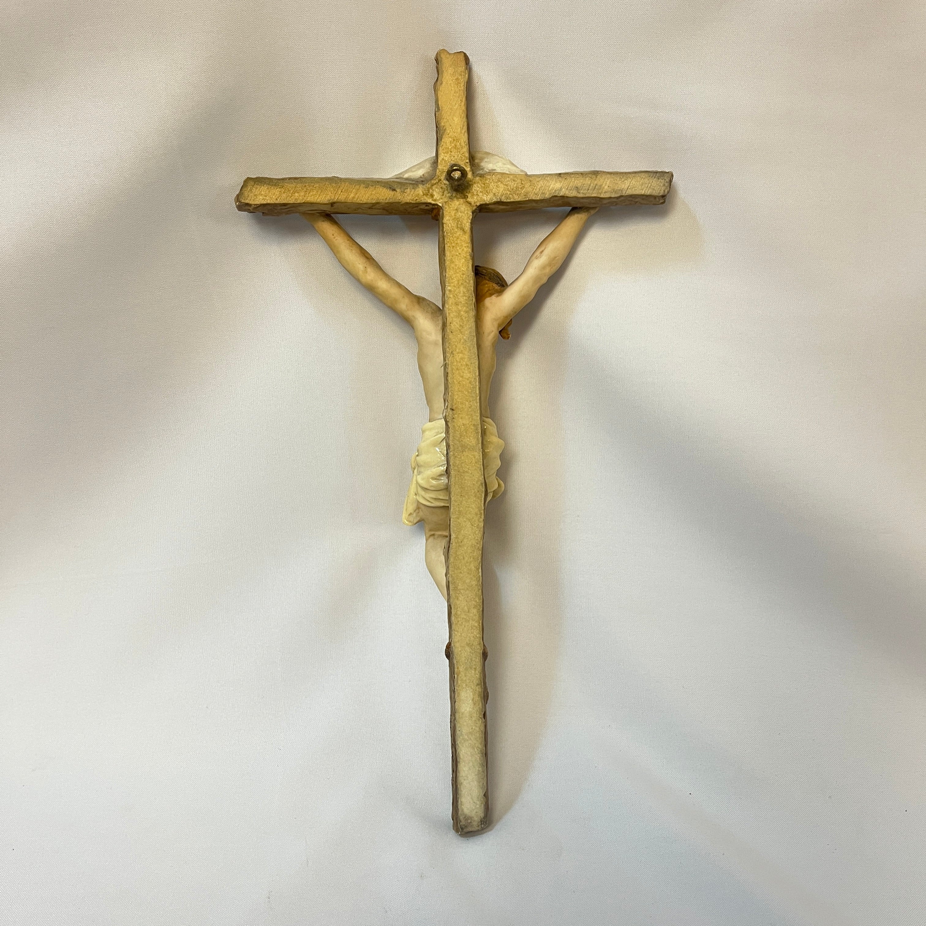 Delicado crucifijo de pared de la reconocida marca Capodimonte. La pieza representa a Jesús en la cruz, sobre una estructura finamente trabajada. Destaca por el cuidado nivel de detalle tanto en la cruz como en la figura, reflejando la calidad característica de esta prestigiosa firma.