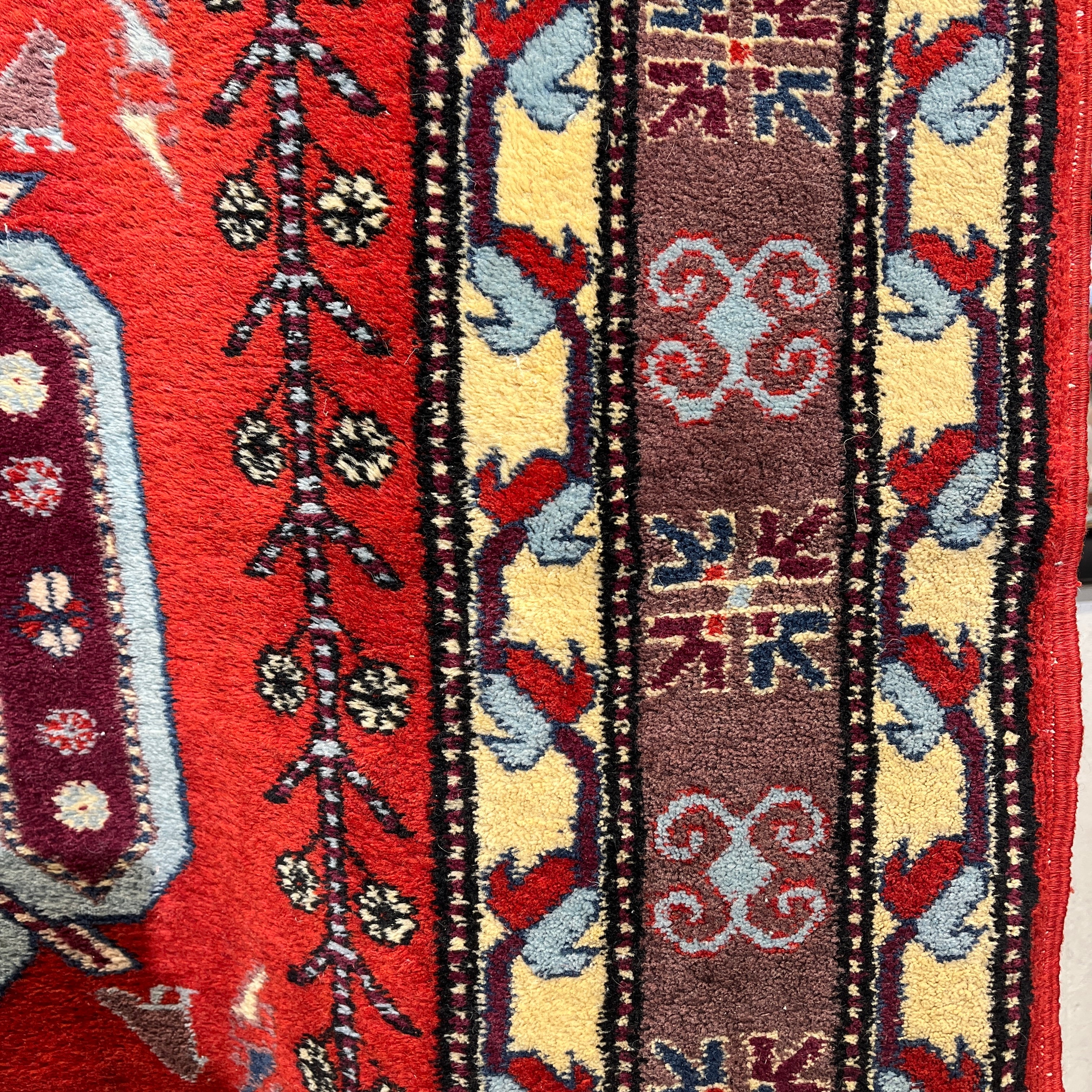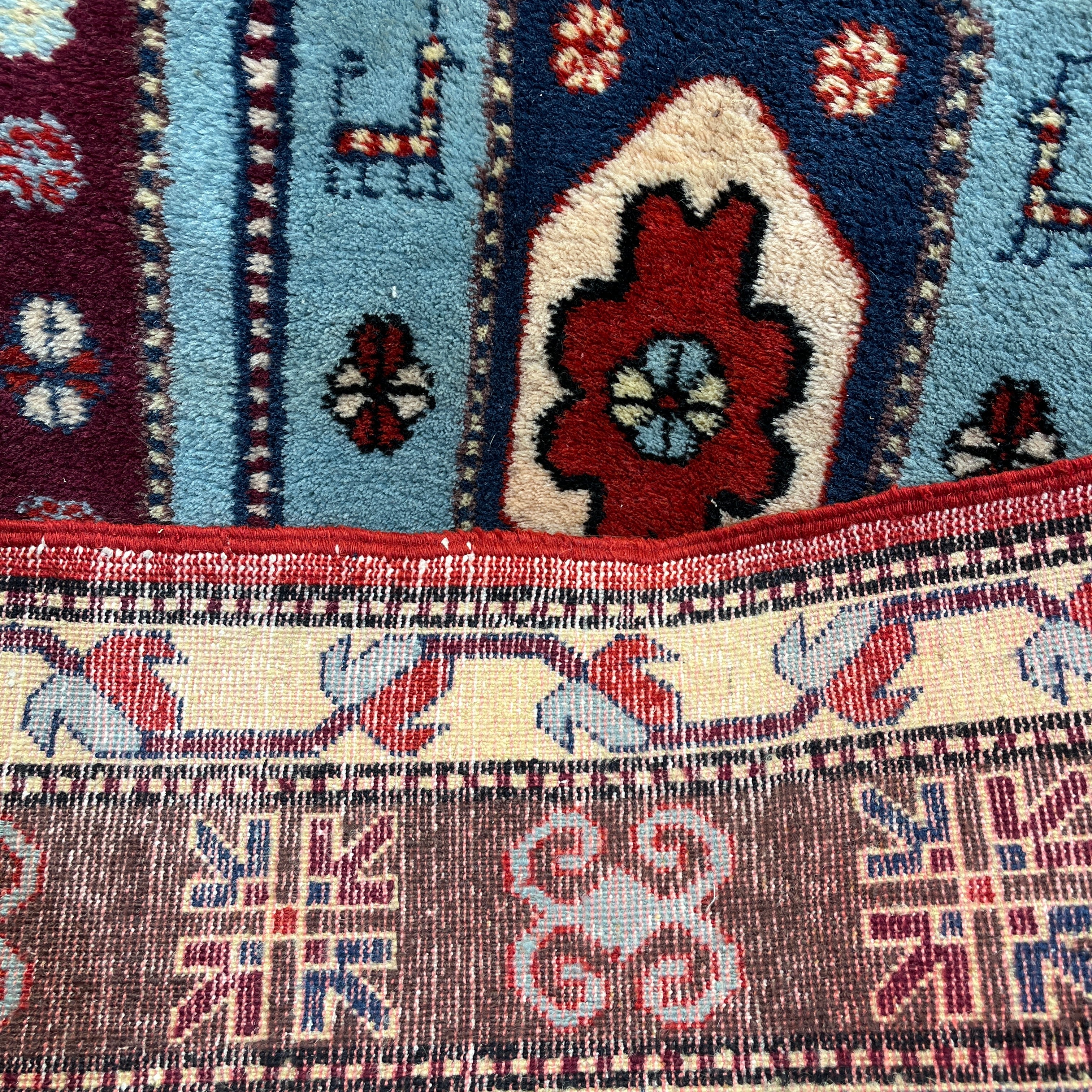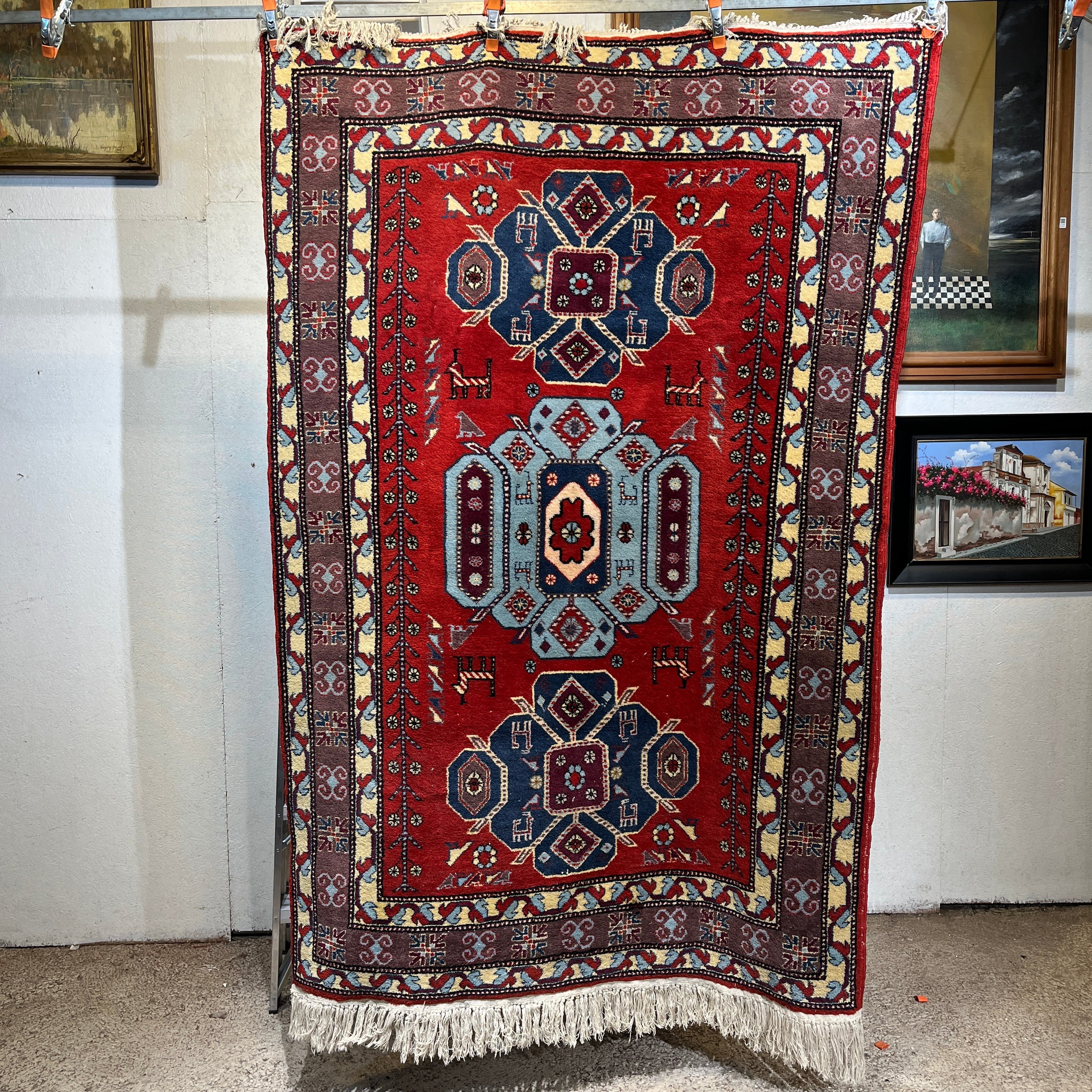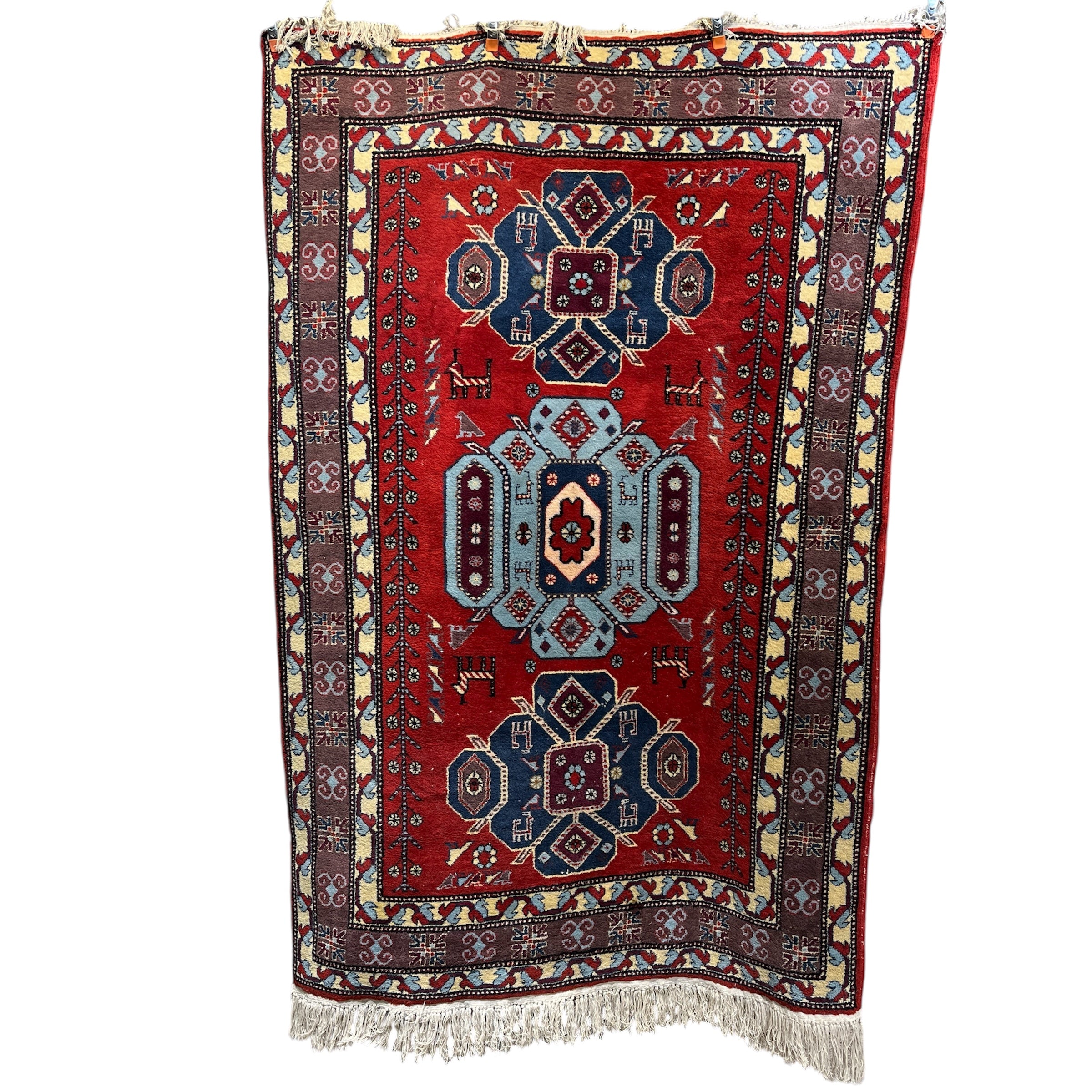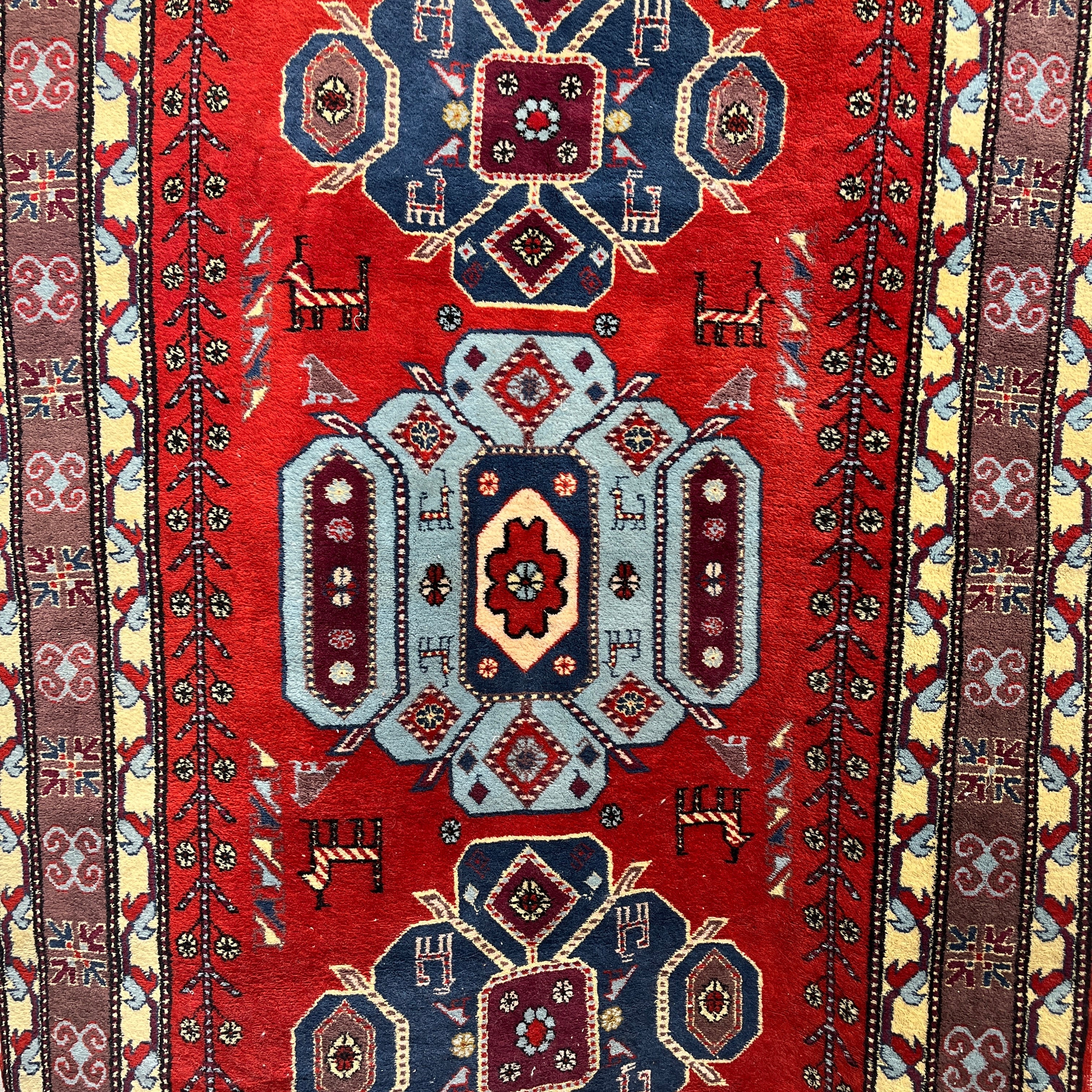 Bella alfombra originaria del Cáucaso Oriental, específicamente de la región de Shirvan en Azerbaiyán. Si bien a menudo se comercializan como "alfombras rusas" debido al pasado histórico y la influencia de Rusia en la región del Cáucaso, su origen y tradición de tejido son azerbaiyanos. Esta alfombra hecha de lana anudada y teñida a mano, tiene un diseño que presenta el motivo "boteh" (también conocido como paisley) de medallones poligonales o en forma de rombo, y figuras de animales y humanos estilizadas. Esta bella pieza tiene una paleta de colores intensos y contrastantes, con un medallón central índigo, además de rojo, azul violáceo, blanco y café.