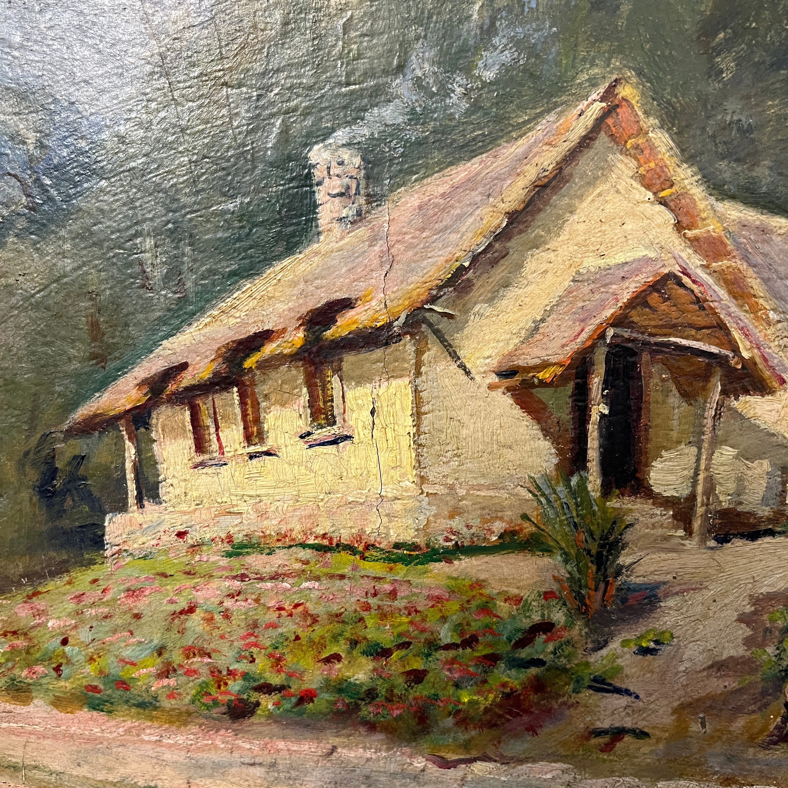 Óleo sobre madera representando un paisaje rural en el que se ve una casita de campo desde el camino, mostrando la puerta, el jardín anterior y la fachada. La obra evoca una imagen muy reconocible del mundo rural chileno, retratándola con cariño a los detalles, haciéndo lo reconocible, íntimo y cercano.