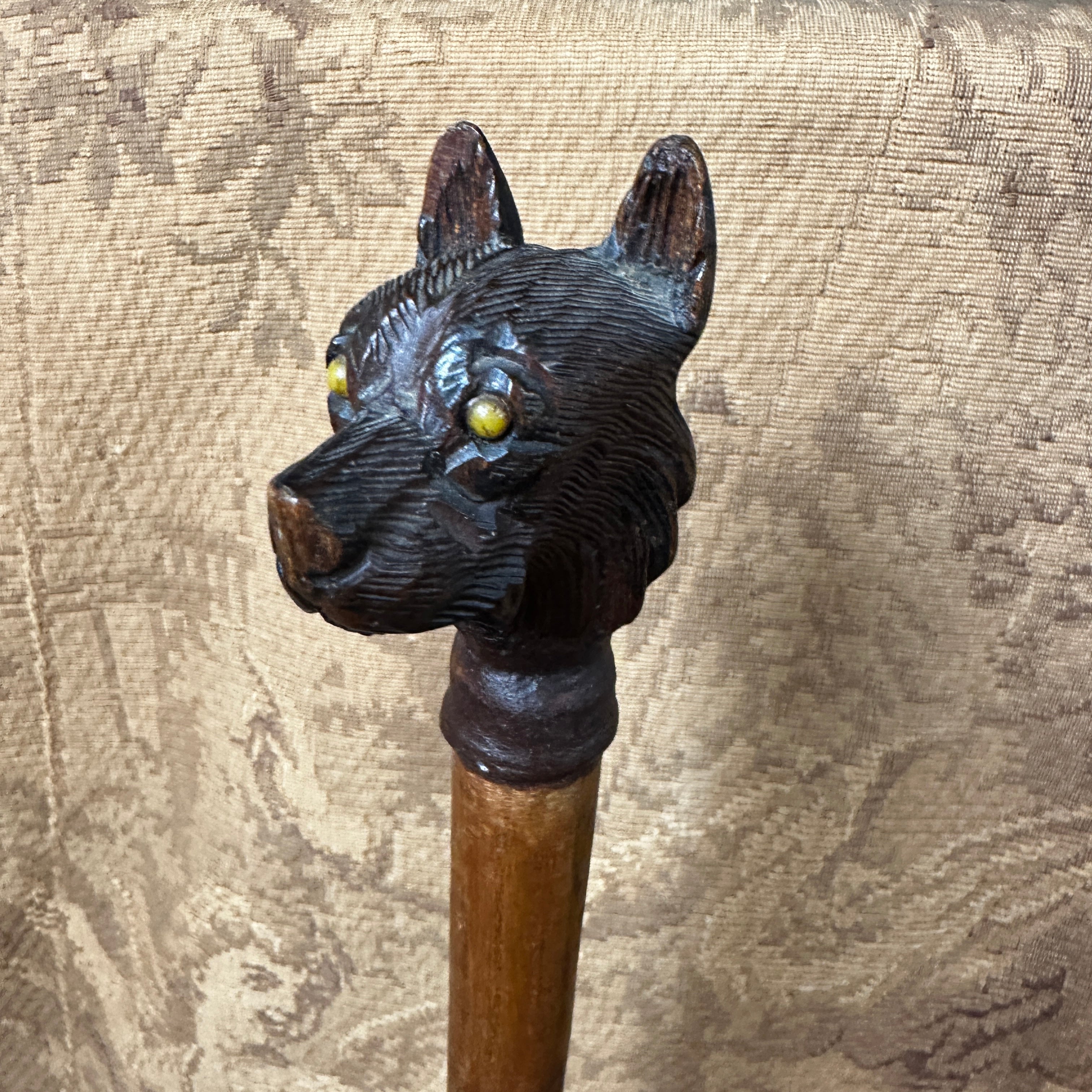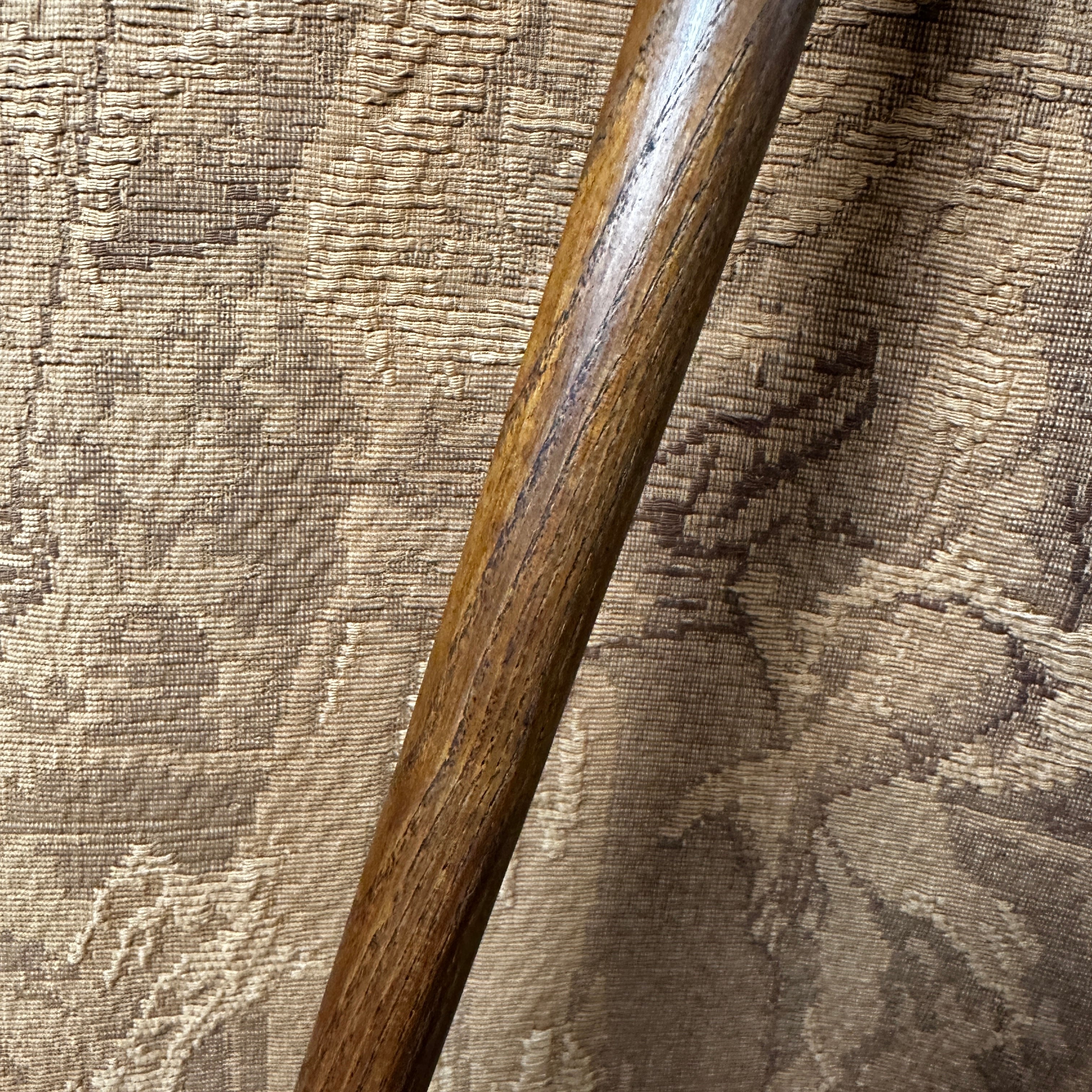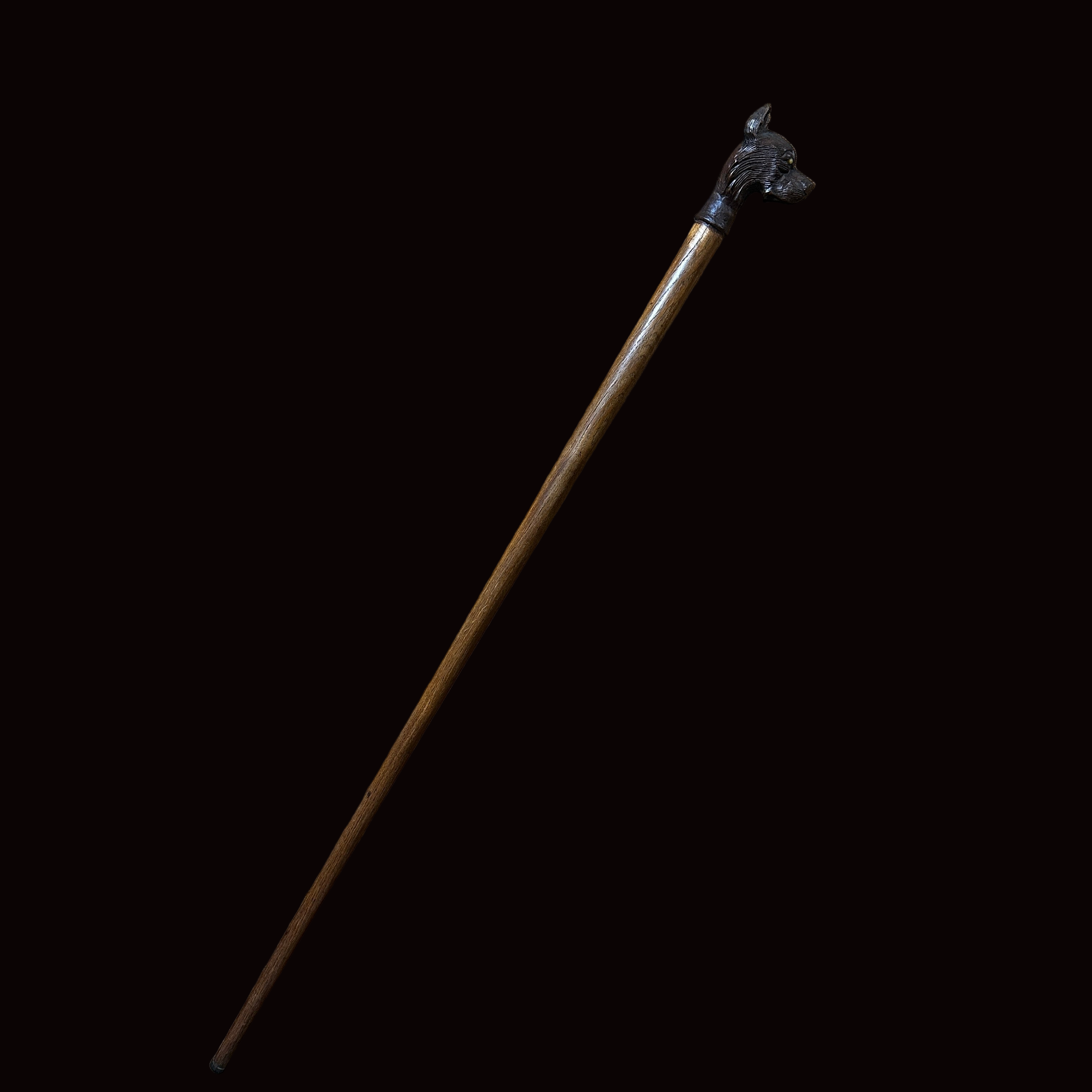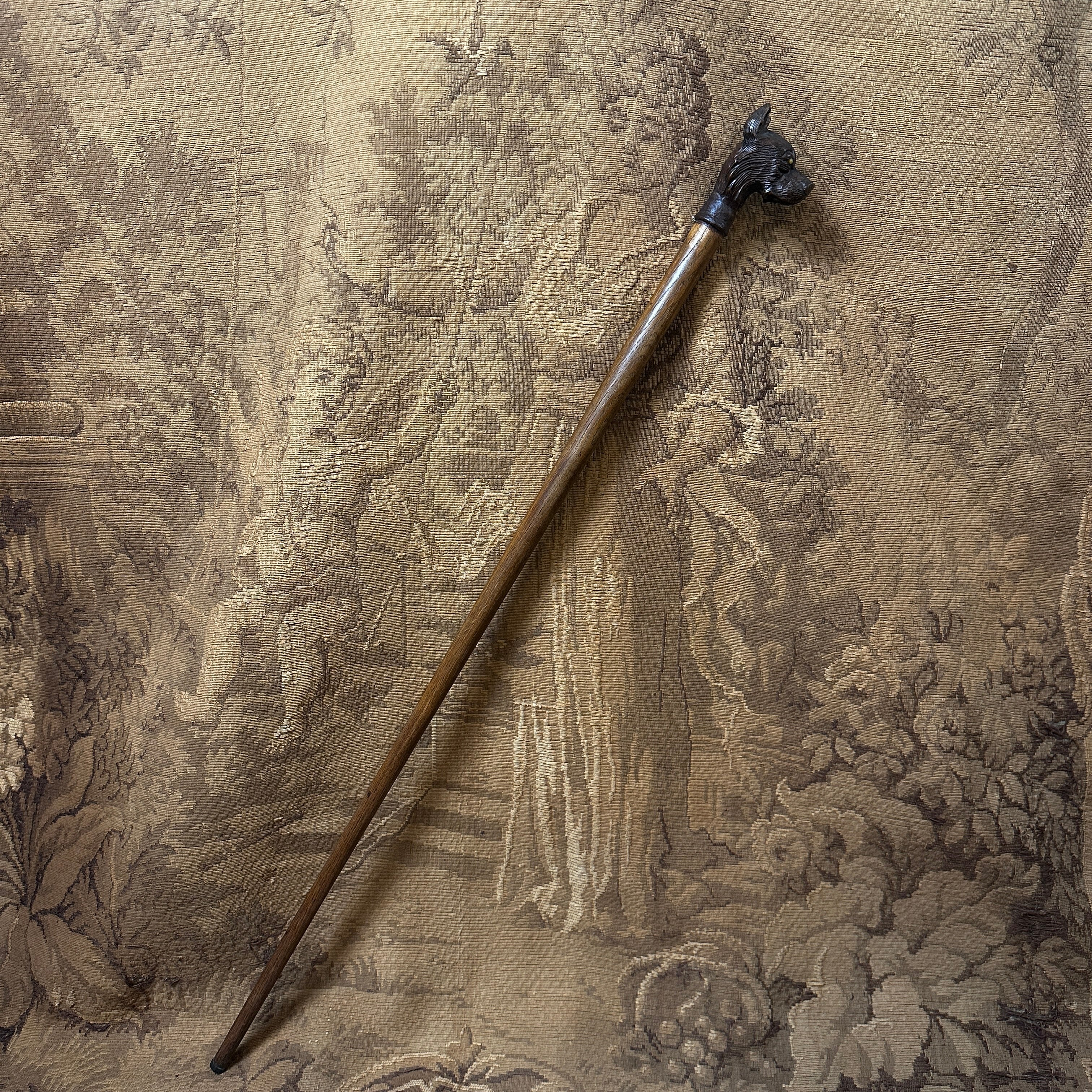 Belle canne de gentleman en chêne américain avec un manche sculpté en forme de chien.