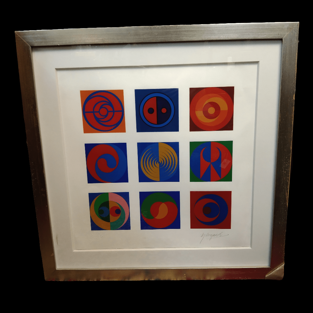 Impression numérique de l'artiste chilien Miguel Cosgrove représentant neuf sphères aux motifs graphiques distincts, jouant avec différentes associations de couleurs. L'œuvre est signée par l'artiste et estampillée d'un sceau d'authentification d'art numérique. Elle est présentée dans un cadre neuf en bois lisse peint en argent.
