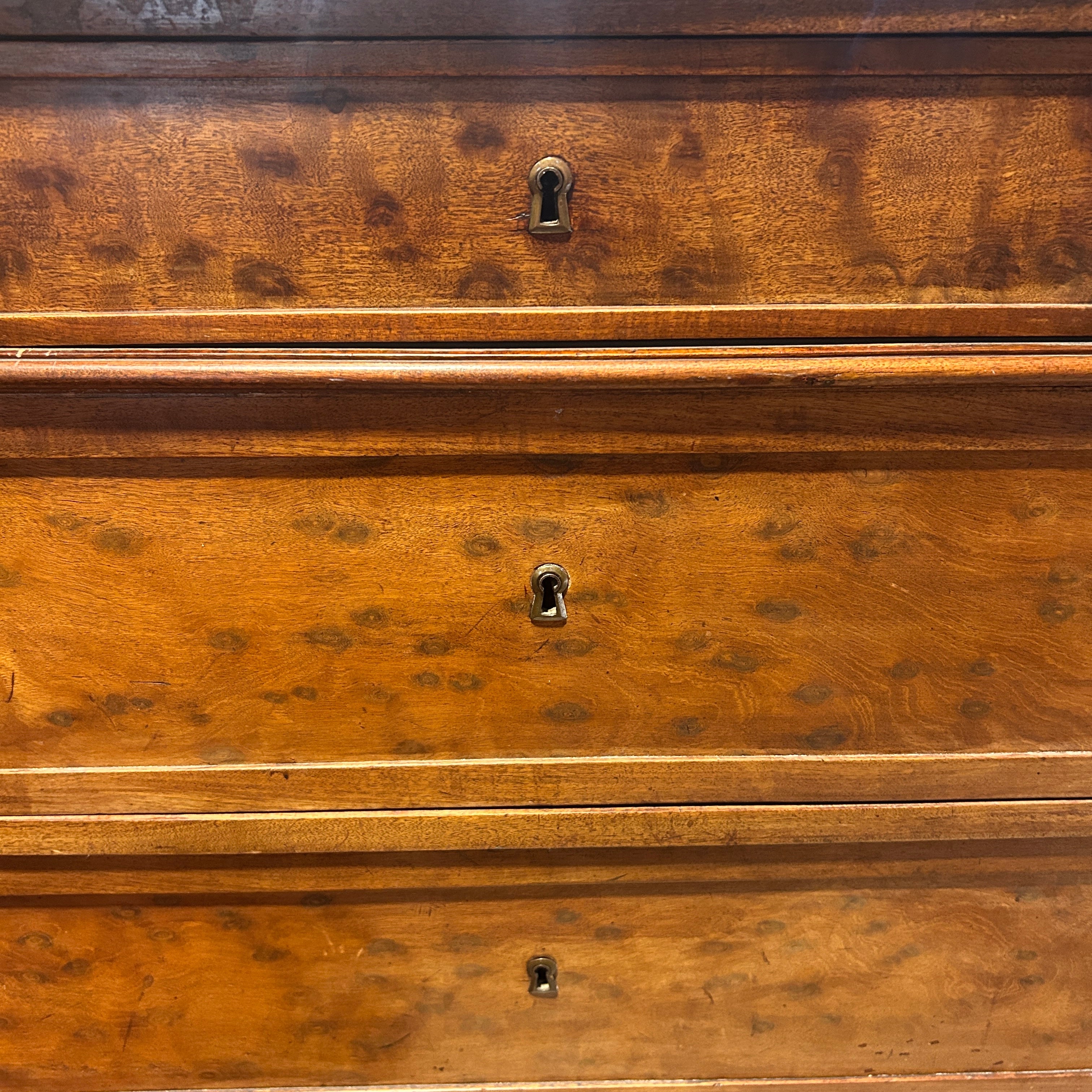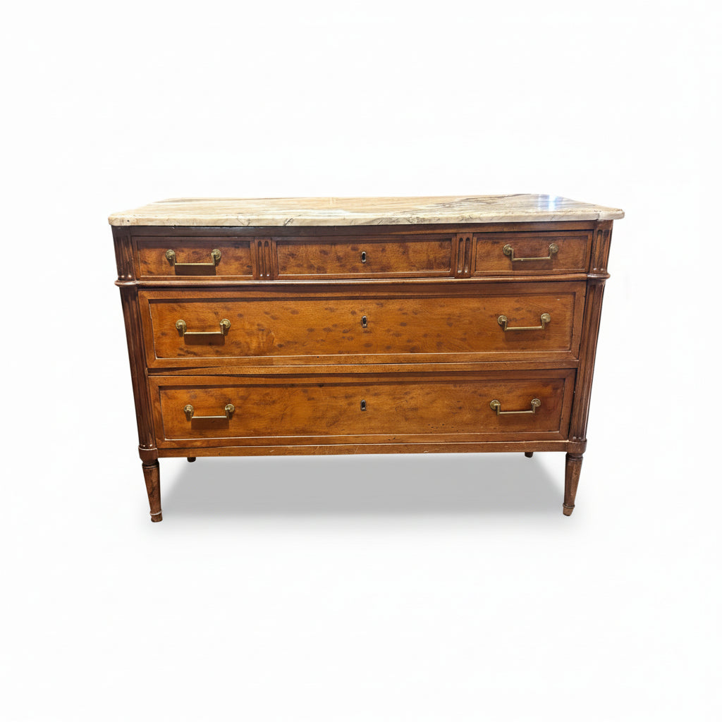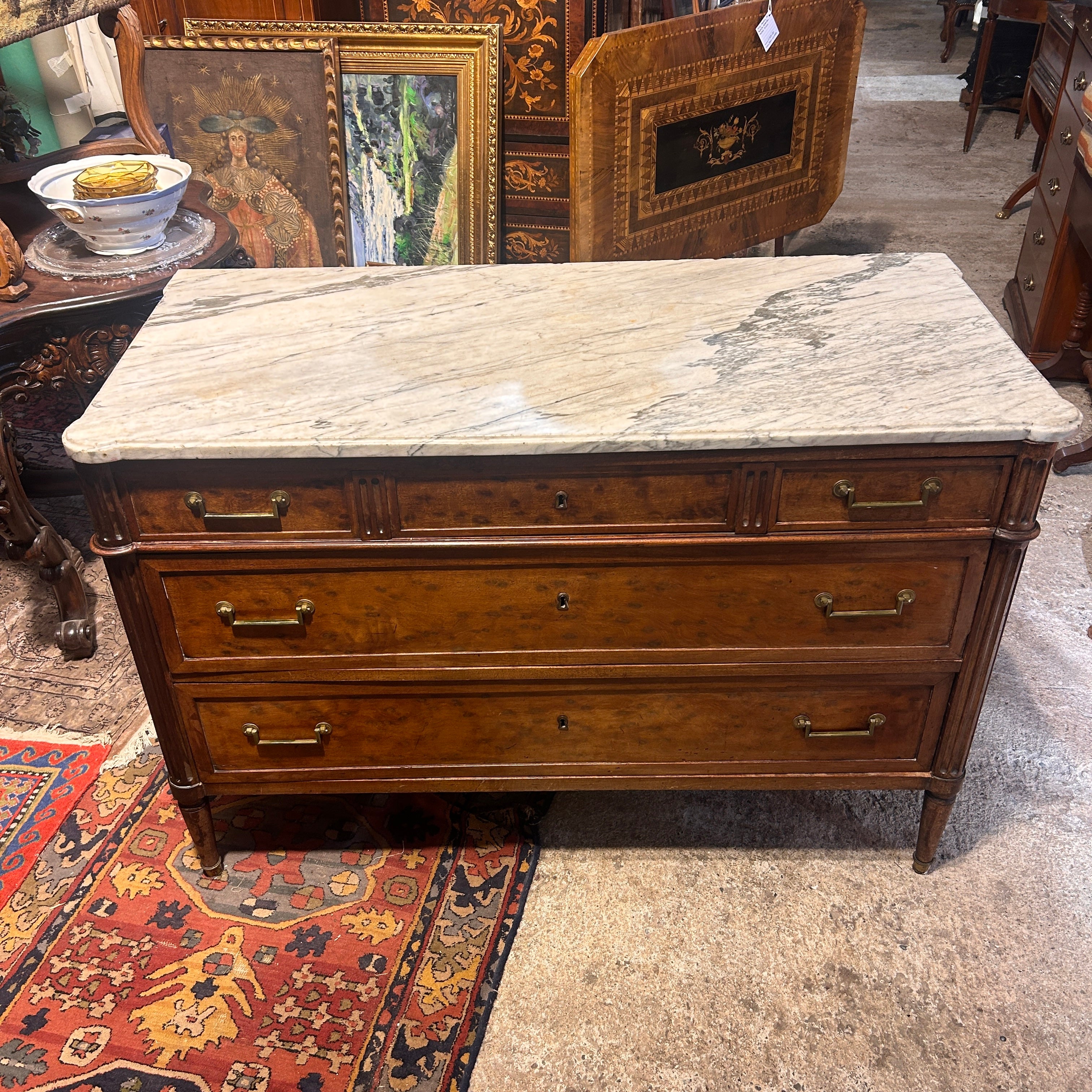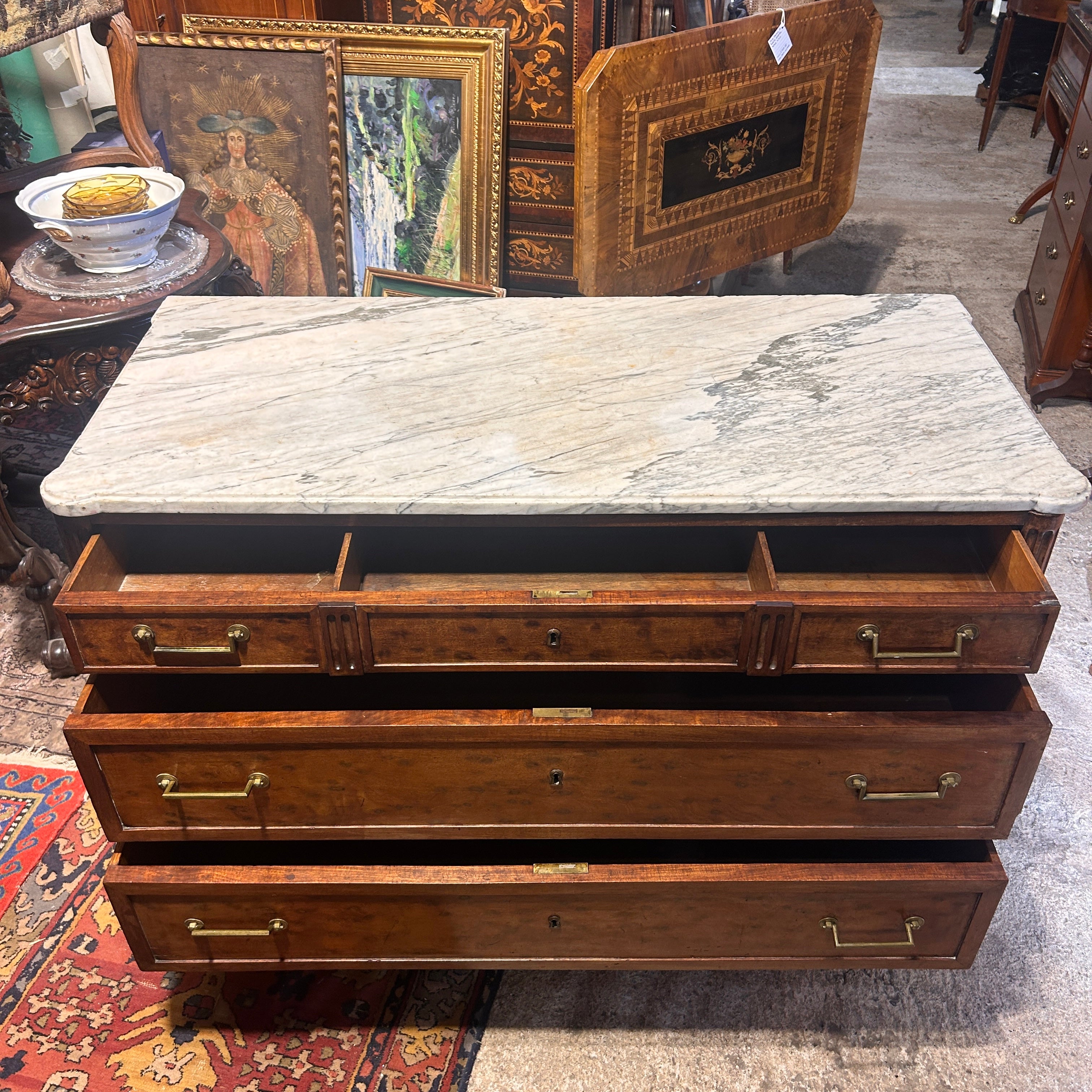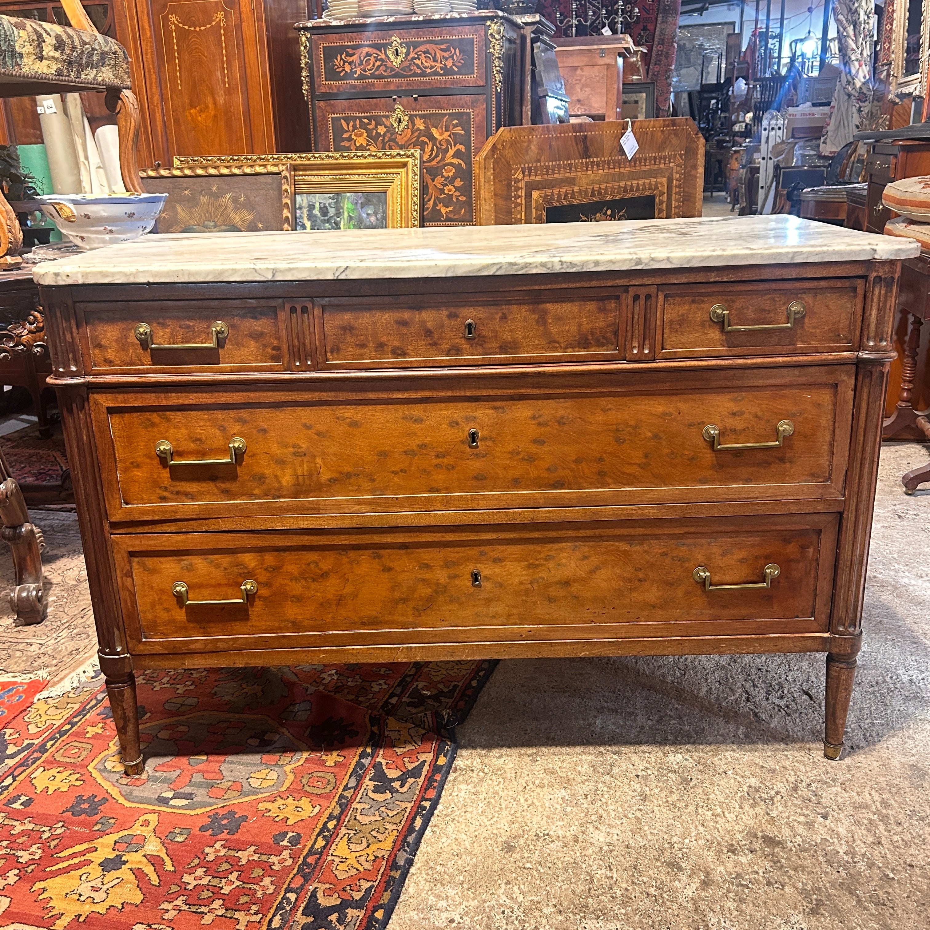 Madera de roble y encino francés en interior y chapa Loupe d’amboine cubierta de mármol original tiradores, bocallaves y tacos de bronce. Tres cajones.