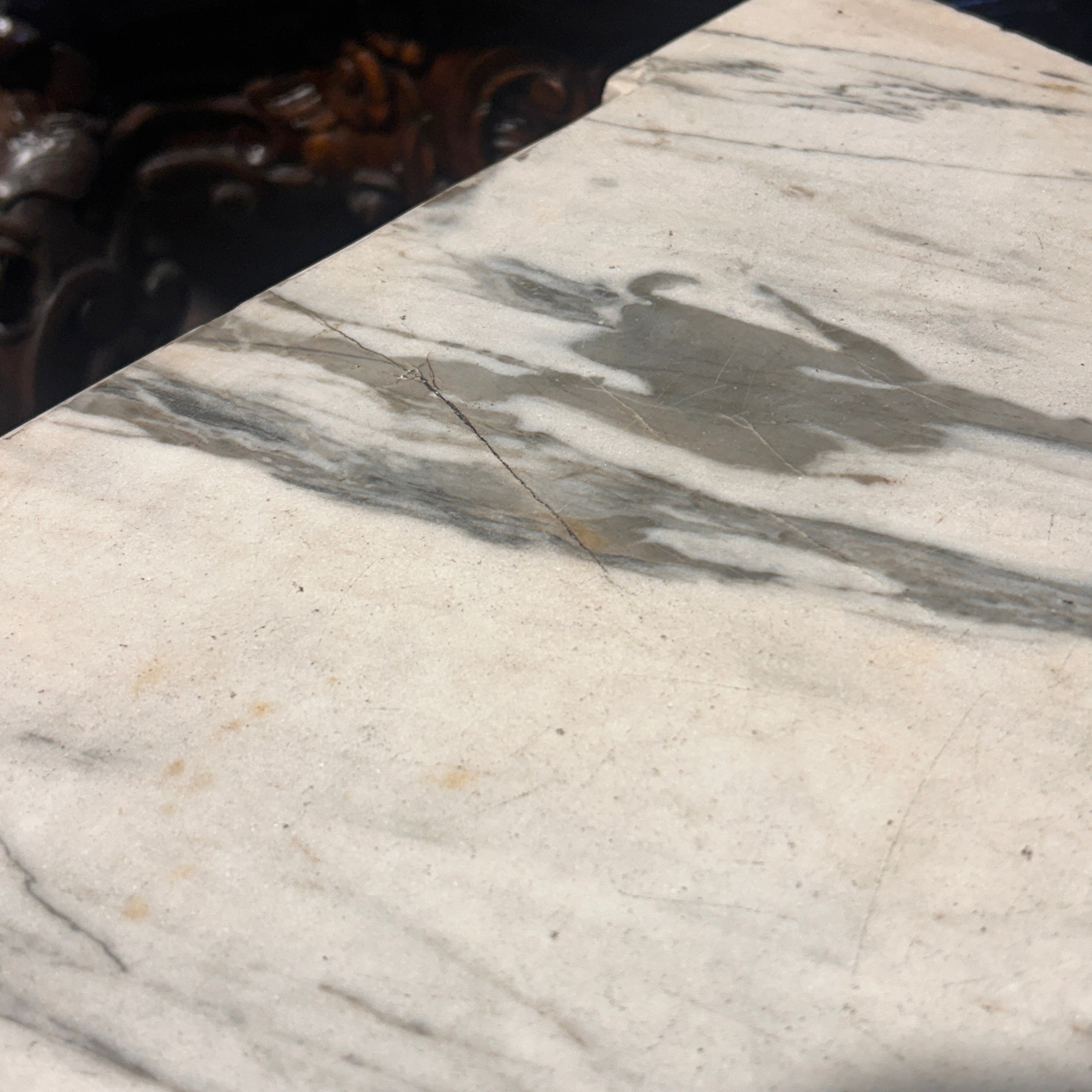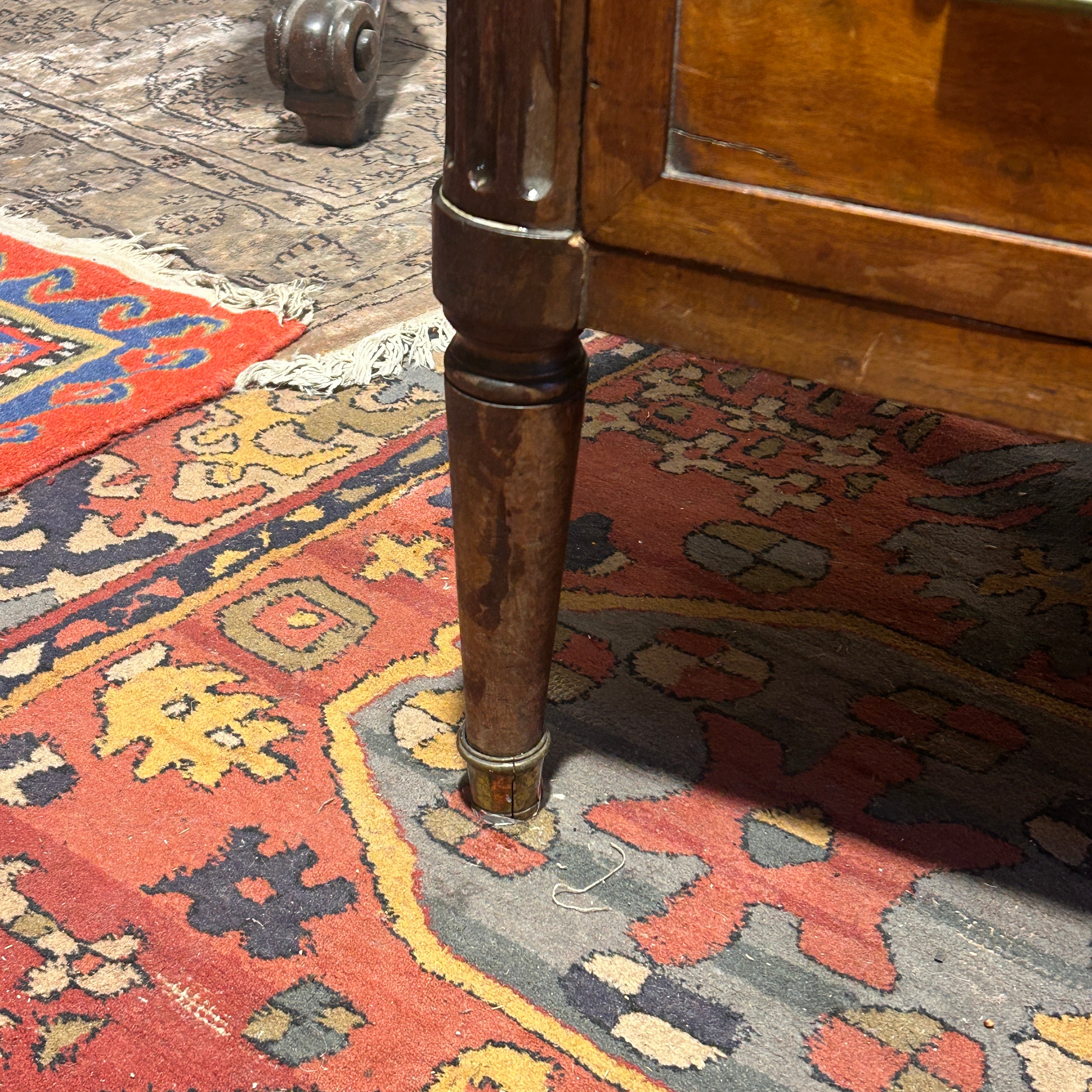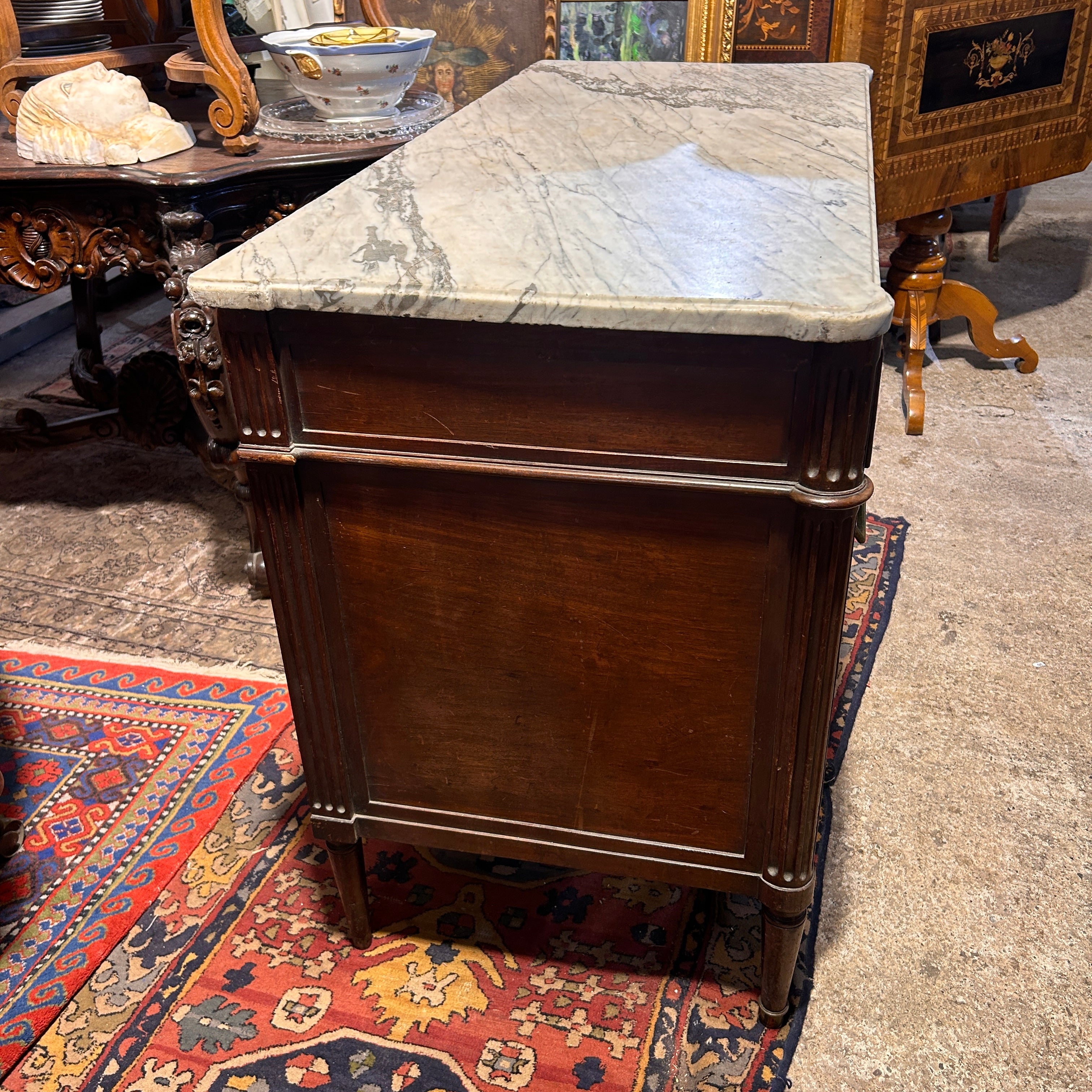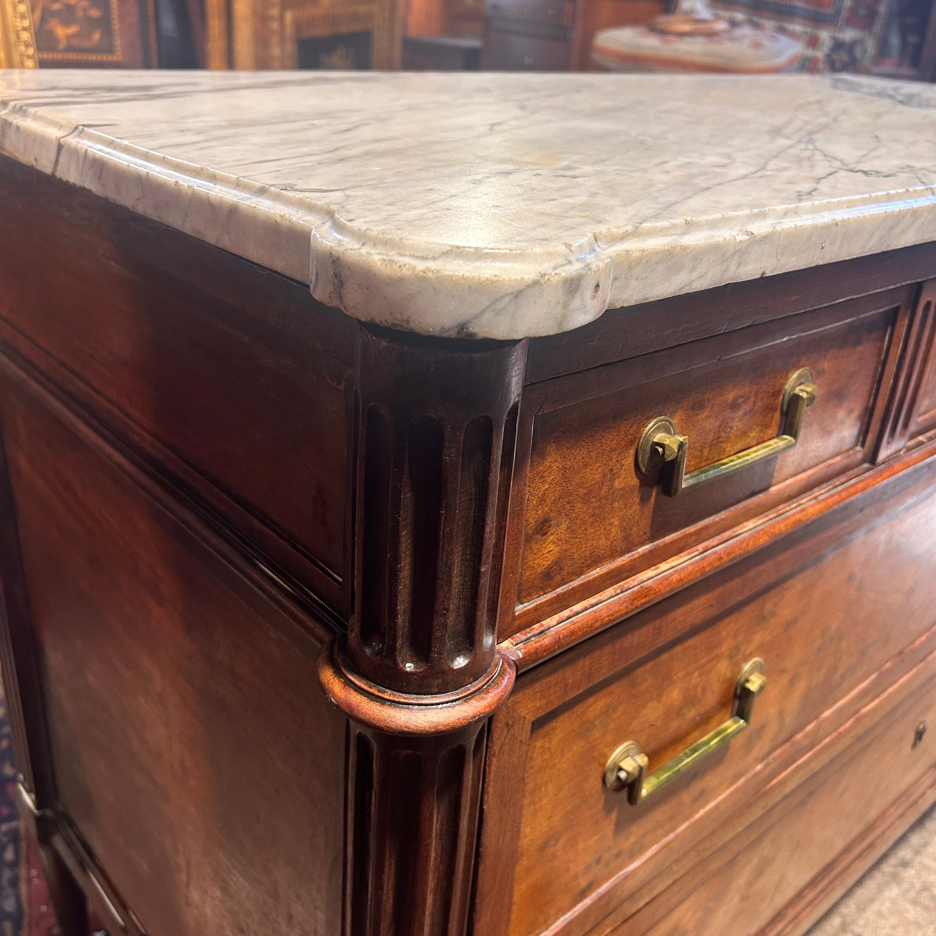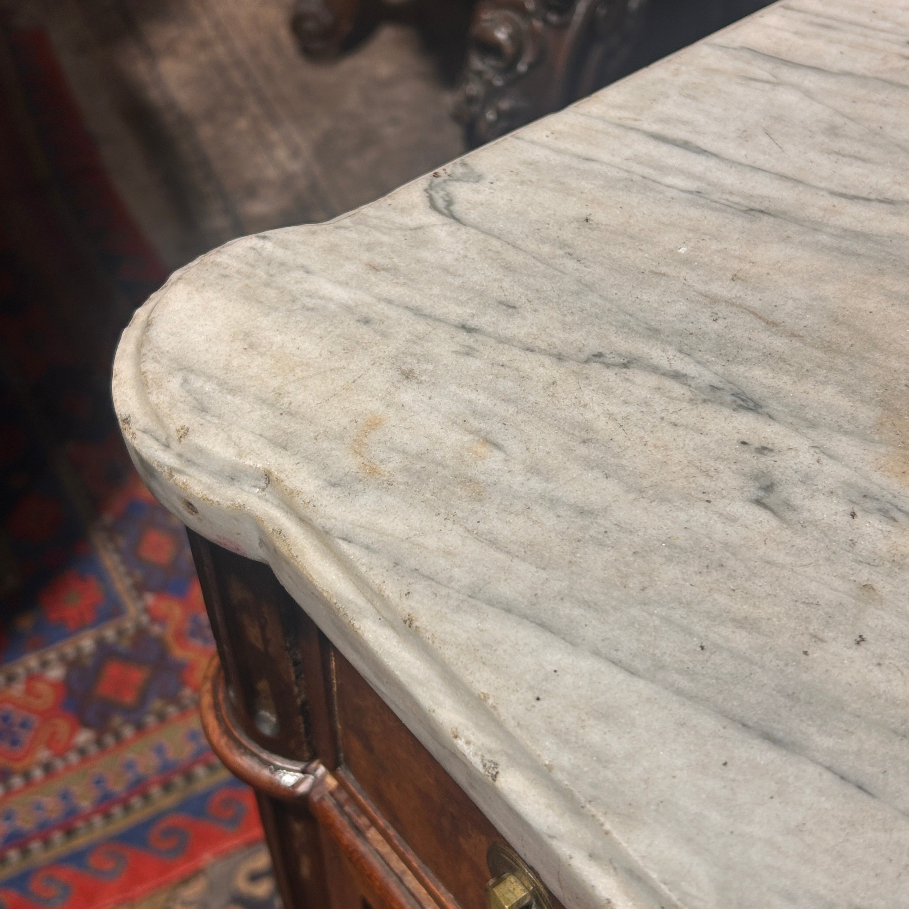 Madera de roble y encino francés en interior y chapa Loupe d’amboine cubierta de mármol original tiradores, bocallaves y tacos de bronce. Tres cajones.