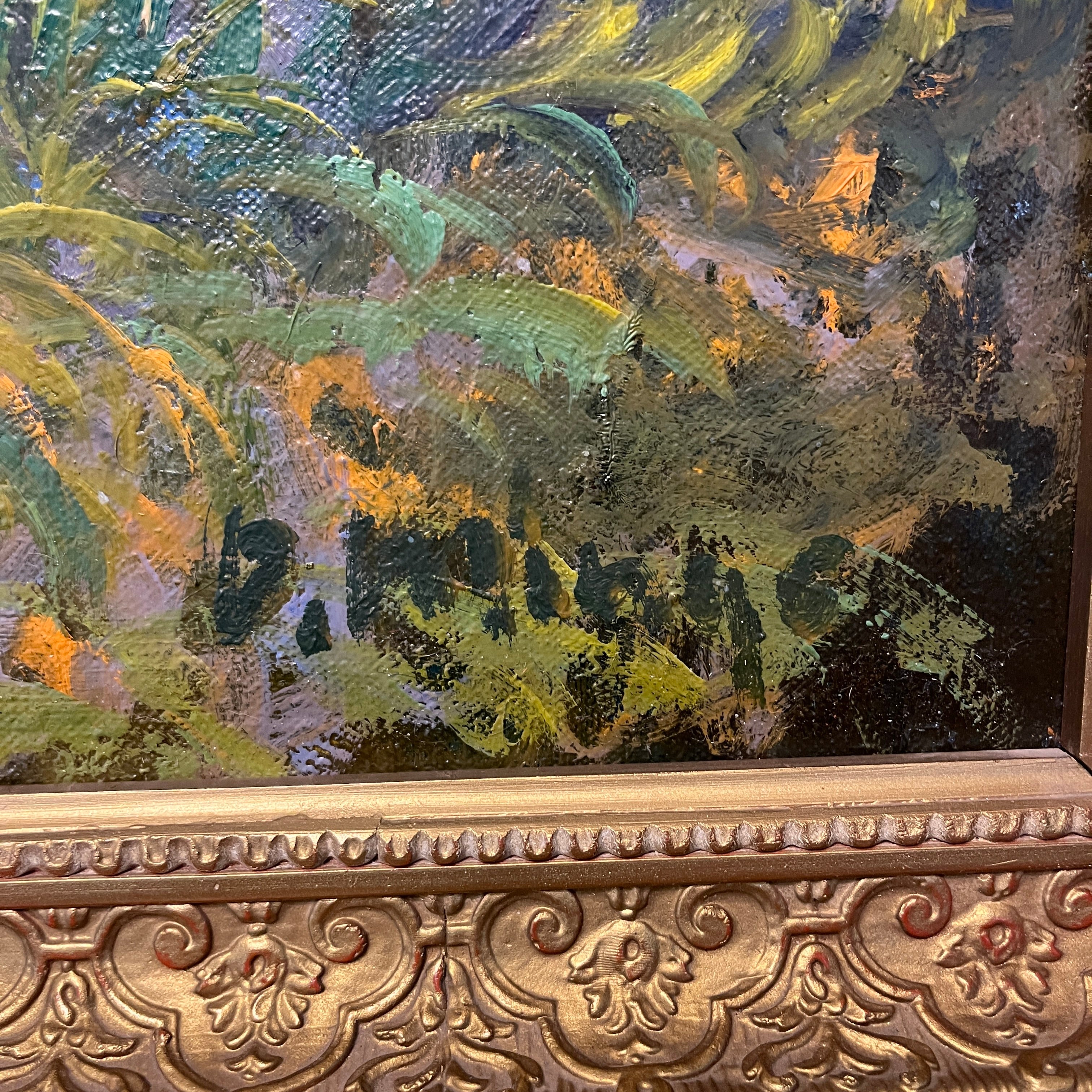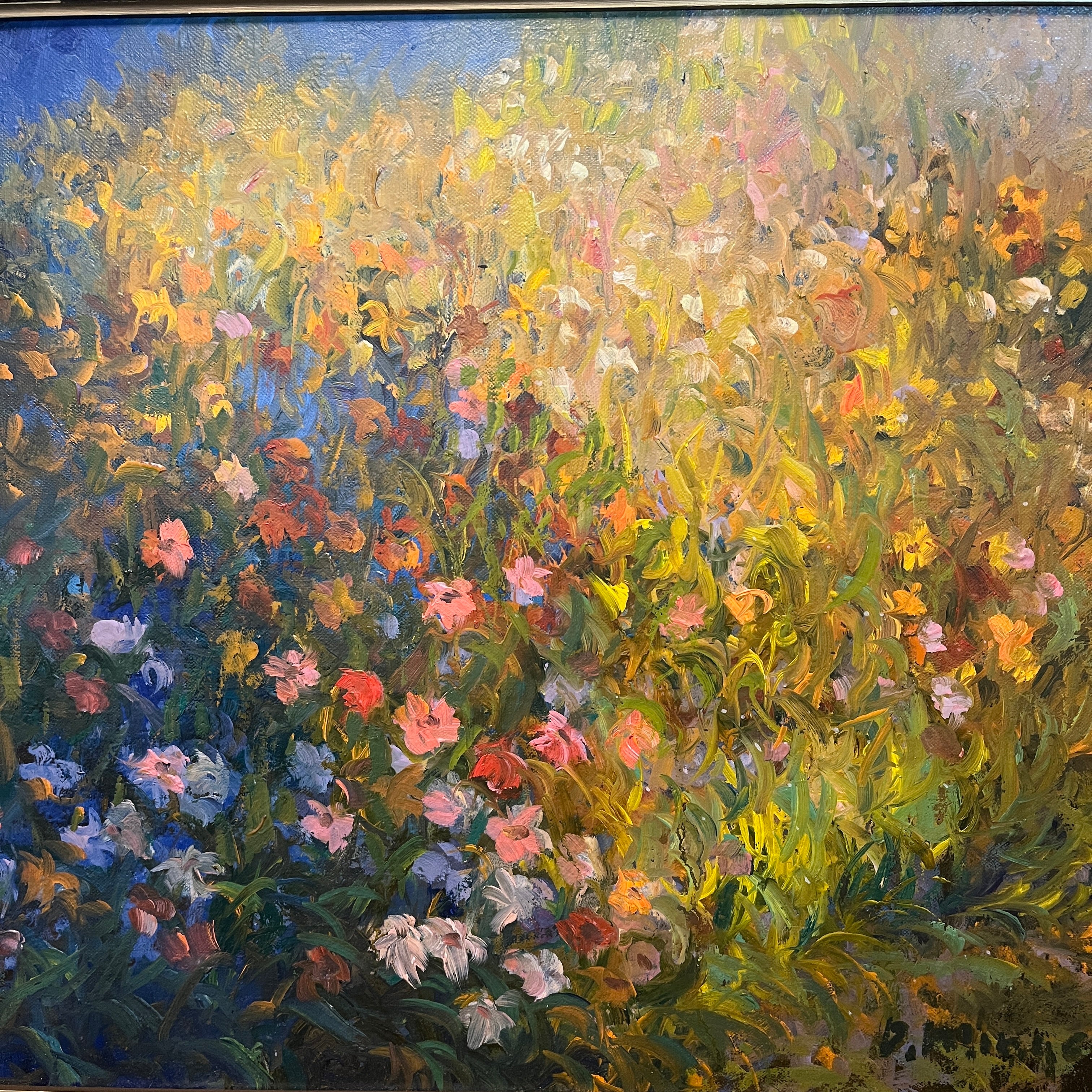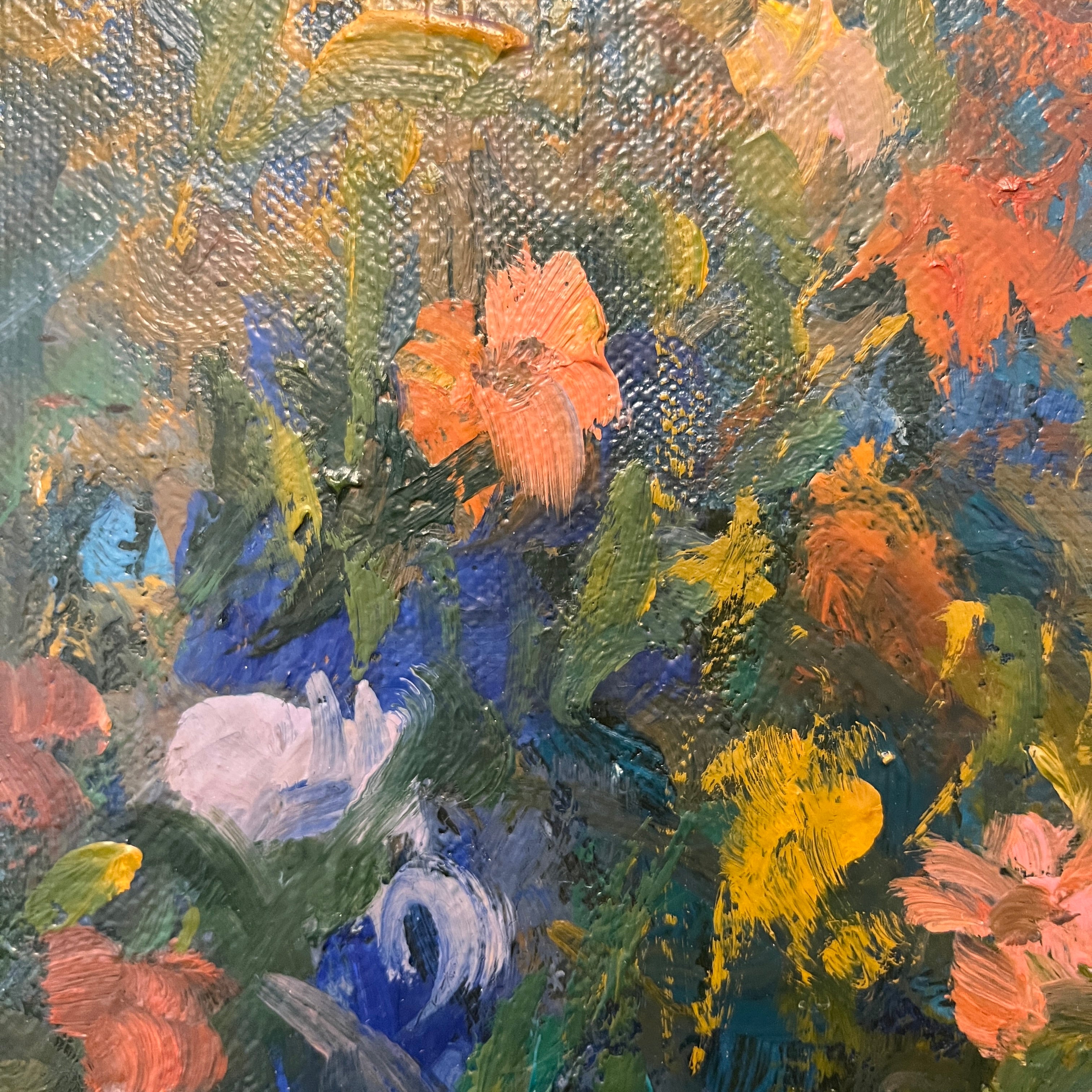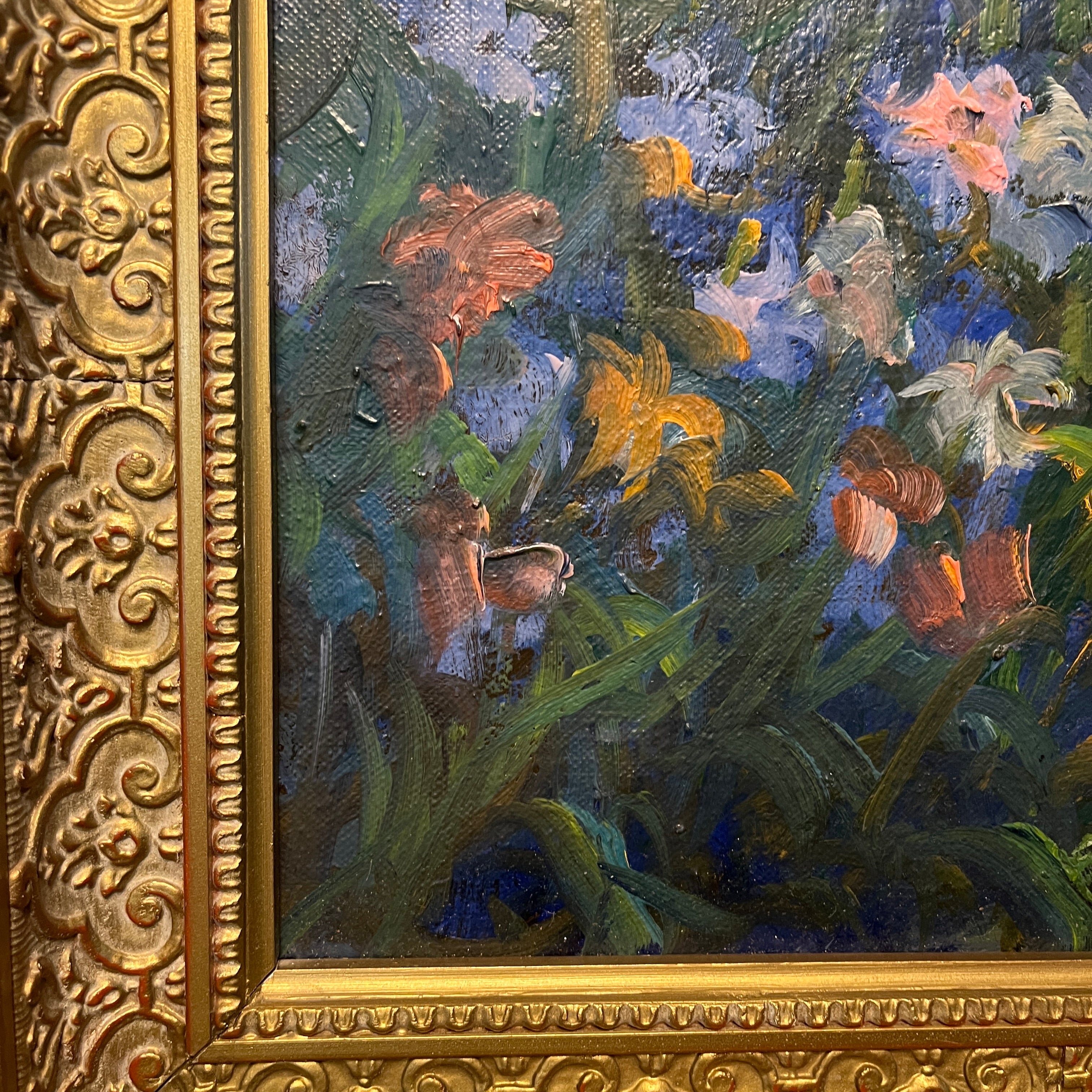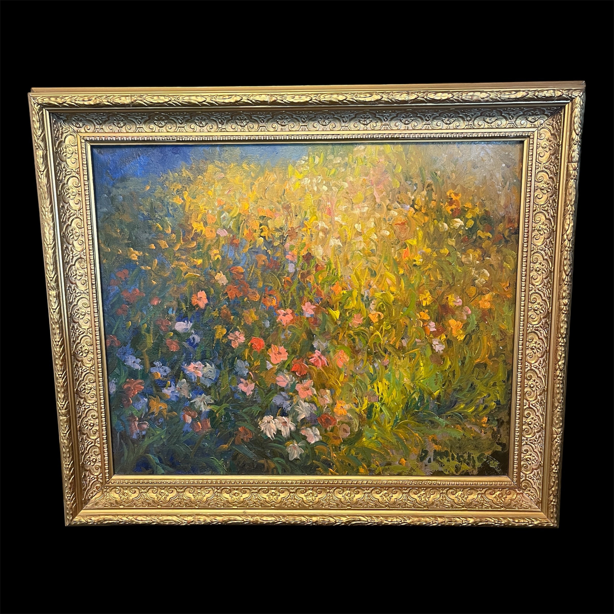 Óleo sobre tela, de origen europeo y firma ilegible, representando una composición de flores coloridas sobre un pastizal, lleno de textura y haciendo un trabajo de luz que va desde los tonos oscuros a un dorado luminoso. La obra e se a enmarcada en bella madera tallada en relieves y terminada en dorado.