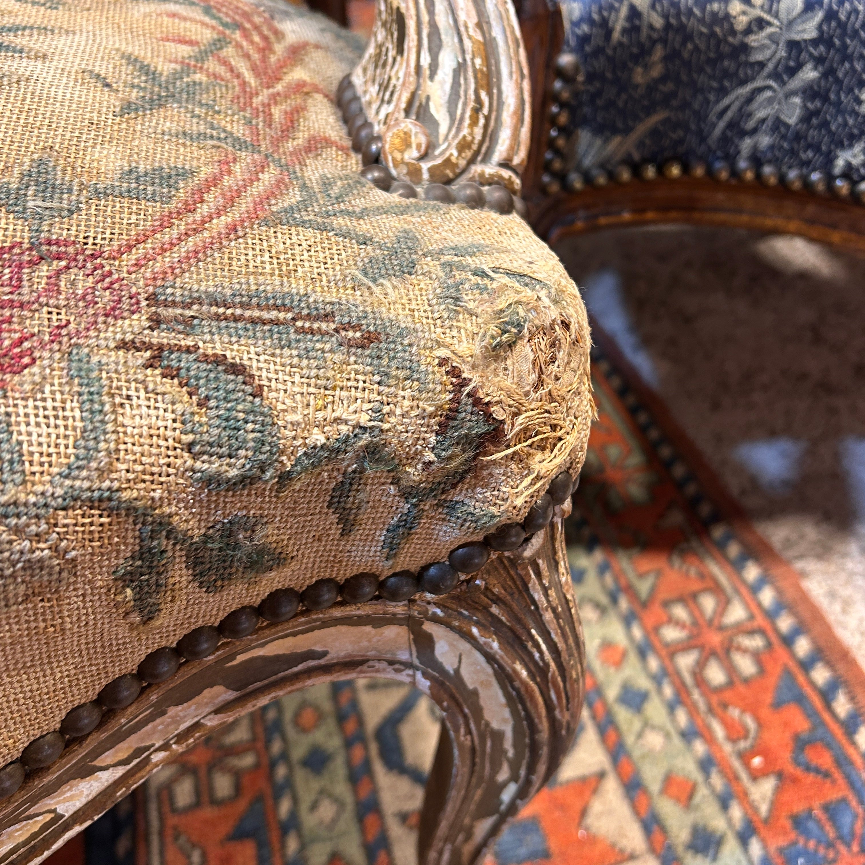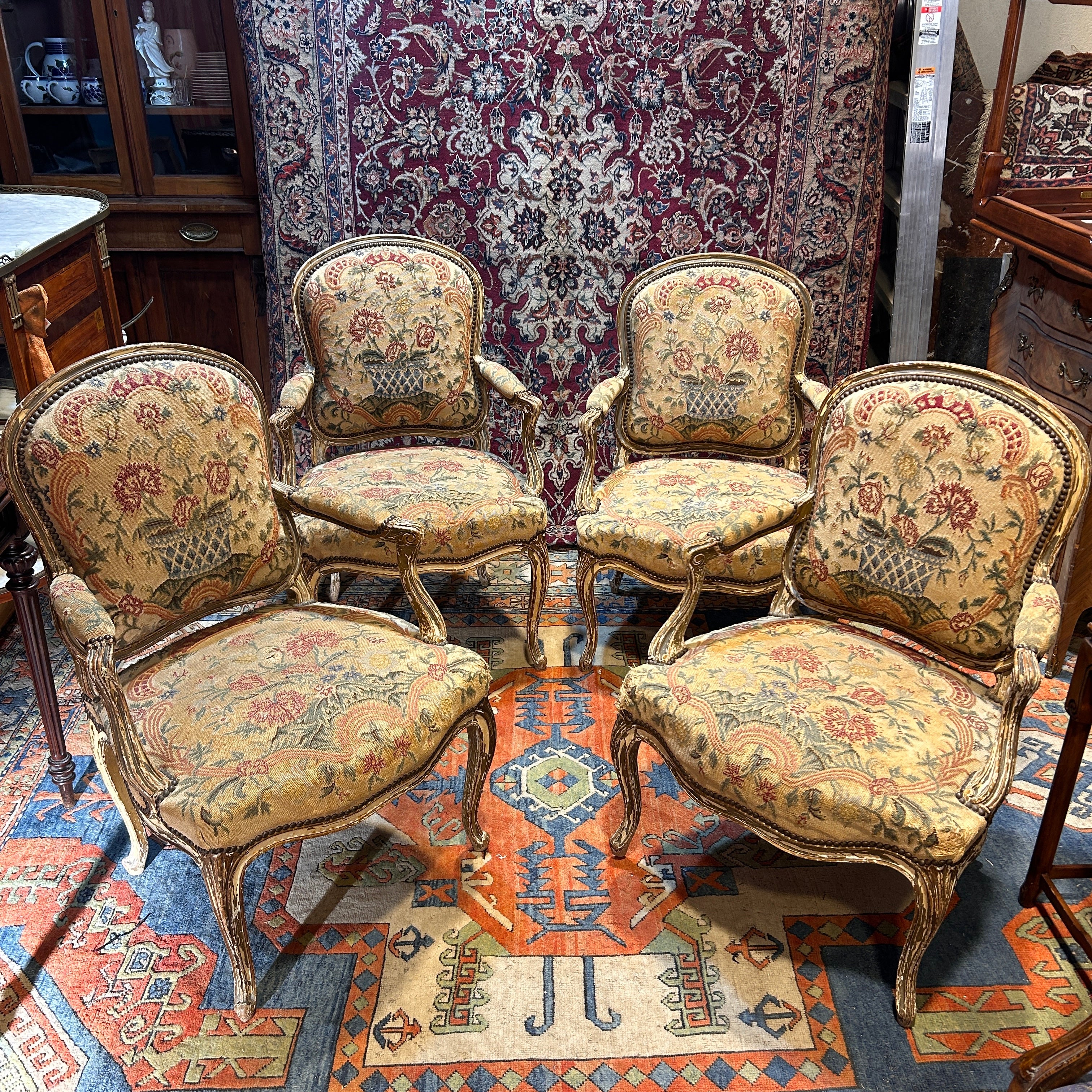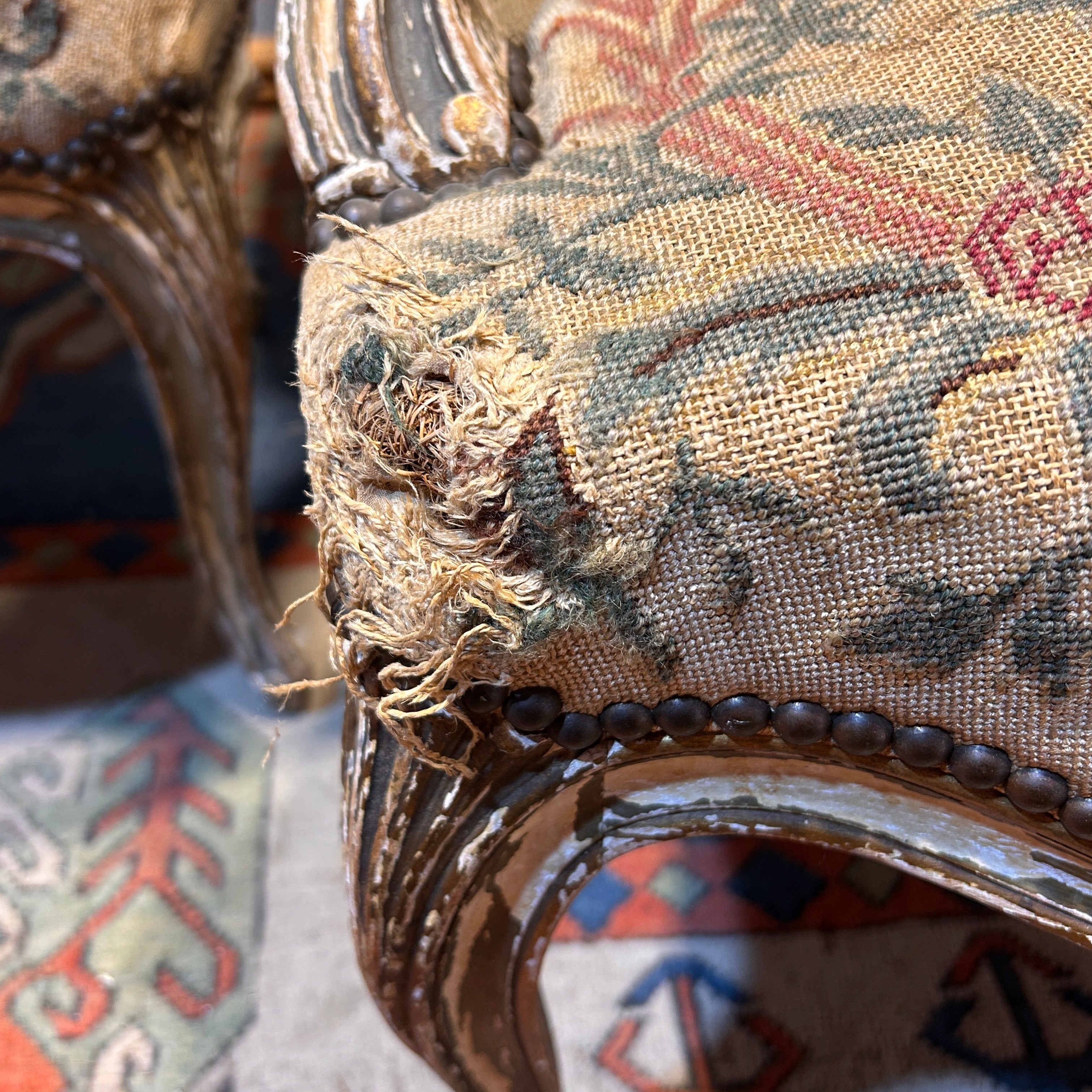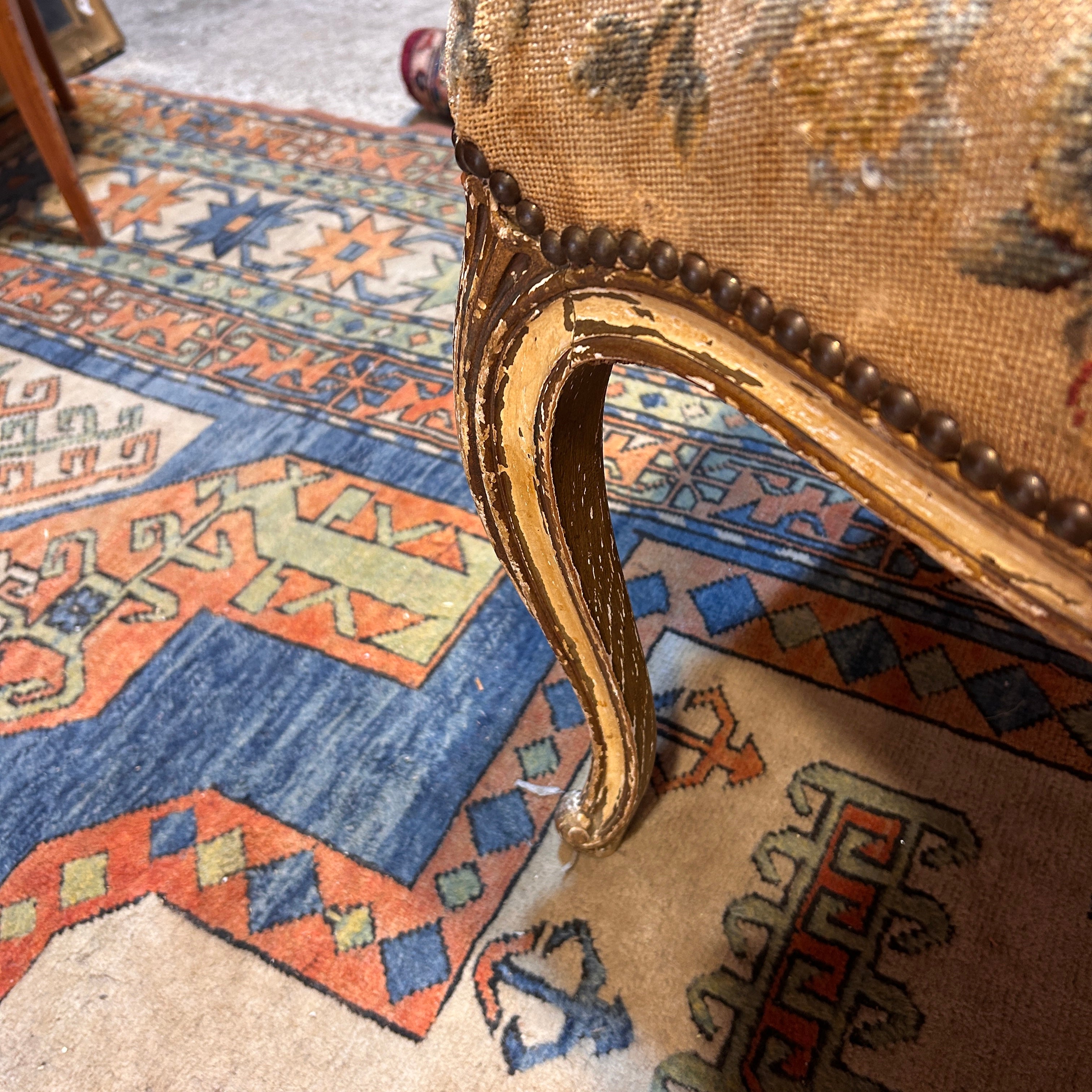 8 pieces Living room furniture in natural wood with floral decoration: sofa, corbeille-type chair (broken leg) and pair of cabriolets.