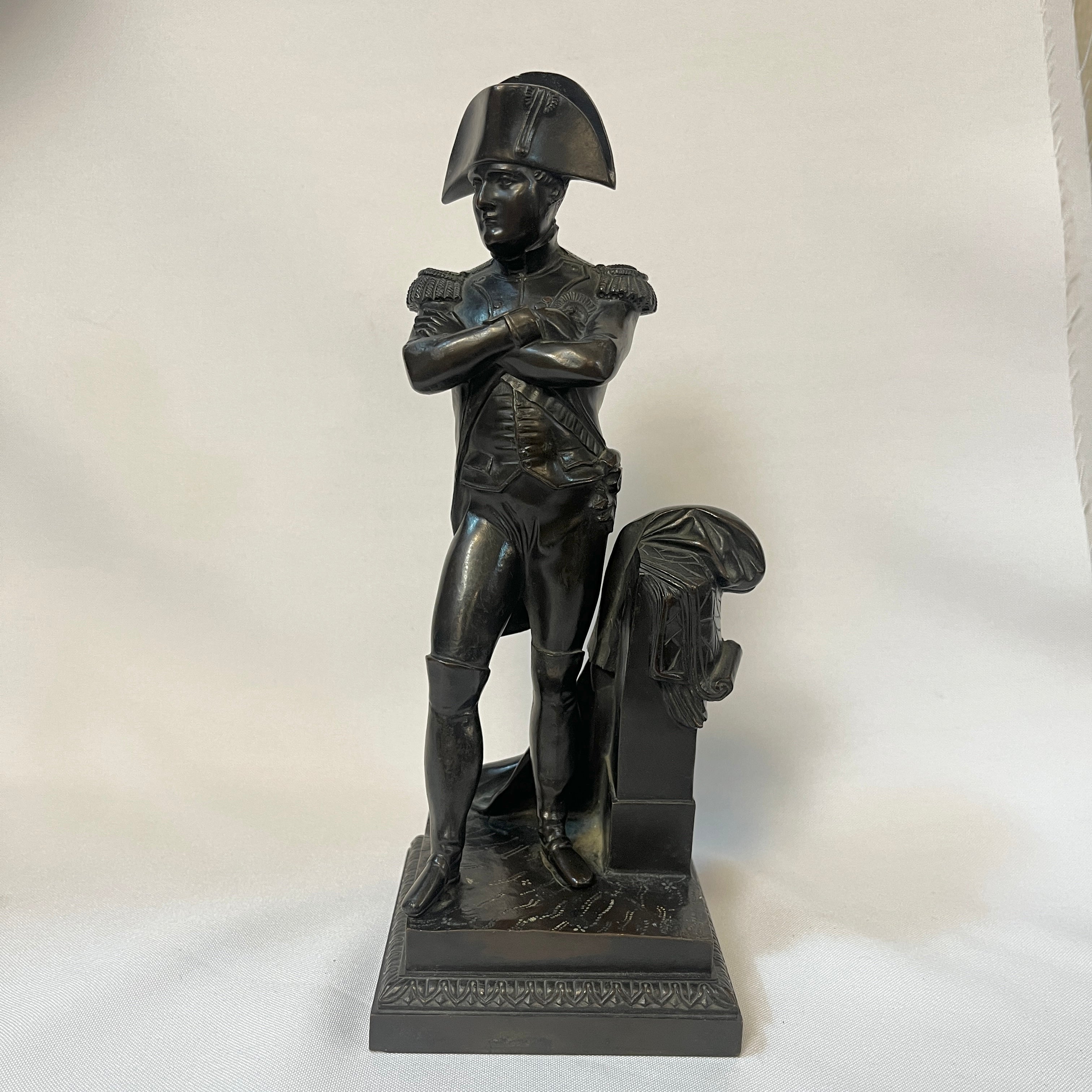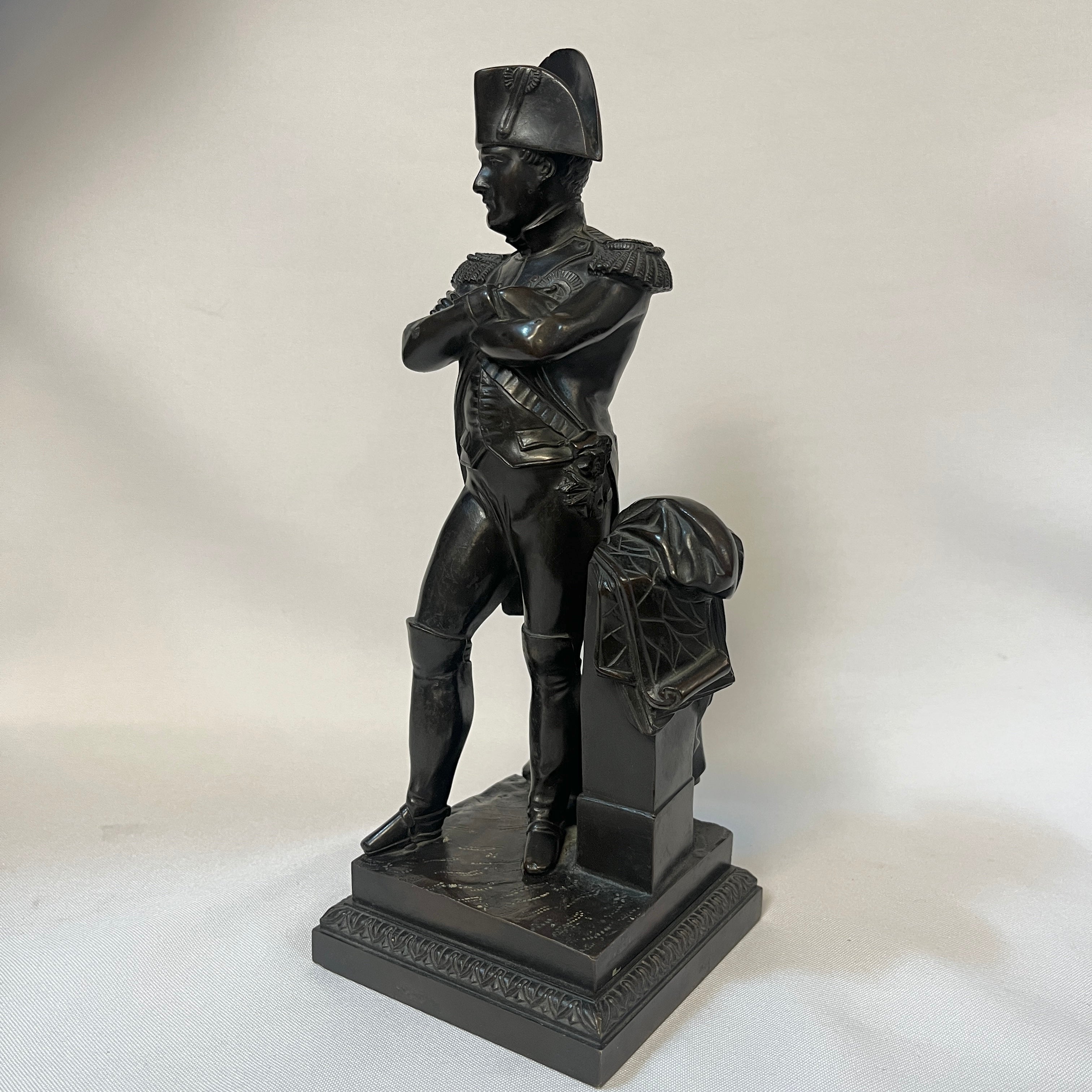 Chiseled and patinated bronze statue representing the Emperor in uniform, standing with arms crossed over his torso; on either side, a stele with campaign plans; fluted quadrangular base. France, 19th century.
