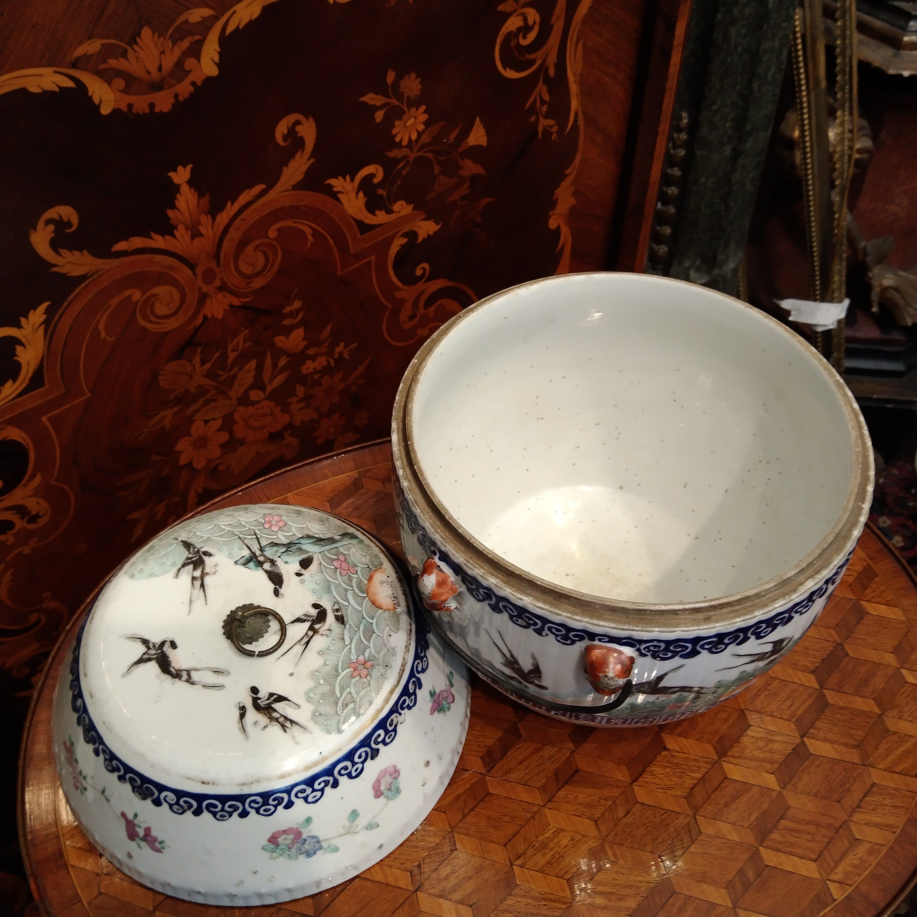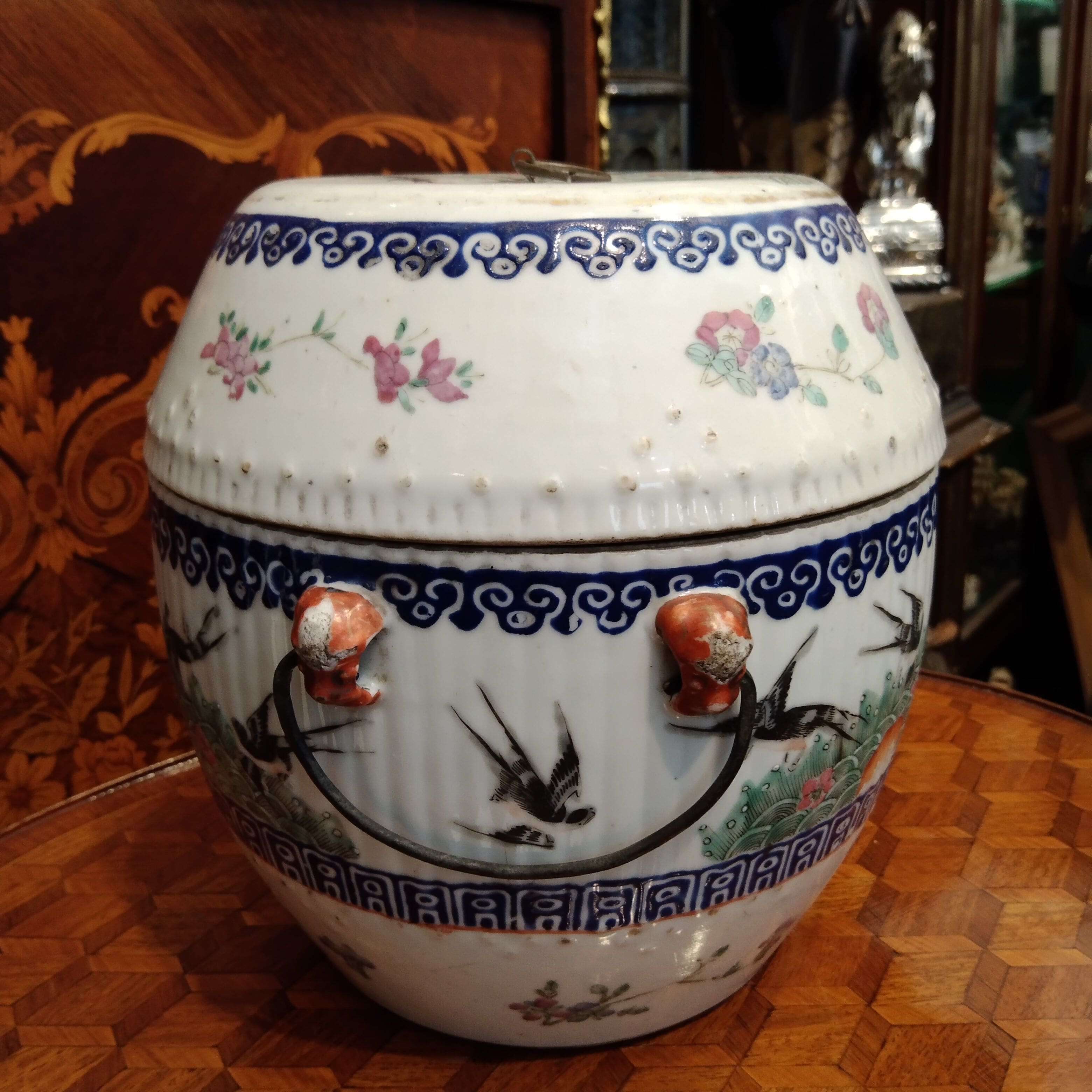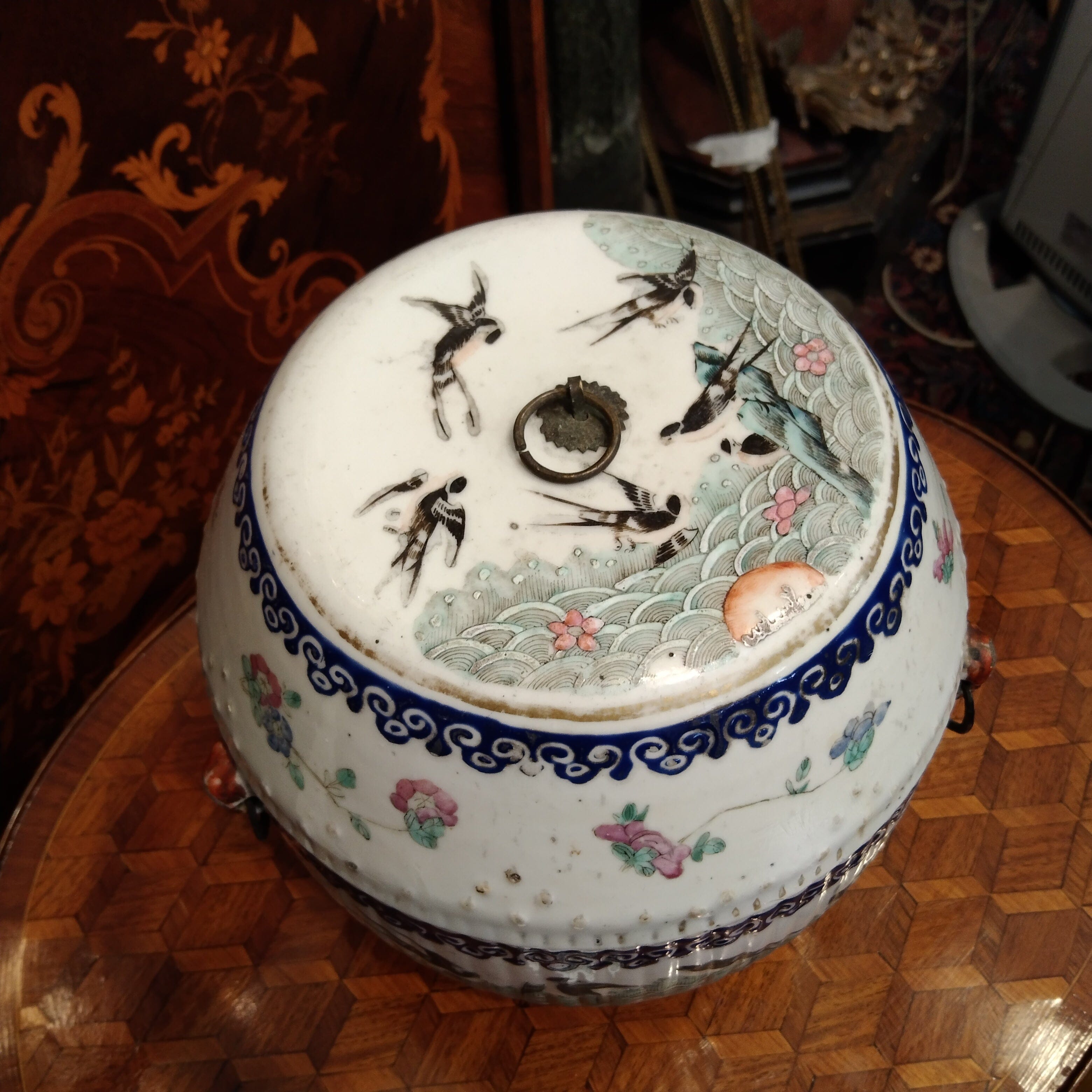 Tambour en porcelaine avec couvercle, motifs floraux et oiseaux, Compagnie des Indes