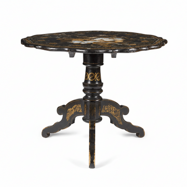 Guéridon trípode redondo lobulado Napoleón III con decoración burgauté y pájaro