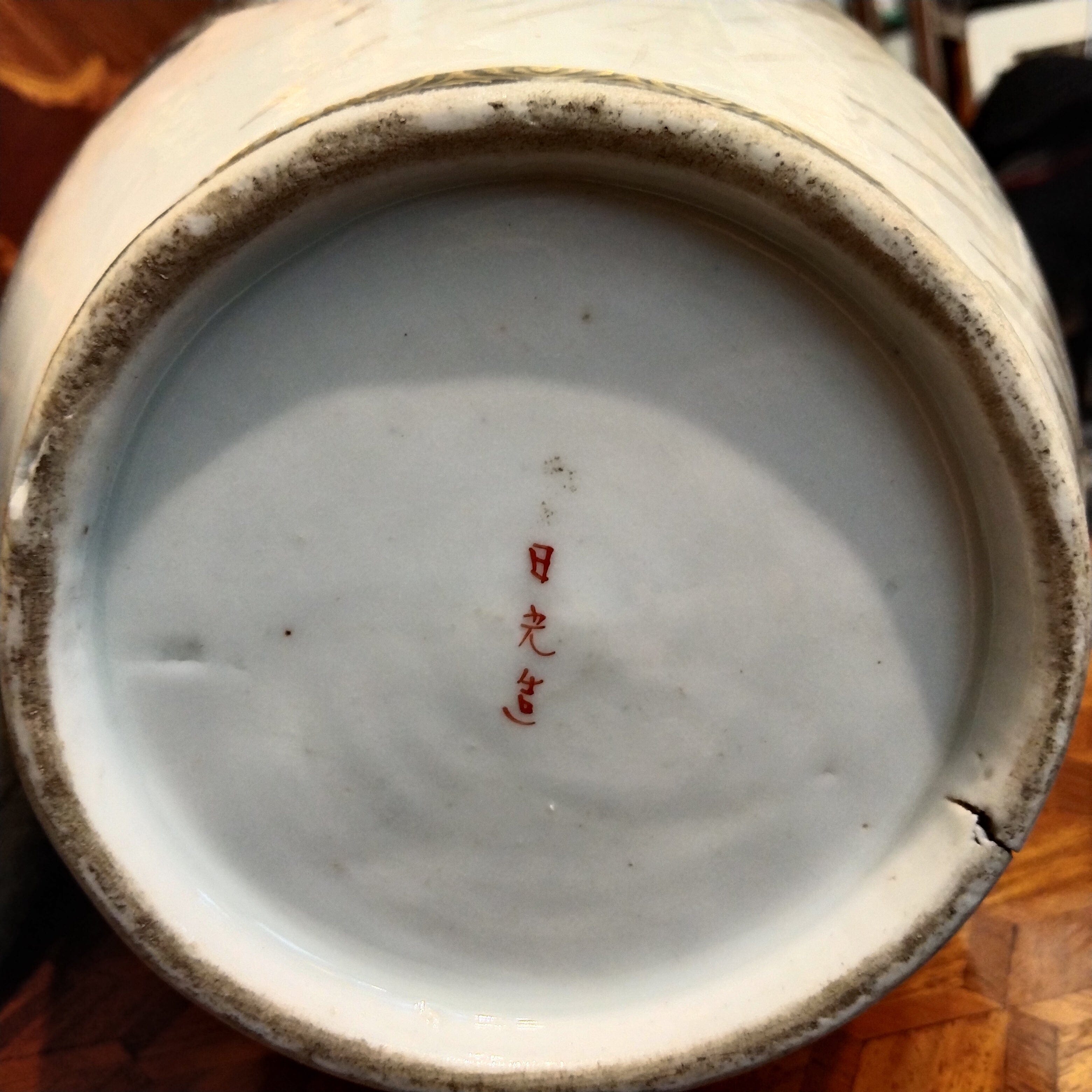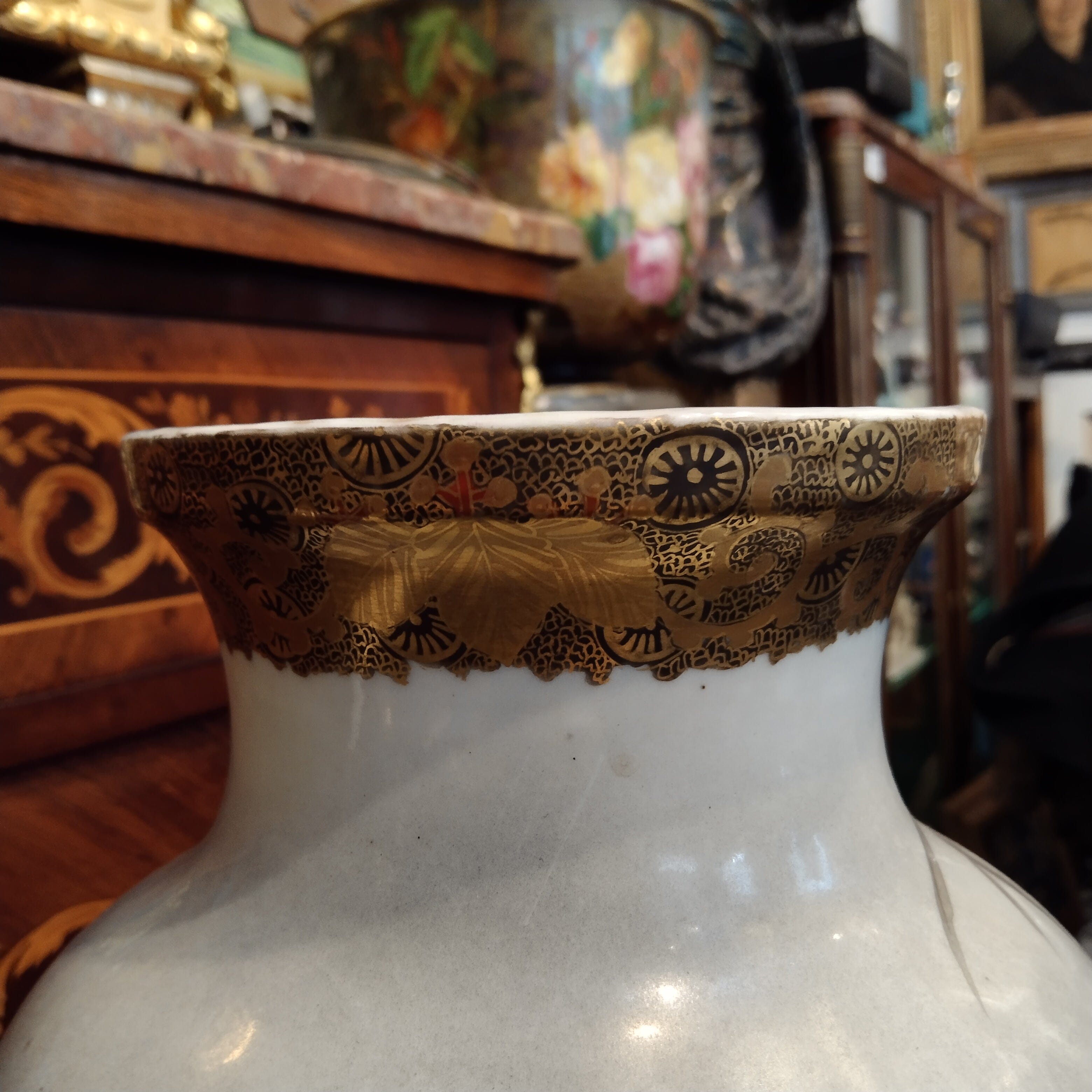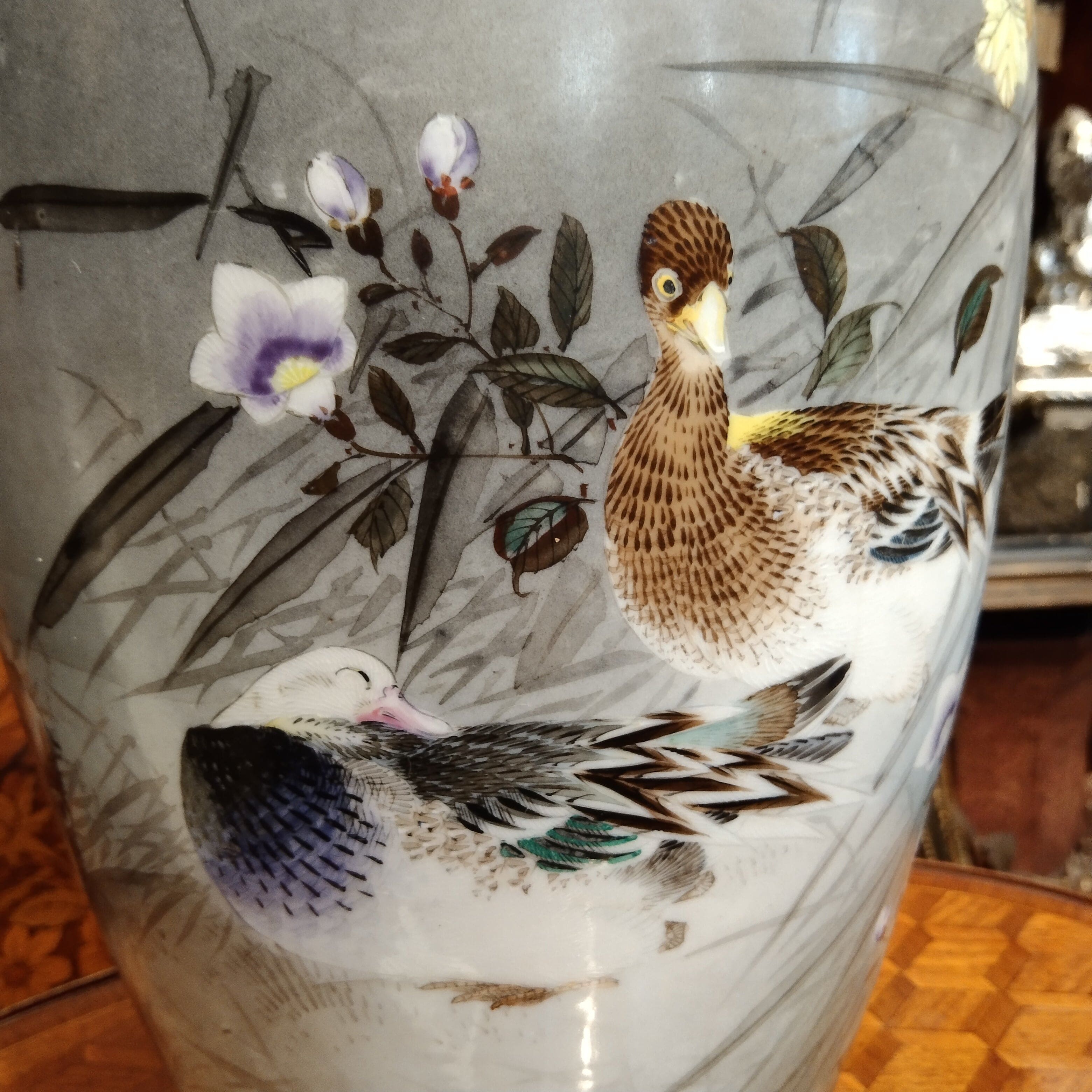 Magnifique vase en porcelaine japonaise, peint à la main avec des motifs floraux détaillés et des dessins de canards parmi la végétation. Son bord est également orné d'une délicate décoration dorée.