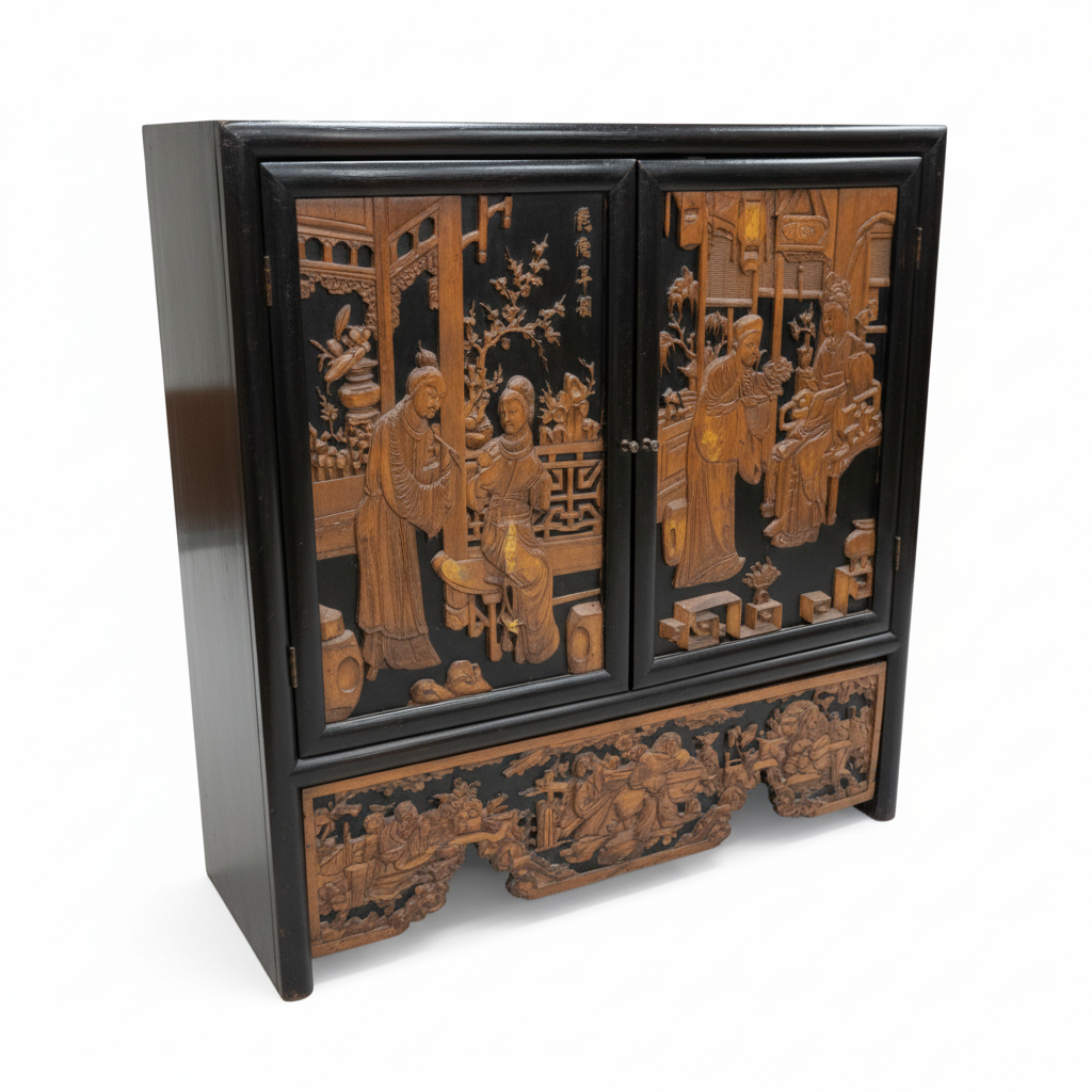 Mueble 3/4 en madera exótica con incrustaciones de bambú y escena de corte. China, comienzos s.XX.