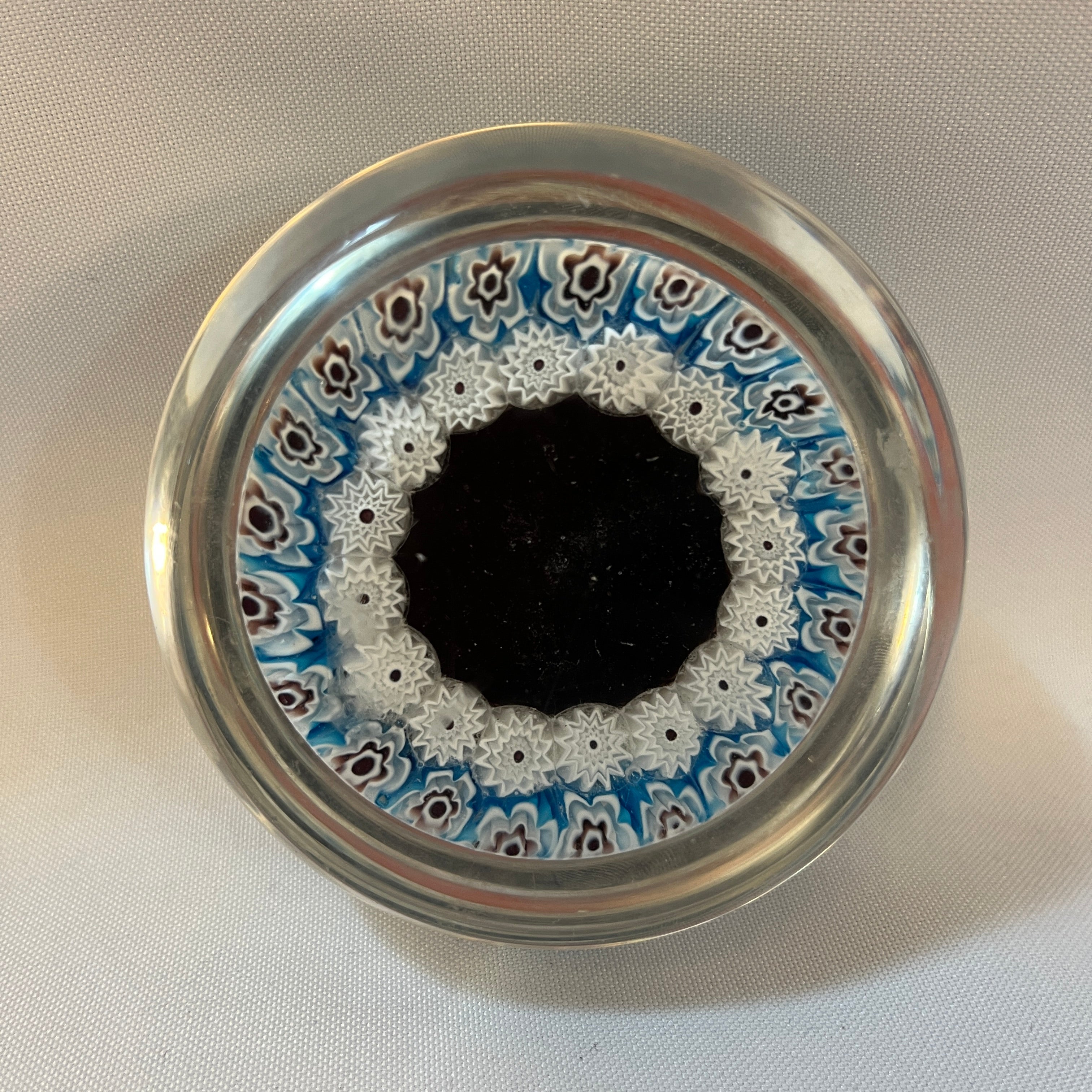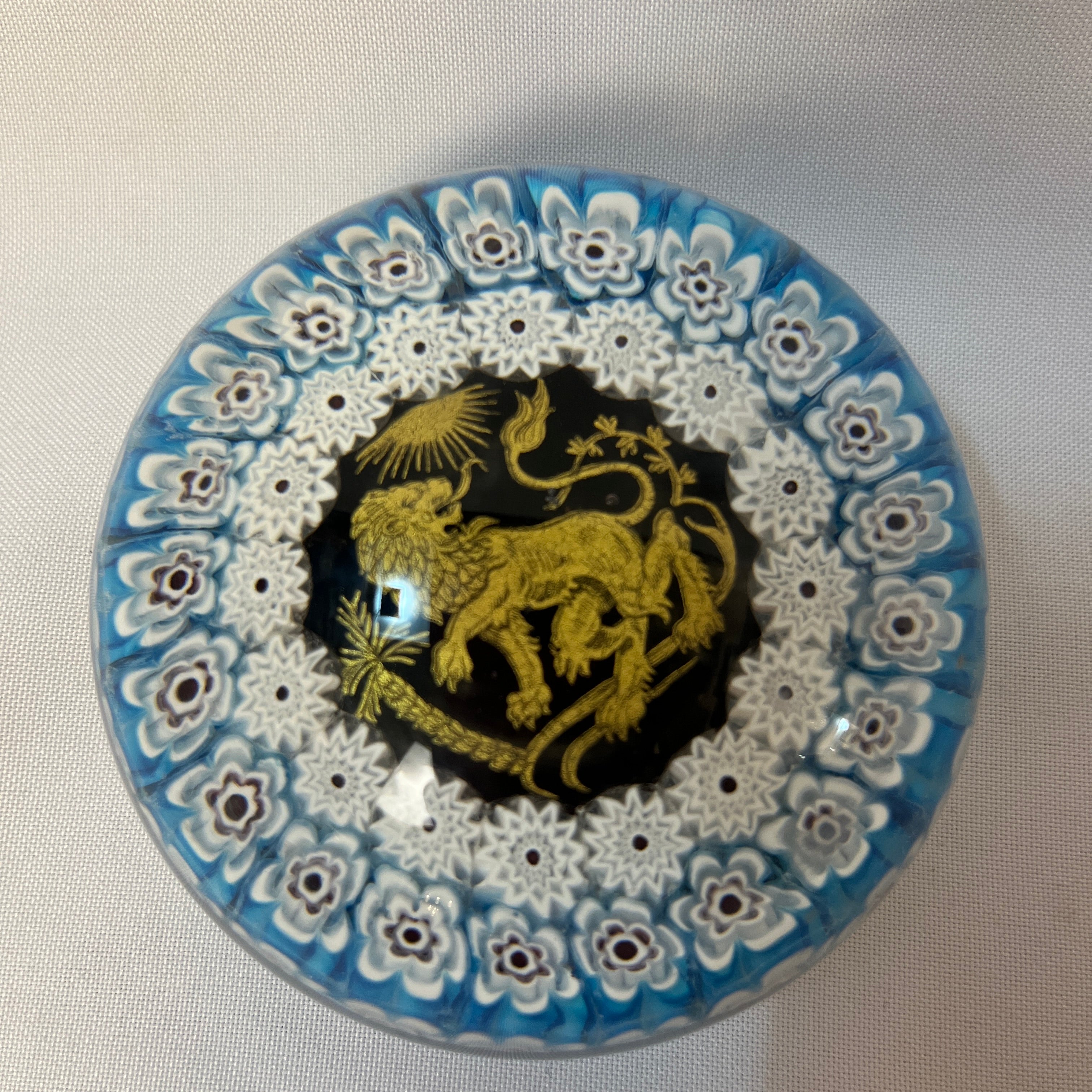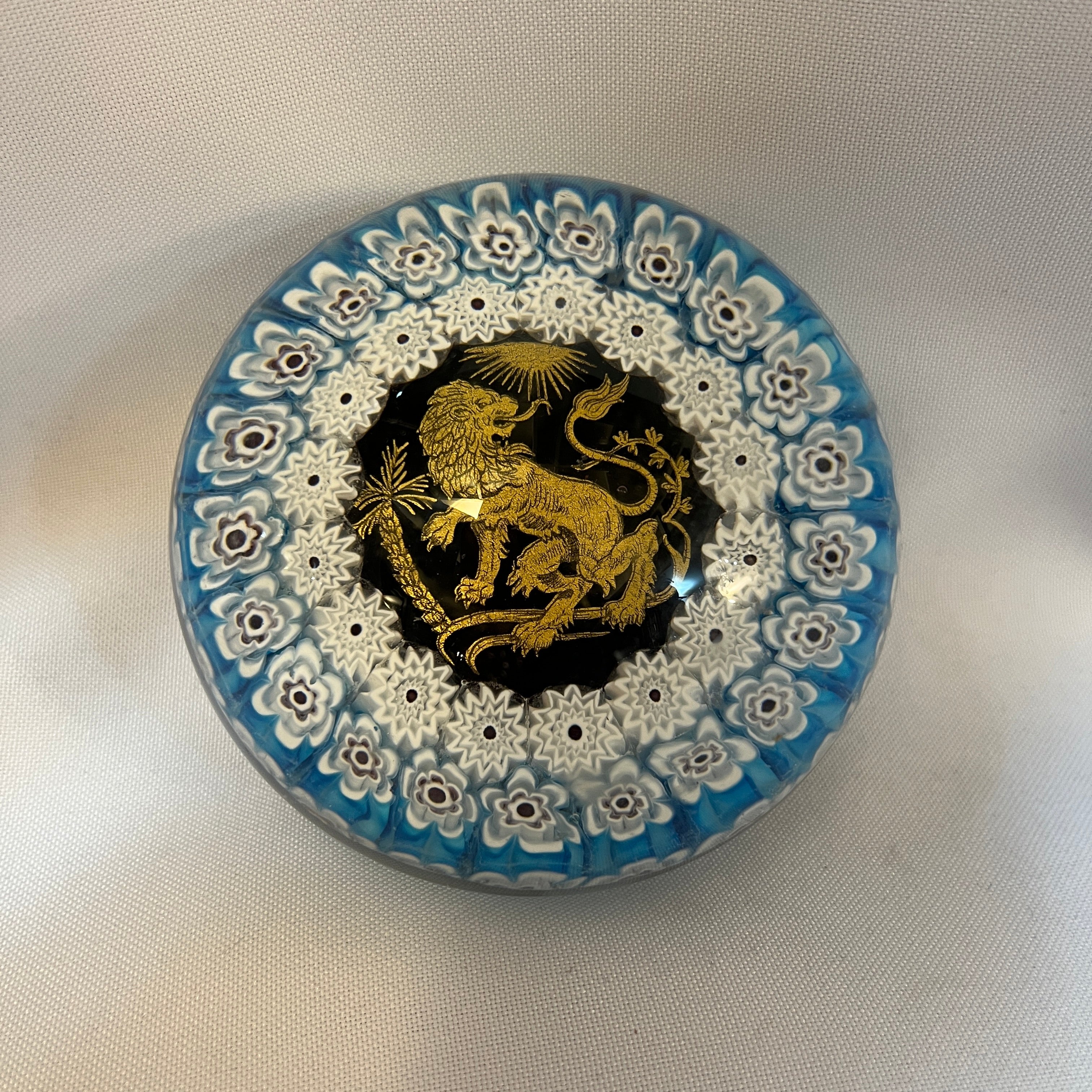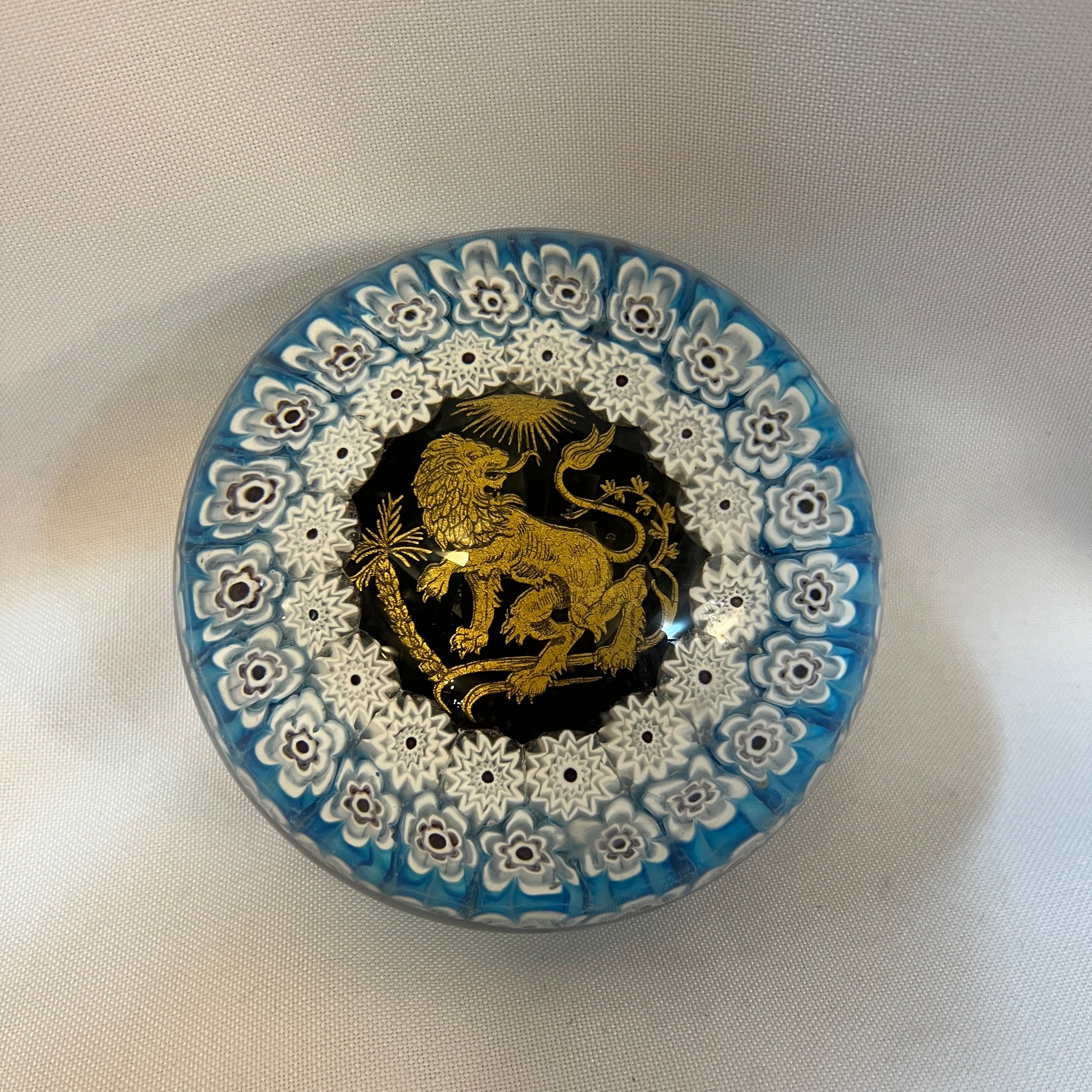 Hermoso pisapapel de vidrio estilo millefiori 'mil flores' con una corona floral en tonos blancos y púrpuras y luego una siguiente corona de flores de 12 pétalos con centro negro y finalmente en el centro un imponente león dorado con un sol alumbrándolo y fondo negro. Por su técnica se puede presumir que es un pisapapel de fines del s.XIX, principios del XX.