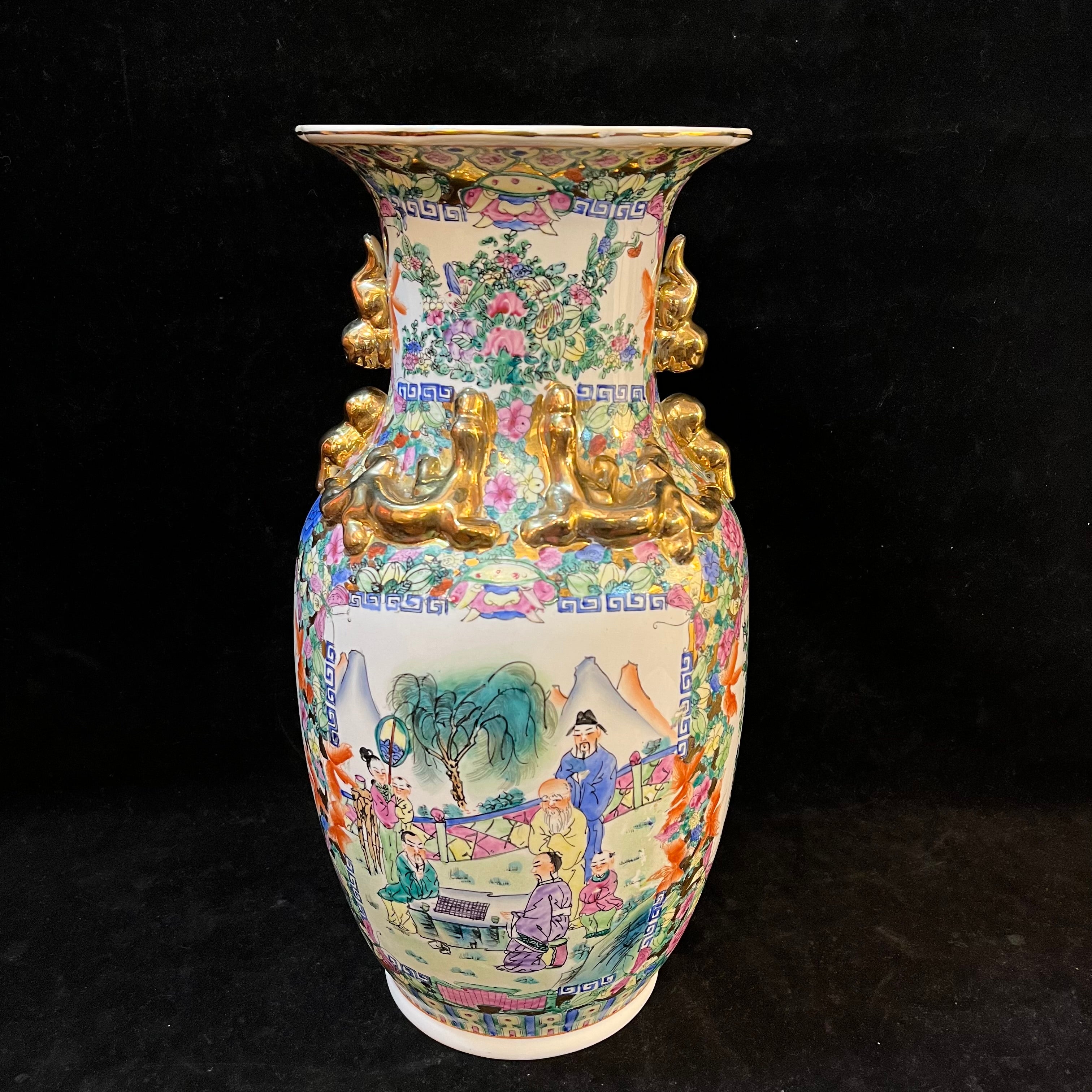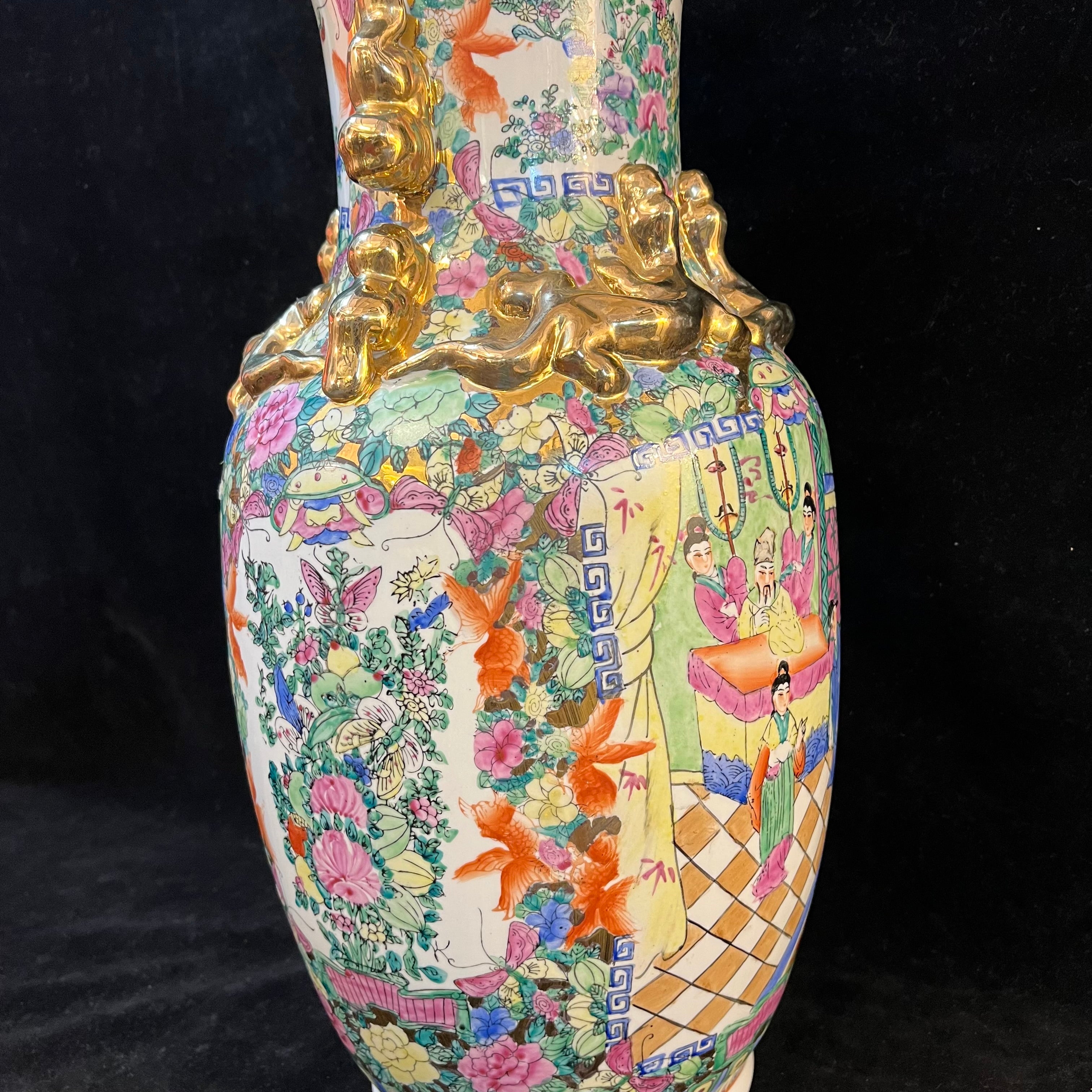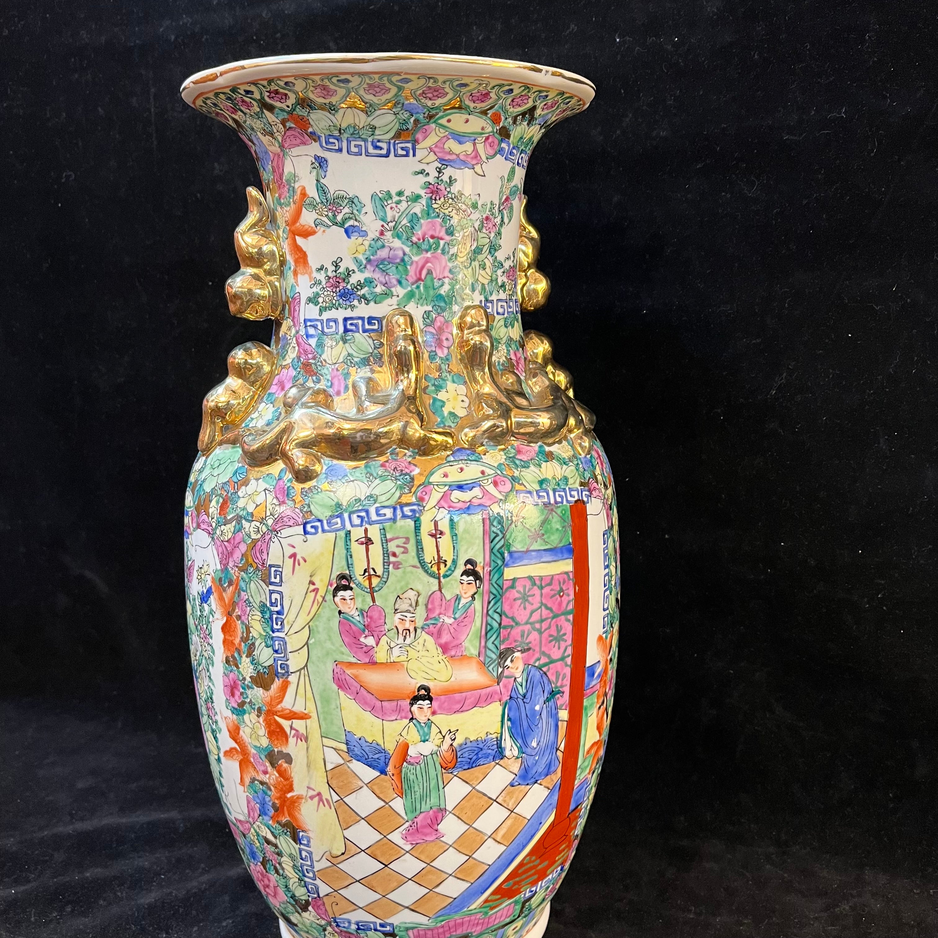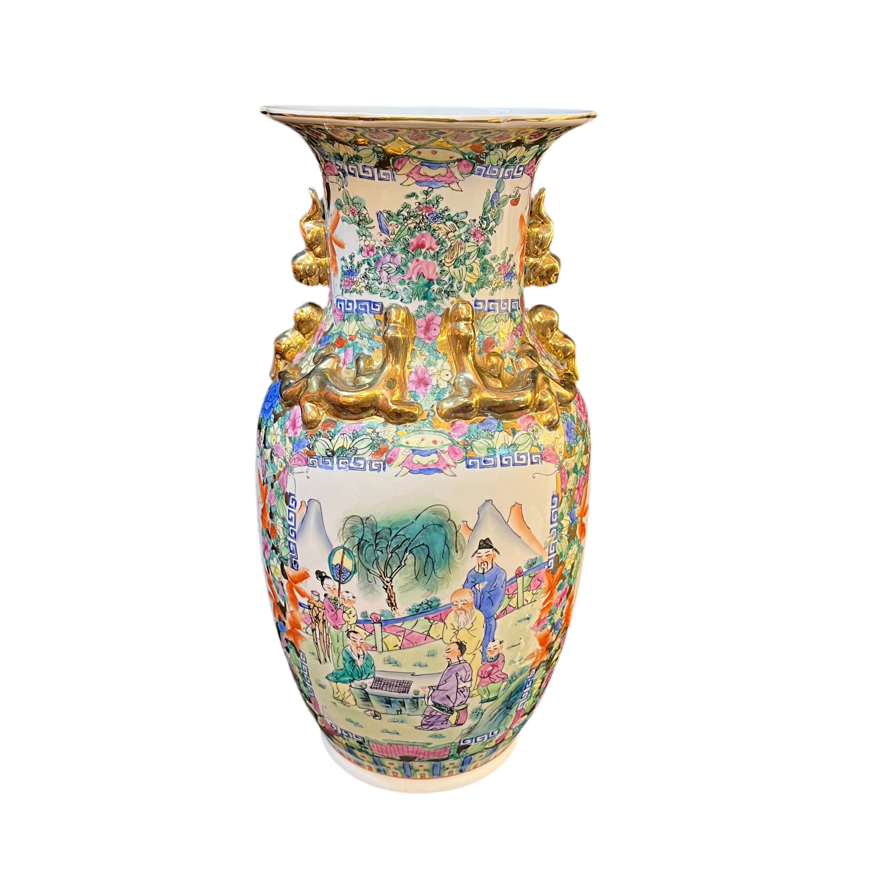 Spectaculaire pot en porcelaine d'origine chinoise, de style Famille Rose, comme en témoigne la prédominance du rose dans sa composition, accompagné de verts, de jaunes, de bleus et de magnifiques finitions dorées pour ses anses. Ses scènes peintes à la main représentent l'intérieur d'un palais où se trouvent un noble et ses serviteurs, ainsi que des compositions naturelles avec plantes, fleurs et oiseaux.