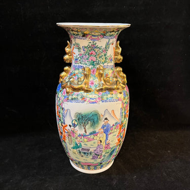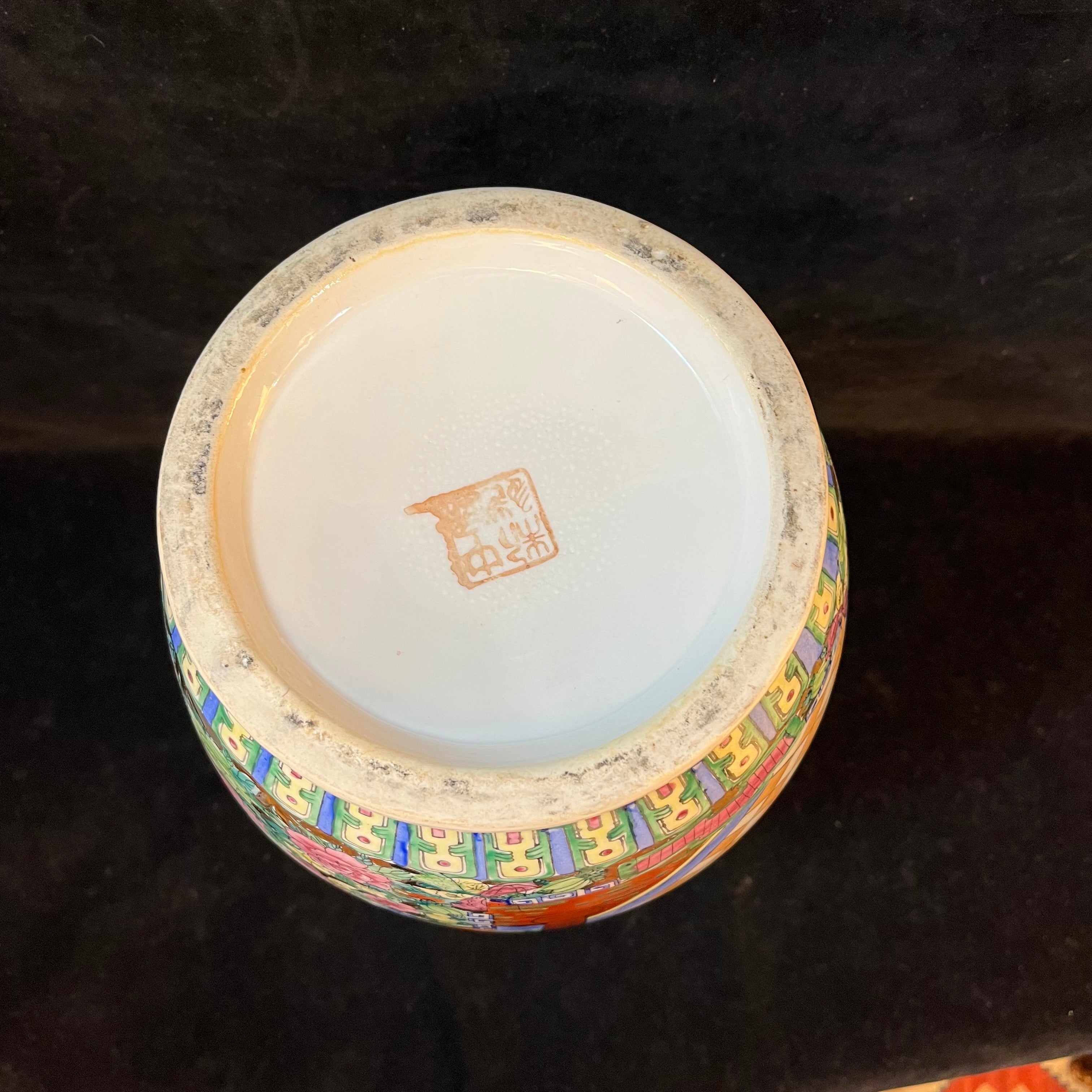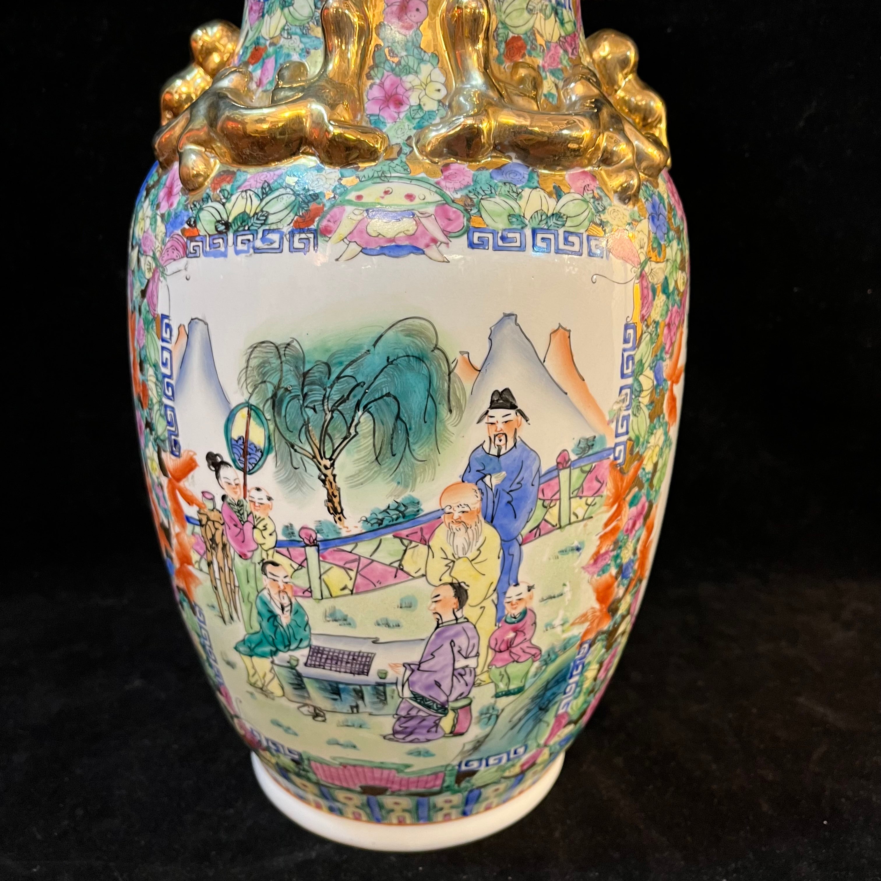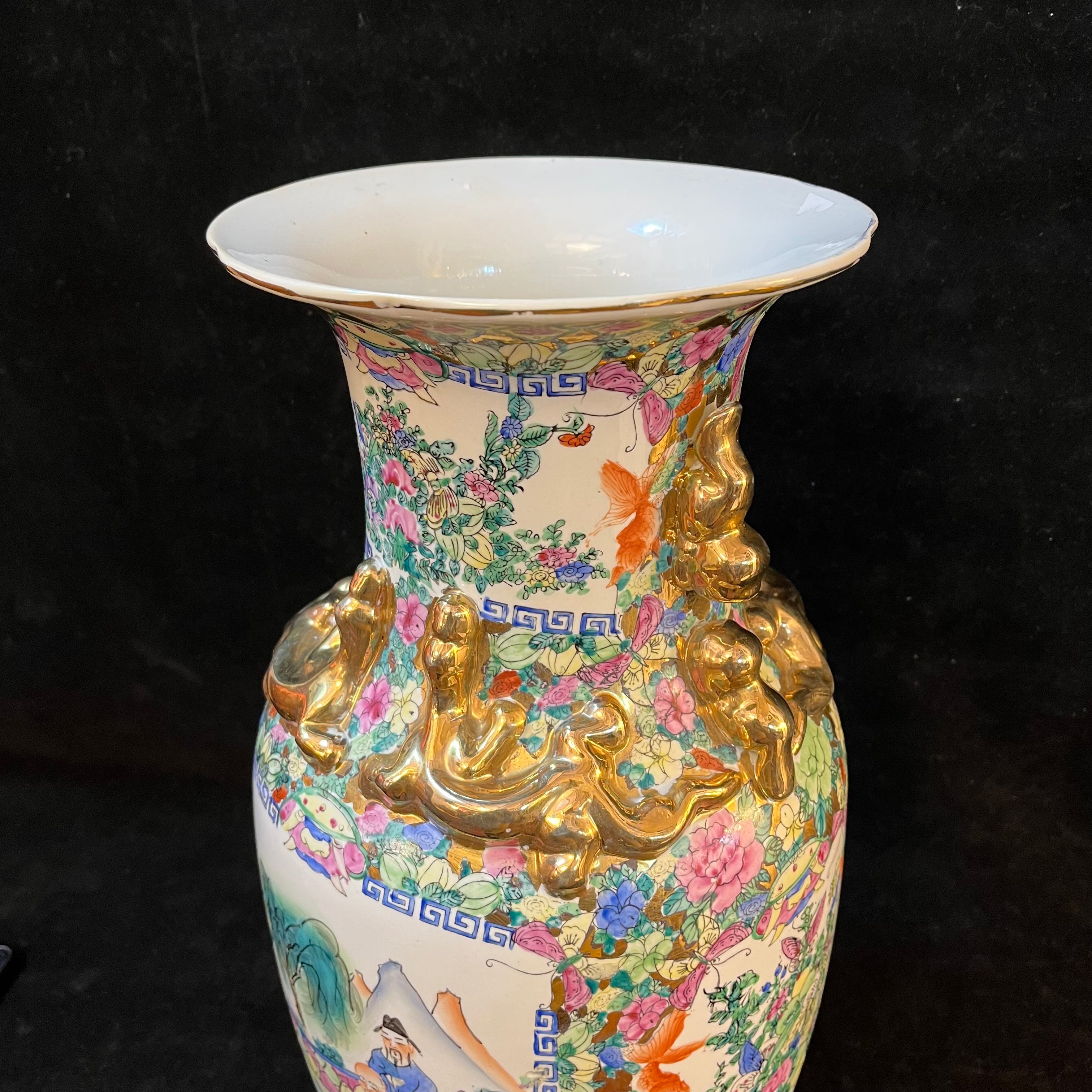 Spectaculaire pot en porcelaine d'origine chinoise, de style Famille Rose, comme en témoigne la prédominance du rose dans sa composition, accompagné de verts, de jaunes, de bleus et de magnifiques finitions dorées pour ses anses. Ses scènes peintes à la main représentent l'intérieur d'un palais où se trouvent un noble et ses serviteurs, ainsi que des compositions naturelles avec plantes, fleurs et oiseaux.