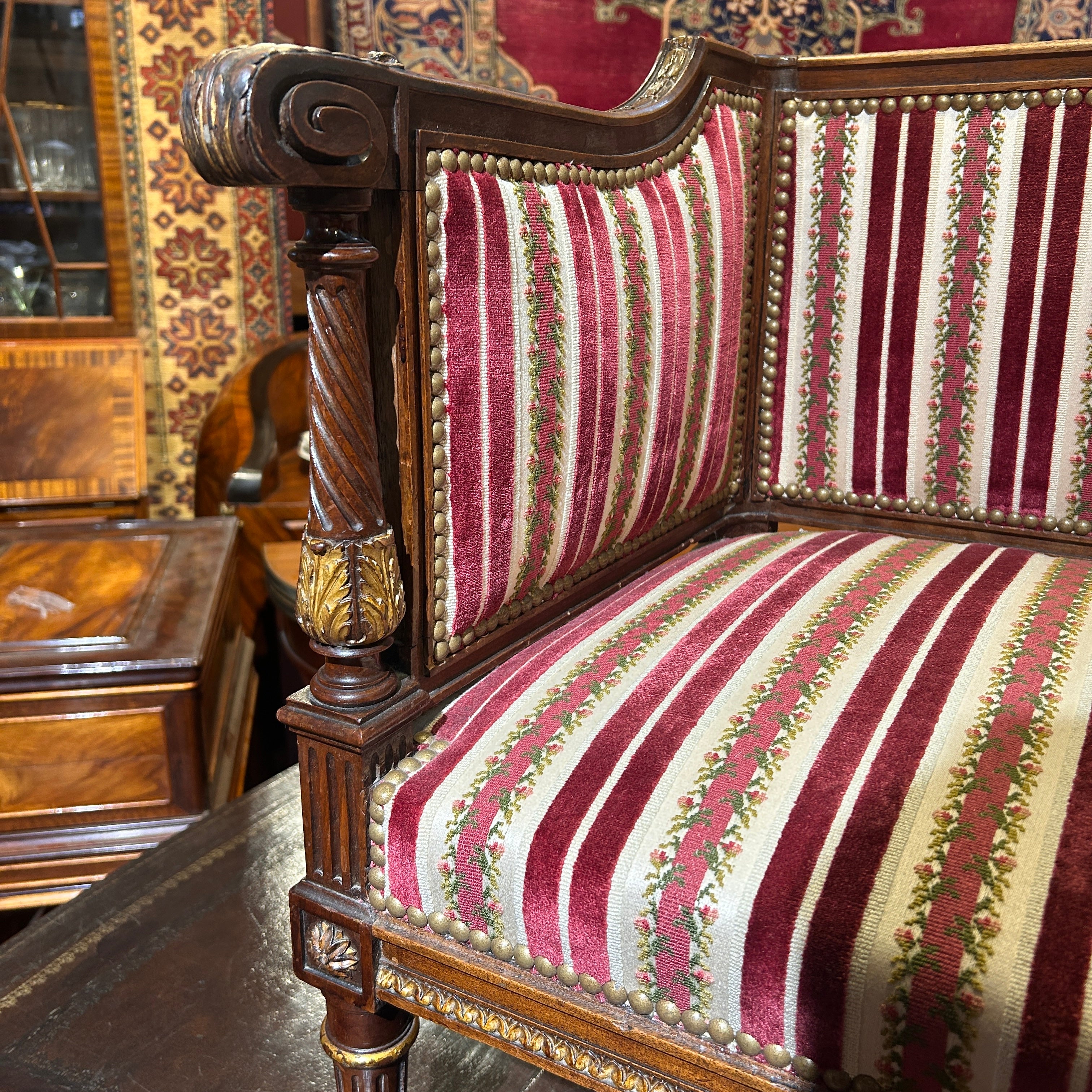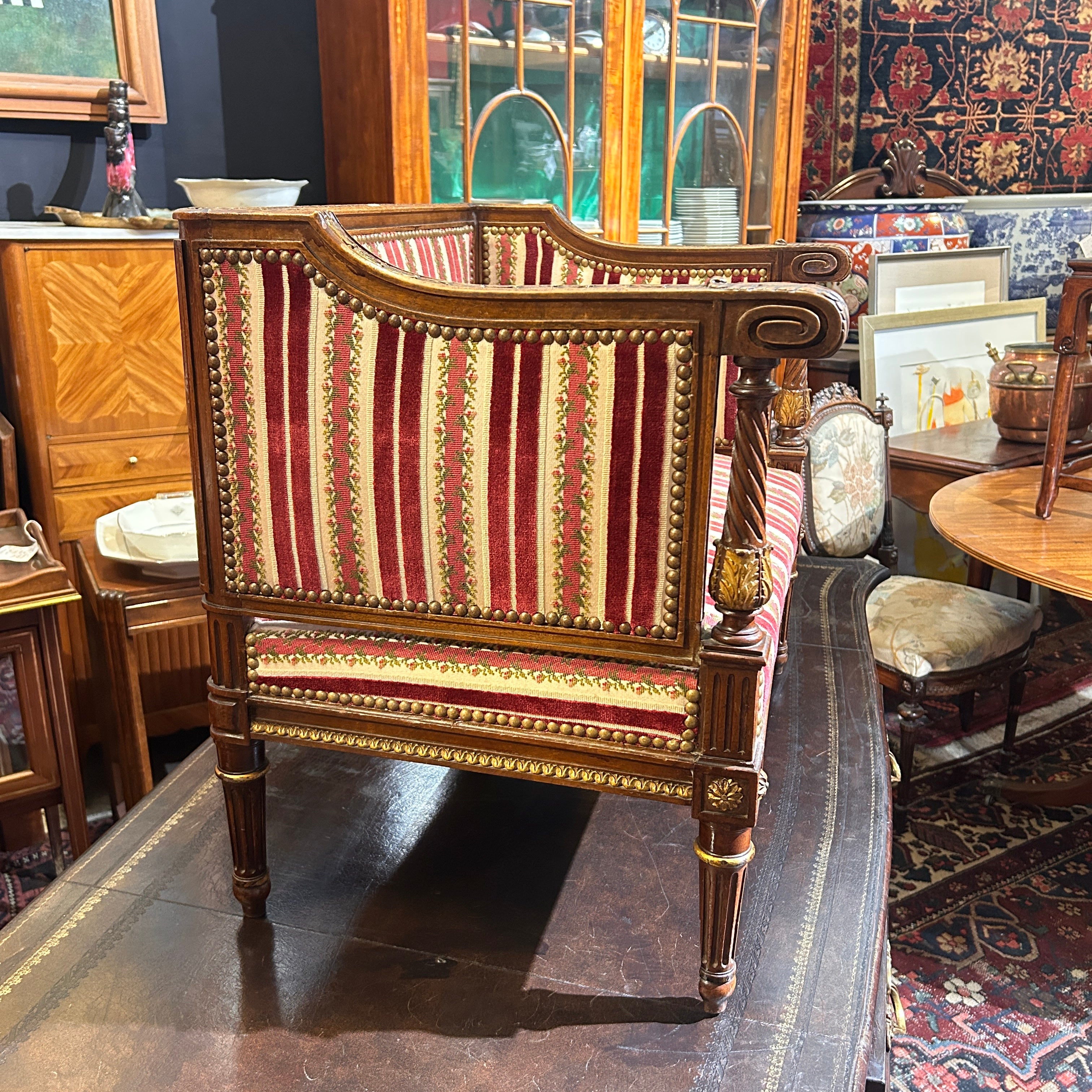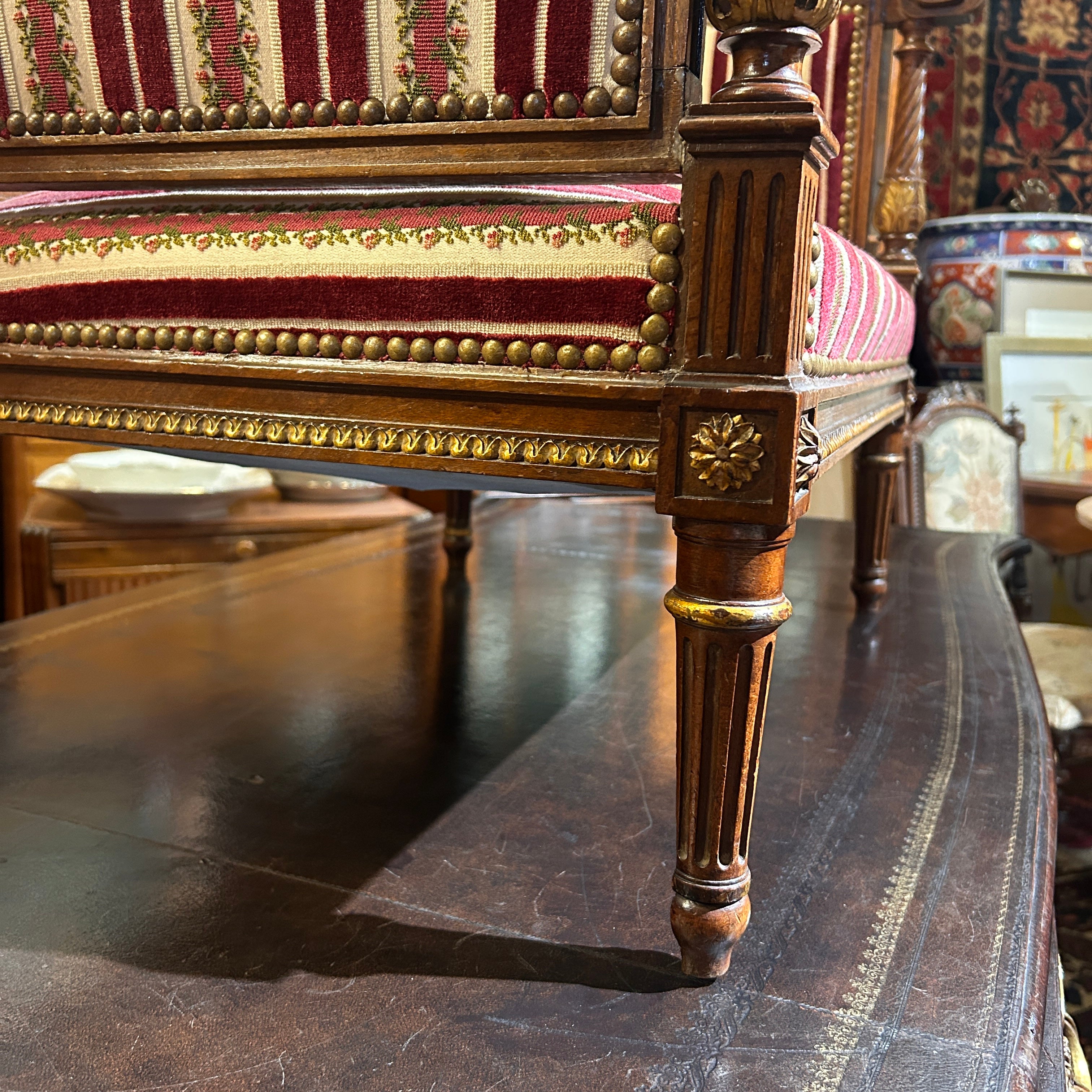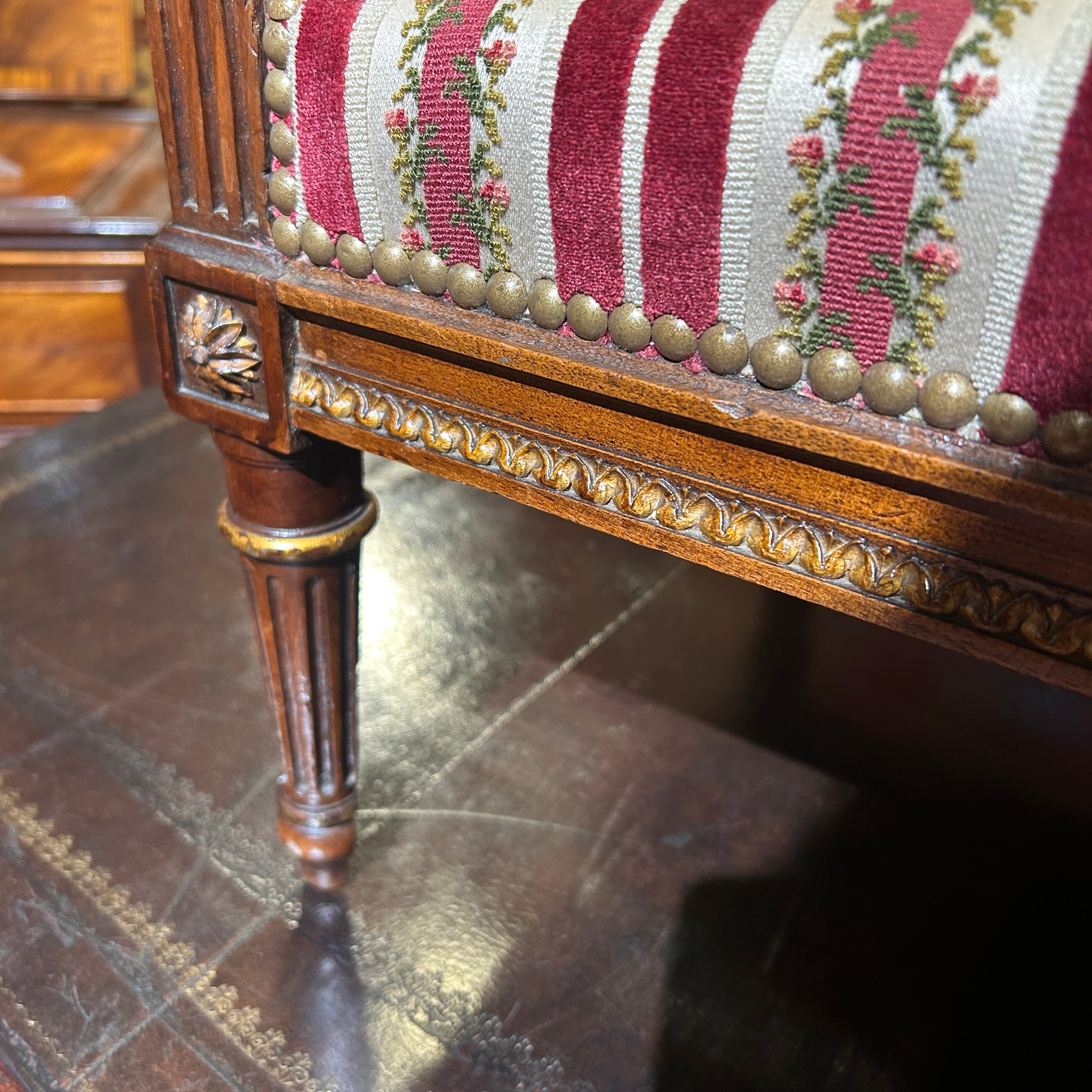 Hermoso sillón francés estilo Luís XVI con madera totalmente tallada a mano con detalles de hojas de laurel en los apoya brazos y las clásicas patas acanaladas. Con hermoso cordón de clavetones de bronce, que acompañan el tapiz de pequeñas flores bordadas a mano y rayas de terciopelo rojo granada.