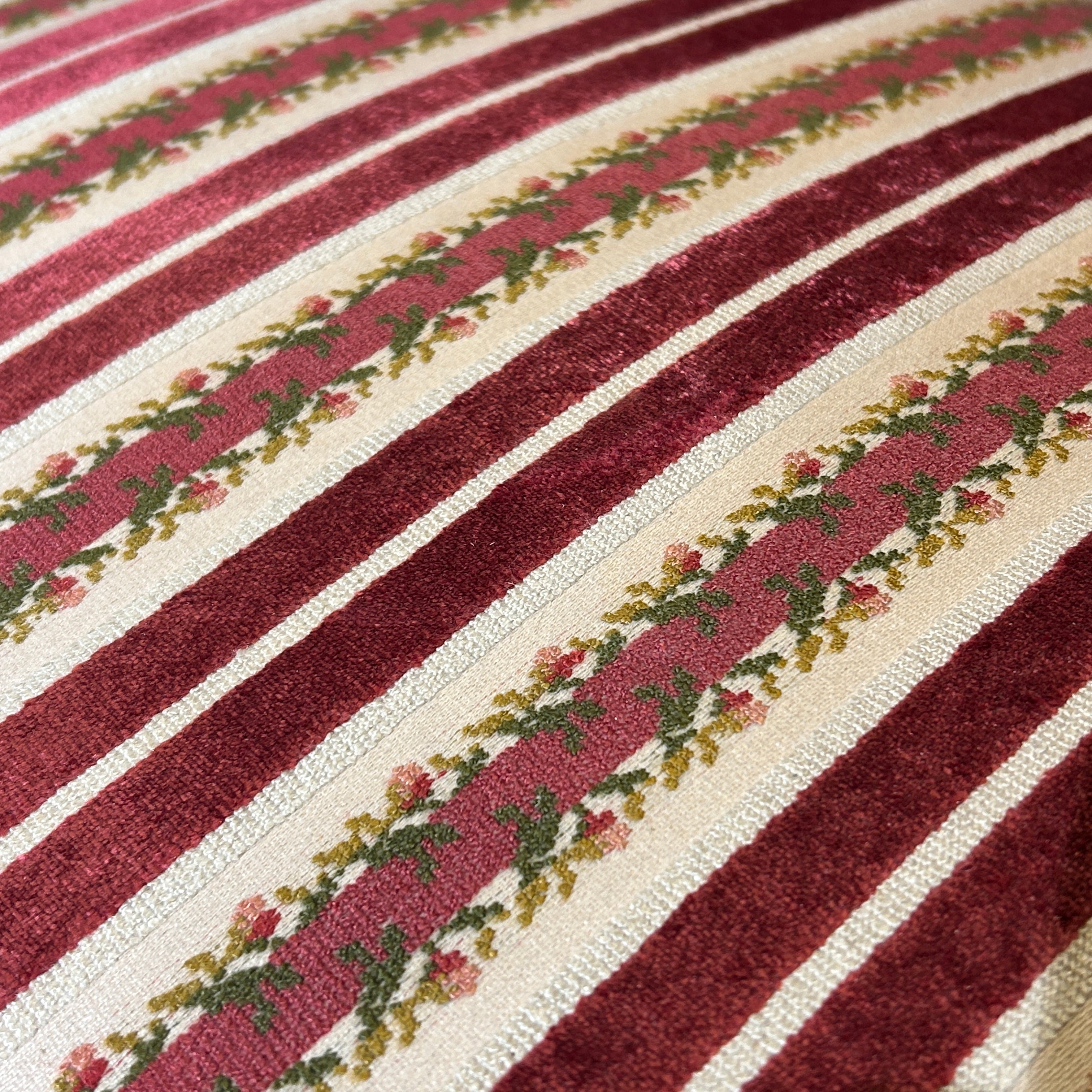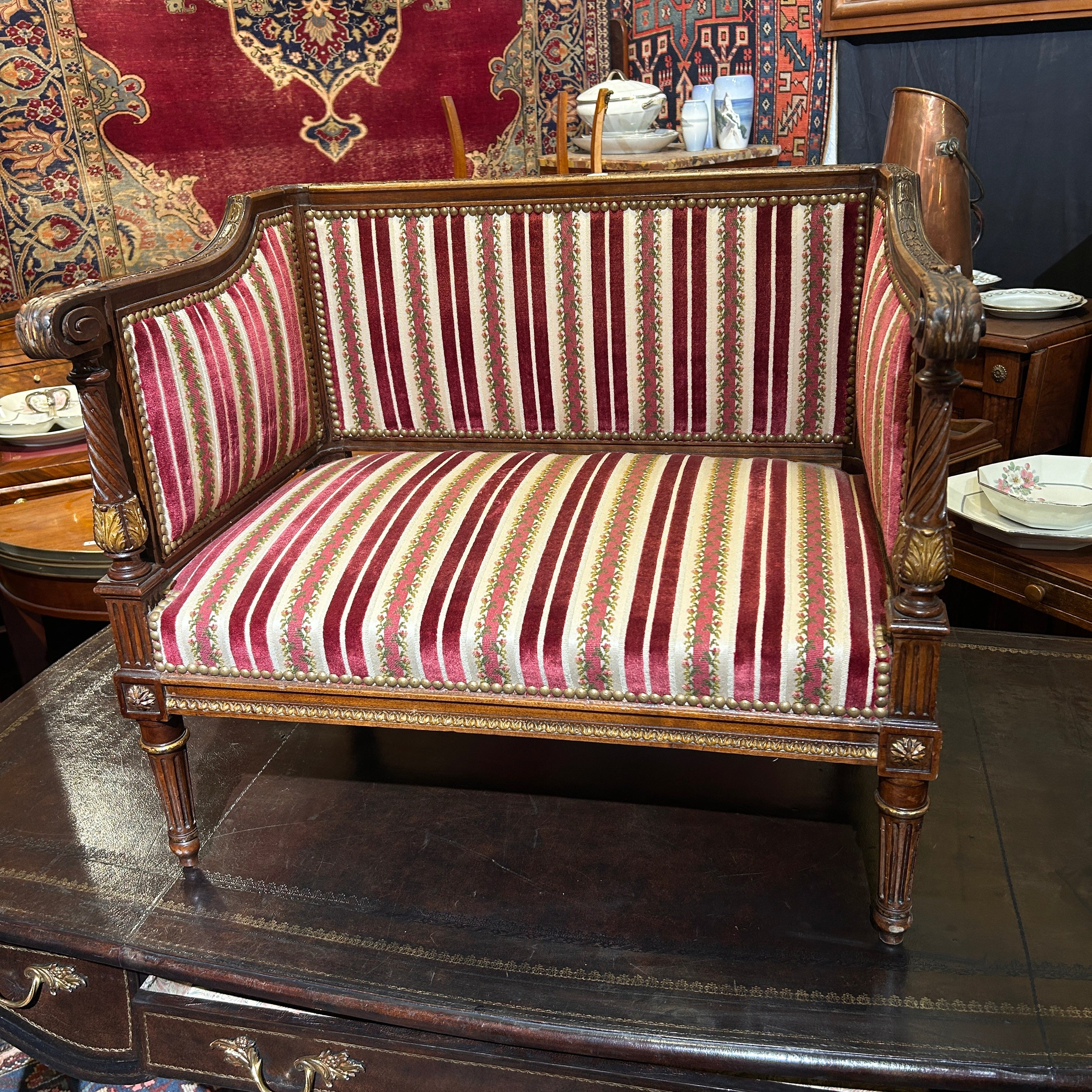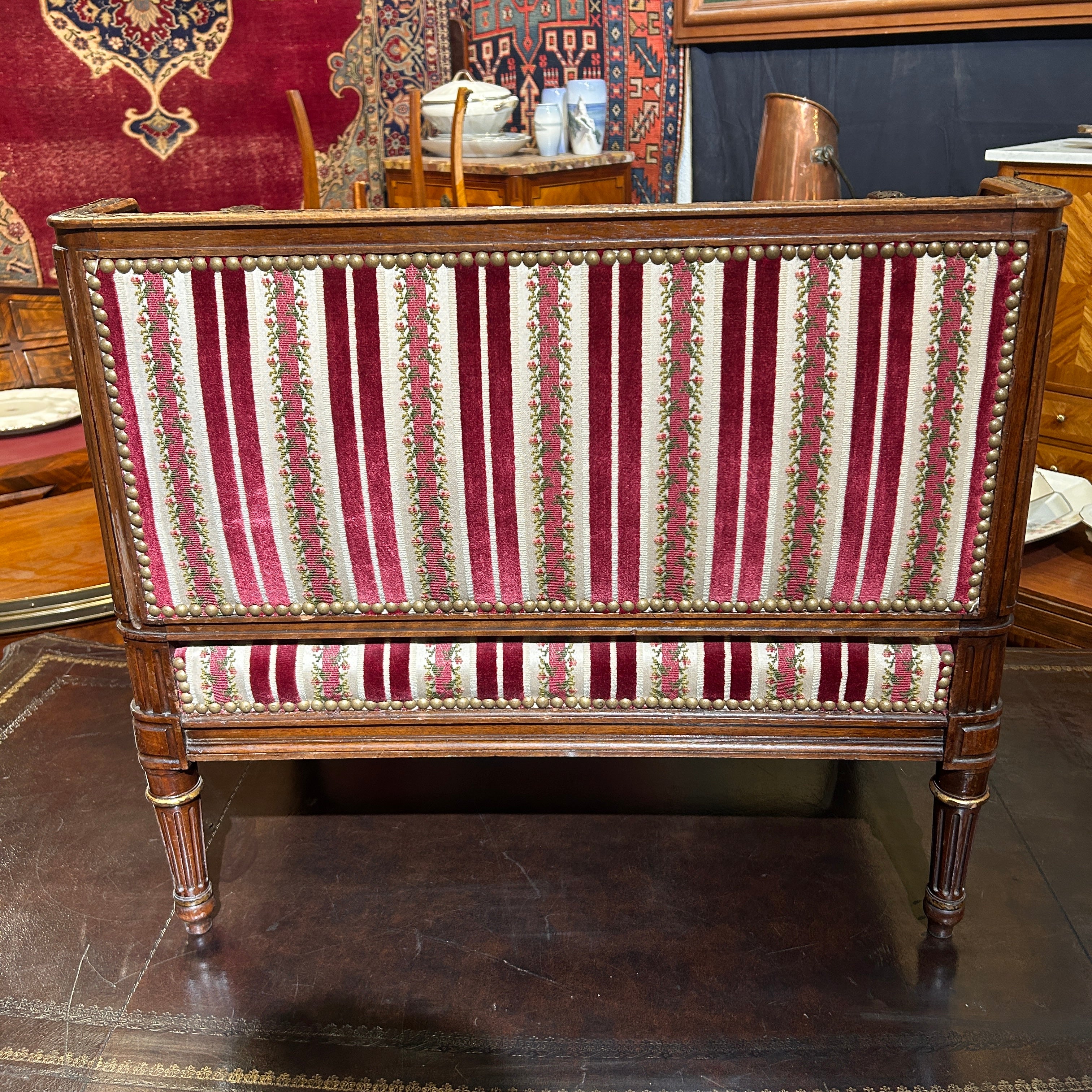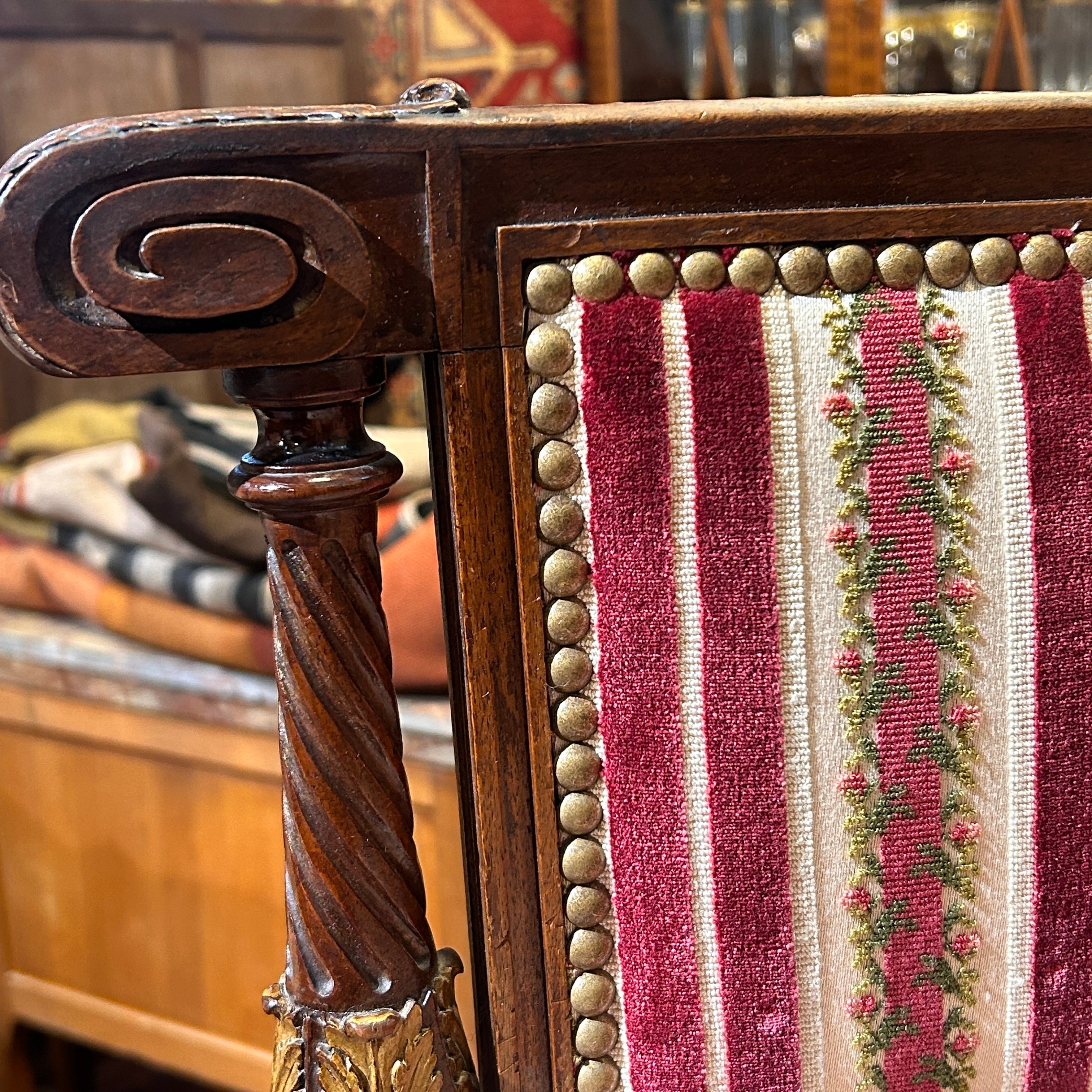Hermoso sillón francés estilo Luís XVI con madera totalmente tallada a mano con detalles de hojas de laurel en los apoya brazos y las clásicas patas acanaladas. Con hermoso cordón de clavetones de bronce, que acompañan el tapiz de pequeñas flores bordadas a mano y rayas de terciopelo rojo granada.