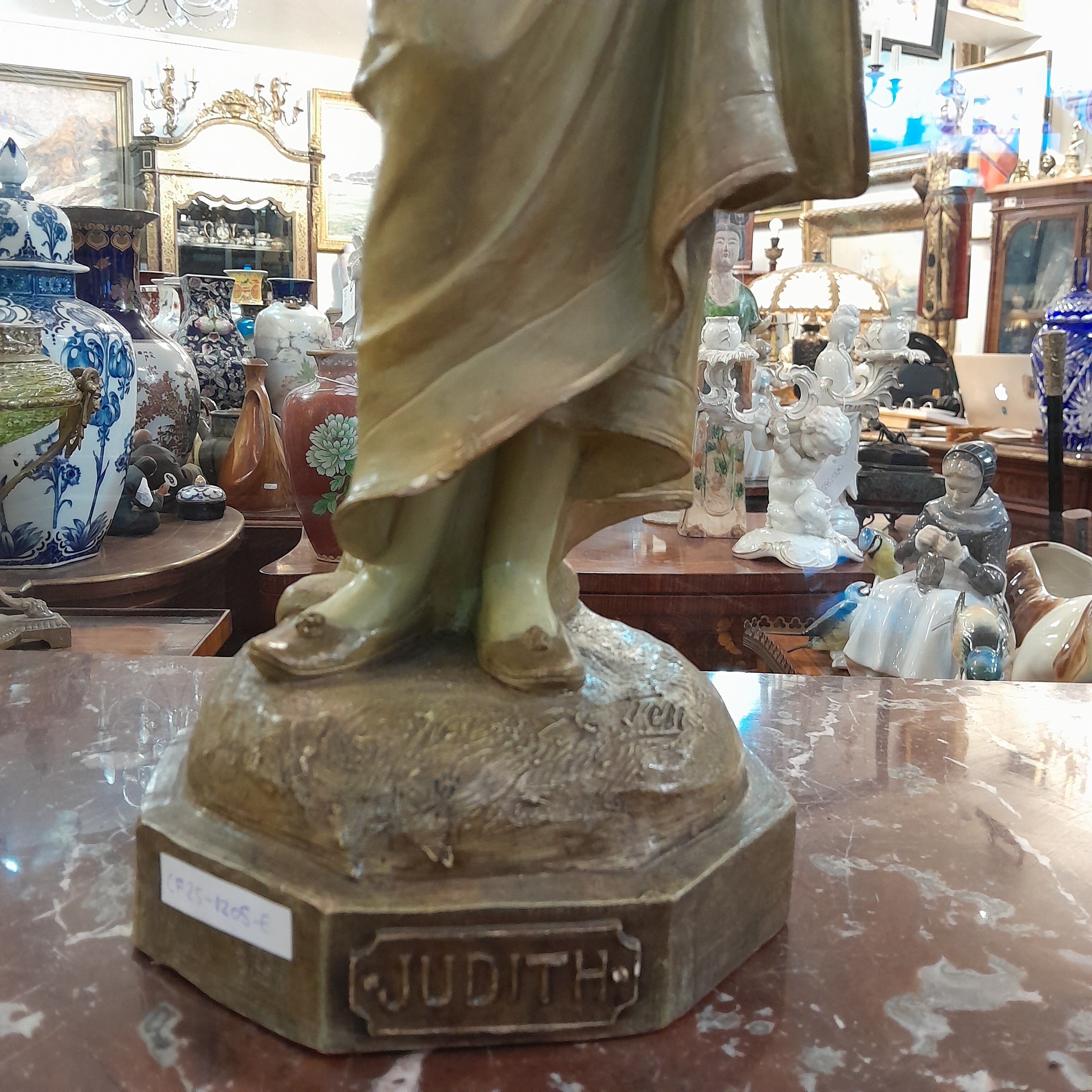 Une magnifique sculpture représentant l'héroïne biblique Judith. Son visage, très détaillé, révèle le regard profond et assuré de Judith.